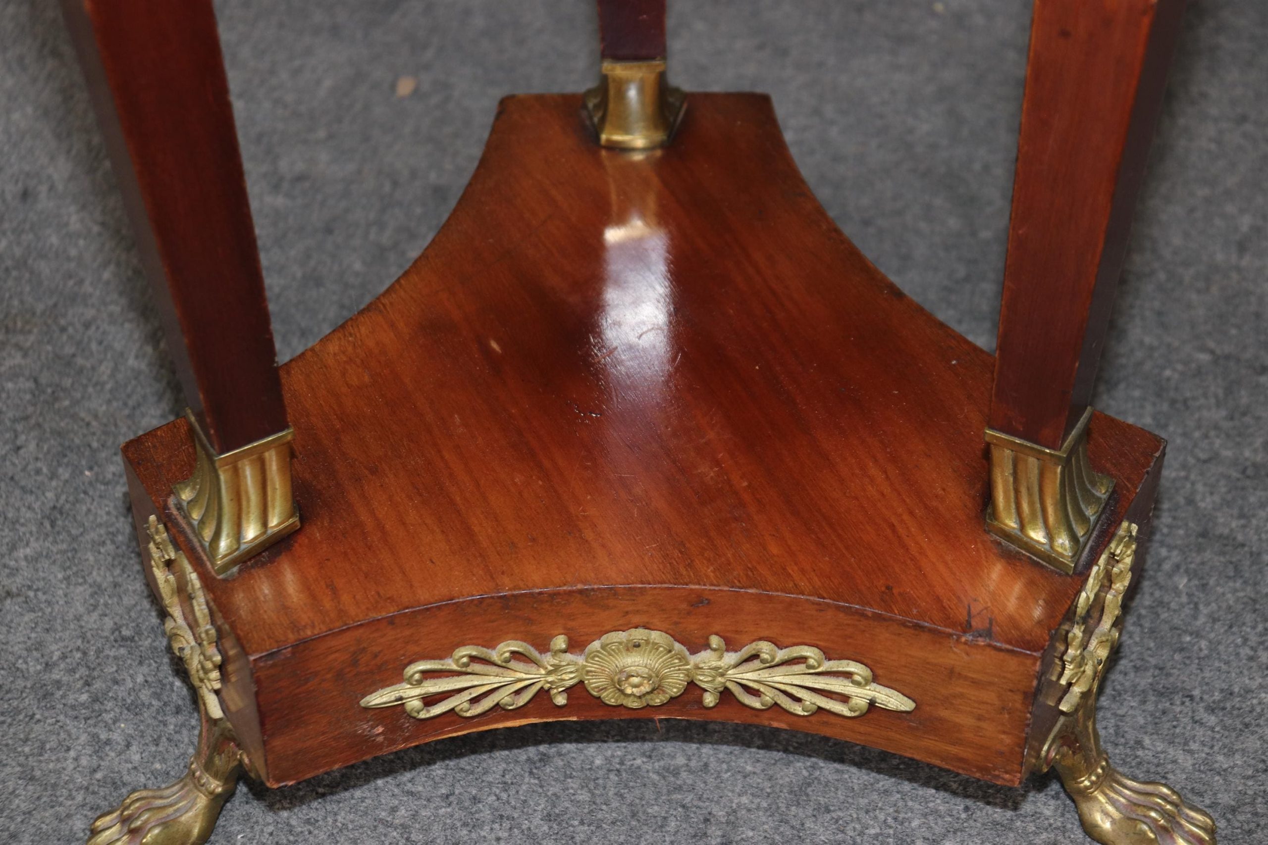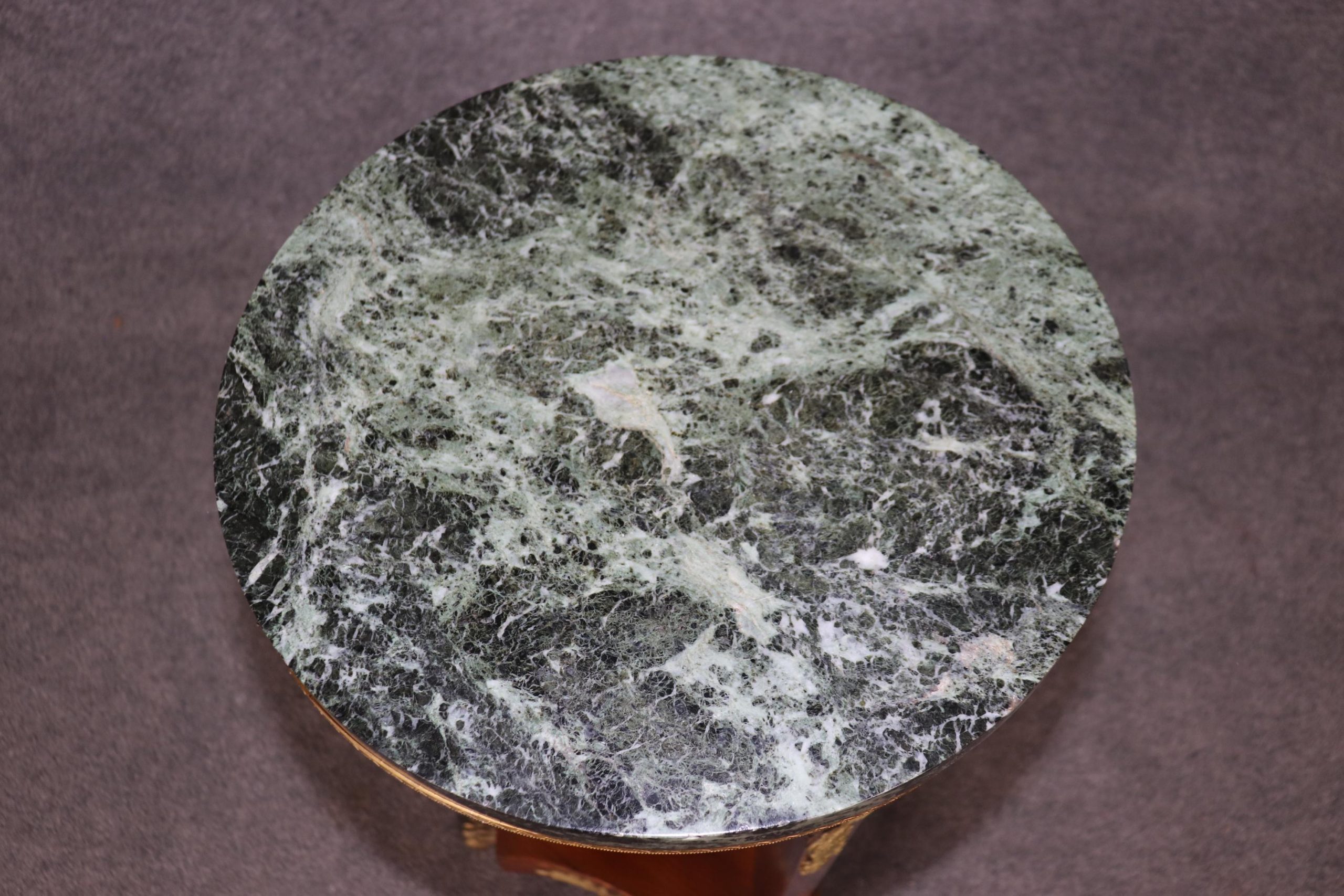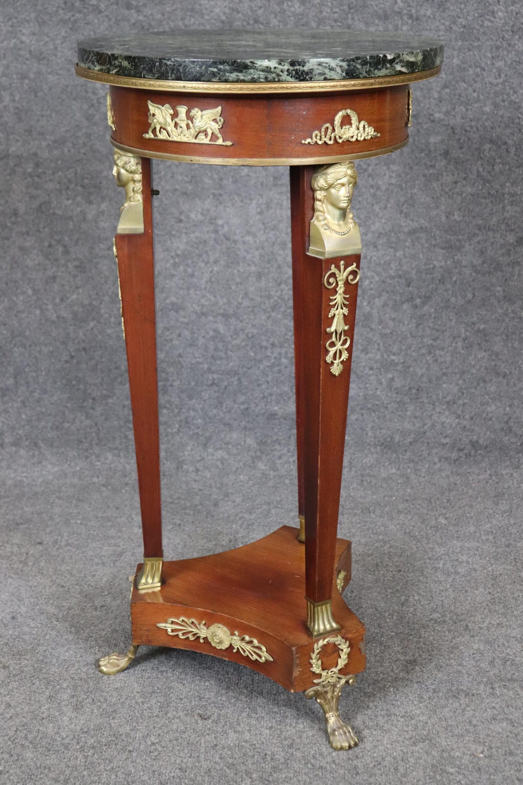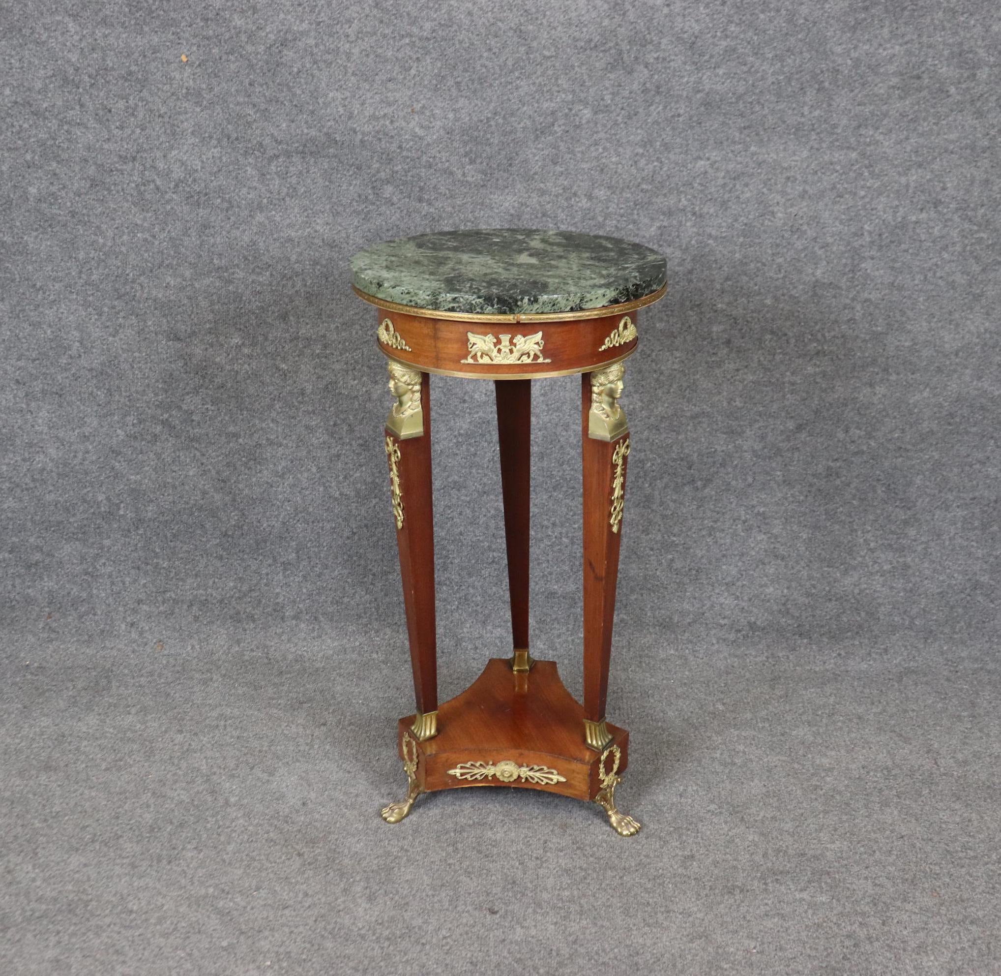 This vintage French Empire style bronze mounted pedestal table is perfect for you and your home! If you look at the photos provided, you can see the thick verdi green marble top as well as the attention to detail in the bronze mounts. This piece is bound to bring a sense of minimalistic luxury and modernism into your home or place of choosing and is perfect for any entryway, living room, bedroom, bathroom or office! This piece is equipped with a faux marble top. This piece will have your guests mesmerized by its design! This piece is in good vintage condition with the exception of some minor surface scratches and finish loss as to be expected, but otherwise good condition.