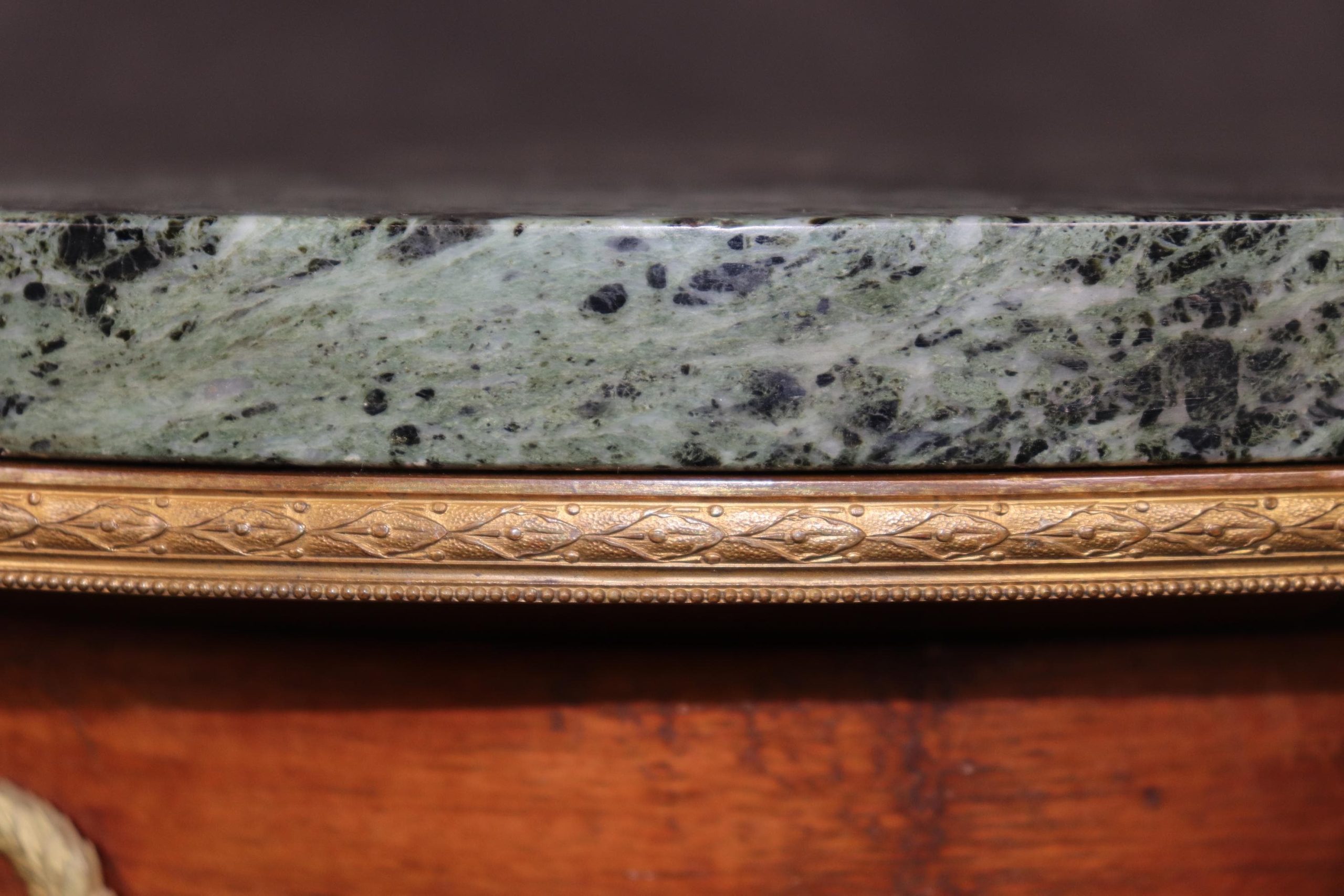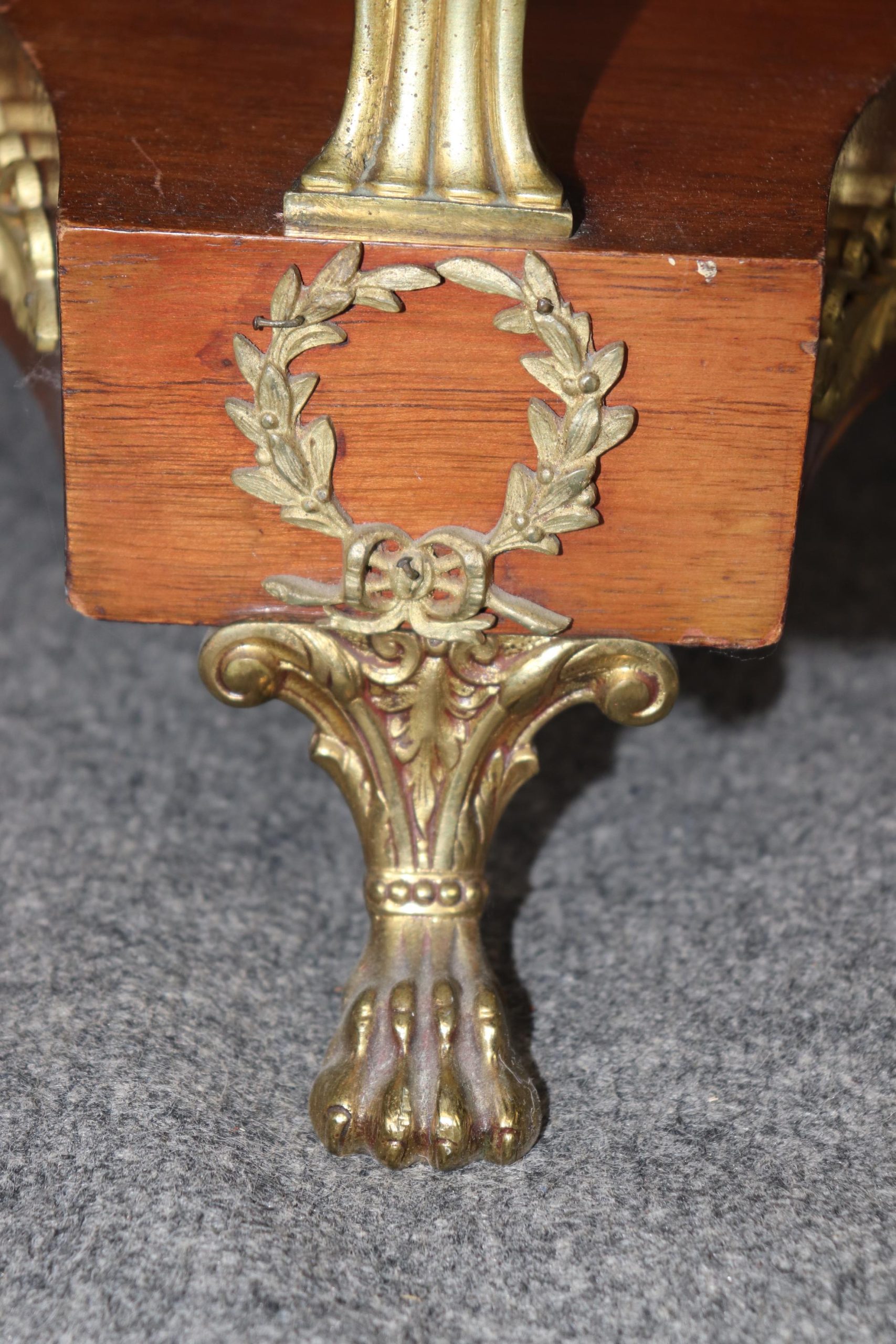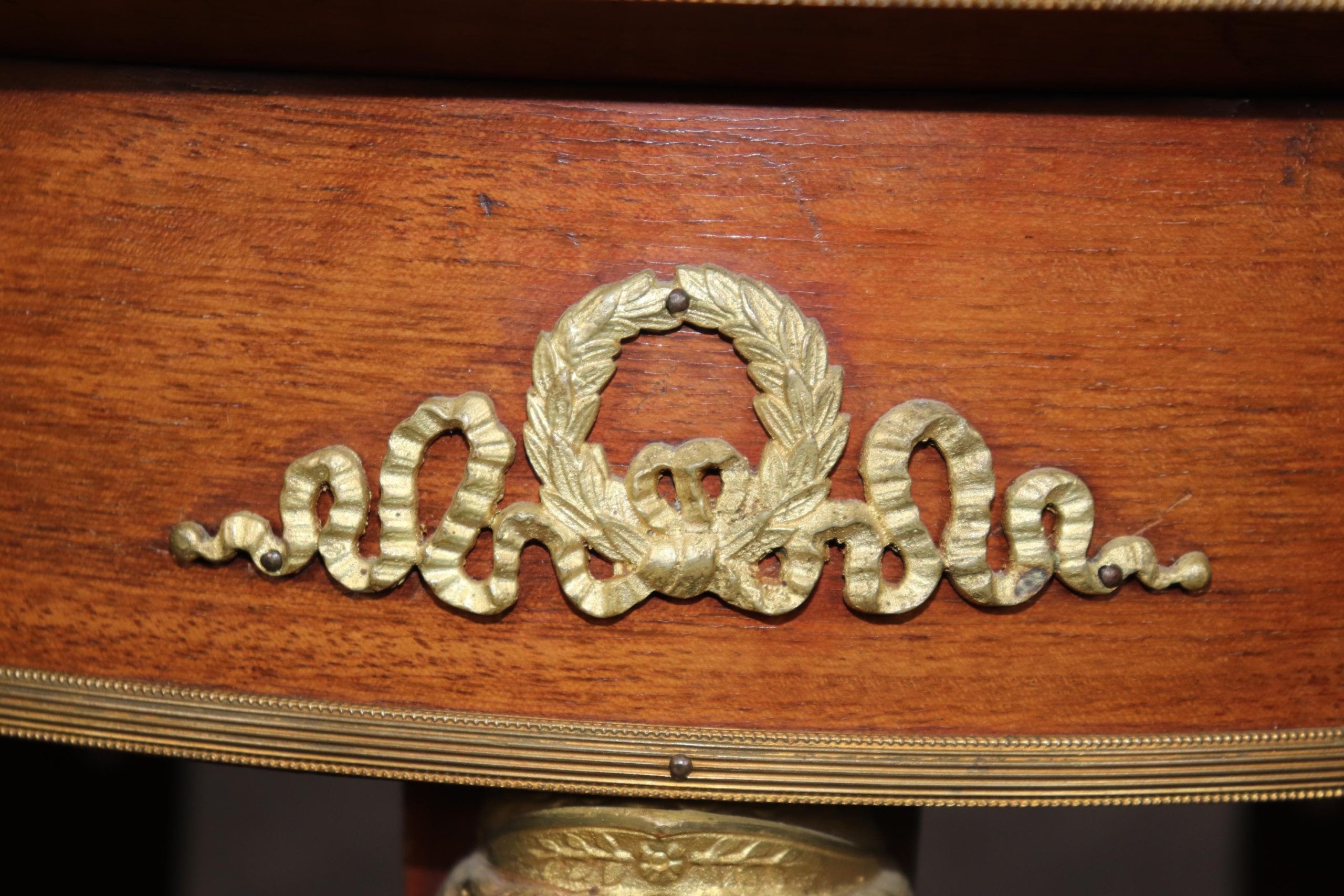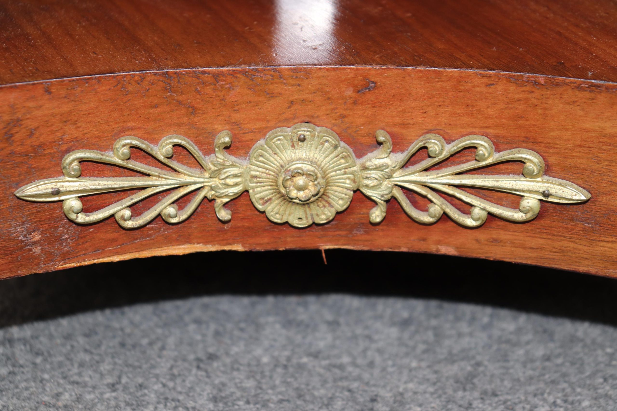 This vintage French Empire style bronze mounted pedestal table is perfect for you and your home! If you look at the photos provided, you can see the thick verdi green marble top as well as the attention to detail in the bronze mounts. This piece is bound to bring a sense of minimalistic luxury and modernism into your home or place of choosing and is perfect for any entryway, living room, bedroom, bathroom or office! This piece is equipped with a faux marble top. This piece will have your guests mesmerized by its design! This piece is in good vintage condition with the exception of some minor surface scratches and finish loss as to be expected, but otherwise good condition.