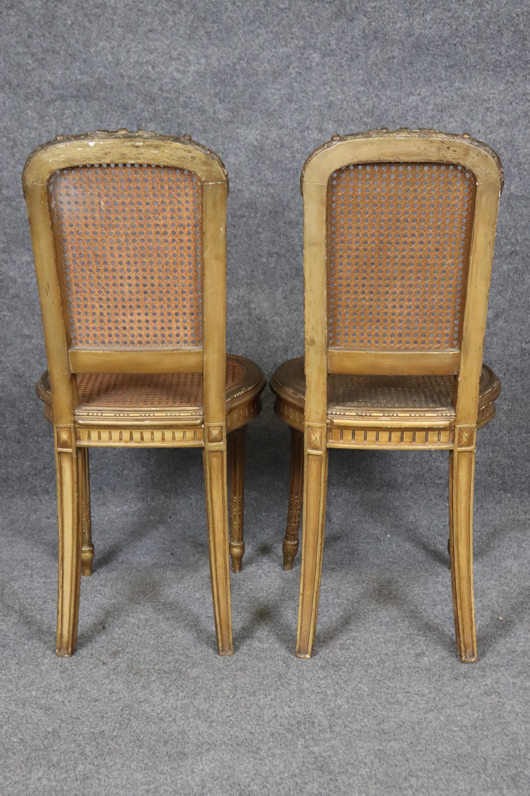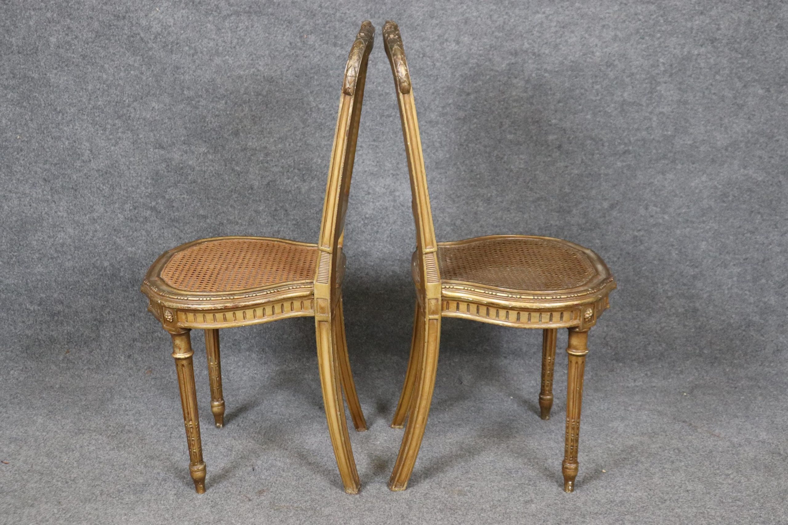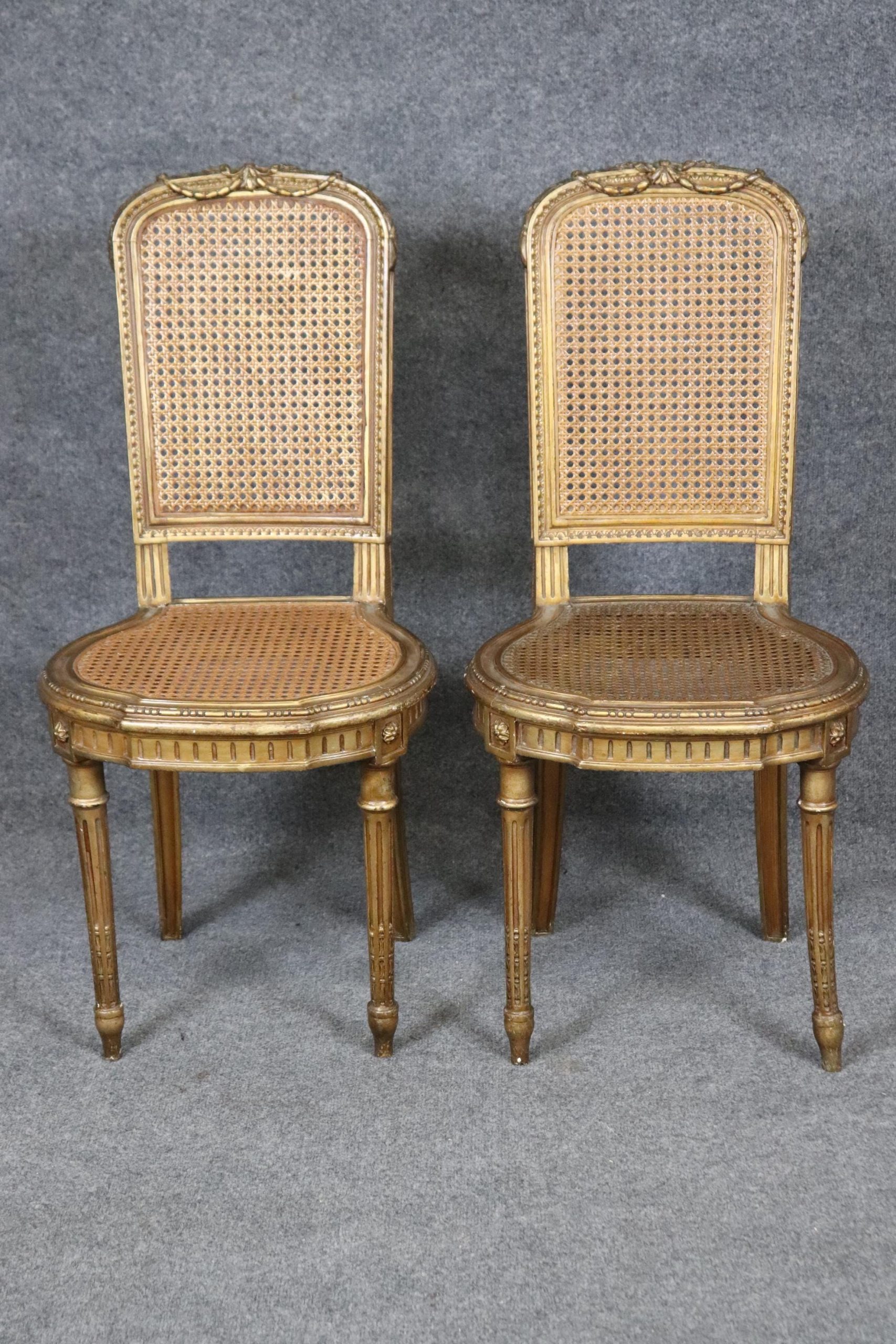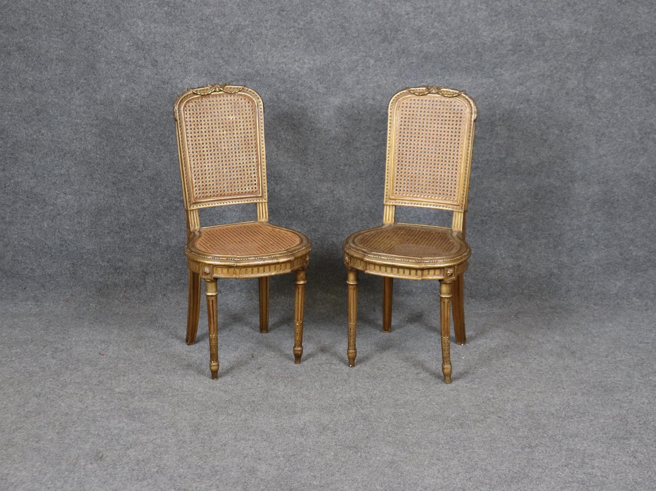 This pair of French Louis XVI gilt side chairs from the 1940’s is made of the highest quality! If you look at the photos provided, you can see the cane seats and backs as well as the hand carved fluted legs and neoclassical carved motifs throughout the frames. These chairs are bound to bring a sense of character and luxury into your living room, dining room, bedroom, entryway, office or place of your choosing and will certainly have your guests mesmerized by their attention to detail! The pair can be used functionally as chairs on a daily basis or they can be sued for decoration. One nice aspect is this chairs ability to be paired with a variety of other styles that already be in your home due to their simplistic yet elegant design. This pair is in good, antique condition with light surface scratches and minor finish loss as well as normal wear as to be expected with items of age and use.