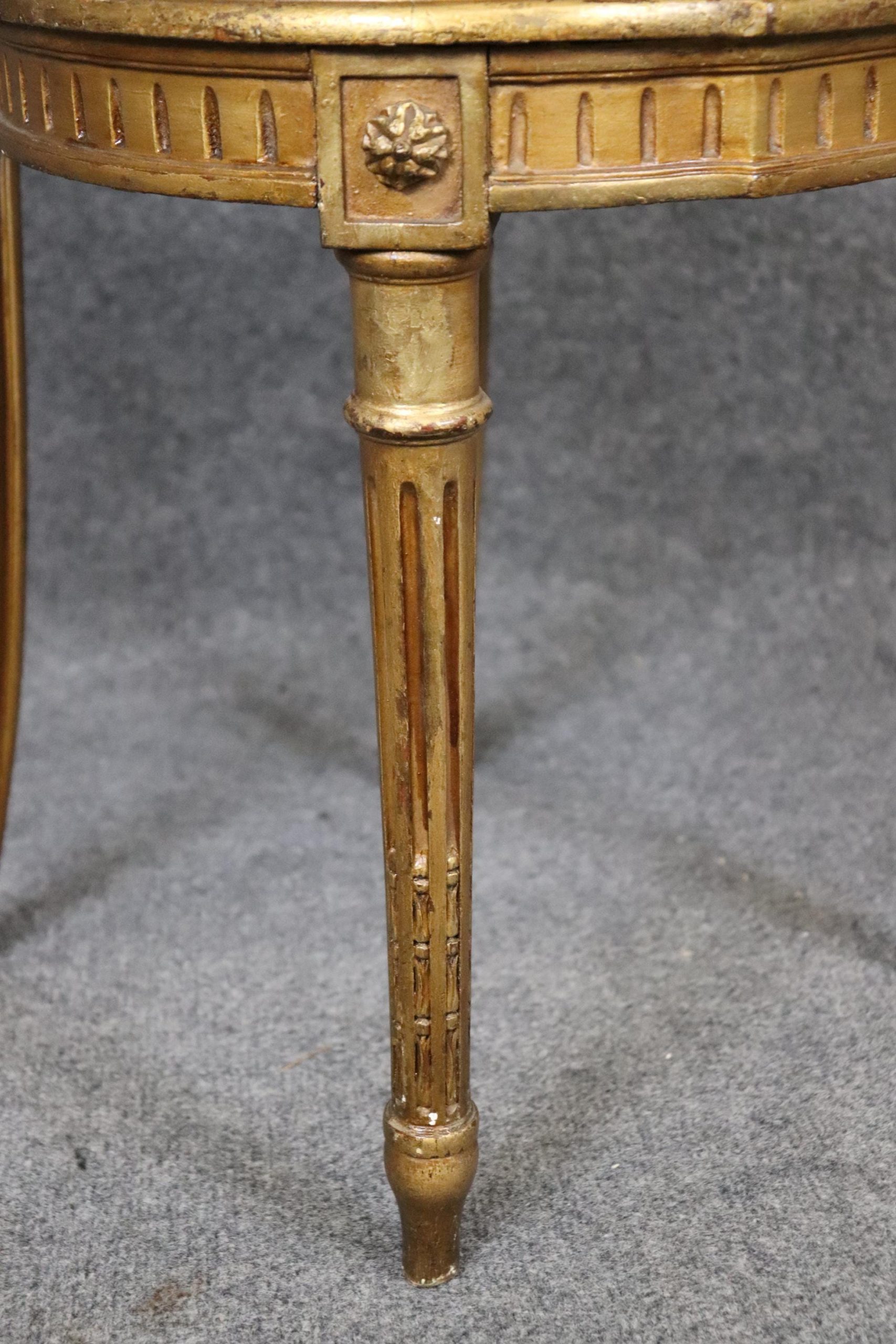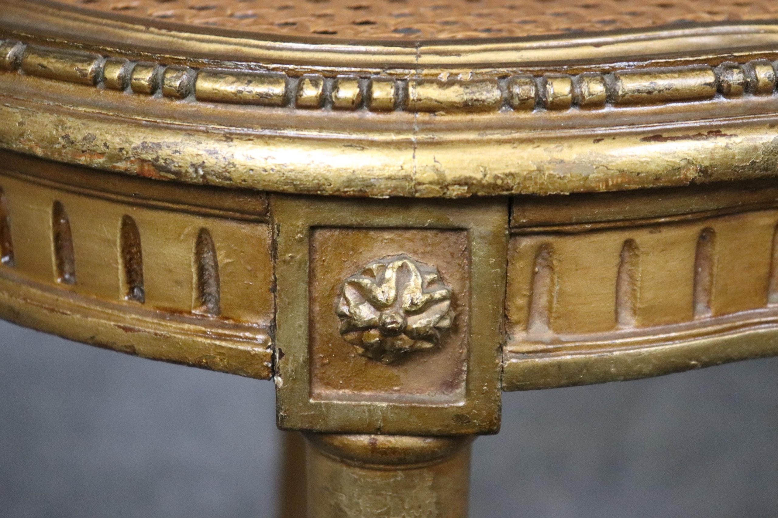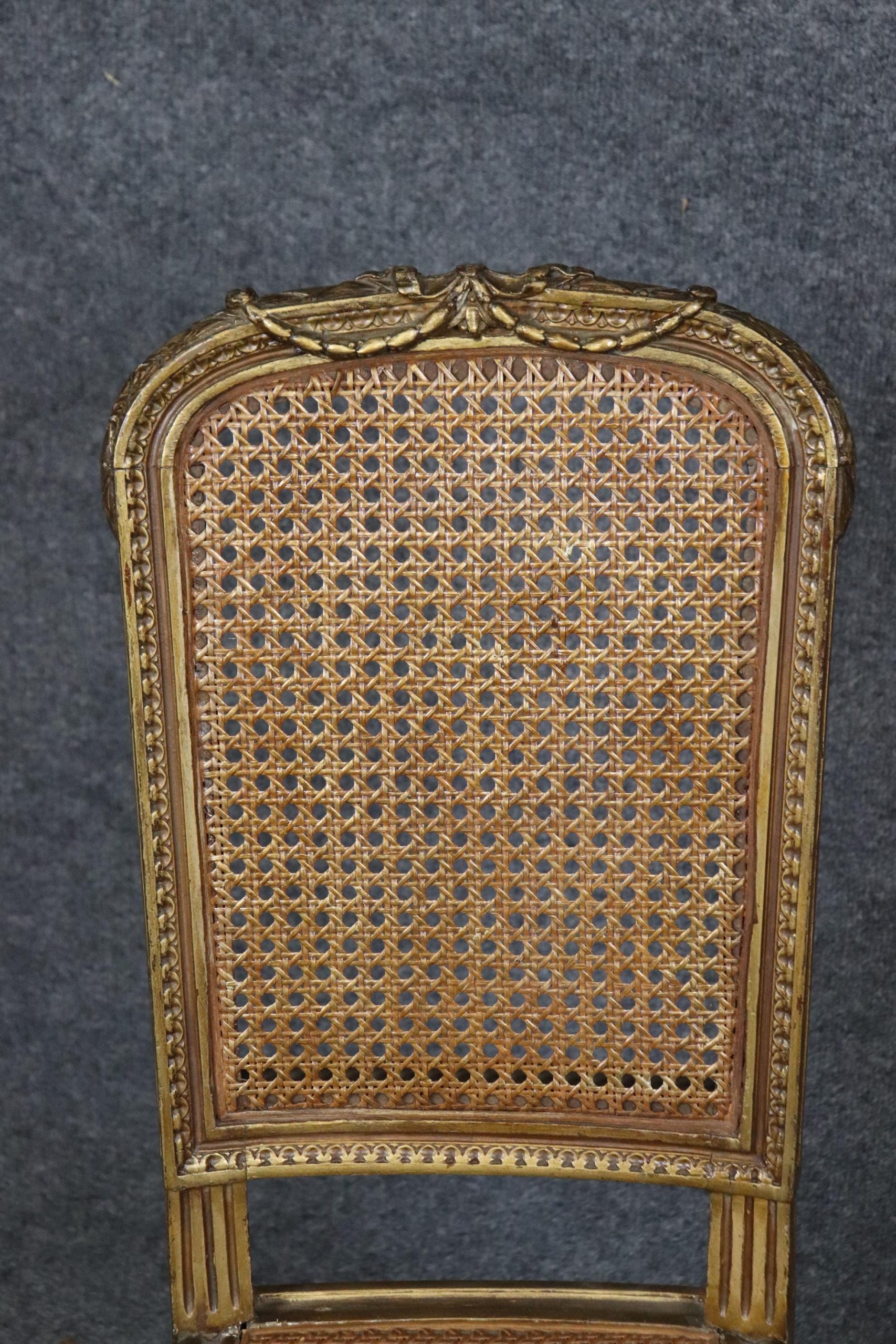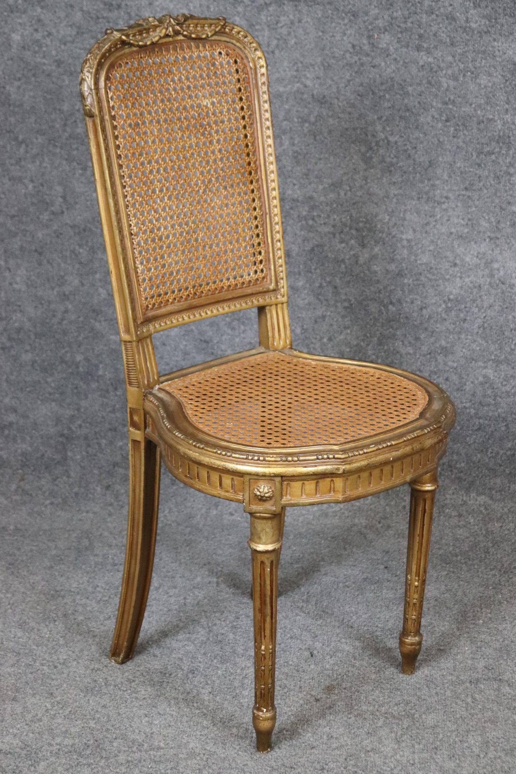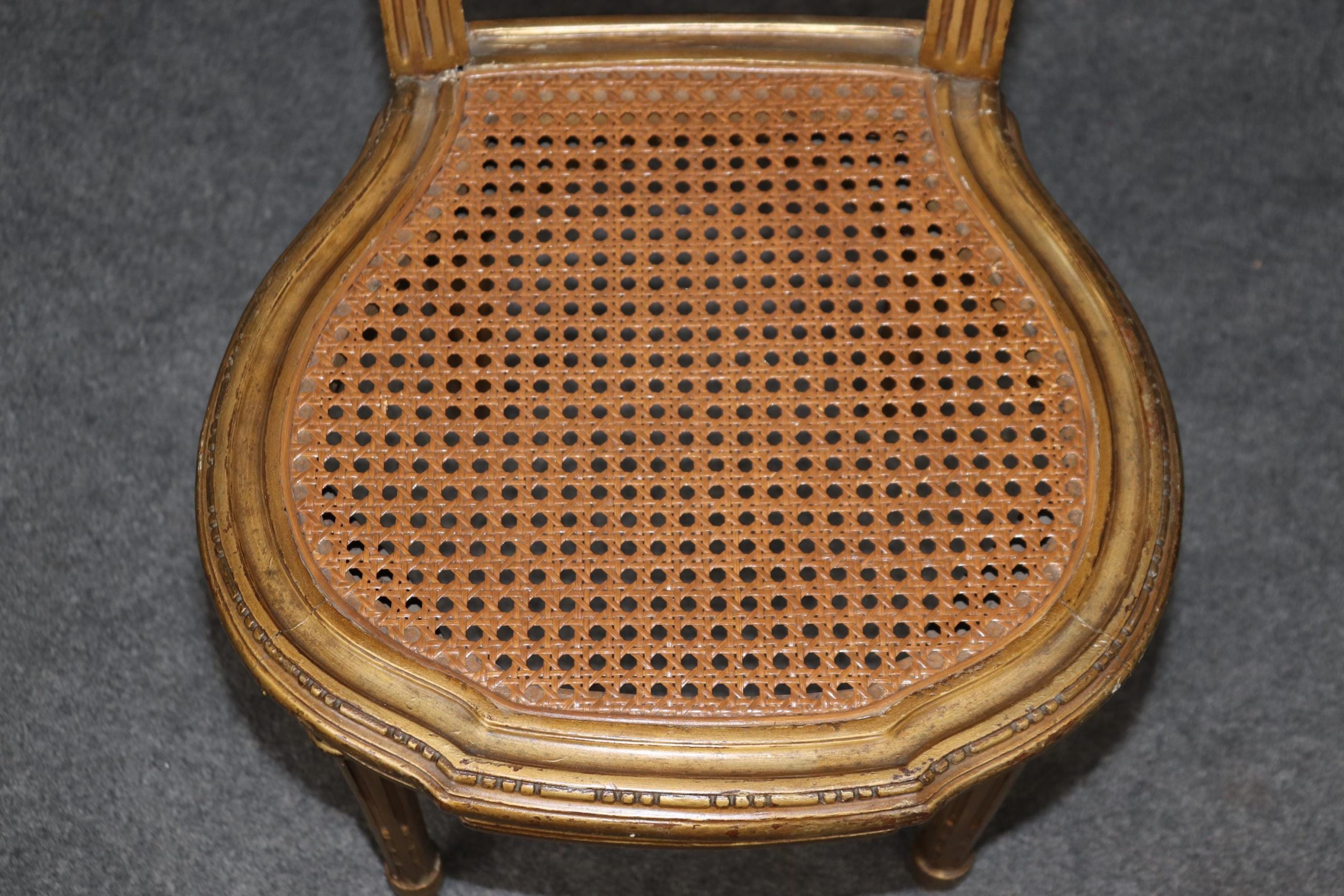 This pair of French Louis XVI gilt side chairs from the 1940’s is made of the highest quality! If you look at the photos provided, you can see the cane seats and backs as well as the hand carved fluted legs and neoclassical carved motifs throughout the frames. These chairs are bound to bring a sense of character and luxury into your living room, dining room, bedroom, entryway, office or place of your choosing and will certainly have your guests mesmerized by their attention to detail! The pair can be used functionally as chairs on a daily basis or they can be sued for decoration. One nice aspect is this chairs ability to be paired with a variety of other styles that already be in your home due to their simplistic yet elegant design. This pair is in good, antique condition with light surface scratches and minor finish loss as well as normal wear as to be expected with items of age and use.