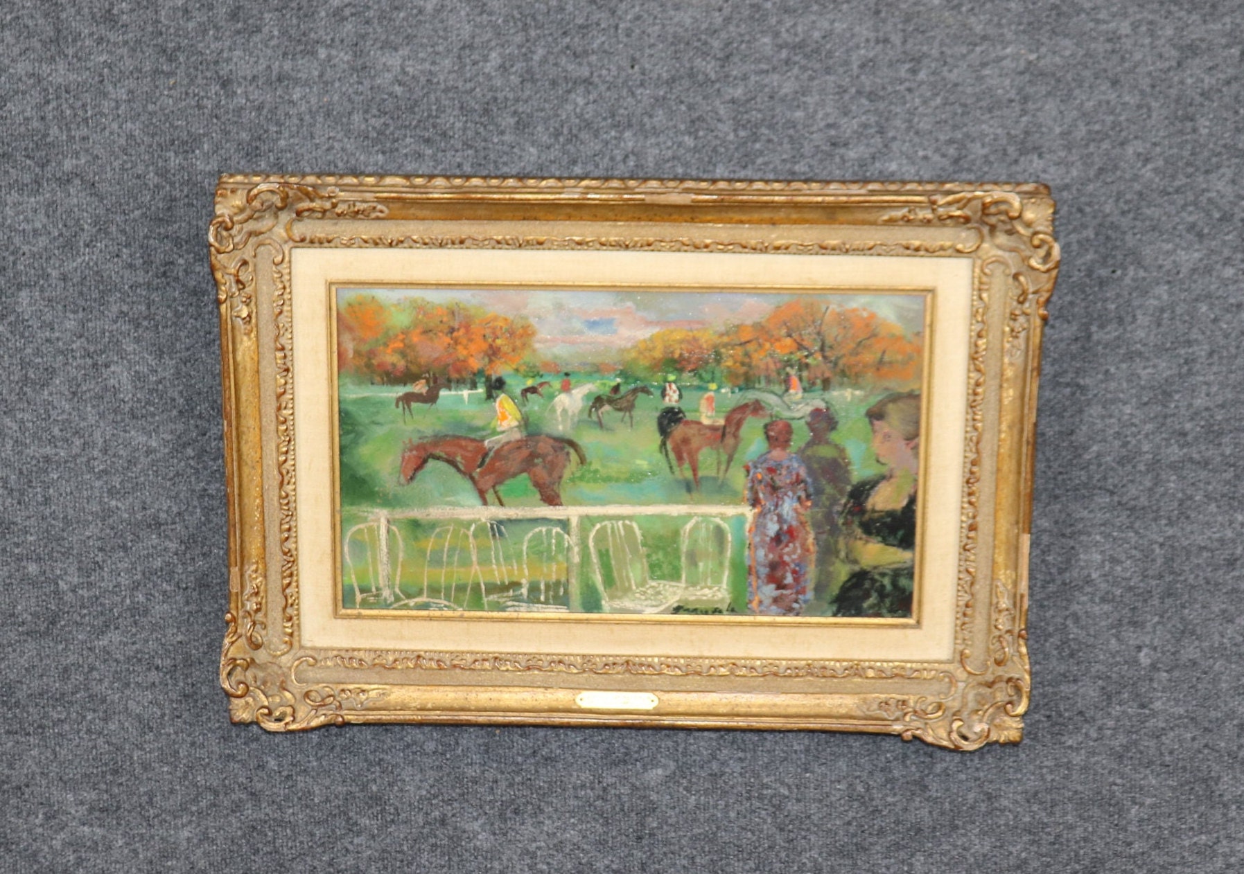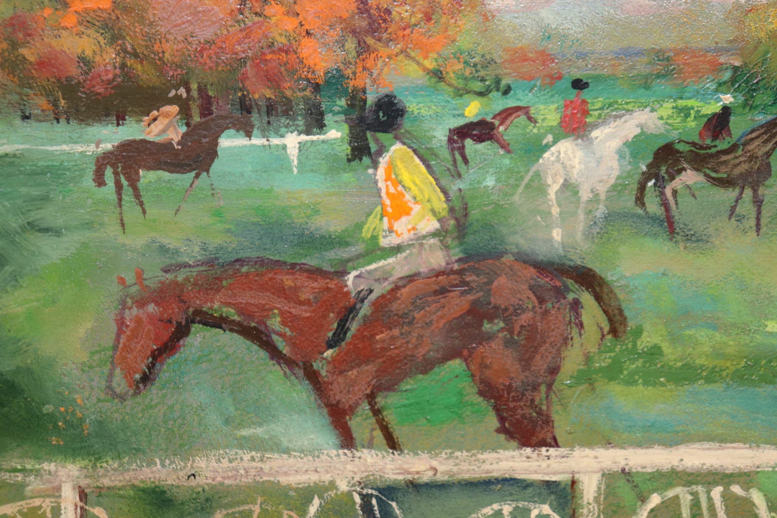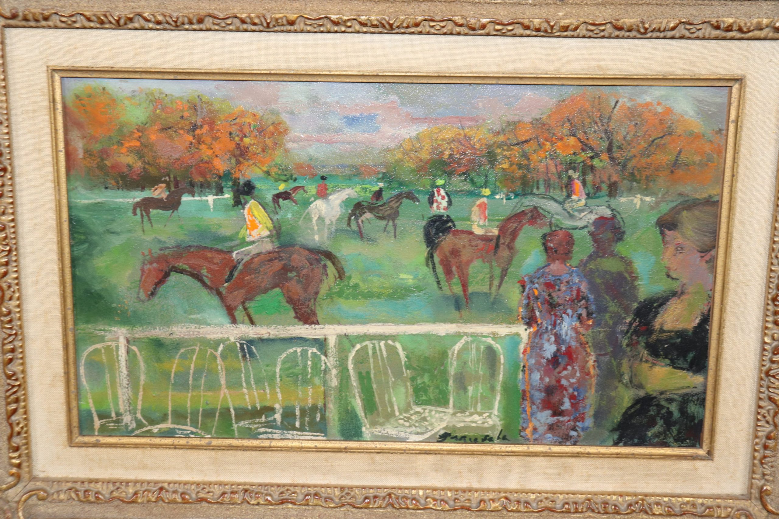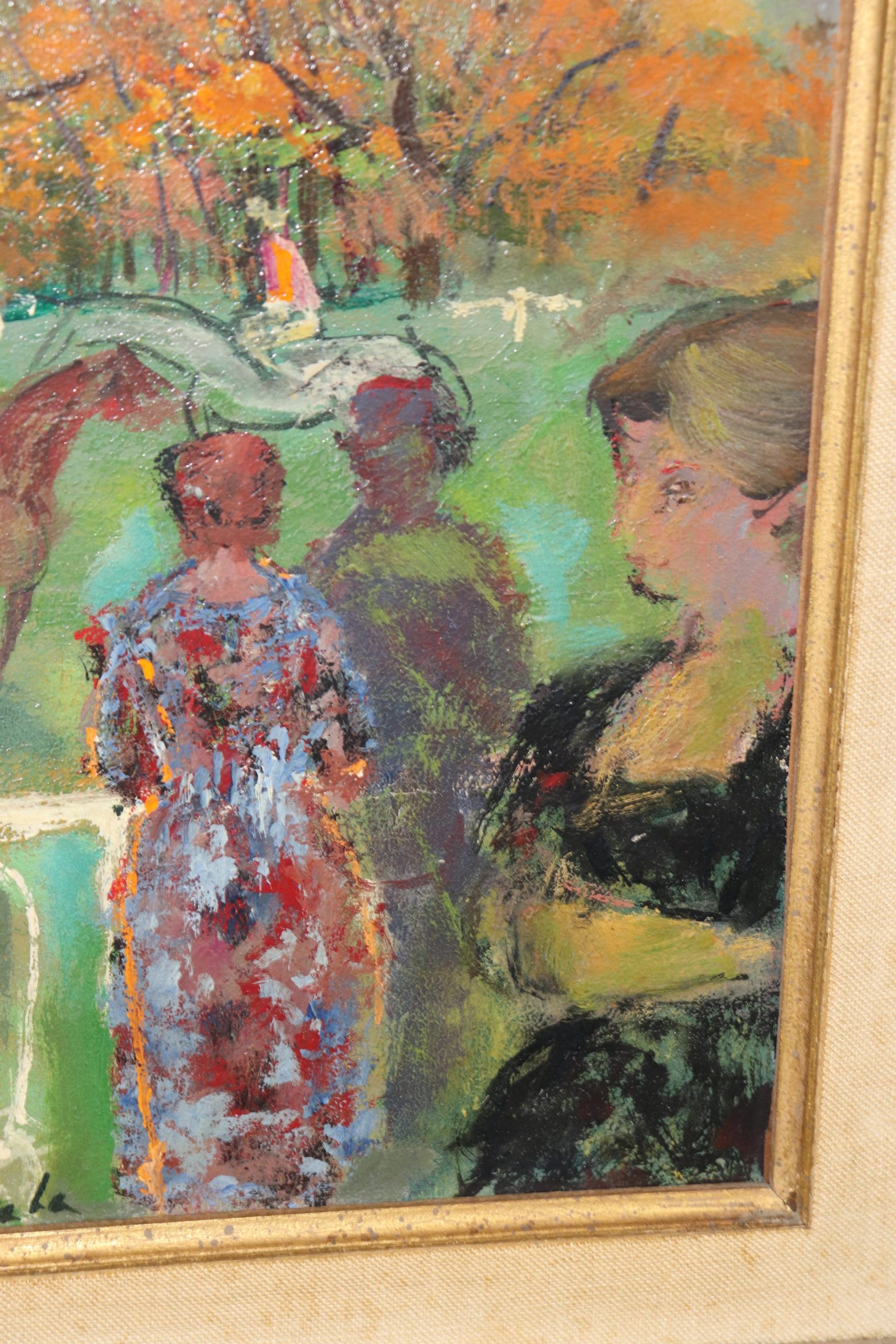 This Mid Century Modern oil painting on canvas is perfect for you and your home! Emilio (Emi) Grau Sala (1911, Barcelona – 1975, Paris) was a Catalan painter. He was a famous colorist (oil painting, watercolor and pastel) and illustrator. If you look at the photos provided, you can see the painting depicts several jockeys on horses. This painting is bound to bring a sense of luxury and sophistication to your entryway, living room, dining room, office, or place of your choosing! This painting is an investment grade piece that will last your family for many years to come. The painting is in good vintage condition with finish loss to the frame as to be expected of an item of this age.