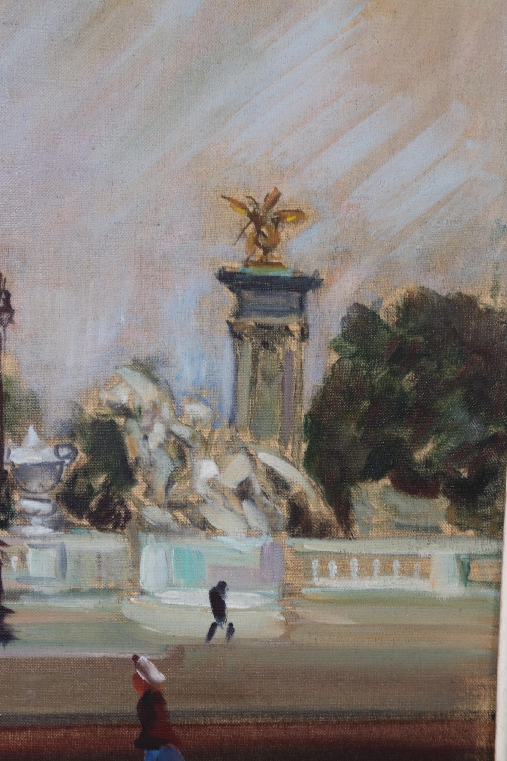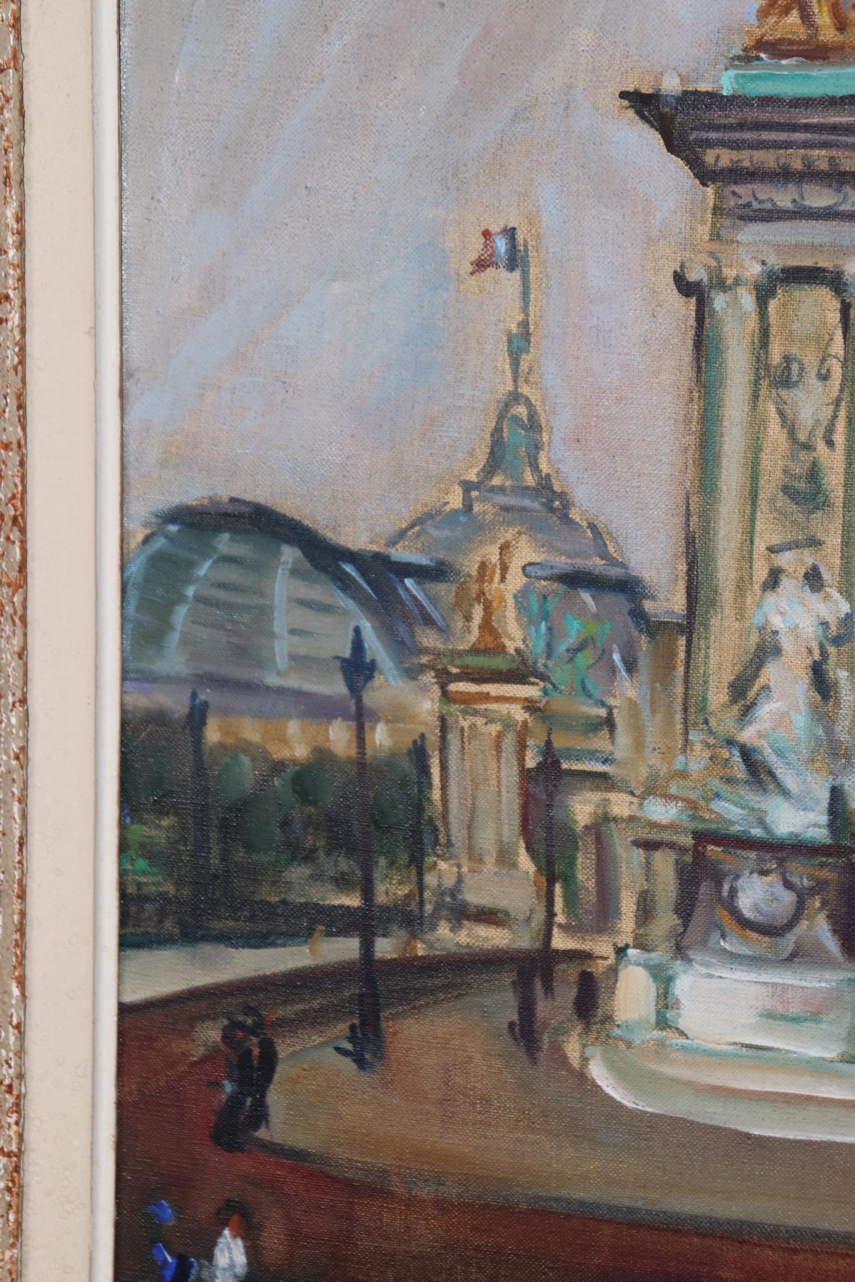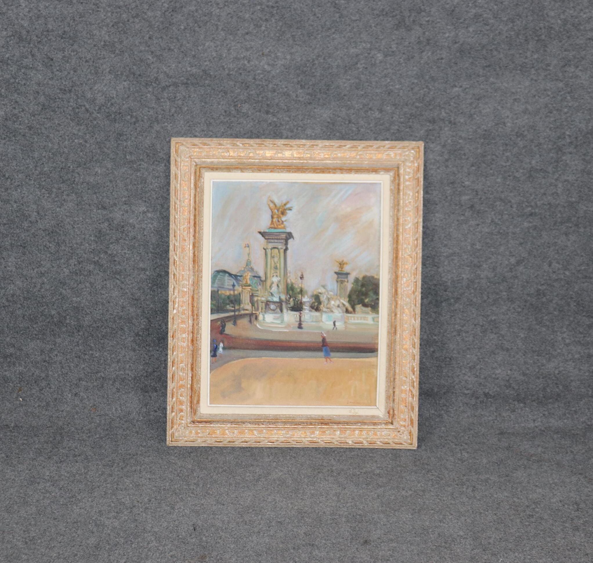 This vintage French oil painting of a Paris cityscape on canvas is perfect for you and your home1 If you look at the photos provided, we can see the intentionally distressed frame. This painting is bound to bring a sense of luxury and sophistication to your entryway, living room, dining room, office, or place of your choosing! This painting is an investment grade piece that will last your family for many years to come. The painting is in good vintage condition with finish loss to the frame as to be expected of an item of this age.
