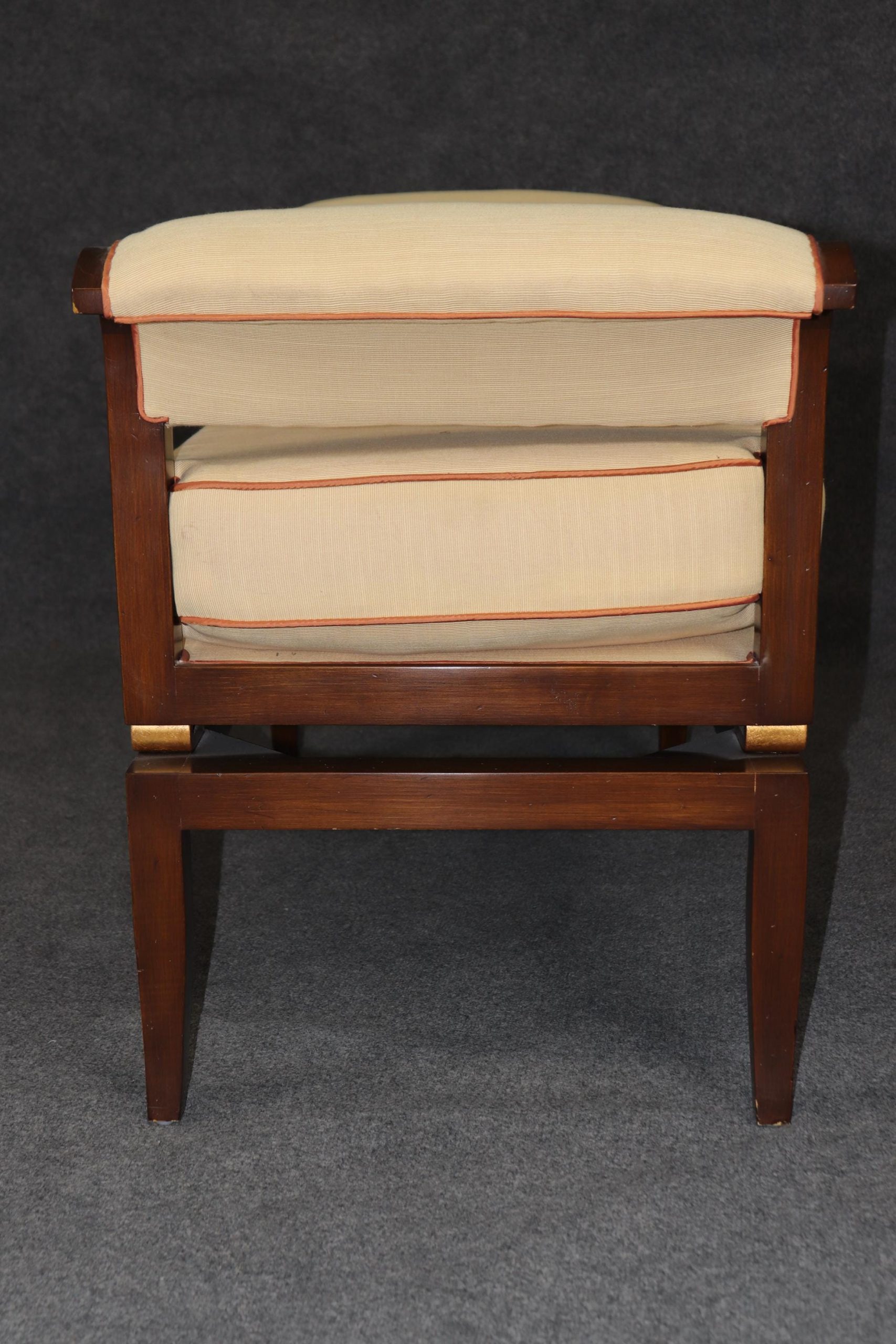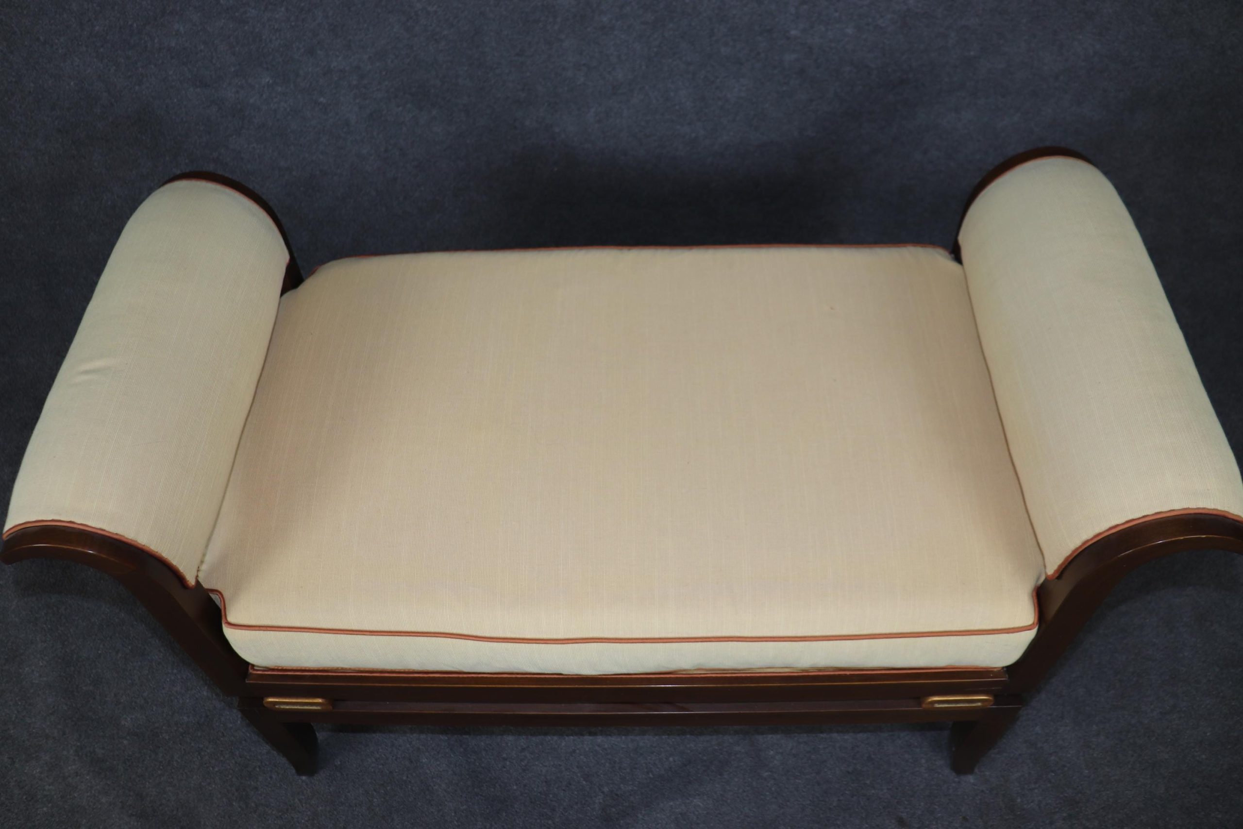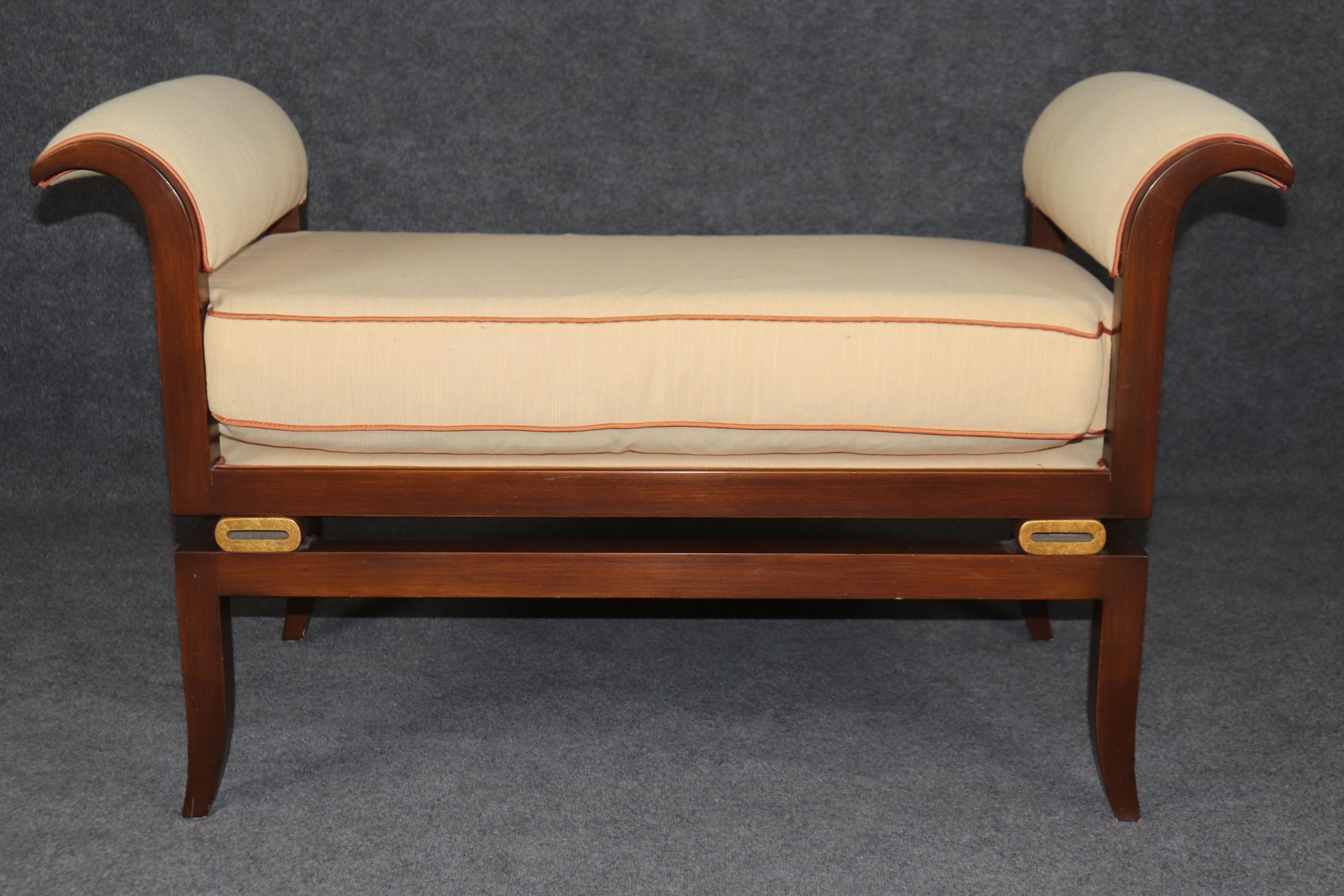 This vintage contemporary Hollywood Regency style window bench is a high quality piece! If you look at the photos provided, you can see the luxurious upholstery. This boudoir window bench will add a nice sense of subtle luxury into your living room, bedroom, office or other place of your choosing! At first glance the piece looks ordinary however as you get closer you begin to see the lovely gilt accents as well as the beautiful grain within the wood. This piece is perfect for combining functionality with style and will certainly separate your home from your friends and family. The bench is in good vintage condition with surface scratches to frame and some wear to the upholstery, as to be expected for a bench from the 1990’s.