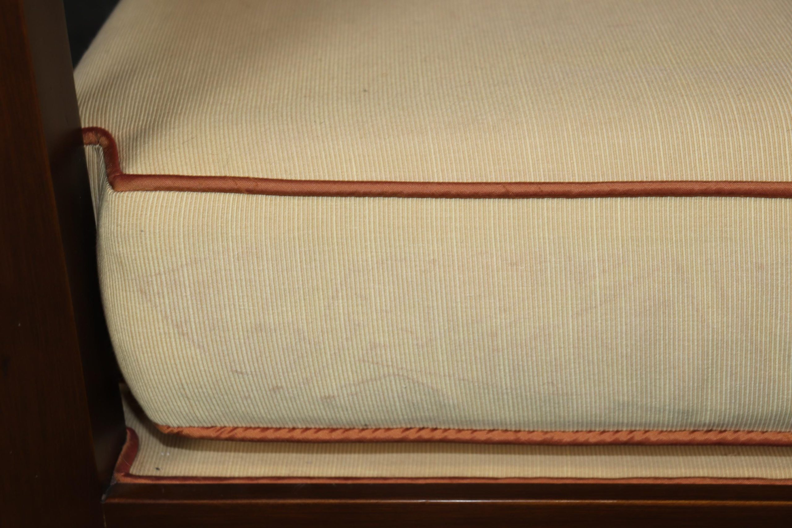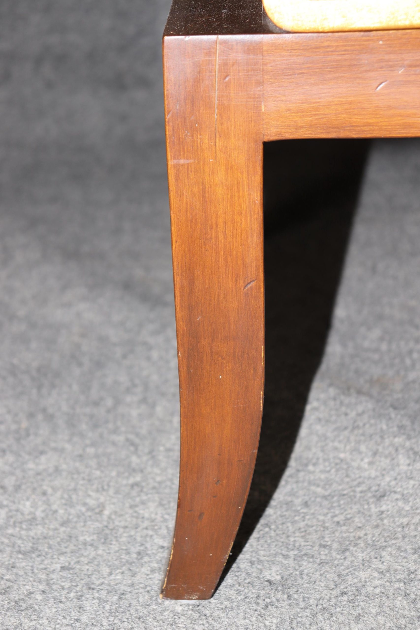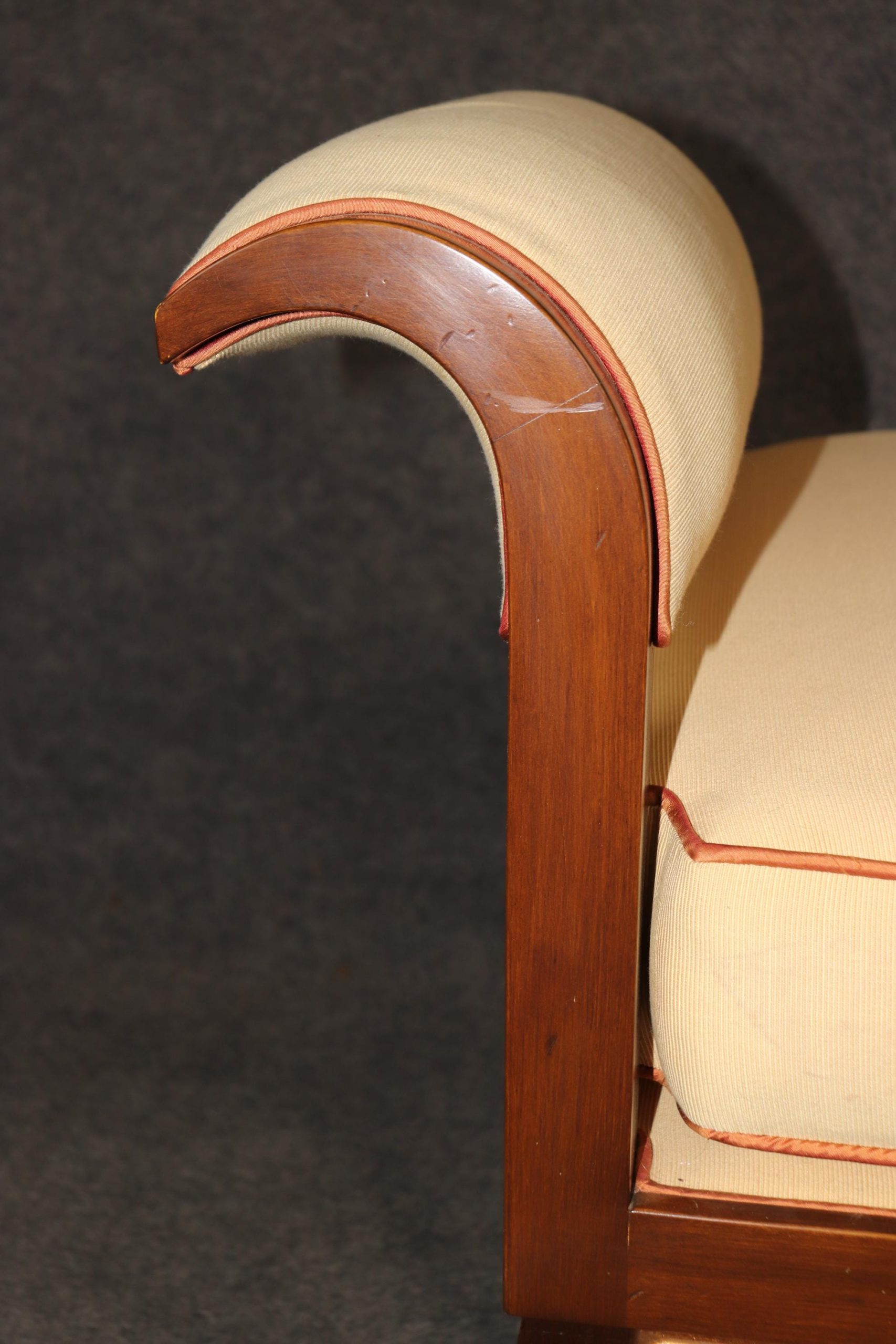 This vintage contemporary Hollywood Regency style window bench is a high quality piece! If you look at the photos provided, you can see the luxurious upholstery. This boudoir window bench will add a nice sense of subtle luxury into your living room, bedroom, office or other place of your choosing! At first glance the piece looks ordinary however as you get closer you begin to see the lovely gilt accents as well as the beautiful grain within the wood. This piece is perfect for combining functionality with style and will certainly separate your home from your friends and family. The bench is in good vintage condition with surface scratches to frame and some wear to the upholstery, as to be expected for a bench from the 1990’s.