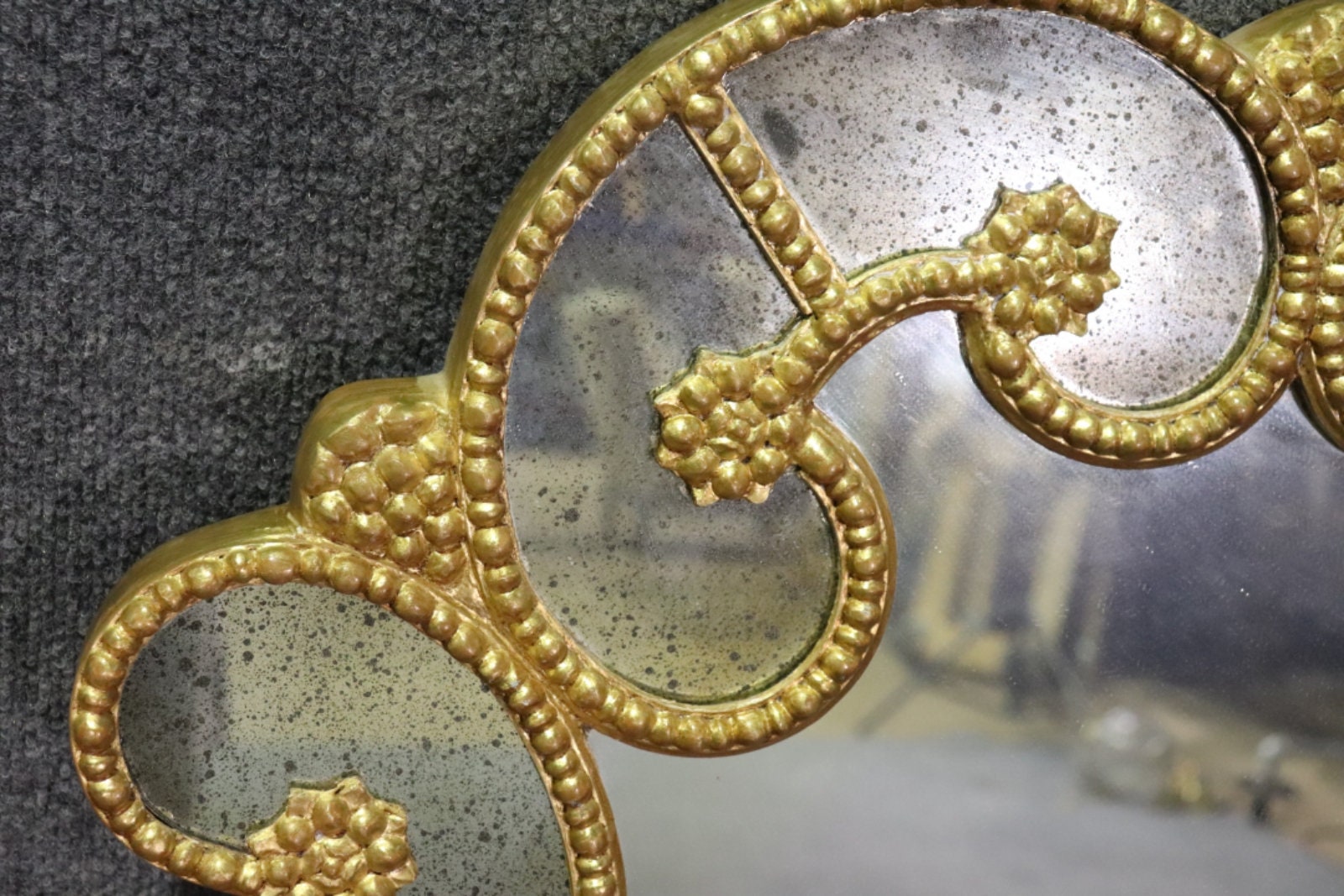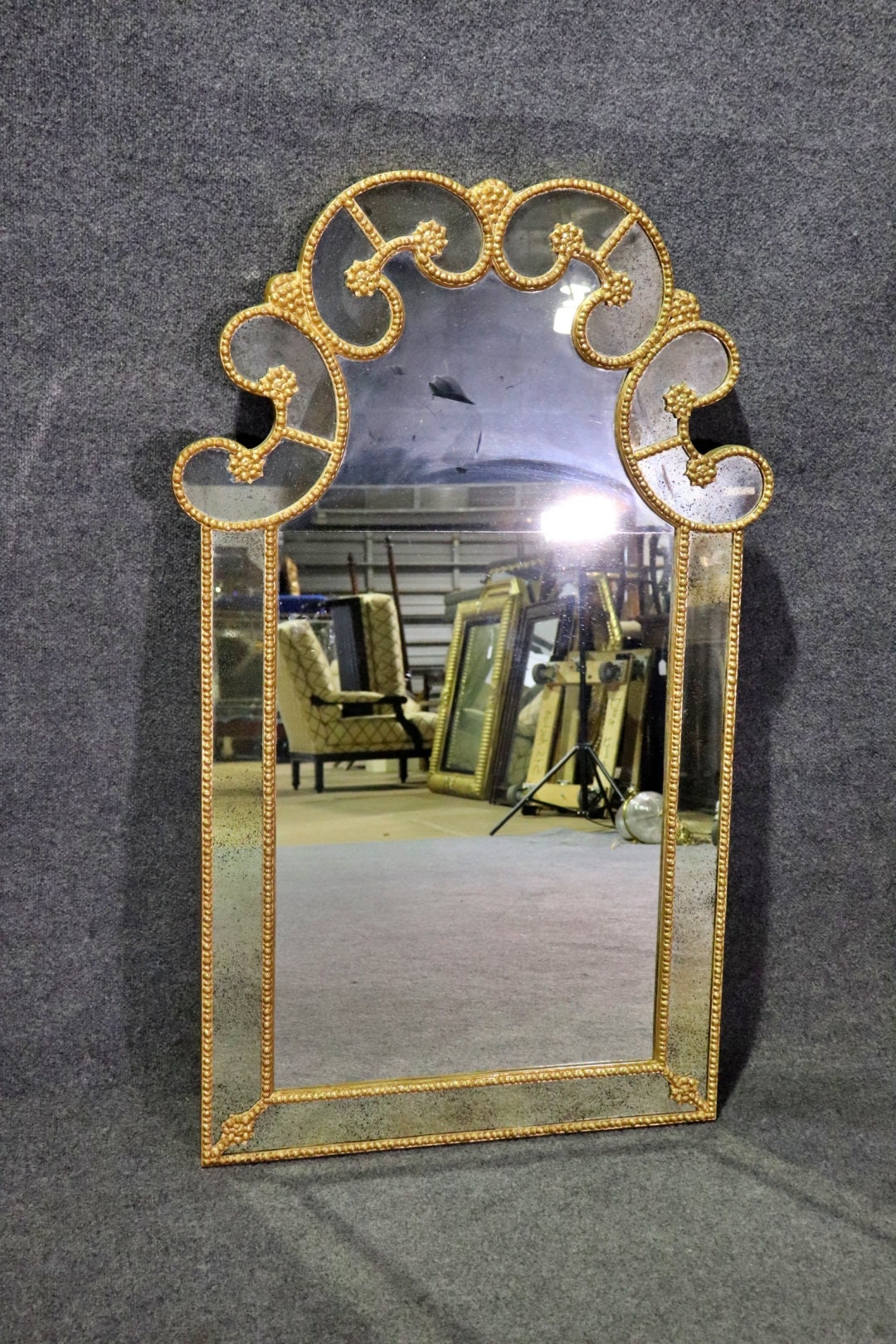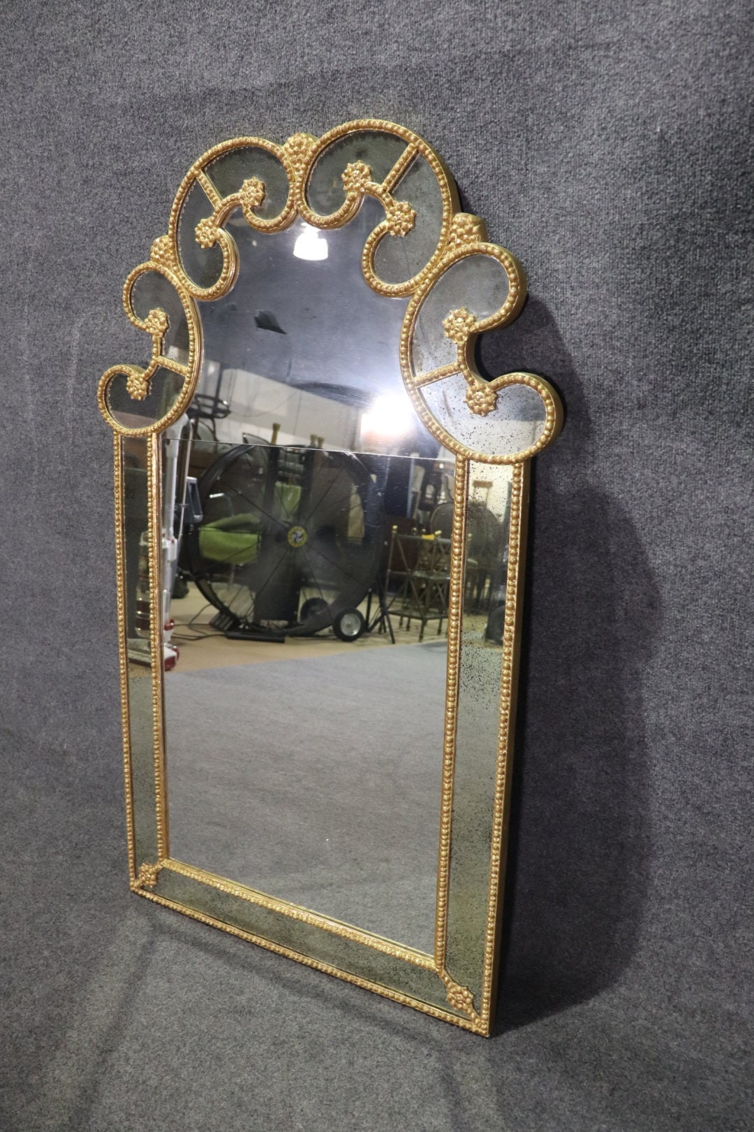 This vintage Hollywood Regency style gilt hanging wall mirror is made of the highest quality and is perfect if you are looking for a mirror with class and elegance! If you look at the photos provided, you can see the eglomise trim adorning the mirror. This piece will certainly be a conversation starter at your next gathering or event and will have your guests mesmerized by its attention to detail and elegance! This will be perfect in your entryway, living room, dining room, office, bedroom, bathroom or place of your choosing! The mirror is in good vintage condition with some minor finish loss, but otherwise good condition.
