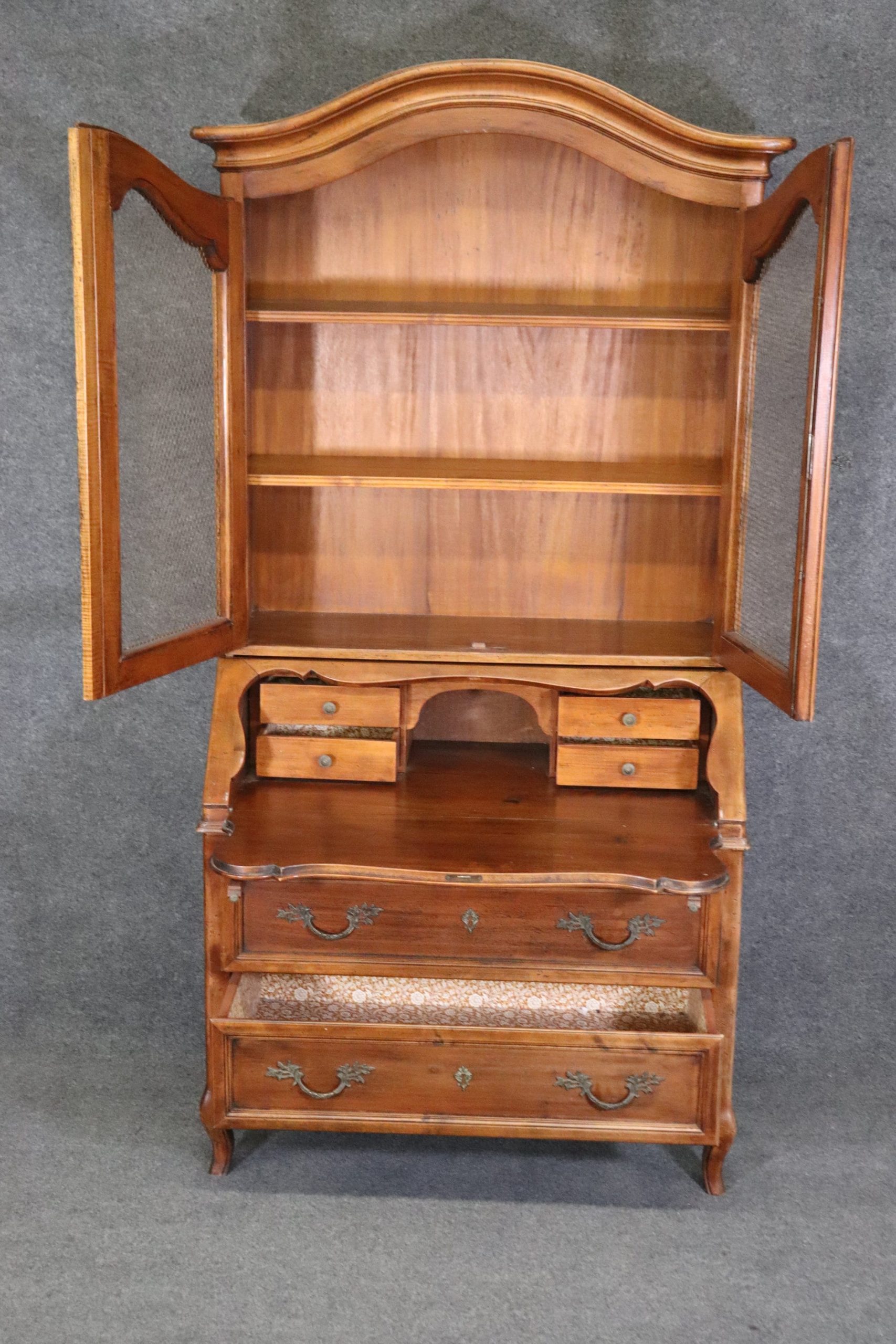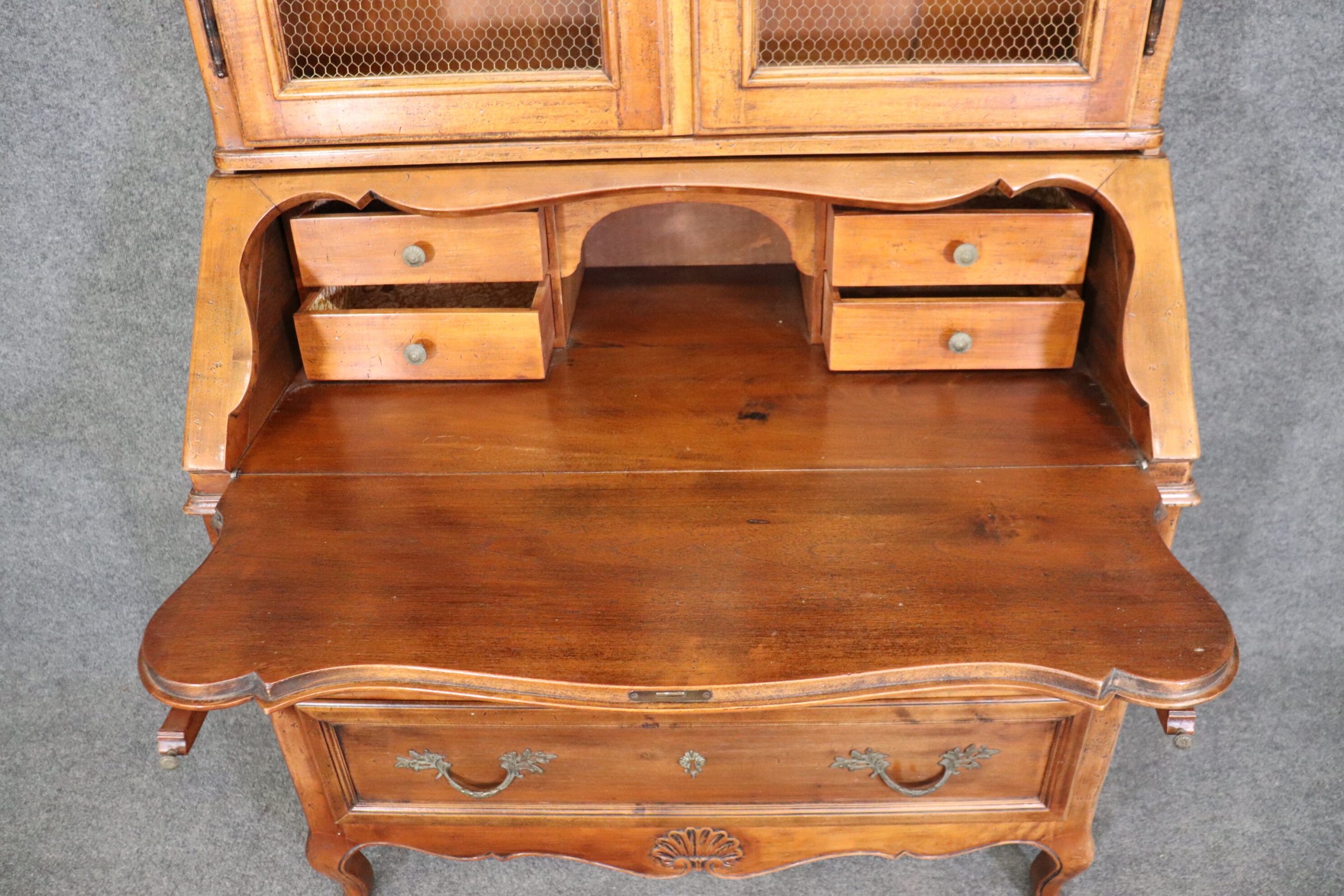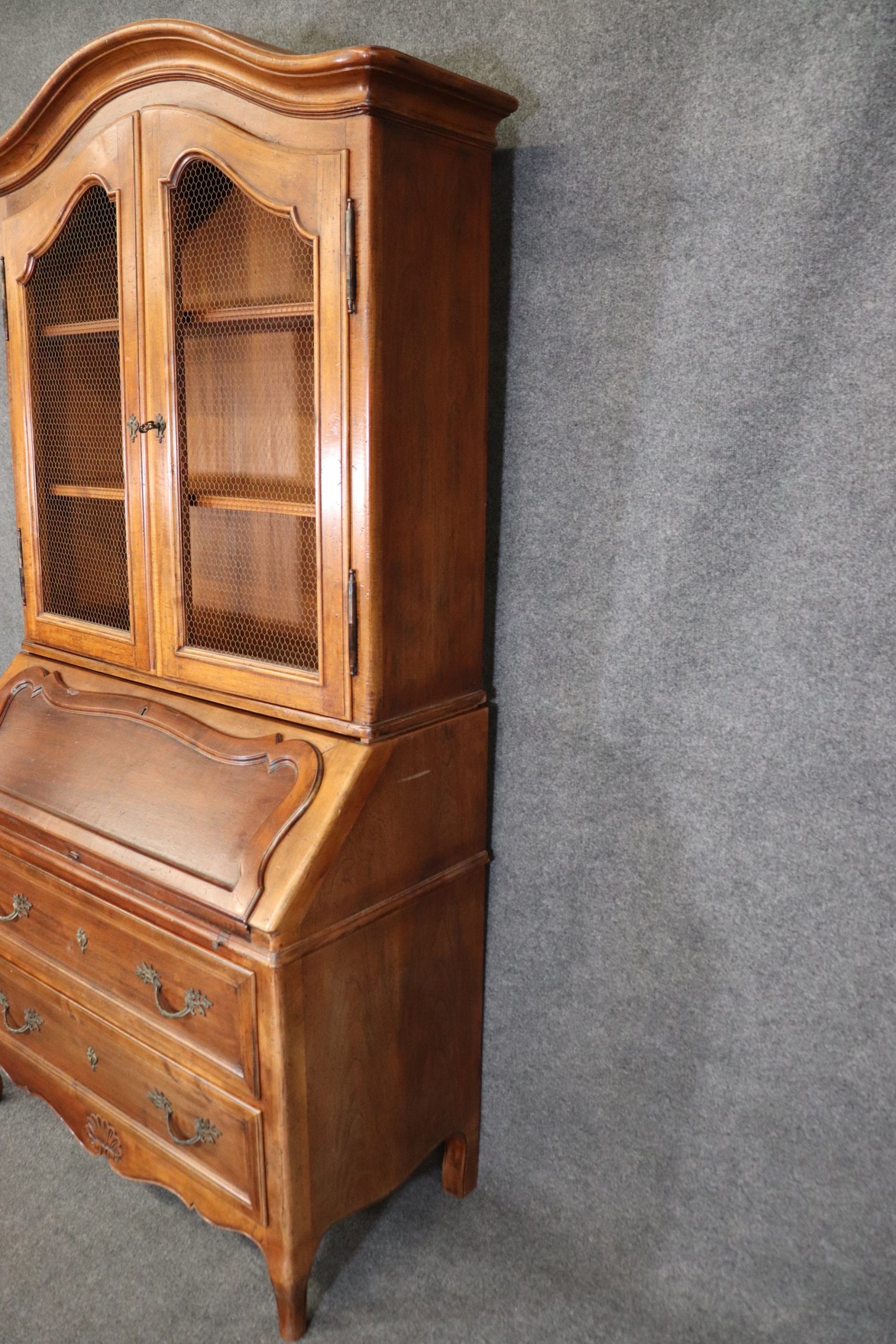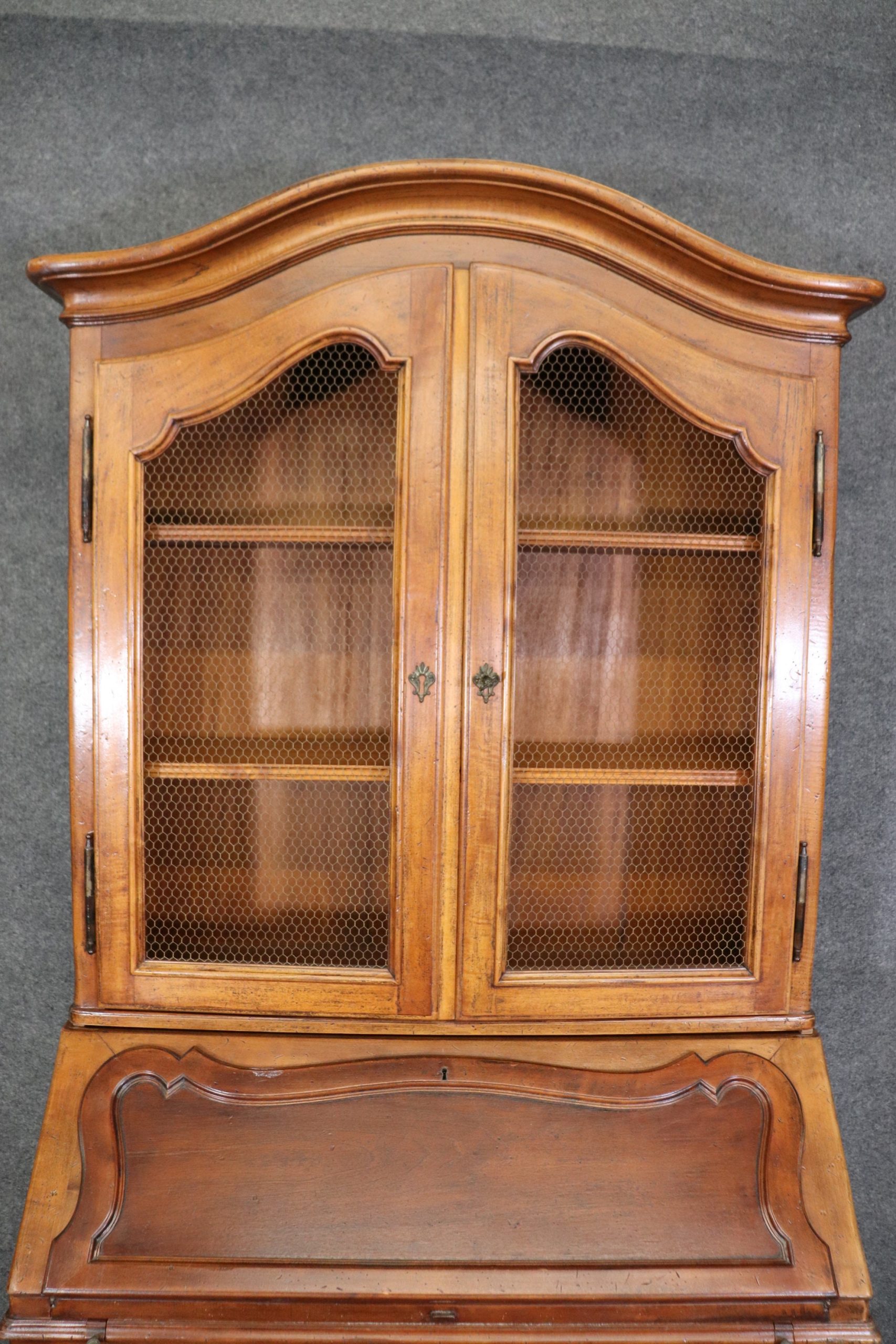 This Italian made Country French 2 piece walnut secretary desk was made exclusively for Macy’s. This piece is perfect for any living room, bedroom, office, kitchen or large bathroom and is equipped with 2 shelves behind wire mesh doors over a drop desk and 2 spacious drawers perfect for storing your personal belongings all while bringing a sense on luxury and class into your home! If you look at the photos provided, you can see the detail in the carvings. The secretary is in vintage condition with normal age related chips, finish losses and wear.