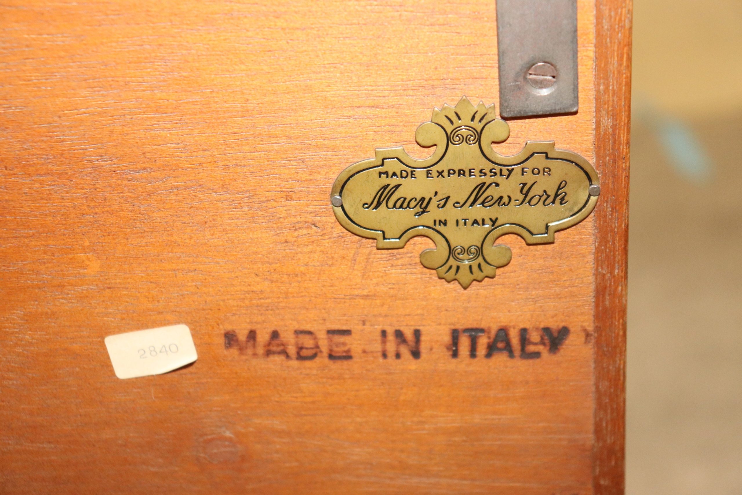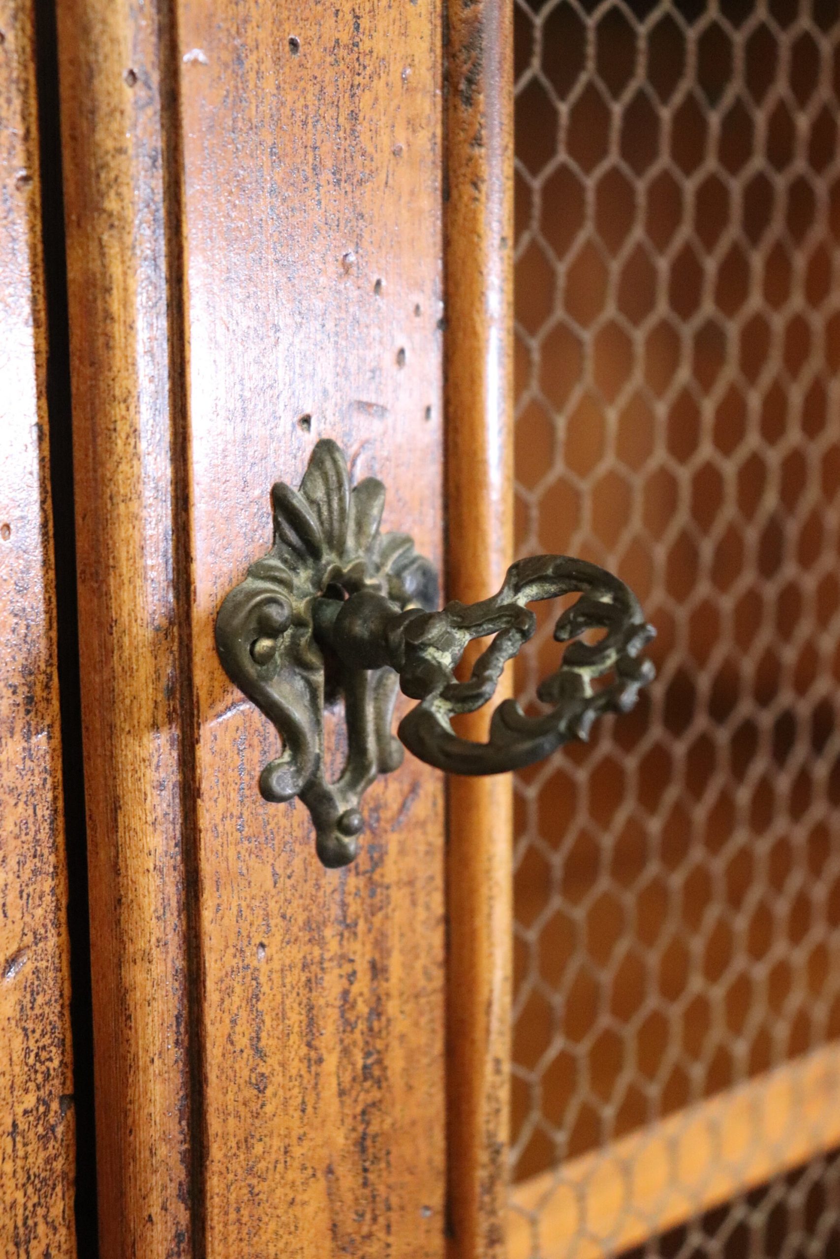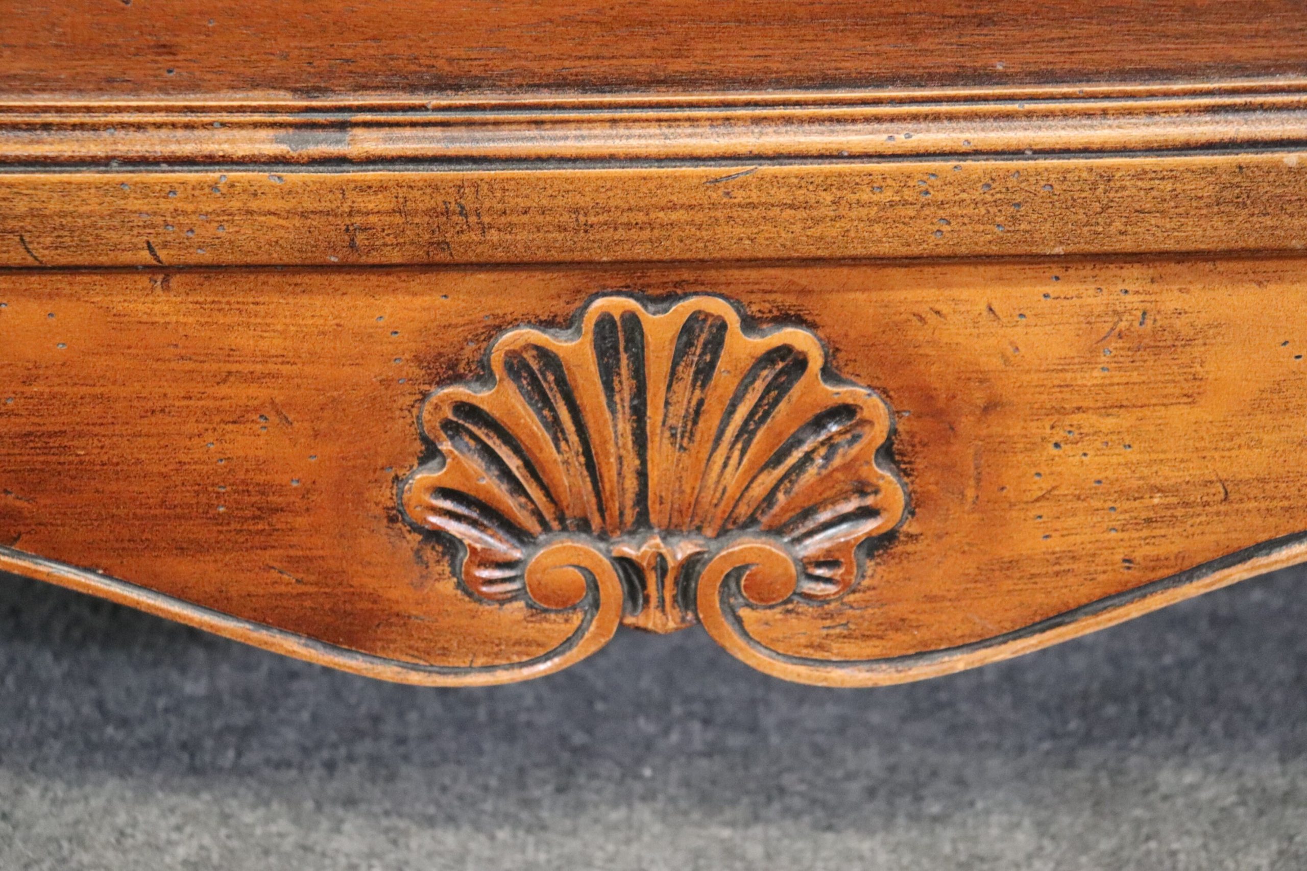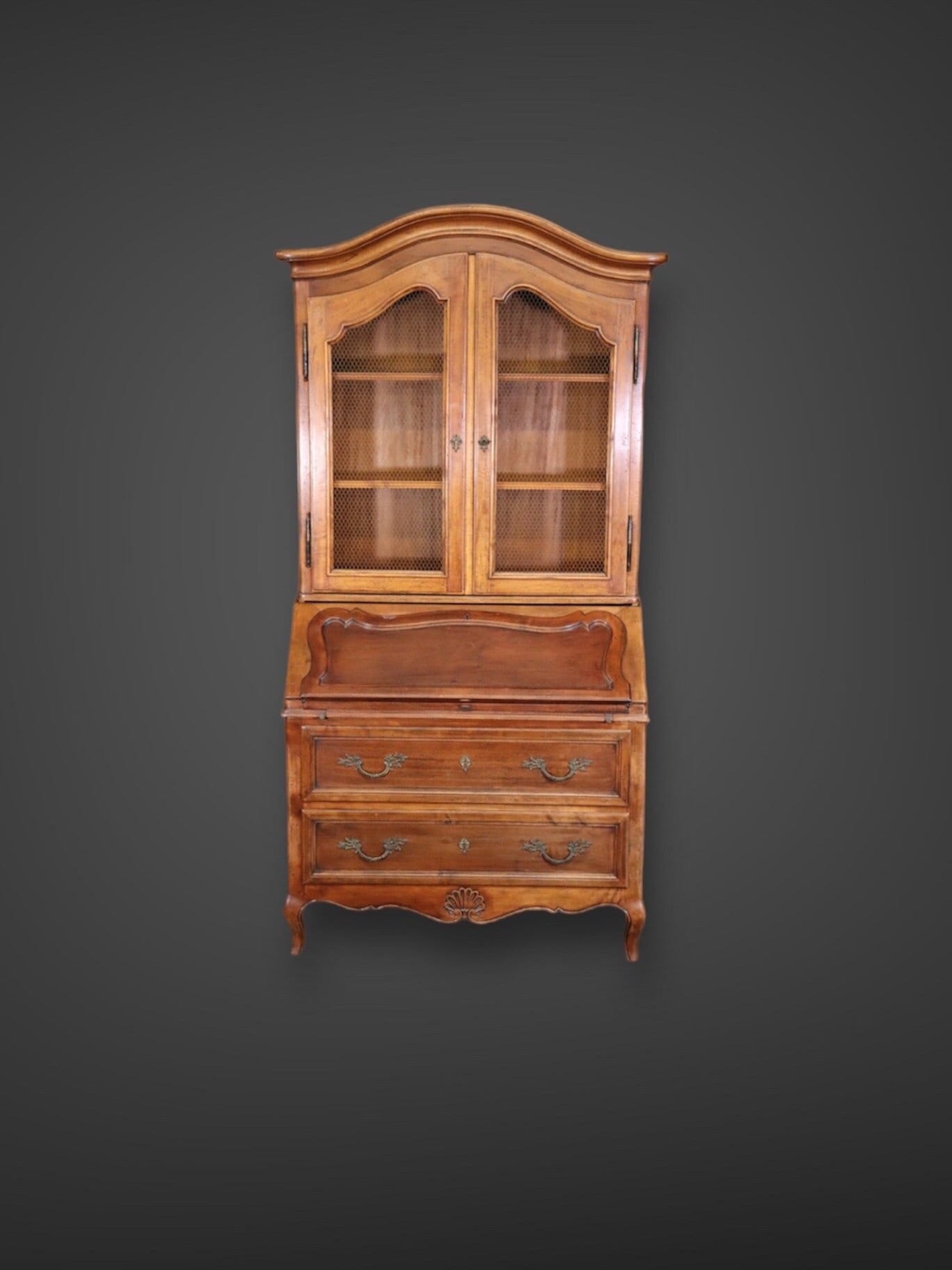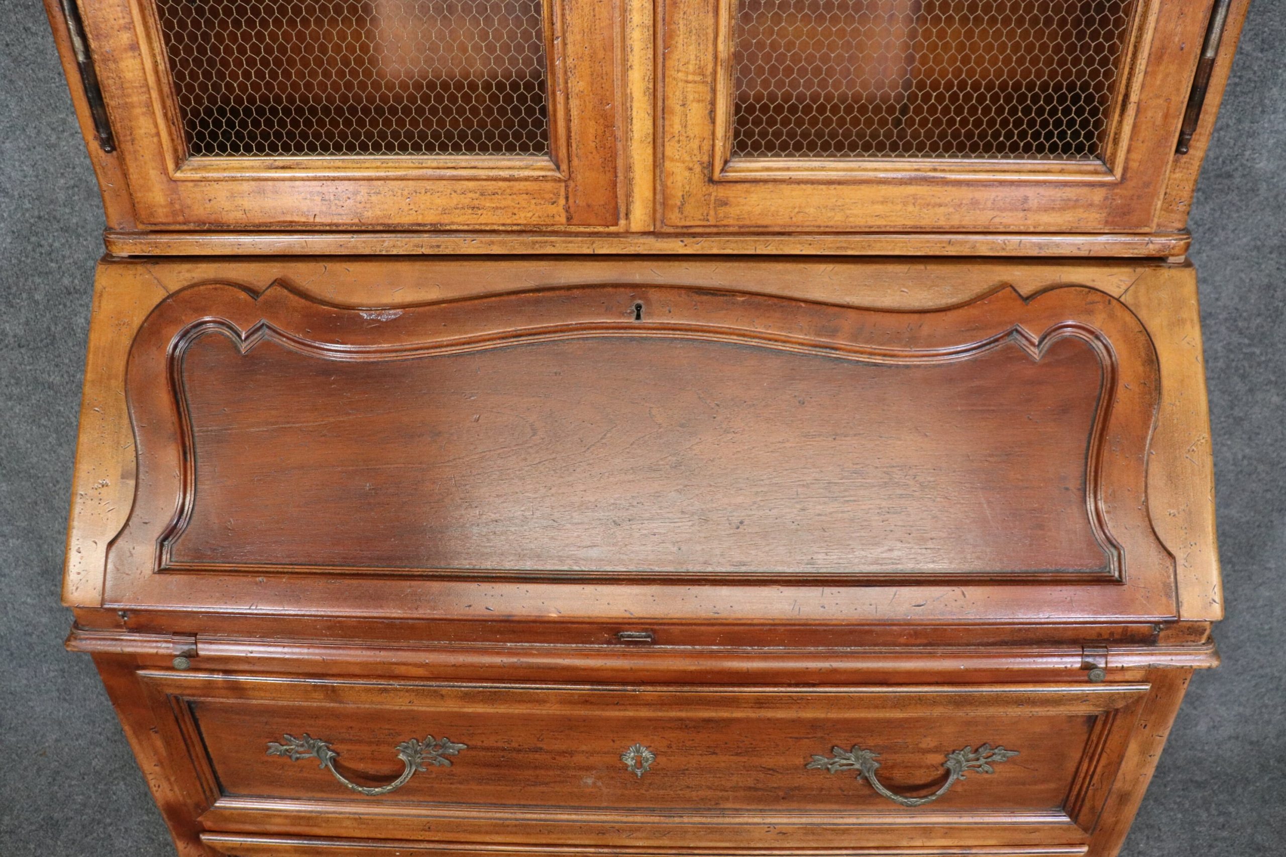 This Italian made Country French 2 piece walnut secretary desk was made exclusively for Macy’s. This piece is perfect for any living room, bedroom, office, kitchen or large bathroom and is equipped with 2 shelves behind wire mesh doors over a drop desk and 2 spacious drawers perfect for storing your personal belongings all while bringing a sense on luxury and class into your home! If you look at the photos provided, you can see the detail in the carvings. The secretary is in vintage condition with normal age related chips, finish losses and wear.