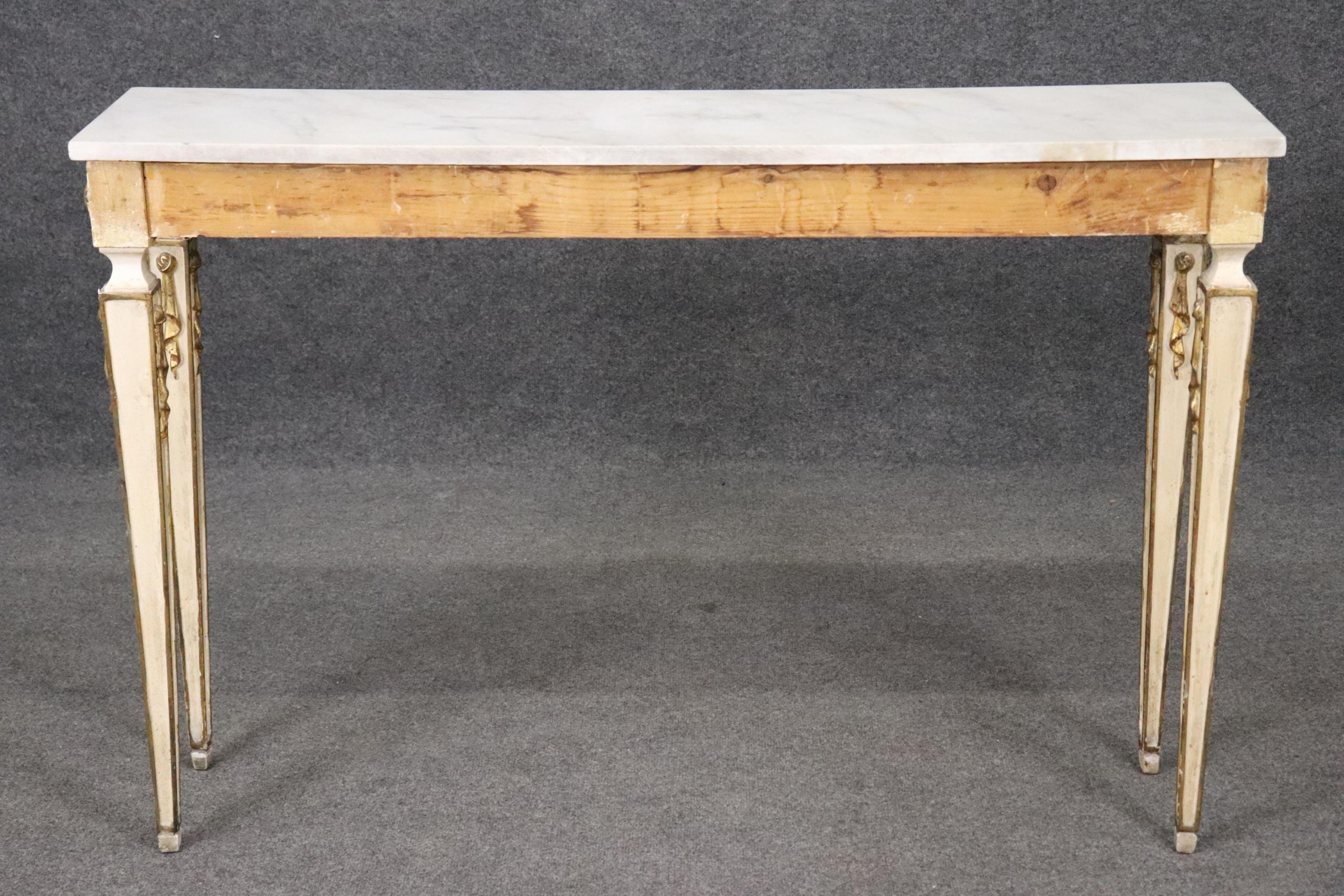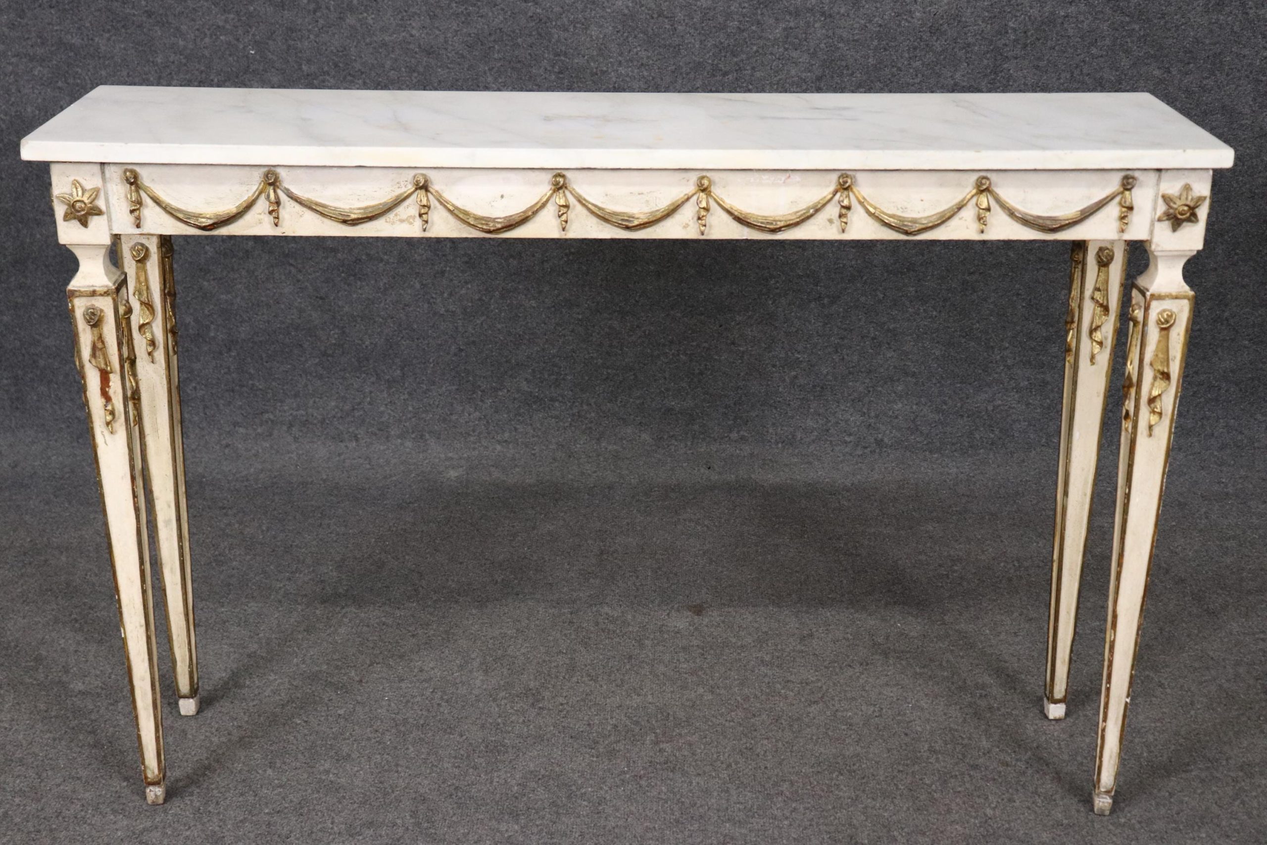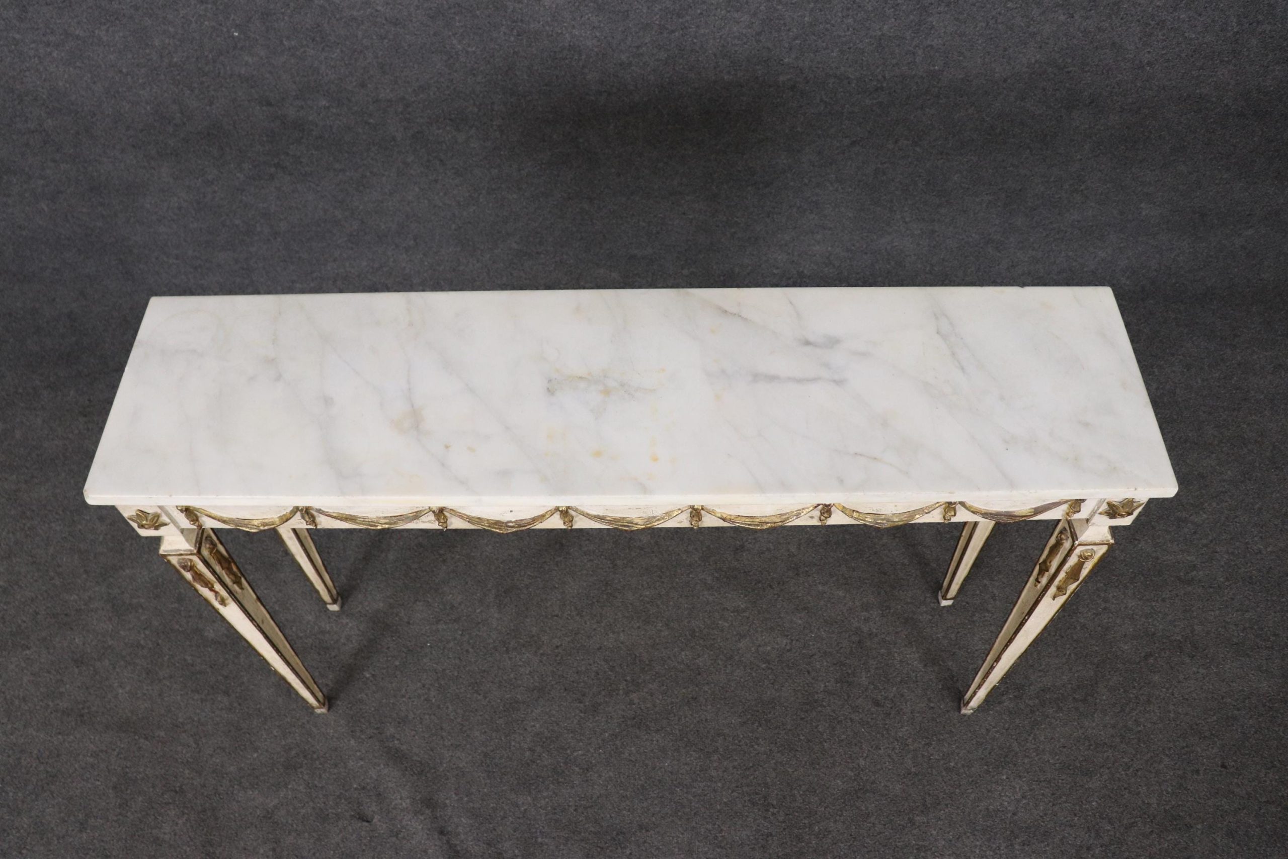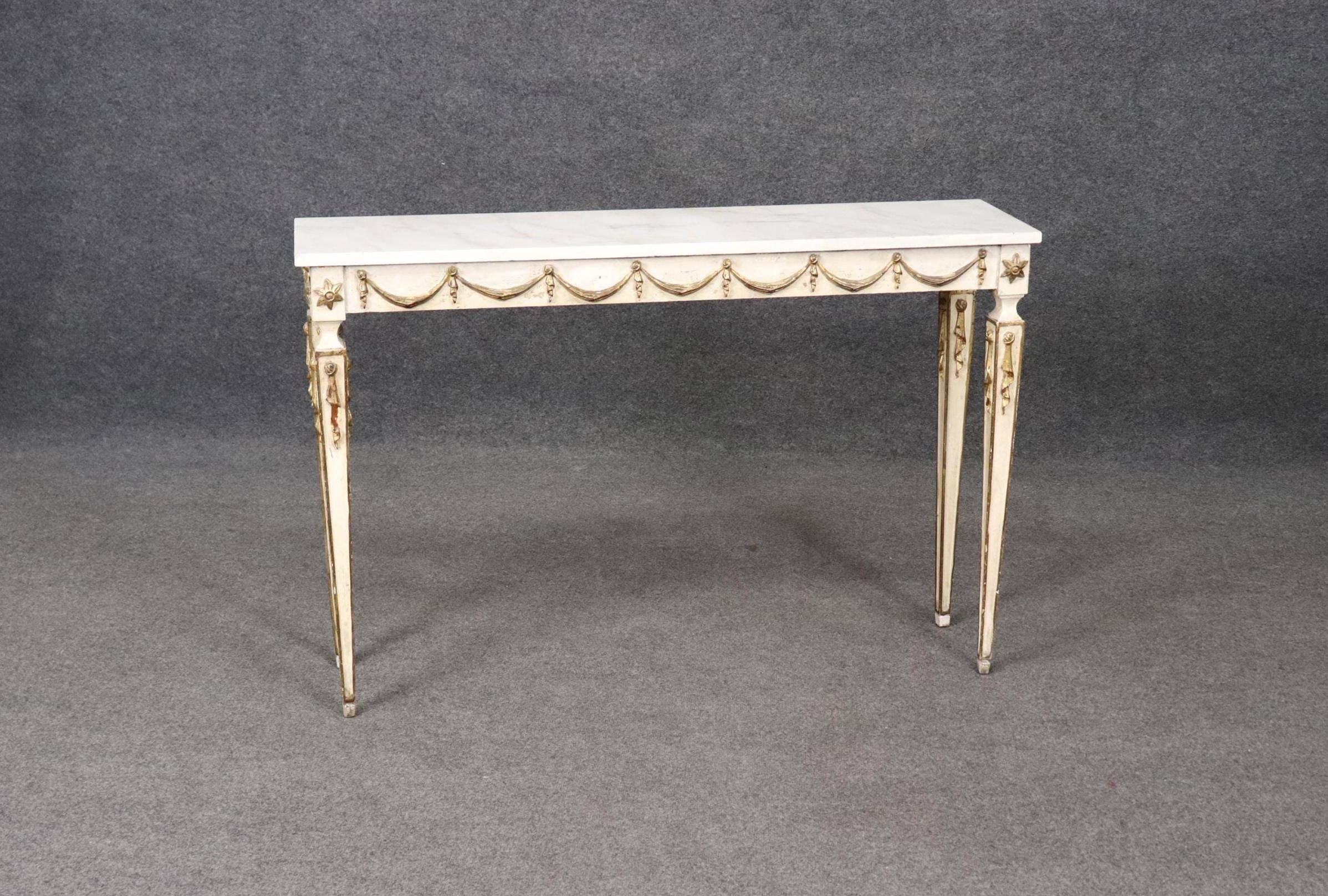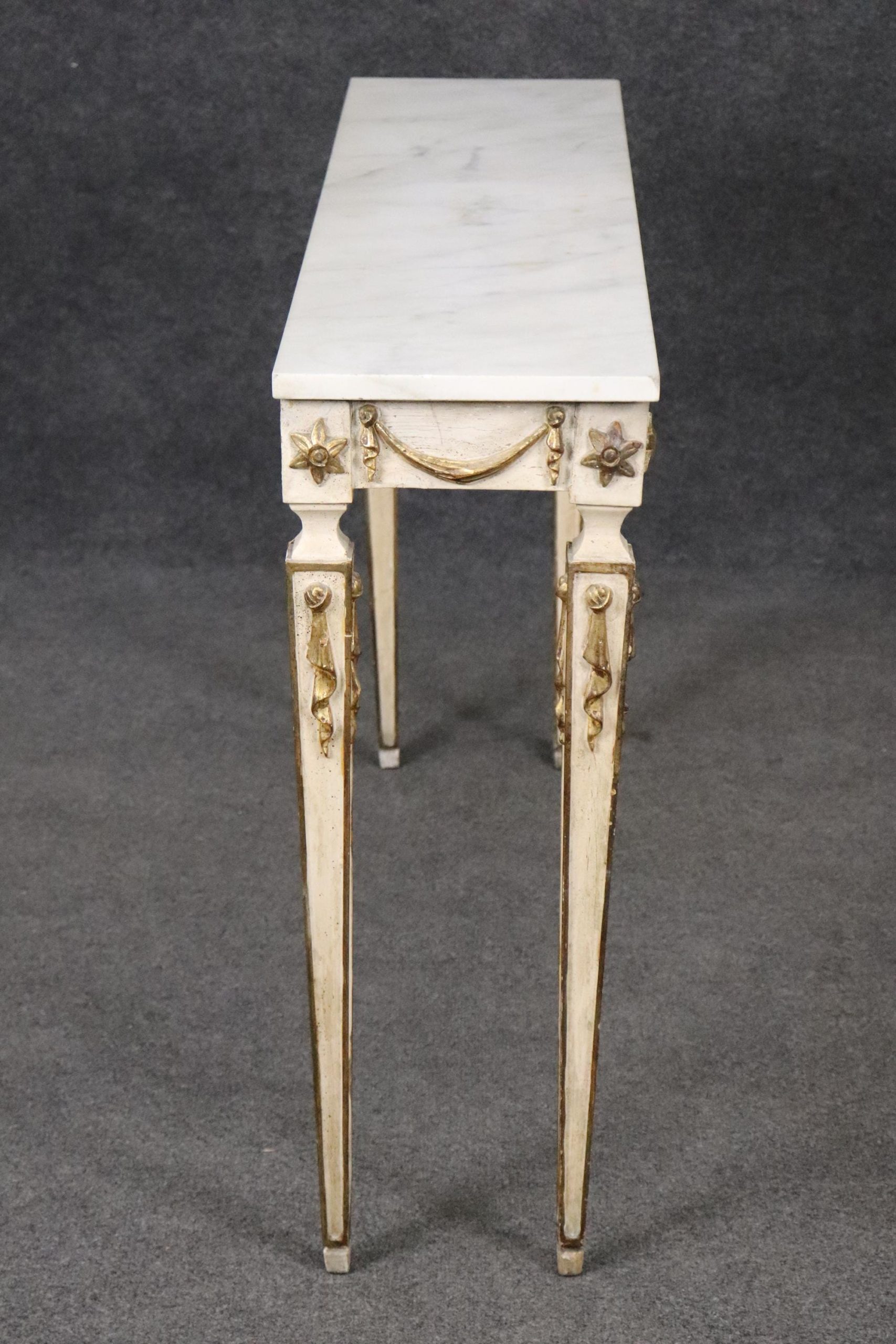 This vintage Italian creme and gilt paint decorated narrow marble top console table sofa table is made of the highest quality! If you look closely at the photos provided, you will see the attention to detail in the gilt decoration. This console is perfect for your living room, entryway, bedroom, dining room or office! This piece can also be paired with a variety of other styles due to its simplistic yet luxurious design! This sofa table is bound to bring a lovely sense of sophistication and luxury into your home and will certainly be a conversation starter at your next gathering. Antique furniture and vintage pieces have stood the test of time and this console is no exception! With its quality materials and great craftsmanship this is bound to last you and your family for many years to come. The piece is in good vintage condition with minor surface scratches and some finish loss as to be expected from an item of age and use.