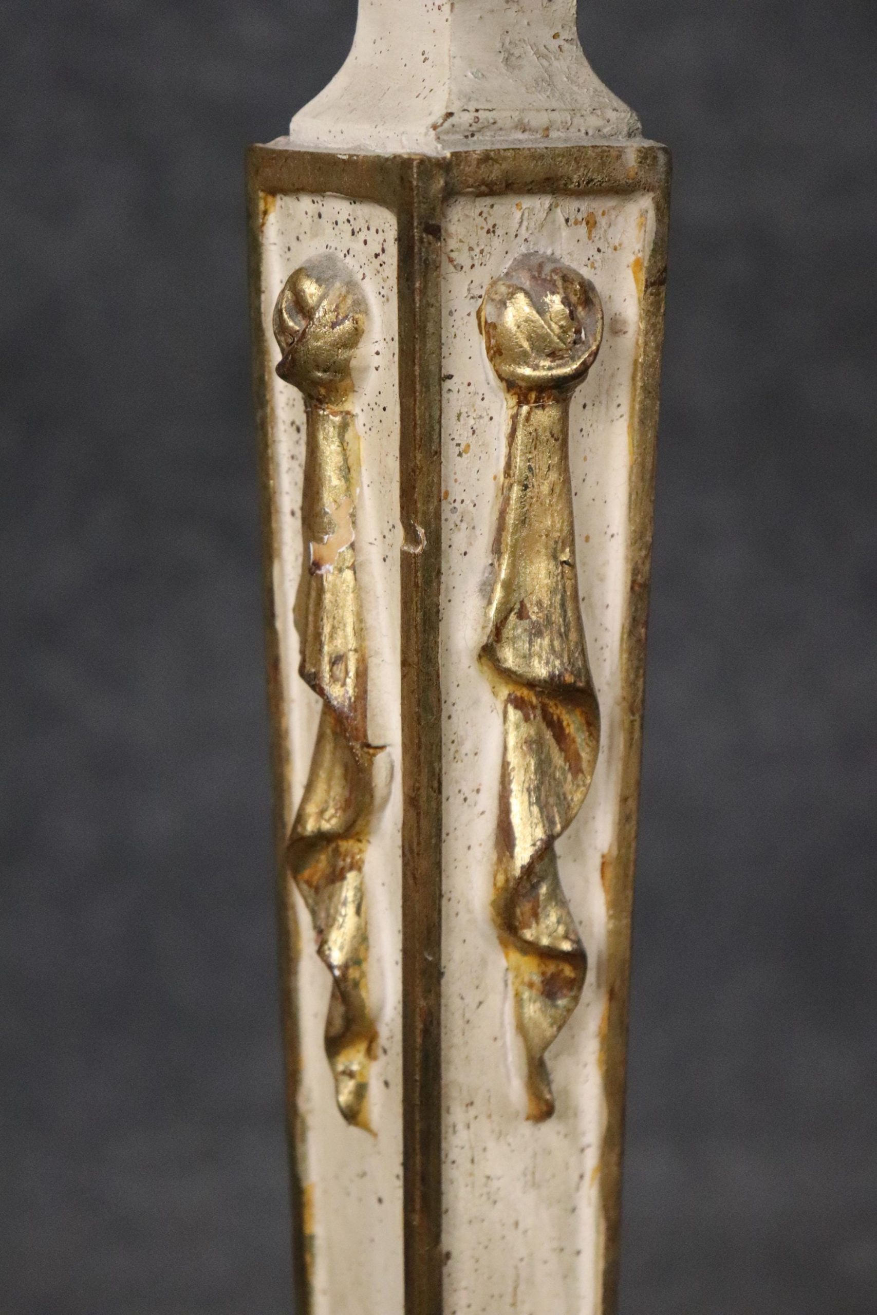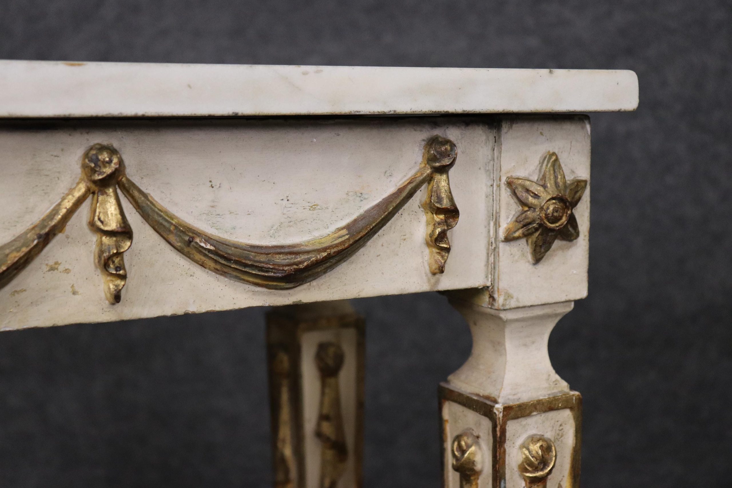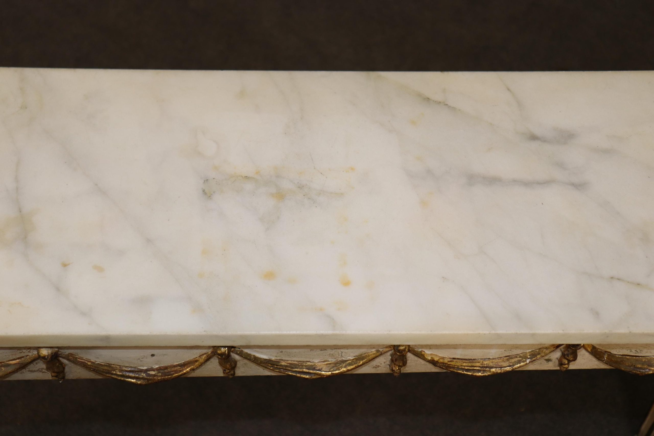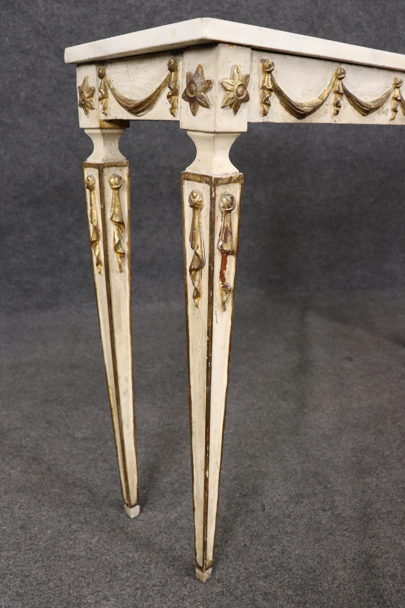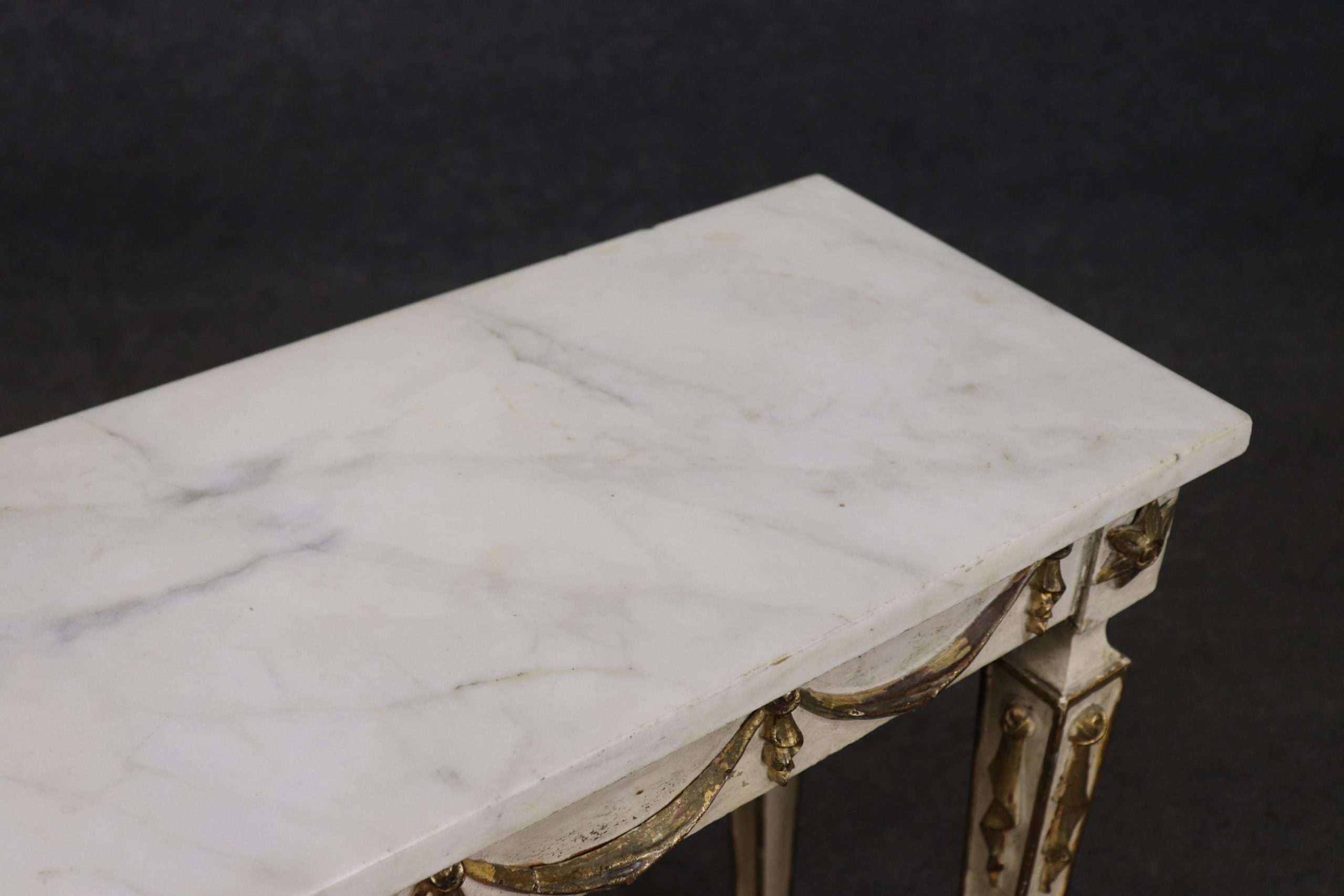 This vintage Italian creme and gilt paint decorated narrow marble top console table sofa table is made of the highest quality! If you look closely at the photos provided, you will see the attention to detail in the gilt decoration. This console is perfect for your living room, entryway, bedroom, dining room or office! This piece can also be paired with a variety of other styles due to its simplistic yet luxurious design! This sofa table is bound to bring a lovely sense of sophistication and luxury into your home and will certainly be a conversation starter at your next gathering. Antique furniture and vintage pieces have stood the test of time and this console is no exception! With its quality materials and great craftsmanship this is bound to last you and your family for many years to come. The piece is in good vintage condition with minor surface scratches and some finish loss as to be expected from an item of age and use.