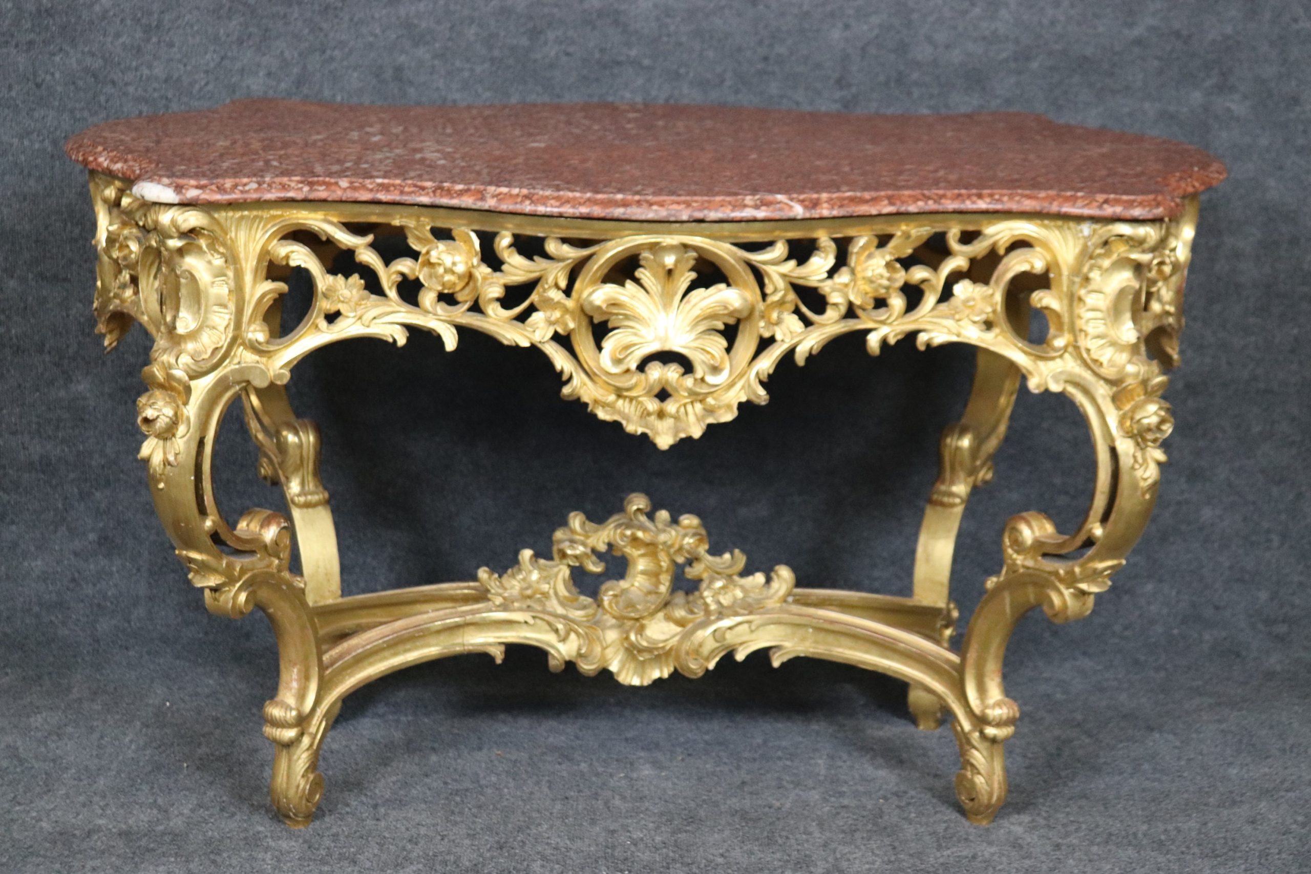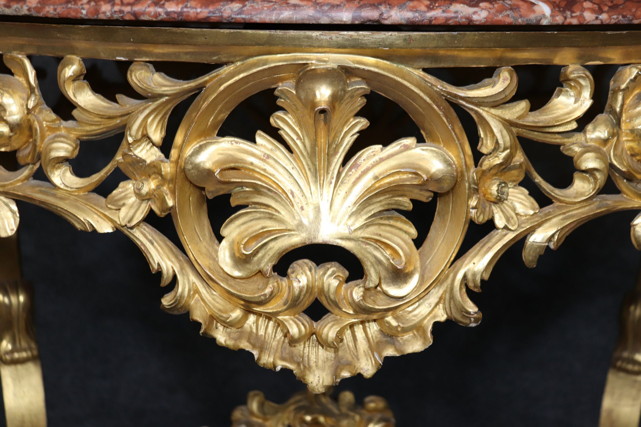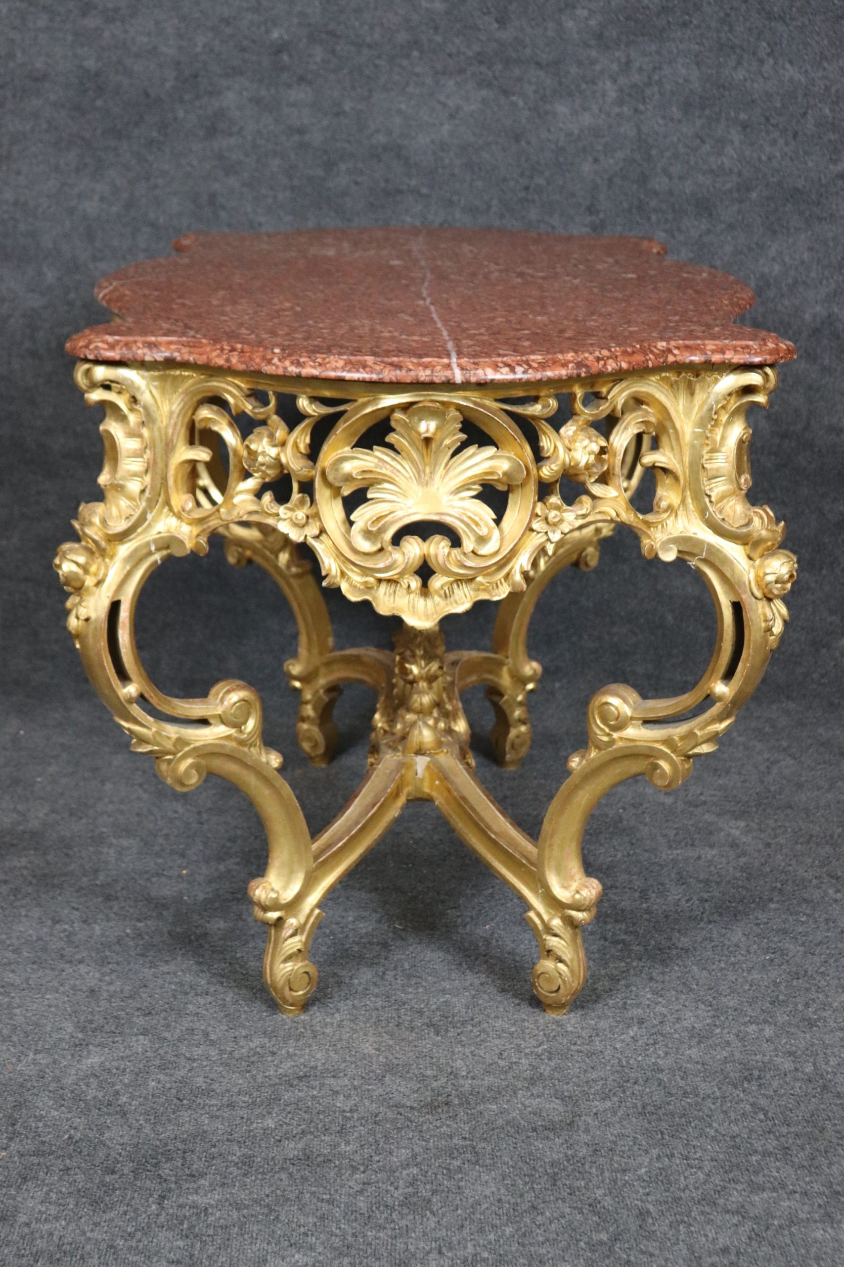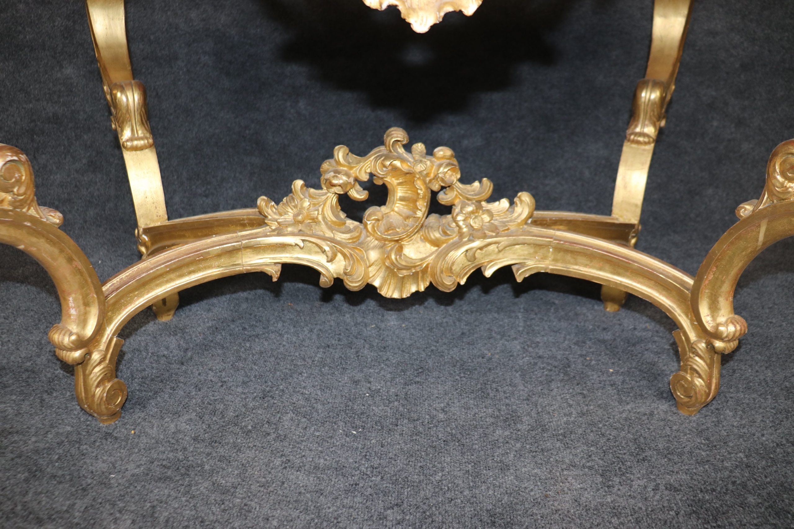 This carved Italian Rococo center table is truly incredible and is made of the highest quality! If you look at the photos provided, you will see the beautiful marble on the carved gold gilt frame. This piece screams elegance and luxury and detail was the only thing on the makers mind! The center table is a piece that will without a doubt be a conversation starter and will have your guests wondering how you acquired such a beautiful item! This piece is perfect for any kitchen, dining room, office, or entryway and can be paired with a variety of other styles! This is not a table you want this is the kind of table that you need. The table is in good vintage condition with minor surface scratches to the marble and base as well as some very minor finish loss as to be expected with an item with this age.