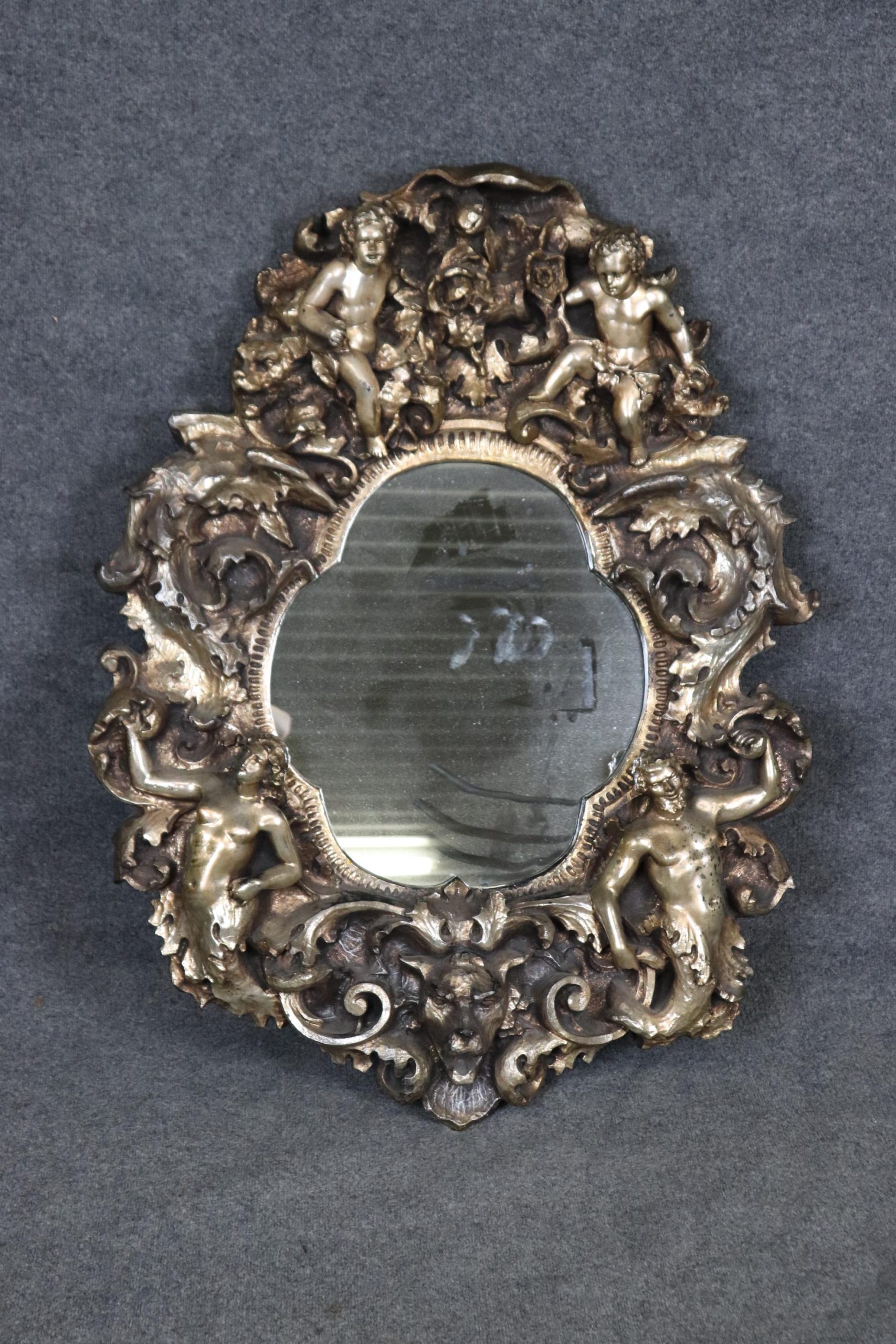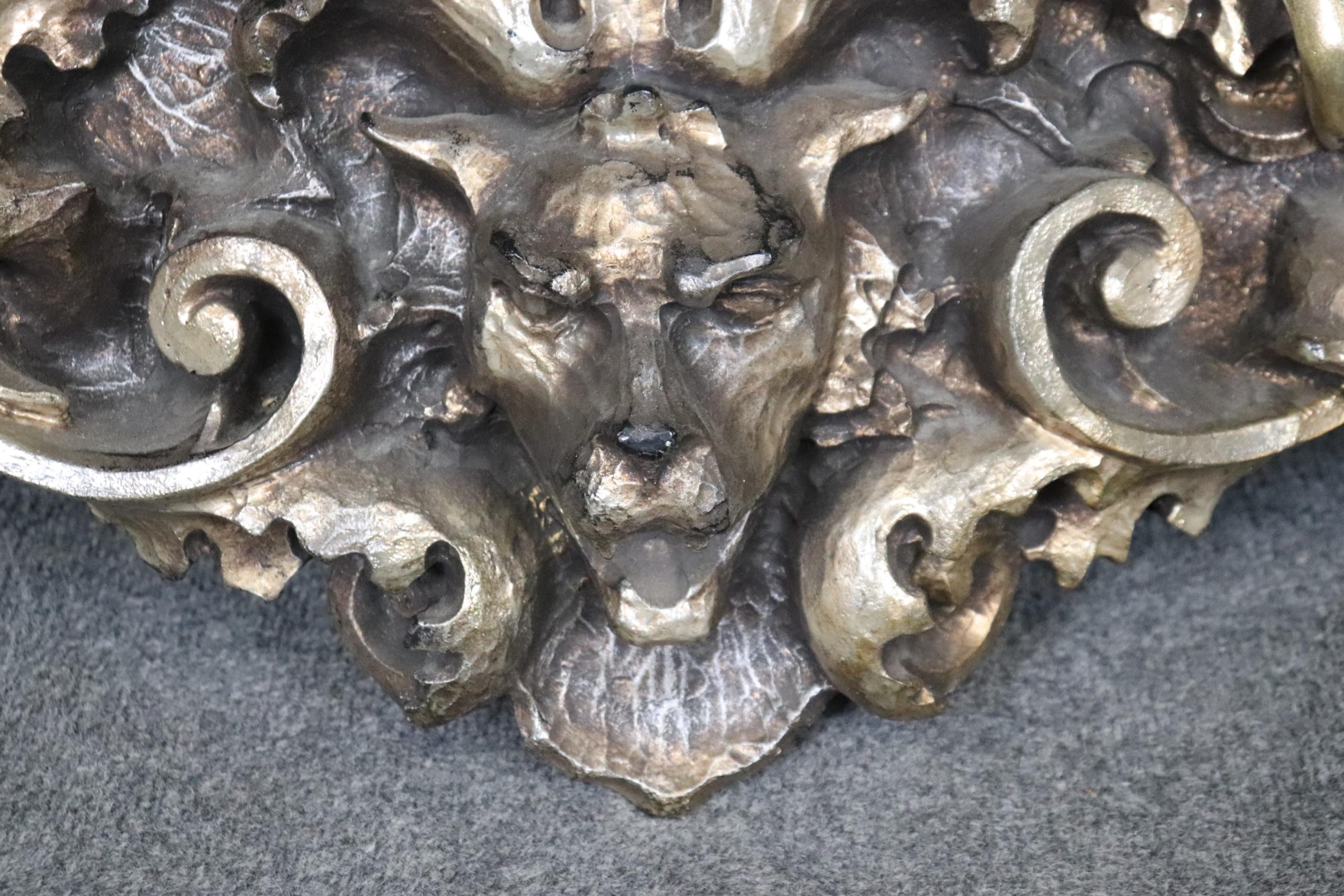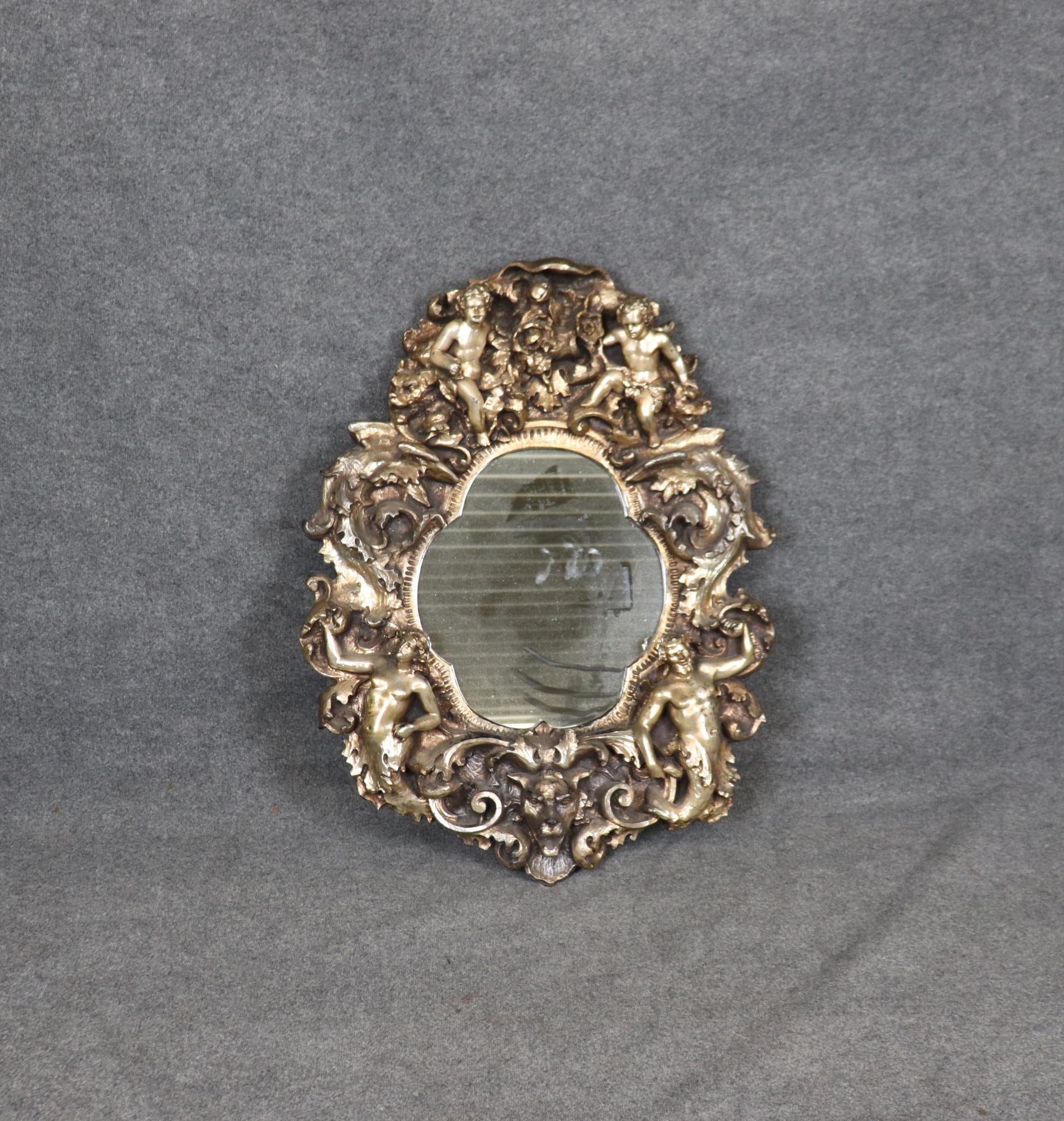 This vintage Italian Rococo style silver gilt carved figural accent wall hanging mirror is truly a luxurious piece that will bring a sense of luxury and character into your home or place of choosing! If you look at the photos provided, you will see the beautifully carved silver gilt frame. This mirror is perfect for any living room, entryway, bathroom, or bedroom and can be paired with a variety of other styles you may already have in your home! The mirror is in good vintage condition with light surface scratches and minor chips. The mirror is in great condition considering age and has no significant imperfections to note.