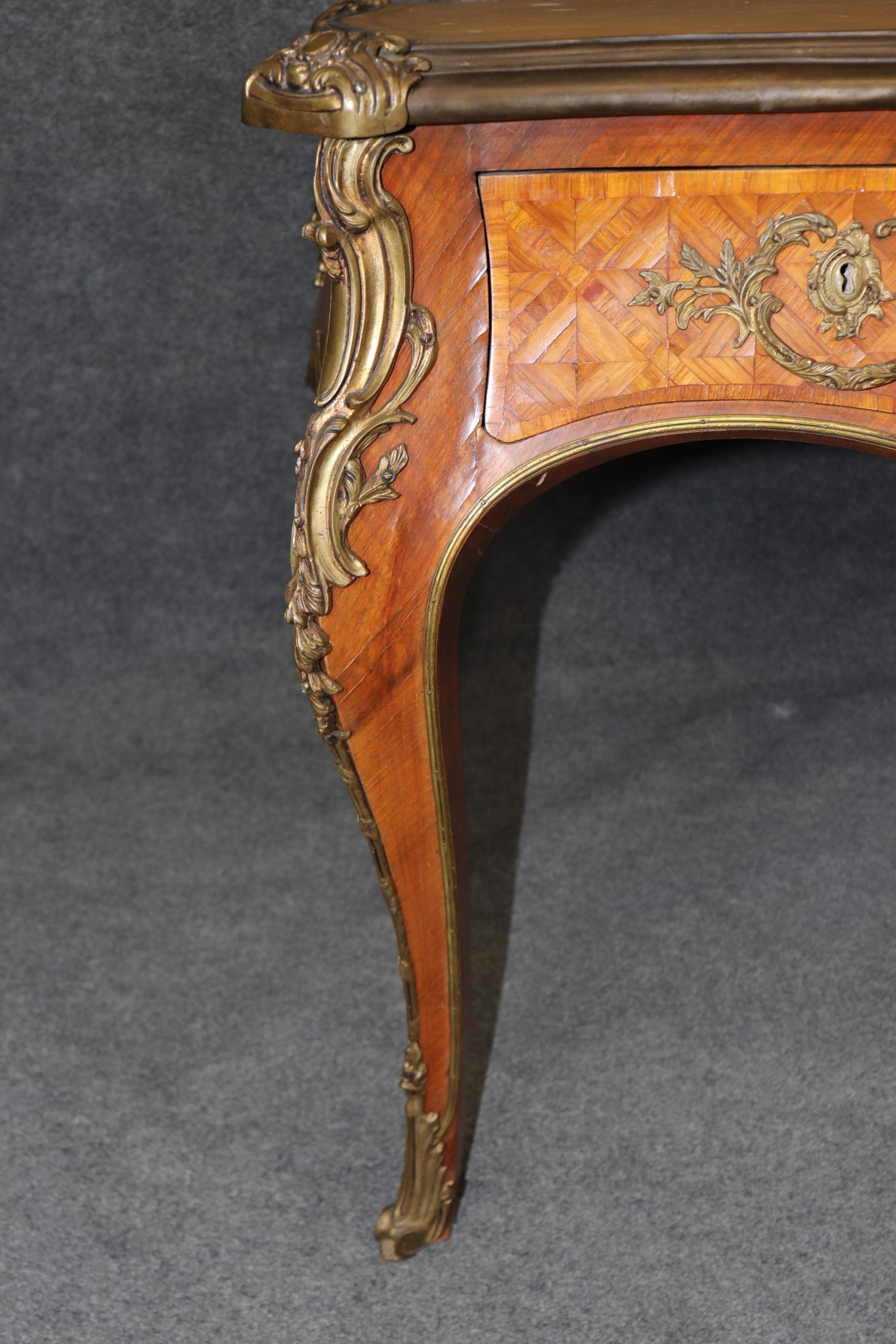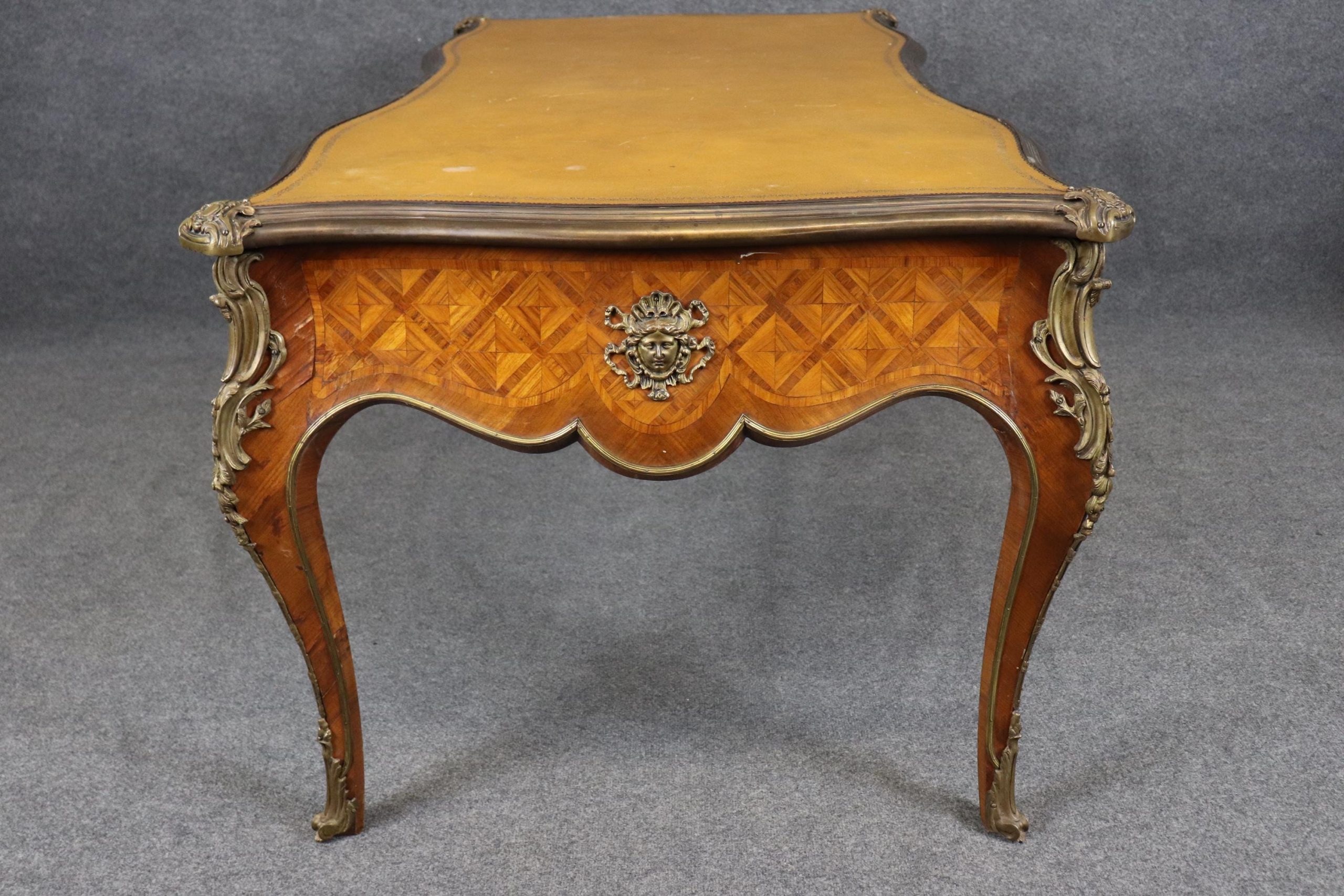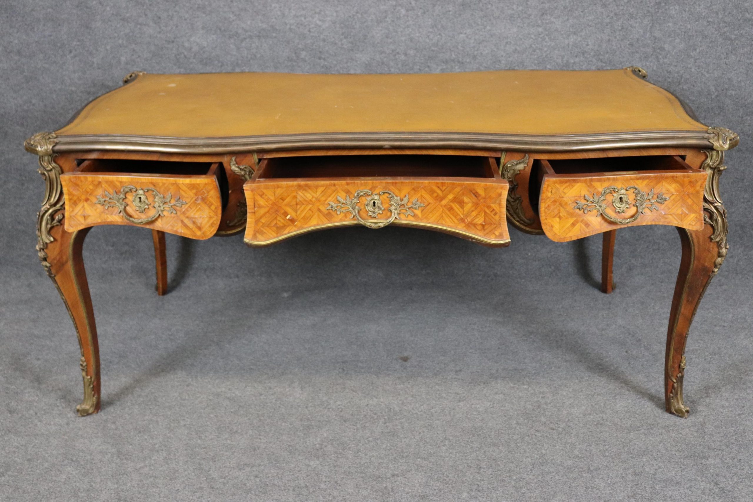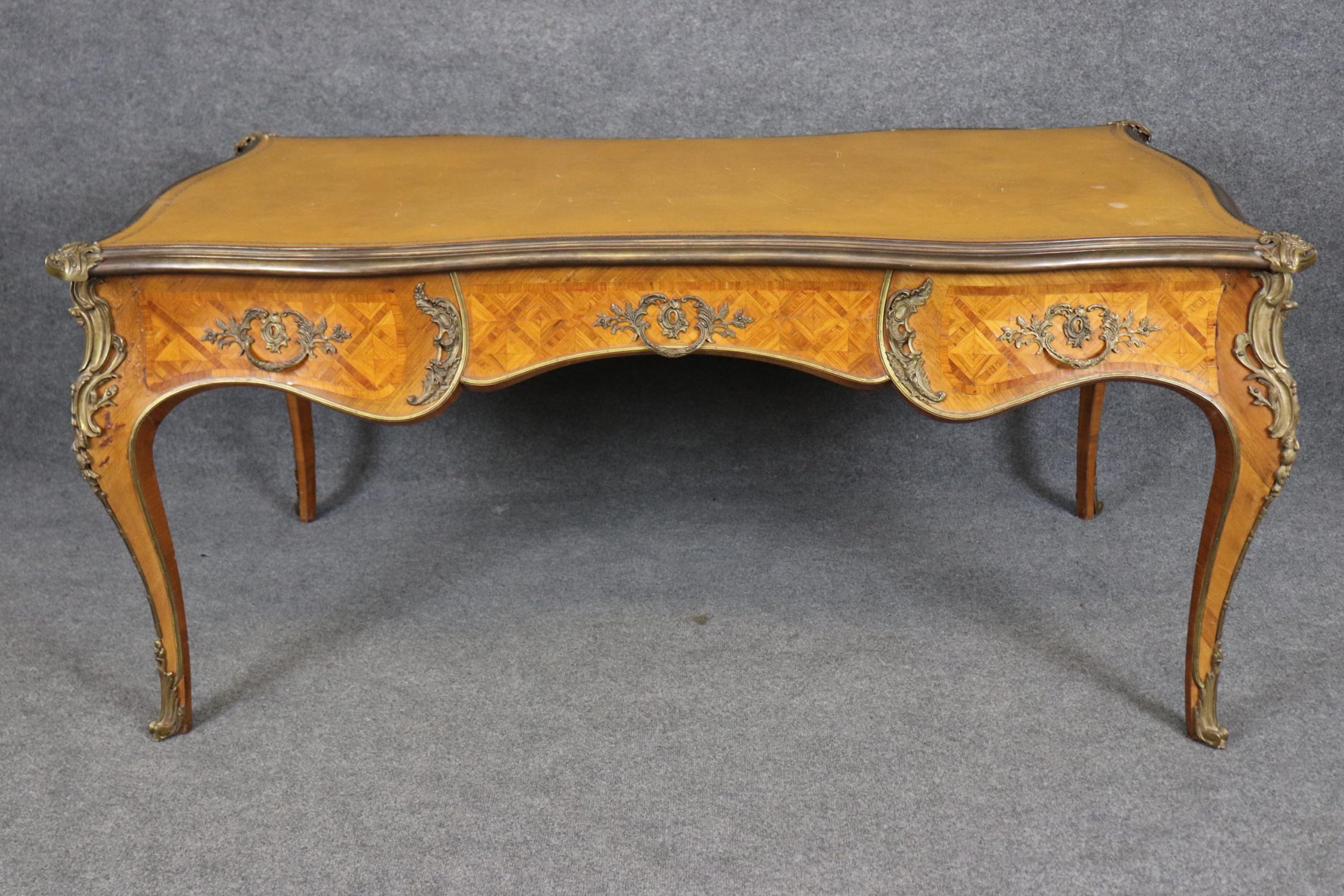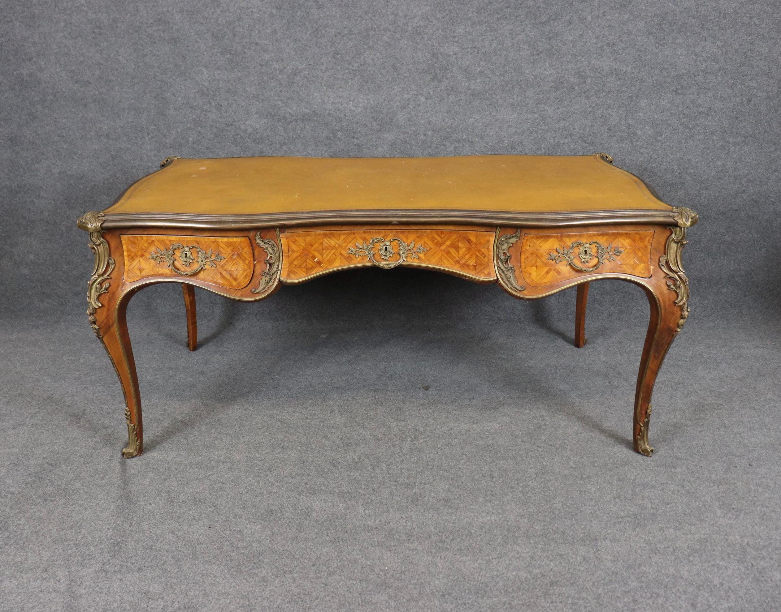 Vintage Louis XV Style Bureau Plat Desk: Camel Leather Top Inlaid Executive Desk