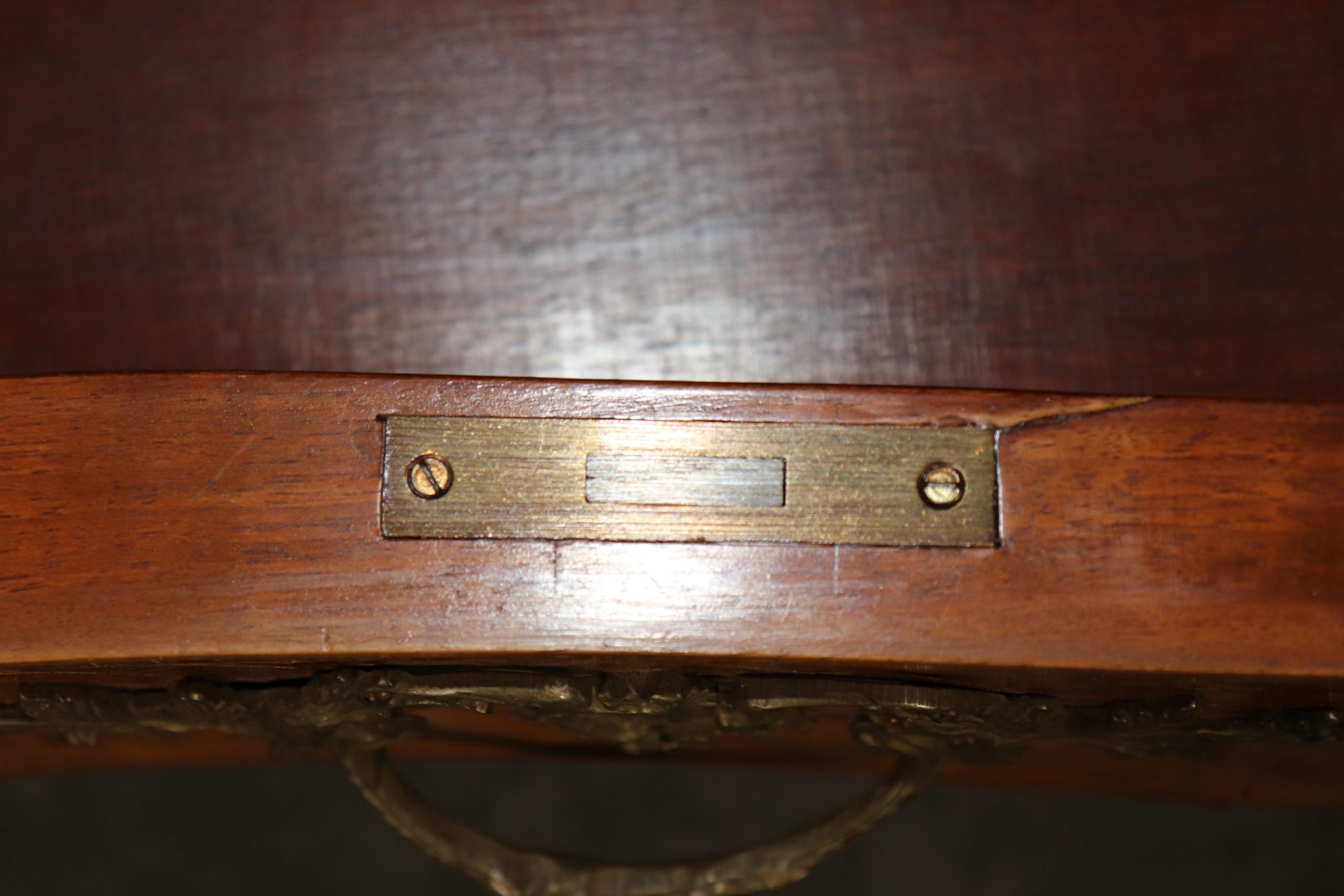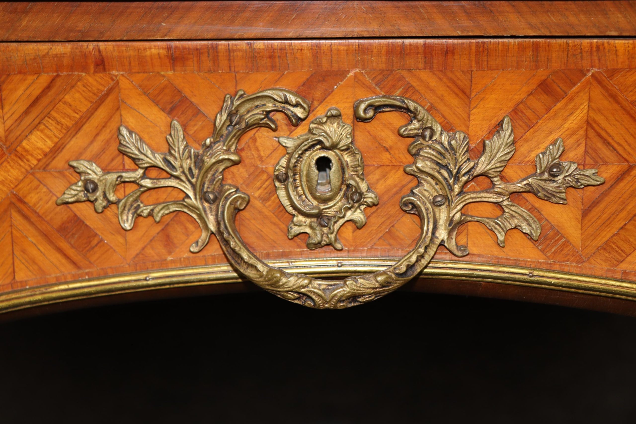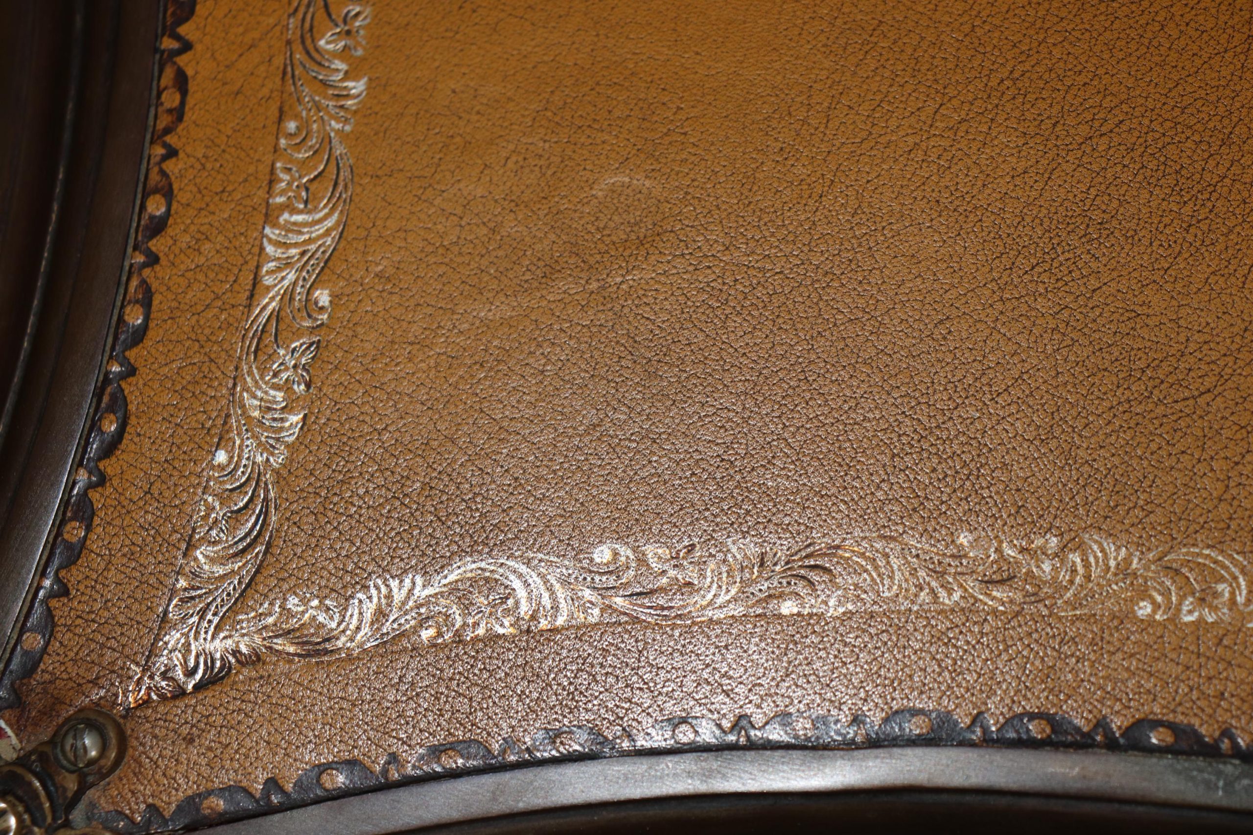 This vintage Louis XV style camel colored leather top inlaid bureau plat is made of the highest quality and is truly remarkable! This exceptional table will most definitely be a conversation starter! This table can be paired with just about any style you may already have in your home or place of choosing! This piece gives off an overwhelming sense of character and luxury and tells its own story as people catch themselves staring at it! Antique furniture and vintage pieces have stood the test of time and this bureau plat is no exception! With its quality materials and great craftsmanship this is bound to last you and your family for many years to come. One really rare feature to this piece is the fact that the original top is in such good condition with only minor wear to the leather. The table is in good vintage condition with minor surface scratches as well as some minor finish loss and some tarnishing to the brass accents, as to be expected with an item of this age! Otherwise good condition.