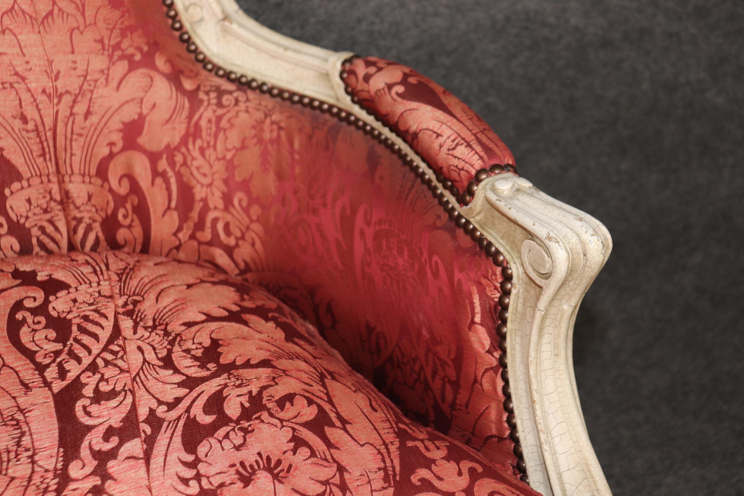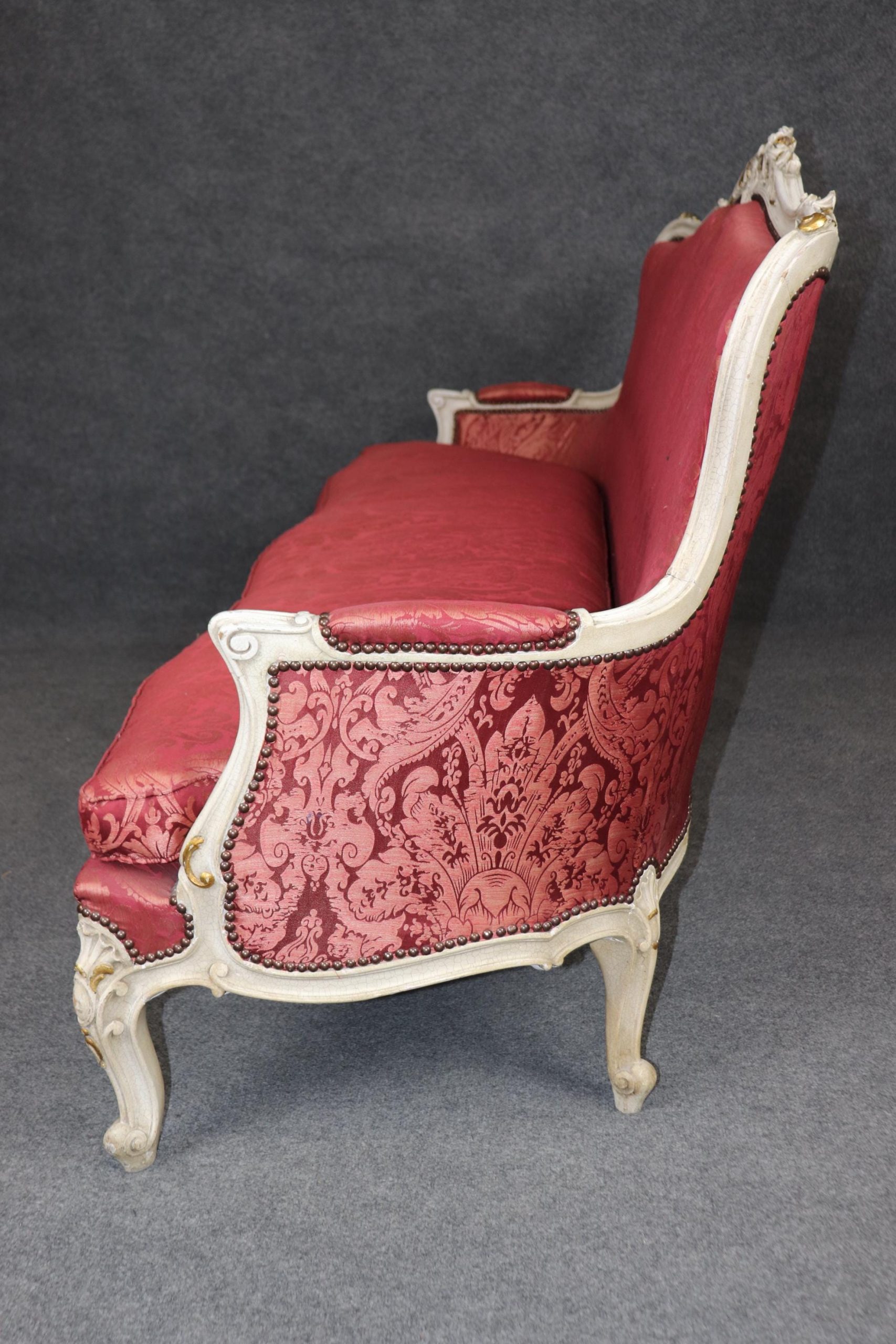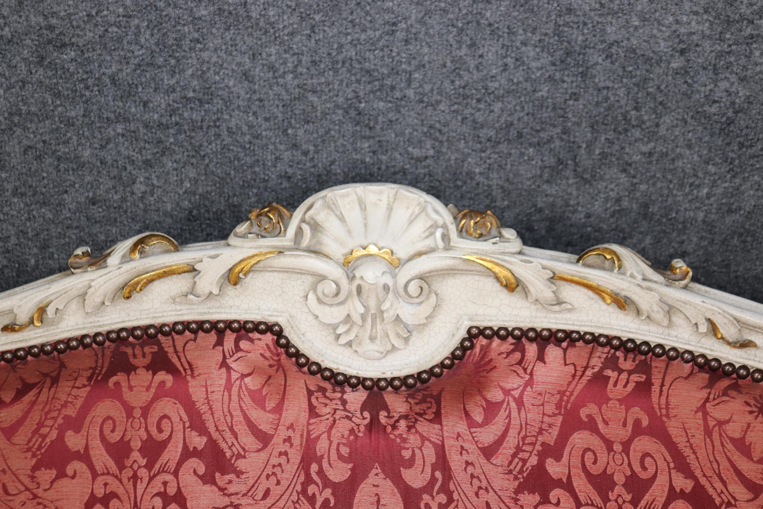 This vintage Louis XV style paint decorated settee loveseat is made of the highest quality! This piece is perfect for any living room, den, foyer, entryway or office and gives off a sense of class and sophistication like you wouldn’t believe! If you look at the photos provided, you can see the luxurious red upholstery adorned with nail head trim. This piece can also be paired with a variety of other styles you may already have in your home due to its simple yet luxurious design and color way. Antique furniture and vintage pieces have stood the test of time and this settee is no exception. With its quality materials and great craftsmanship this is bound to last you and your family for many years to come. This piece is in good vintage condition with some light surface scratches and minor chips as to be expected with an item from the 1940’s!