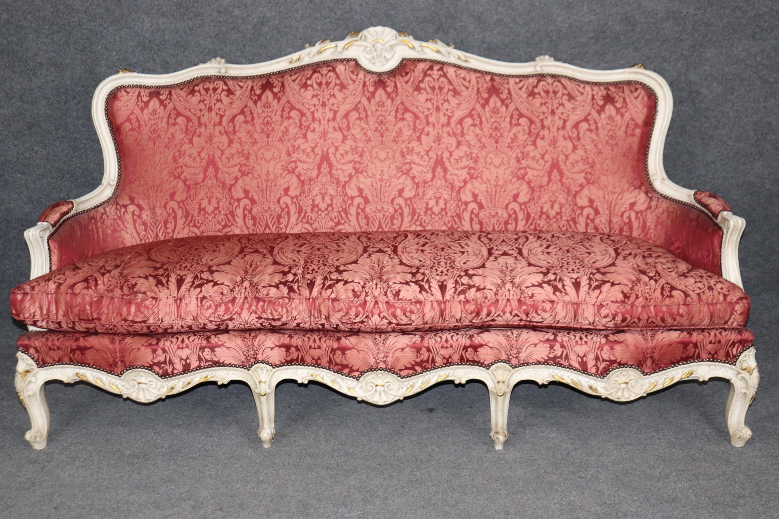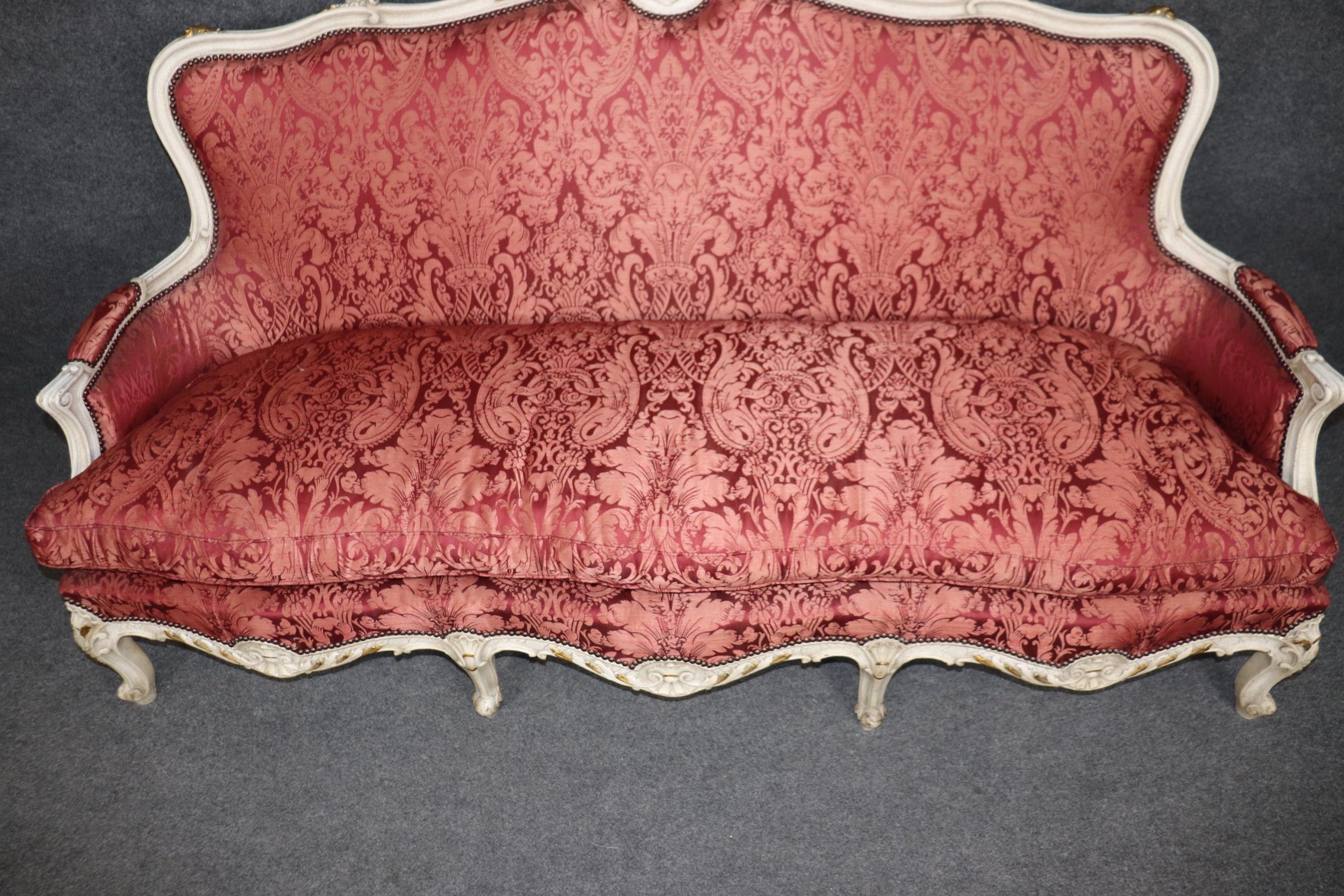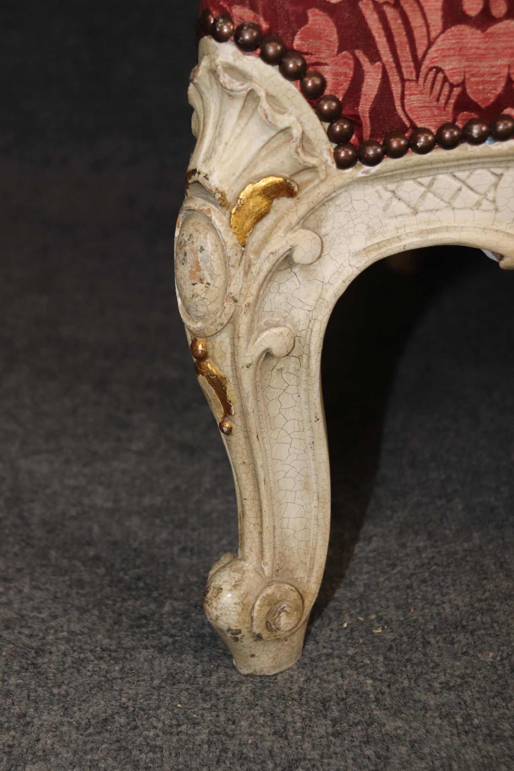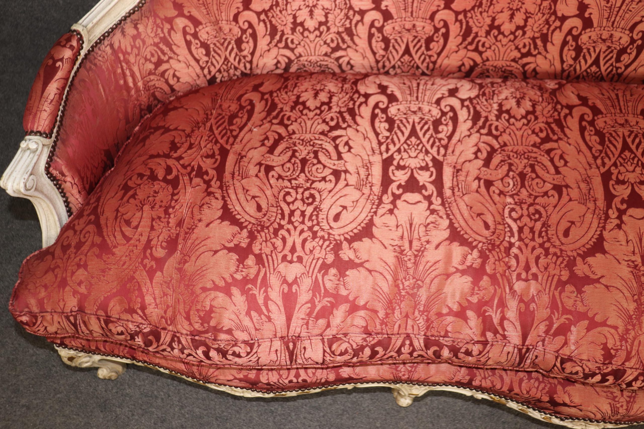 This vintage Louis XV style paint decorated settee loveseat is made of the highest quality! This piece is perfect for any living room, den, foyer, entryway or office and gives off a sense of class and sophistication like you wouldn’t believe! If you look at the photos provided, you can see the luxurious red upholstery adorned with nail head trim. This piece can also be paired with a variety of other styles you may already have in your home due to its simple yet luxurious design and color way. Antique furniture and vintage pieces have stood the test of time and this settee is no exception. With its quality materials and great craftsmanship this is bound to last you and your family for many years to come. This piece is in good vintage condition with some light surface scratches and minor chips as to be expected with an item from the 1940’s!