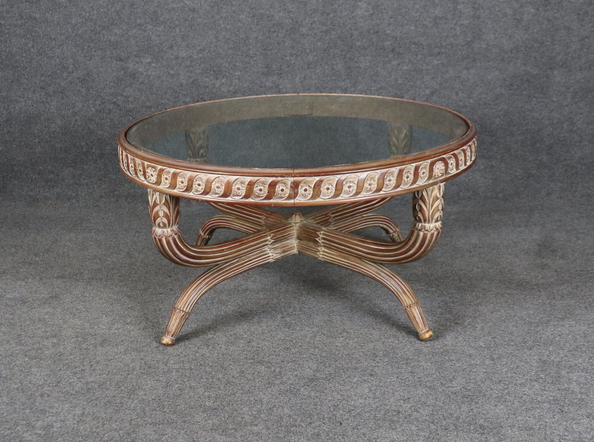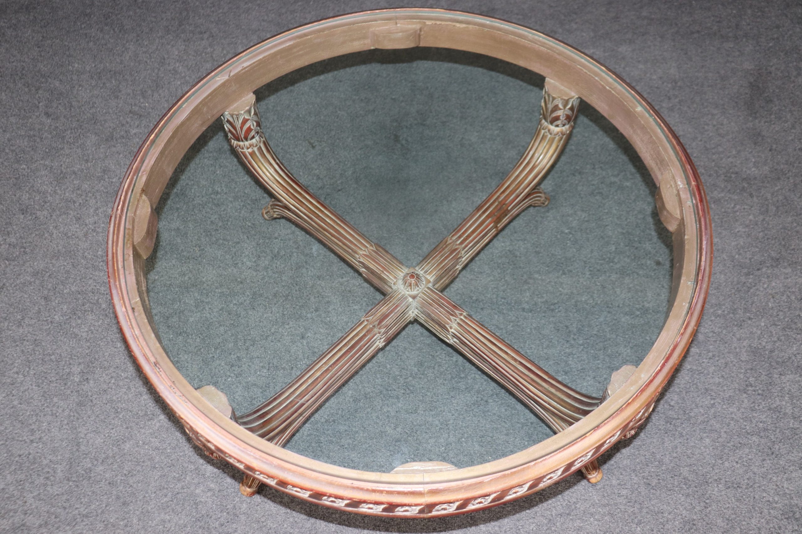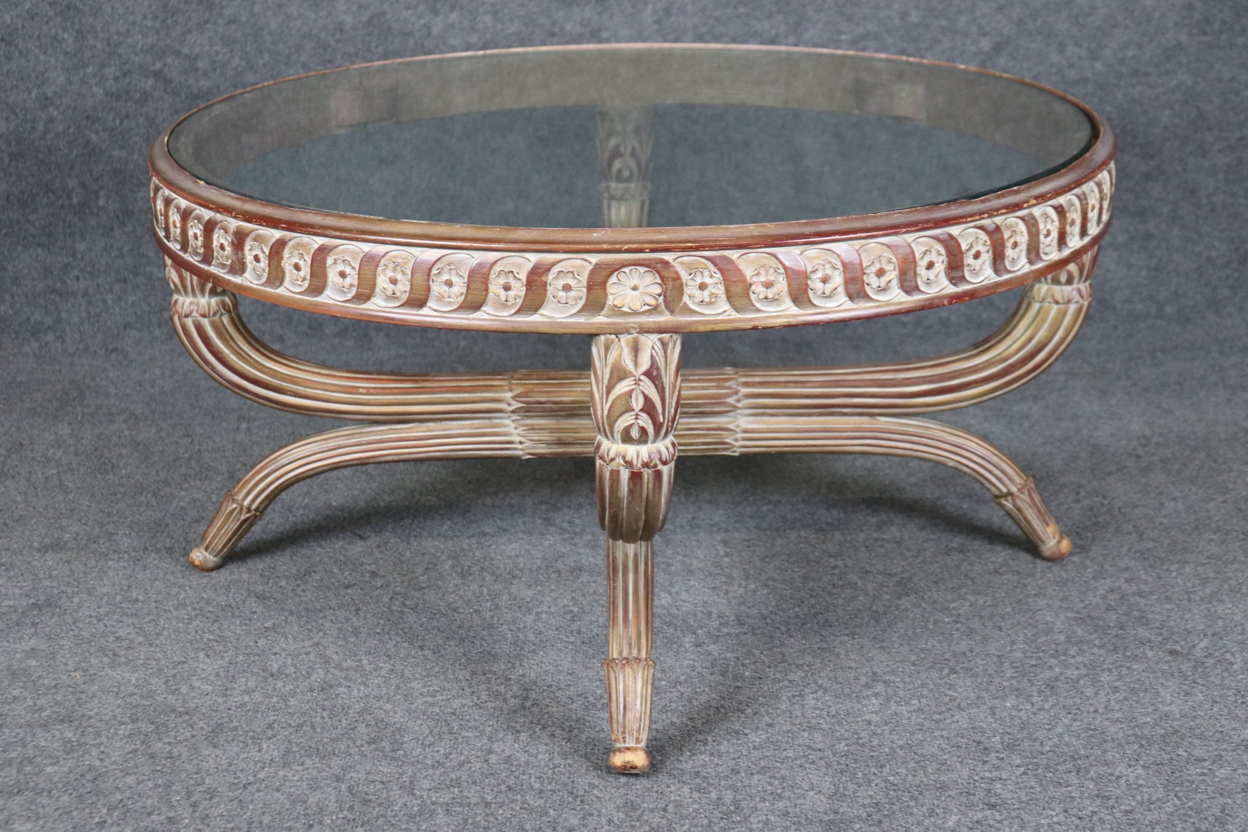 This vintage Directoire style paint decorated glass top coffee table is unique and bound to bring a sense of sophistication and character into your home or place of choosing! This piece is made of the highest quality! This item is perfect for any living room, office or bedroom and can be paired with a variety of other styles you may already have in your home due to its simplistic yet luxurious design! This is a piece that will have your guests mesmerized by its detail and will certainly be a conversation starter at your next gathering! The piece overall is in good vintage condition with some oxidation to the metal and scratches to the glass, otherwise good condition.