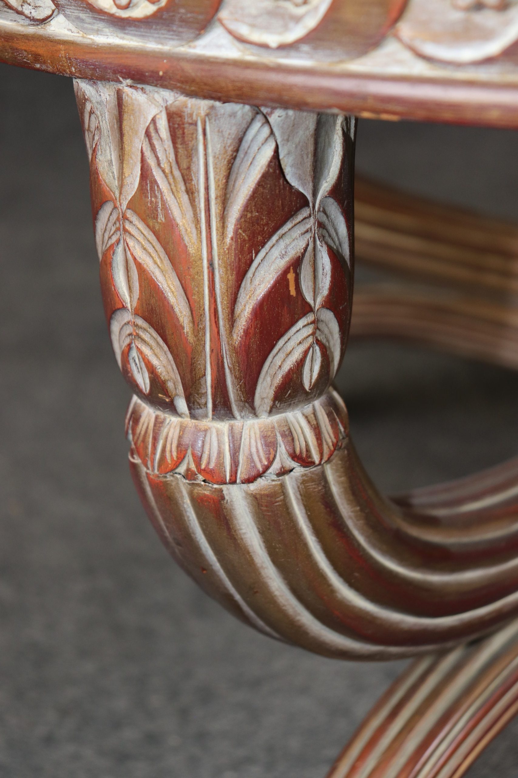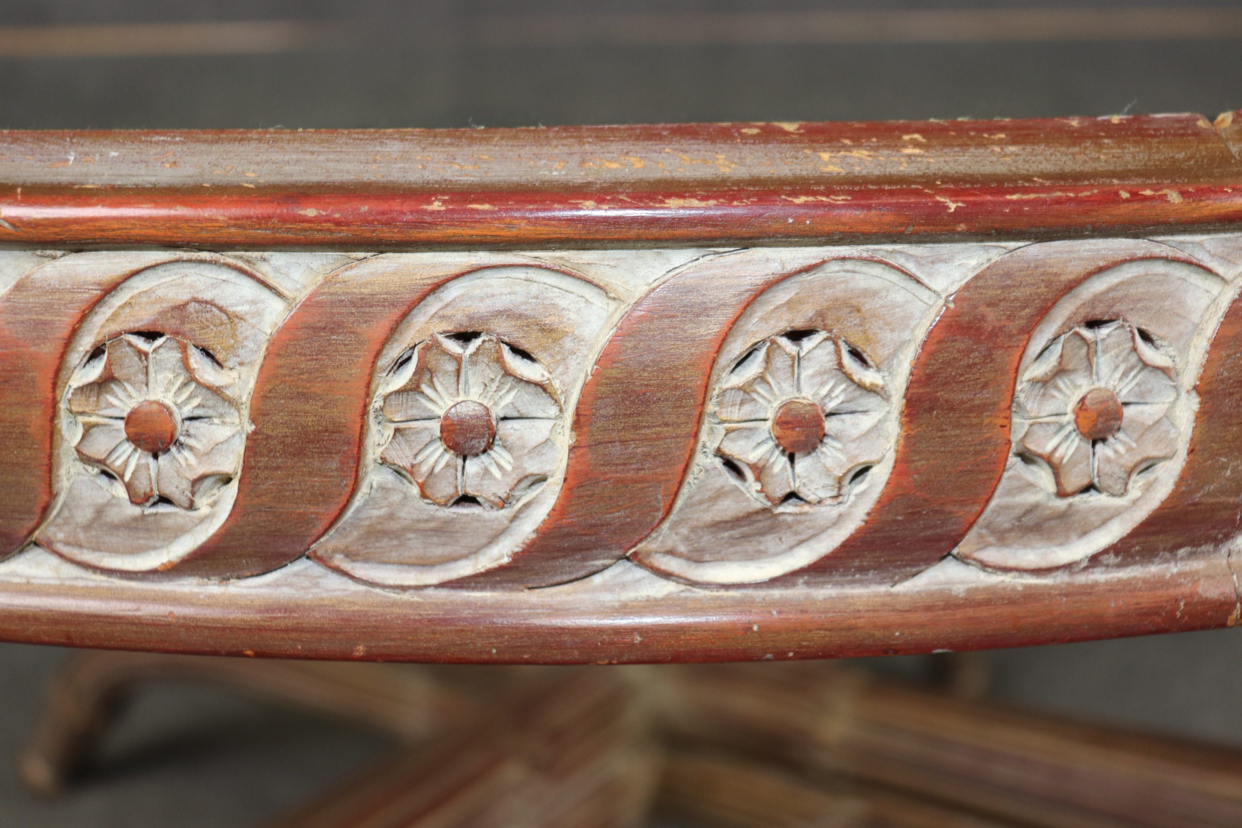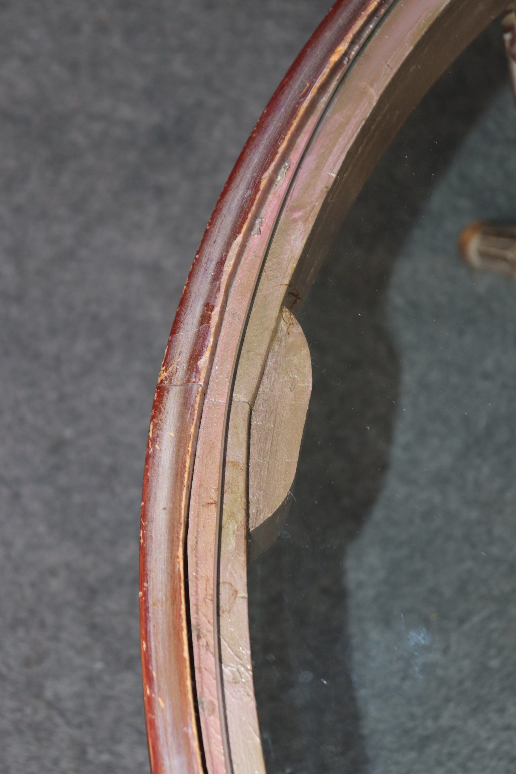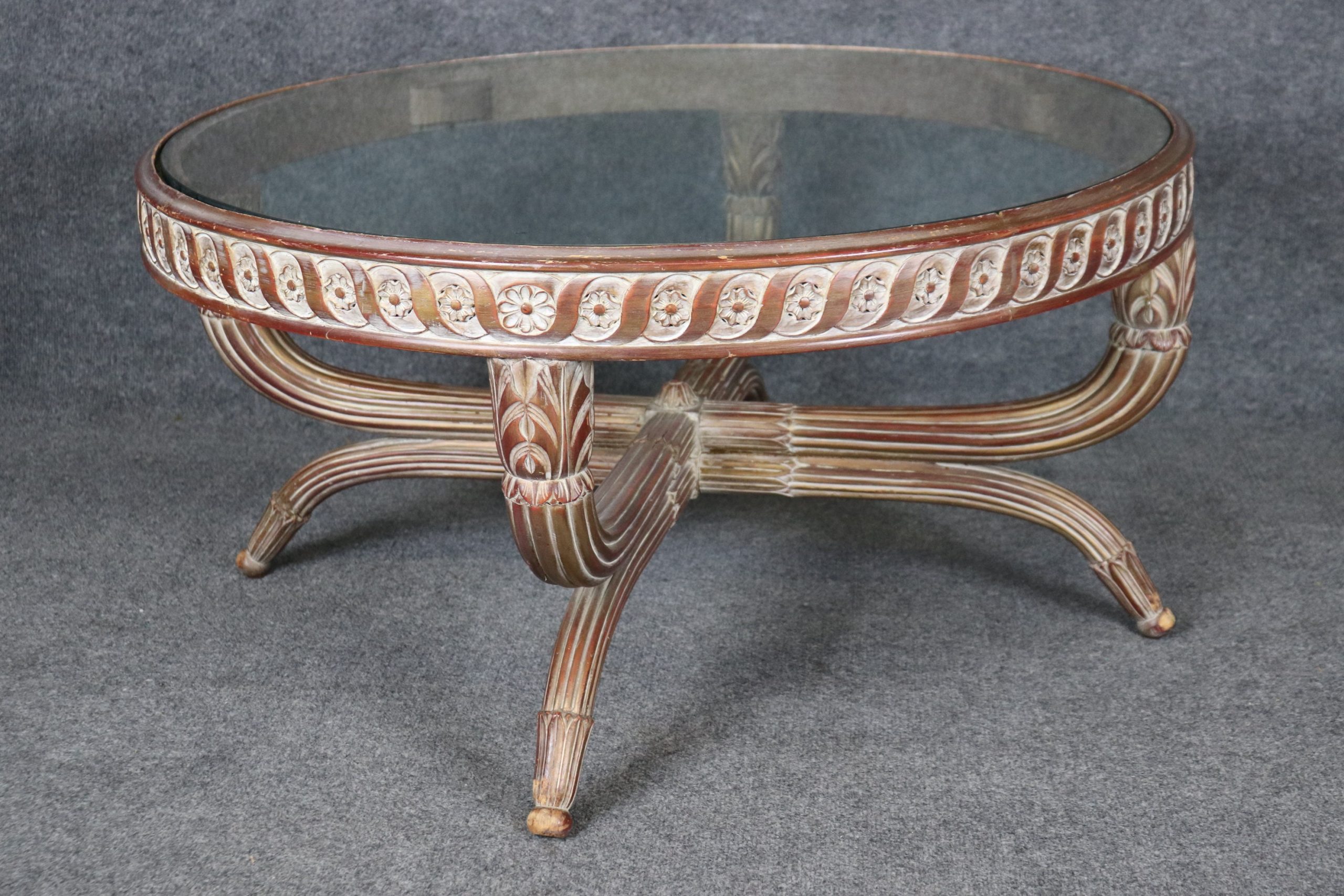 This vintage Directoire style paint decorated glass top coffee table is unique and bound to bring a sense of sophistication and character into your home or place of choosing! This piece is made of the highest quality! This item is perfect for any living room, office or bedroom and can be paired with a variety of other styles you may already have in your home due to its simplistic yet luxurious design! This is a piece that will have your guests mesmerized by its detail and will certainly be a conversation starter at your next gathering! The piece overall is in good vintage condition with some oxidation to the metal and scratches to the glass, otherwise good condition.