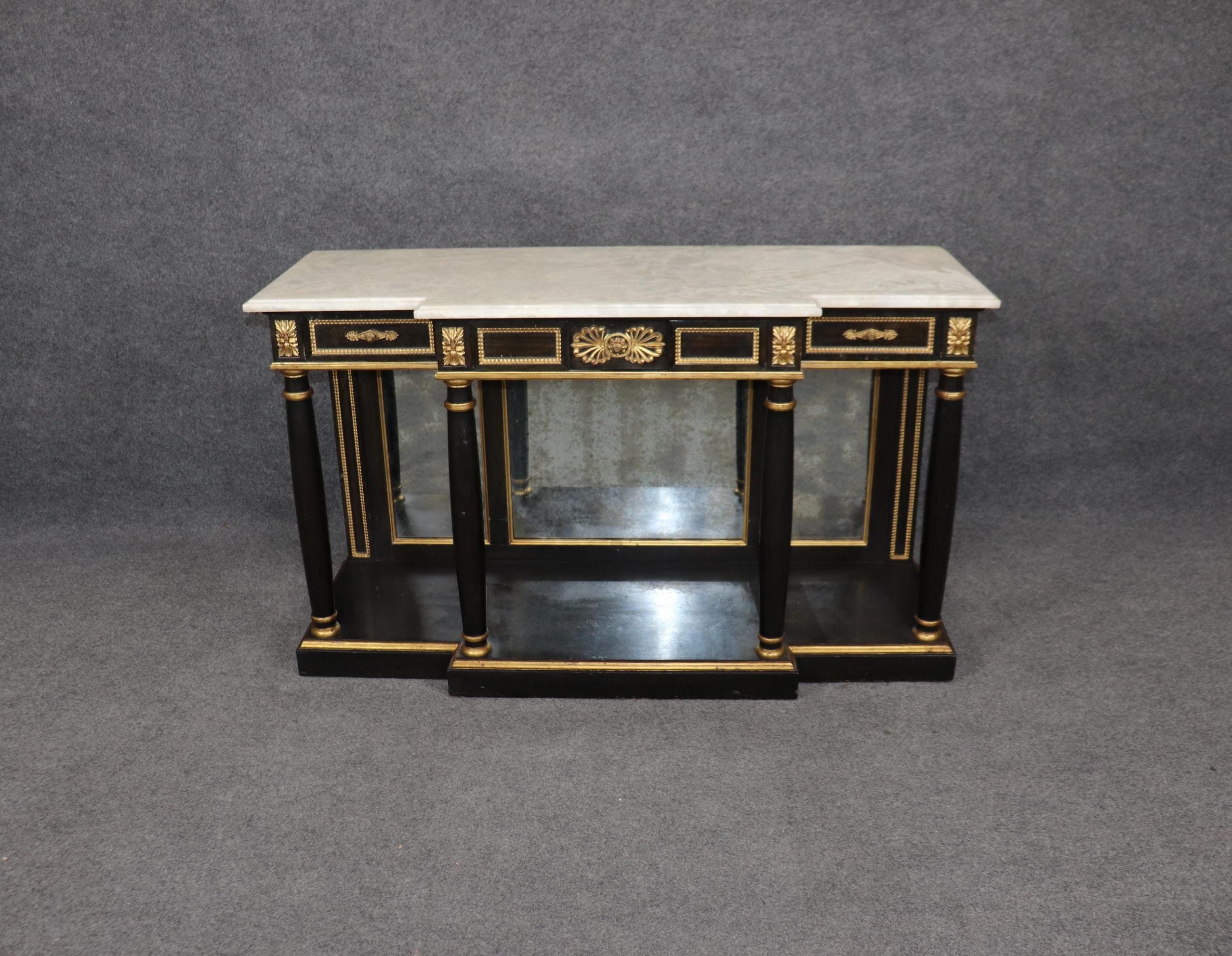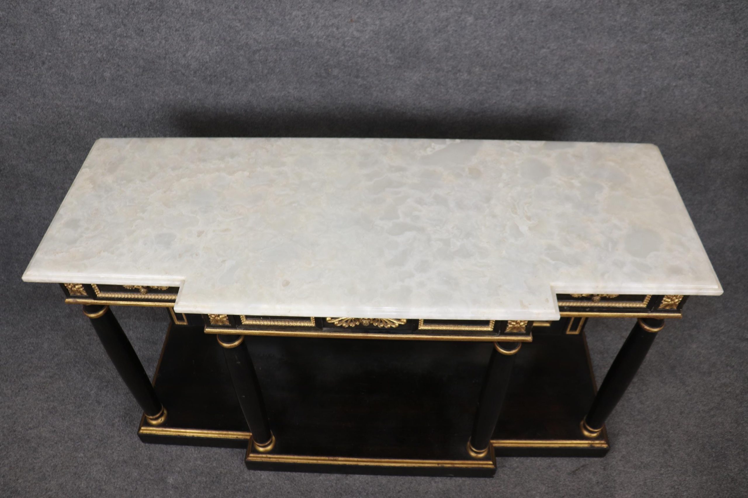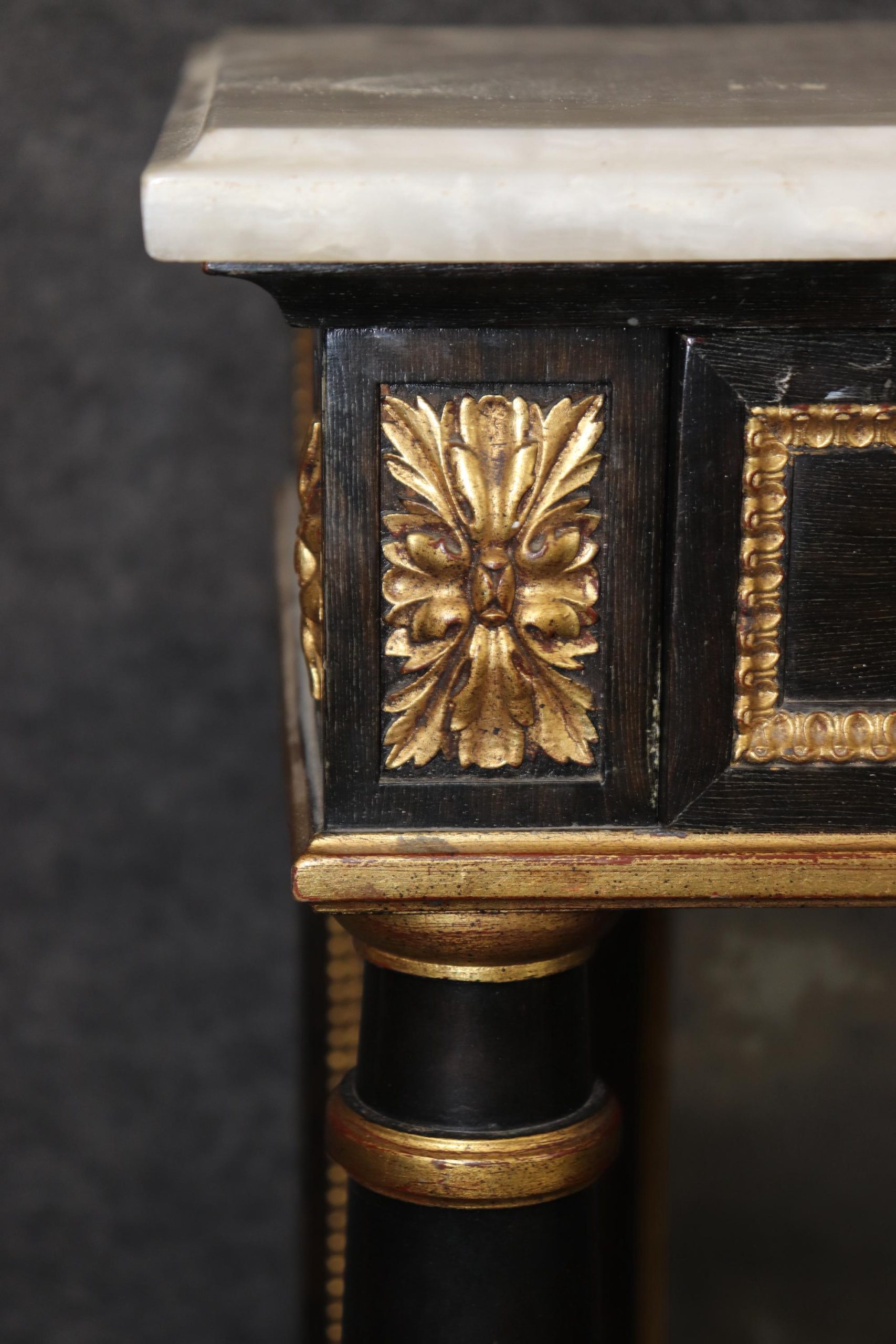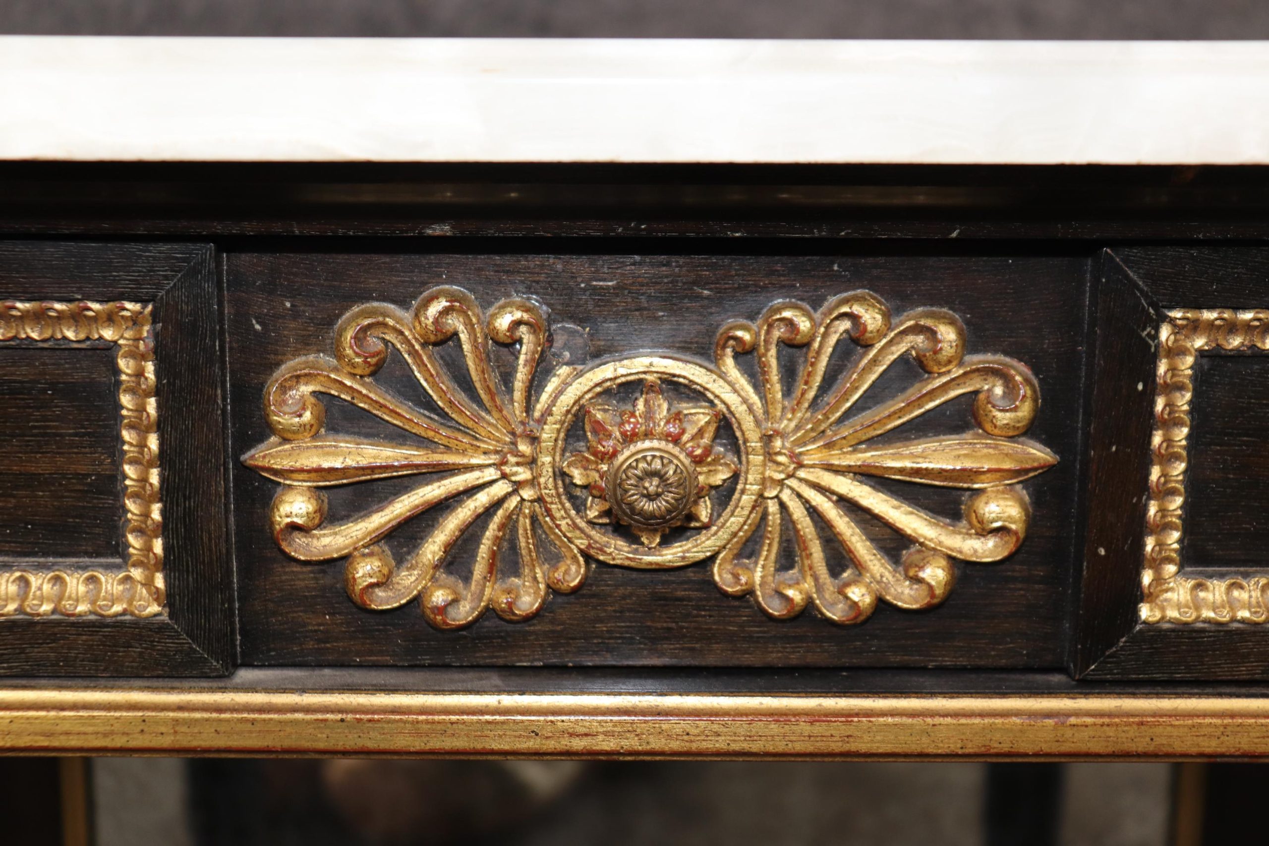This Louis XVI style alabaster top console server with an alabaster top is made of the highest quality! This console is perfect for your living room, entryway, bedroom, dining room, office or place of your choosing! This piece can also be paired with a variety of other styles due to its simplistic yet luxurious design! This console is bound to bring a lovely sense of sophistication and luxury into your home and will certainly be a conversation starter at your next gathering. If you look carefully at the photos you’ll see the distressed mirror back. Antique furniture and vintage pieces have stood the test of time and this marble top console is no exception! With its quality materials and great craftsmanship this piece is bound to last you and your family for many years to come. The piece is in good vintage condition with the exception of light surface scratches and some minor finish loss as to be expected from an item of age and use.