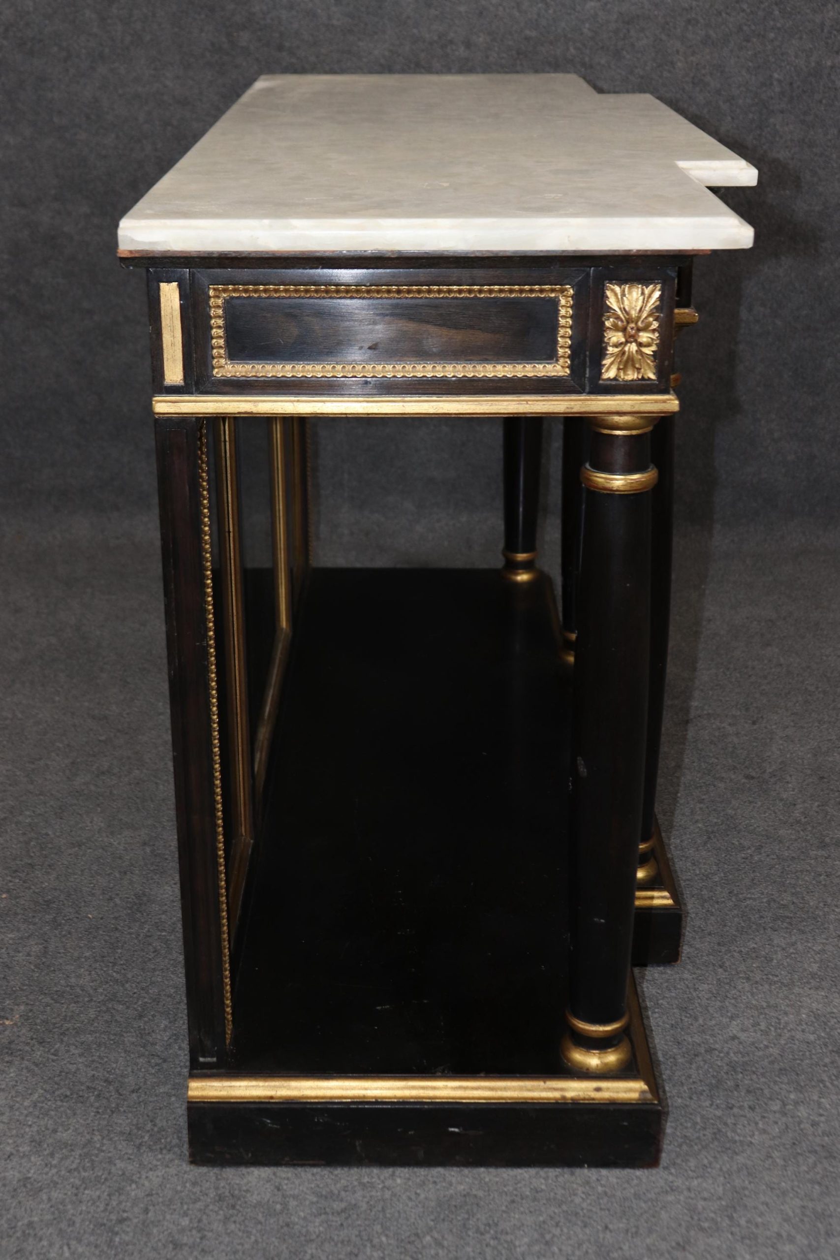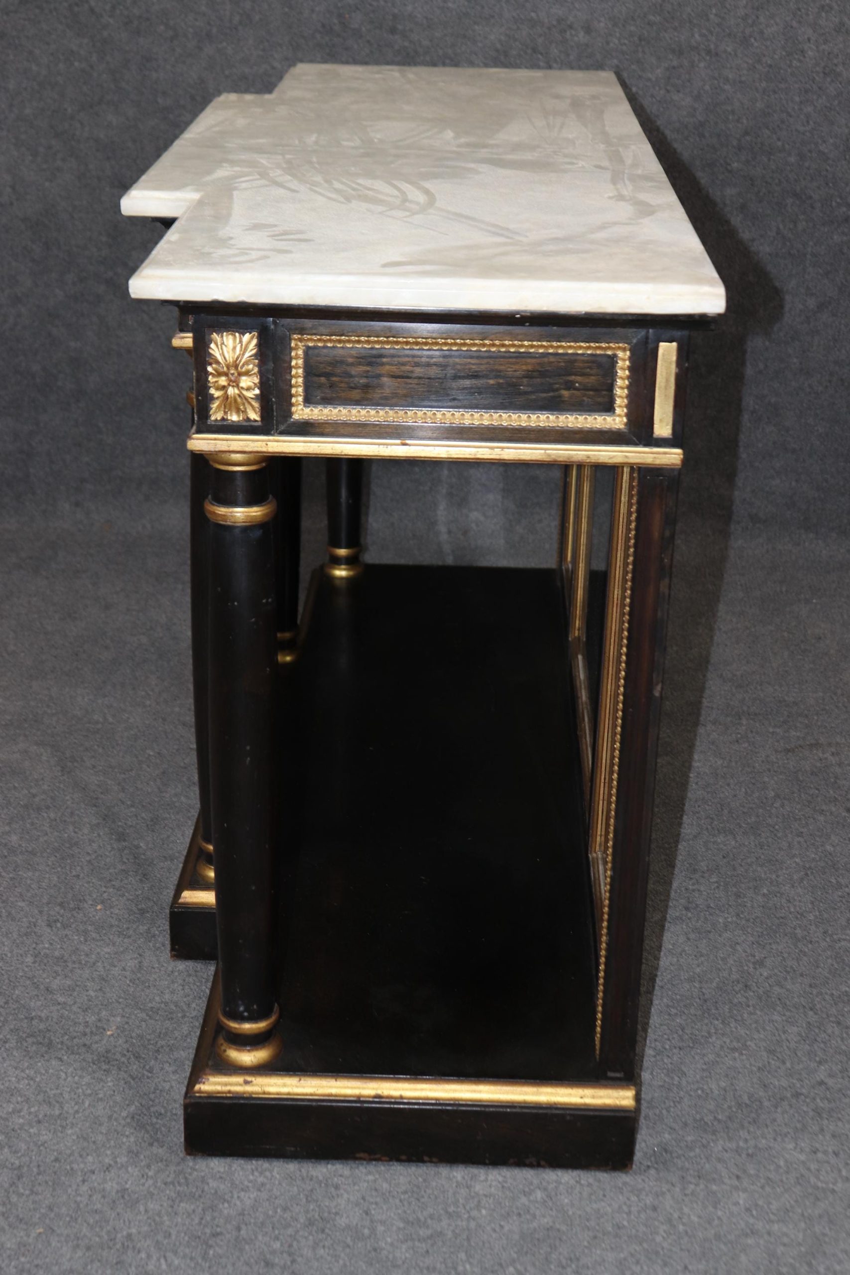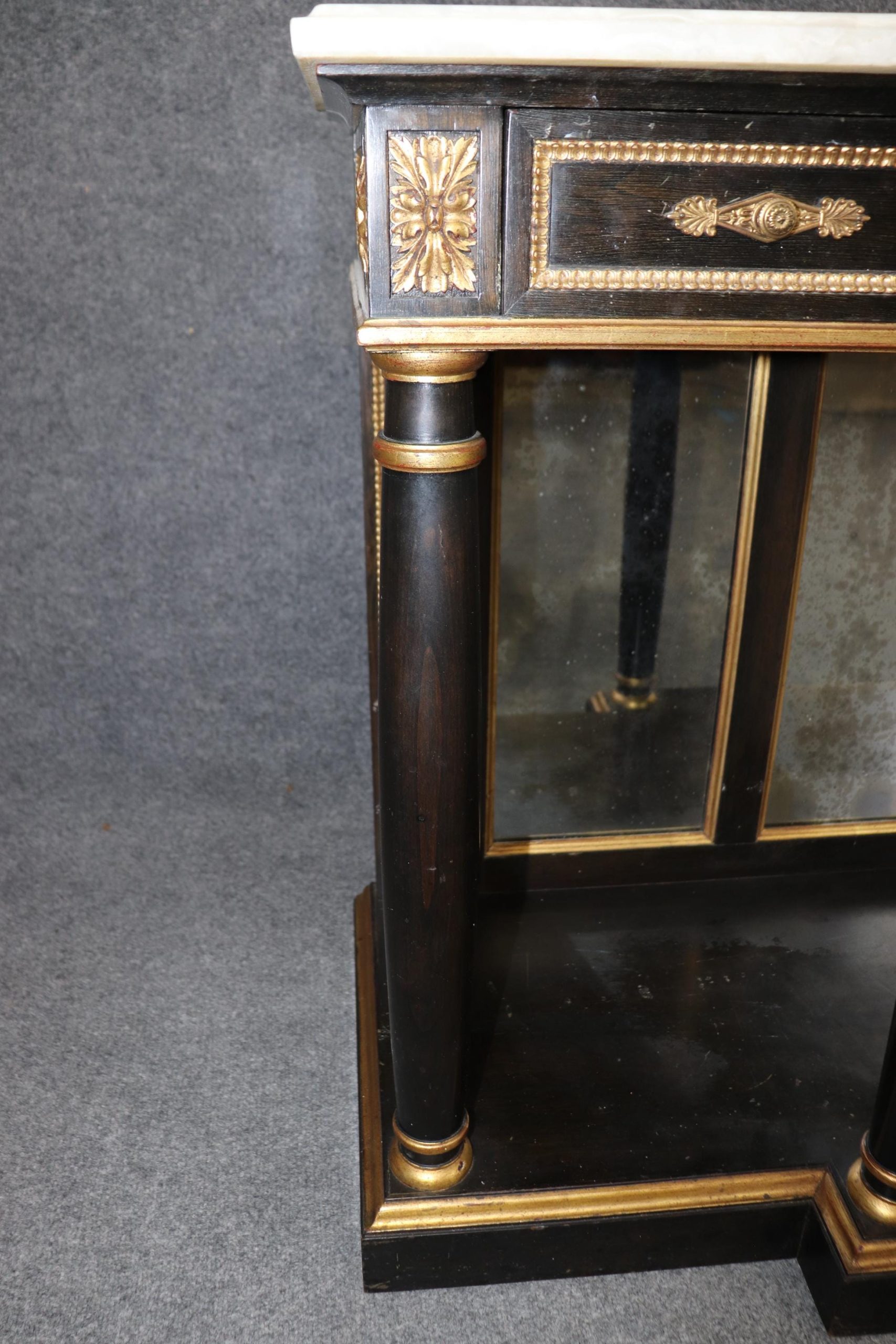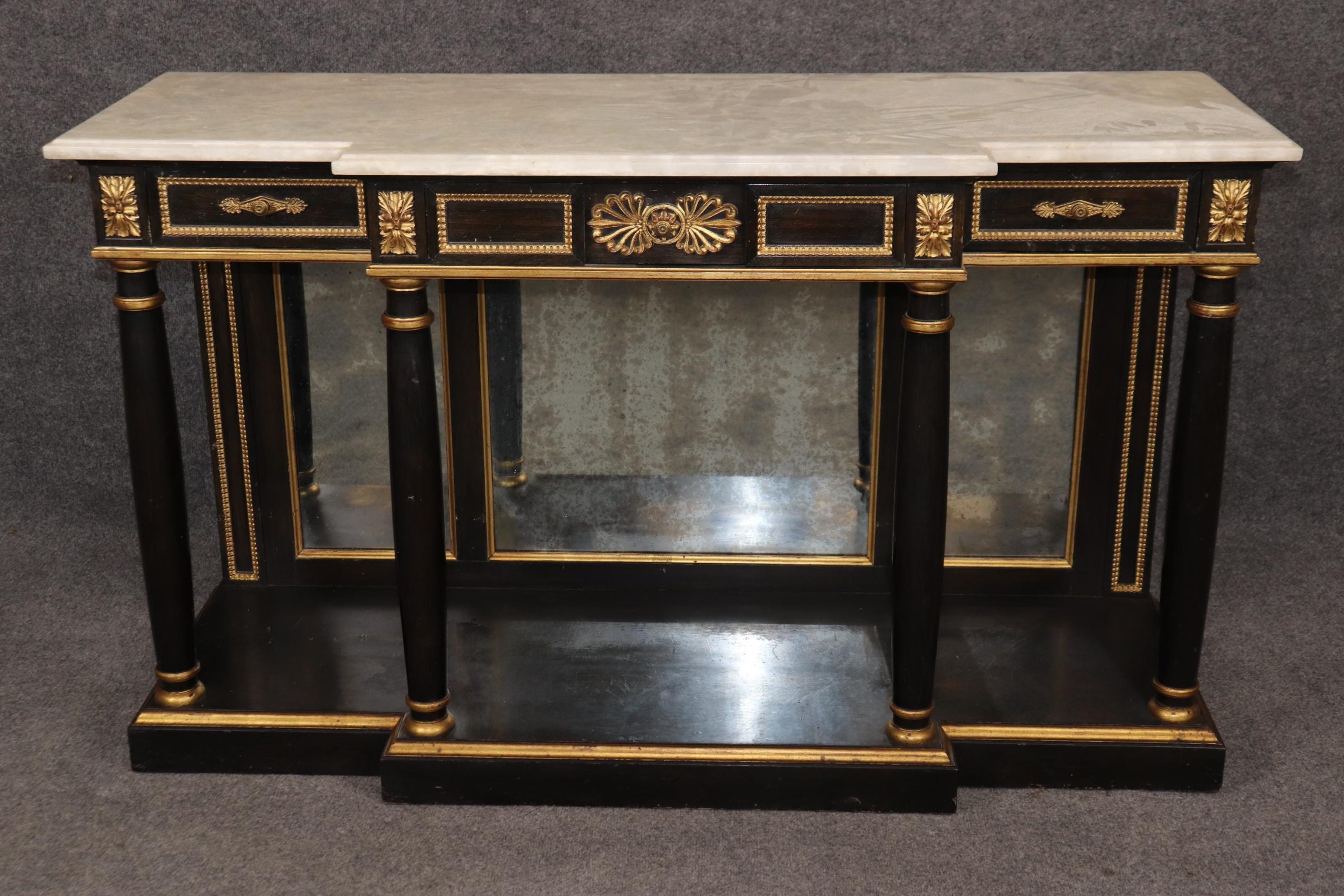 This Louis XVI style alabaster top console server with an alabaster top is made of the highest quality! This console is perfect for your living room, entryway, bedroom, dining room, office or place of your choosing! This piece can also be paired with a variety of other styles due to its simplistic yet luxurious design! This console is bound to bring a lovely sense of sophistication and luxury into your home and will certainly be a conversation starter at your next gathering. If you look carefully at the photos you’ll see the distressed mirror back. Antique furniture and vintage pieces have stood the test of time and this marble top console is no exception! With its quality materials and great craftsmanship this piece is bound to last you and your family for many years to come. The piece is in good vintage condition with the exception of light surface scratches and some minor finish loss as to be expected from an item of age and use.