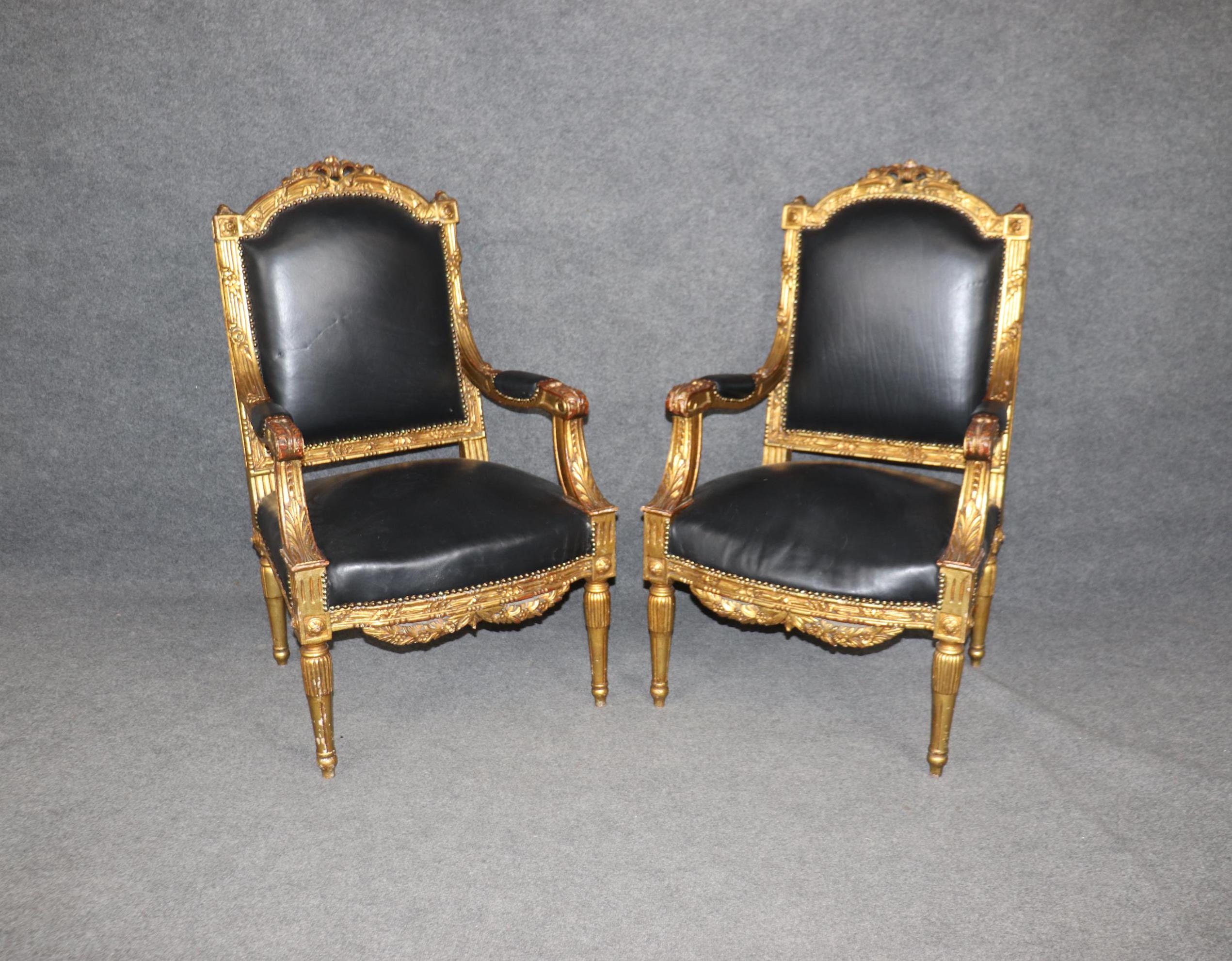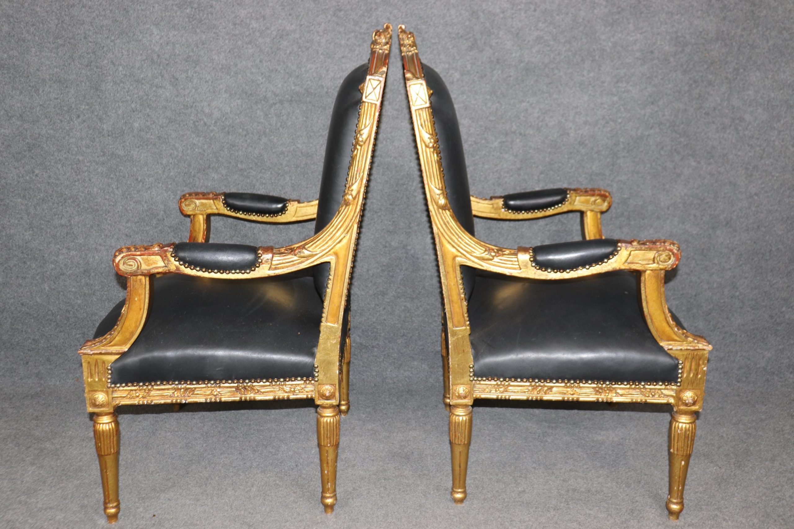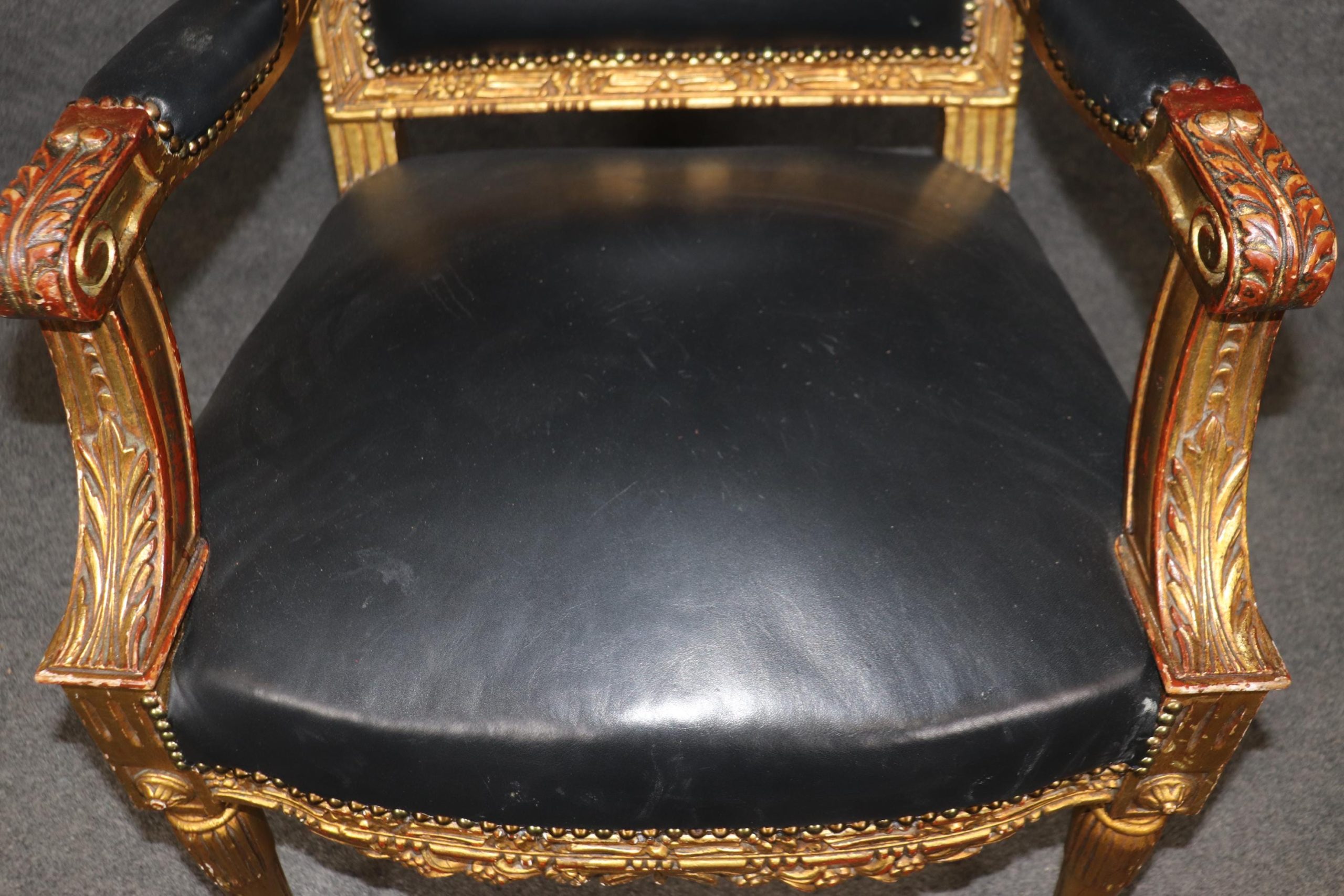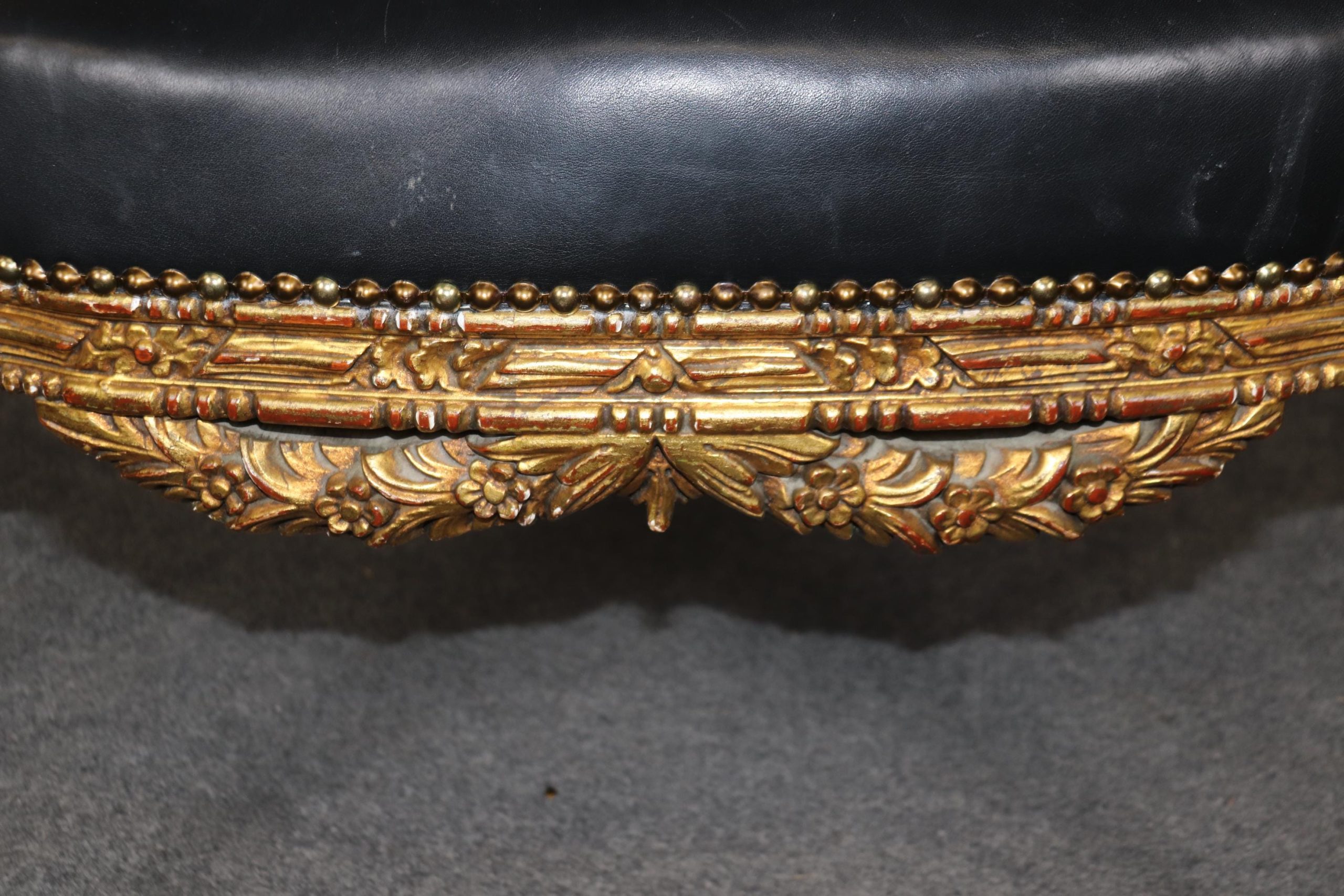 This vintage pair of Louis XVI style carved gold gilt armchairs accent chairs is perfect for you and your home and is a lovely example of high quality furniture from the 1960s! If you look at the photos provided, you will see the sophisticated black upholstery. This pair is perfect for any entryway, living room, bedroom or office and is bound to bring that little extra sense of character and class into your home! One nice thing about this pair, is the ability to be paired with a variety of other styles including Art Deco, Art Nouveau, Louis XV, Louis XVI, Mid Century Modern and Contemporary! Antique furniture and vintage pieces have stood the test of time and this pair of armchairs is no exception! With their quality materials and great craftsmanship, this pair is bound to last you and your family for many years to come. The chairs are in good vintage condition with light surface scratches and minor finish loss to the frames, but otherwise good condition. Upholstery appears to be in good condition and shows minor signs of wear.