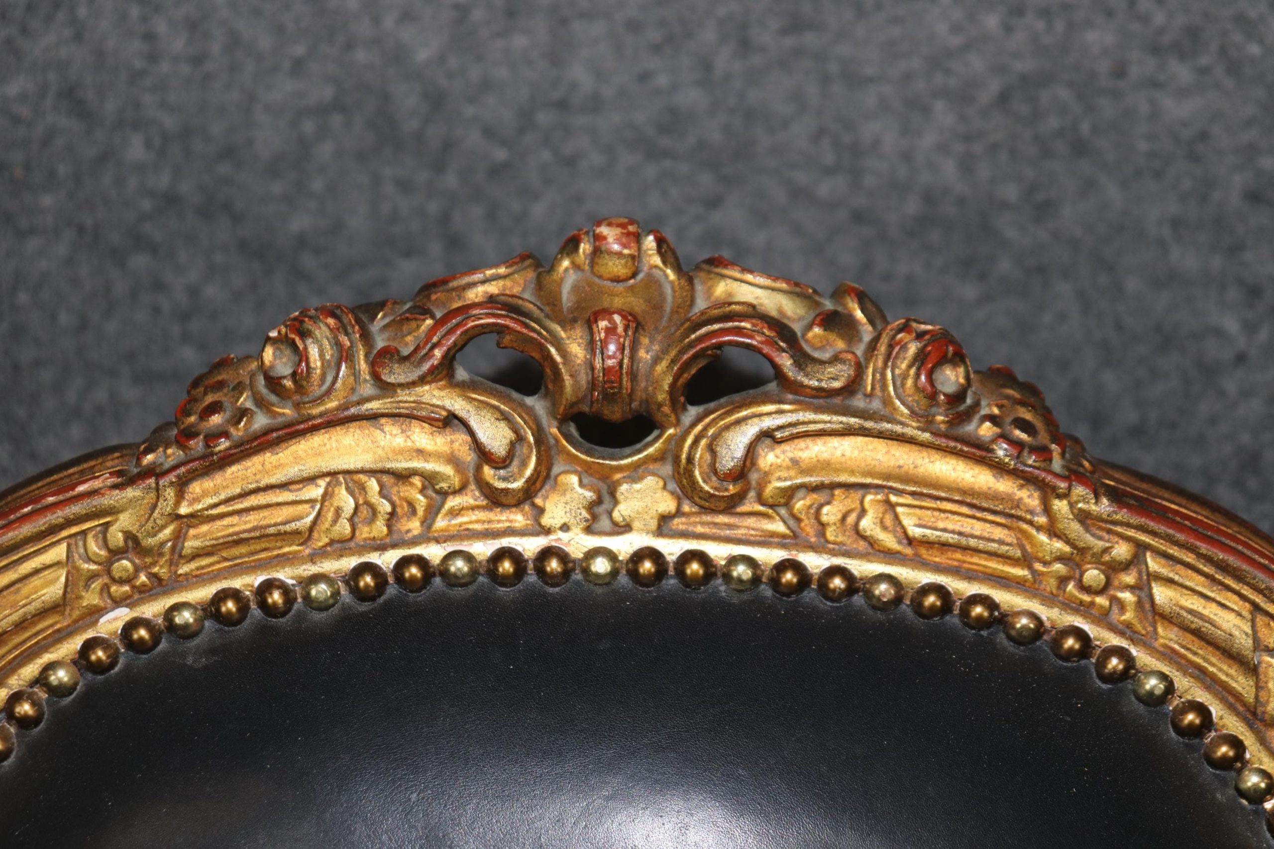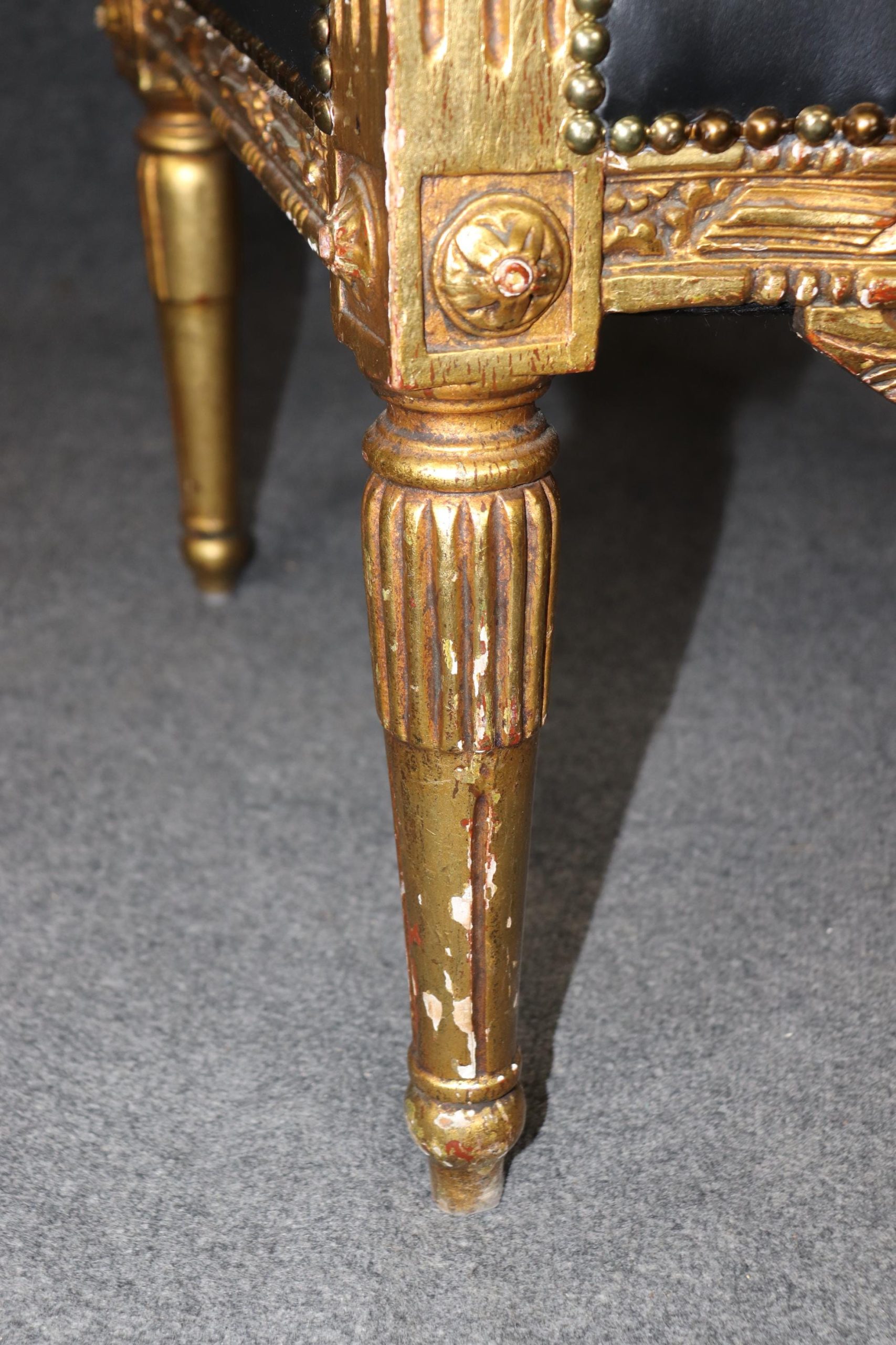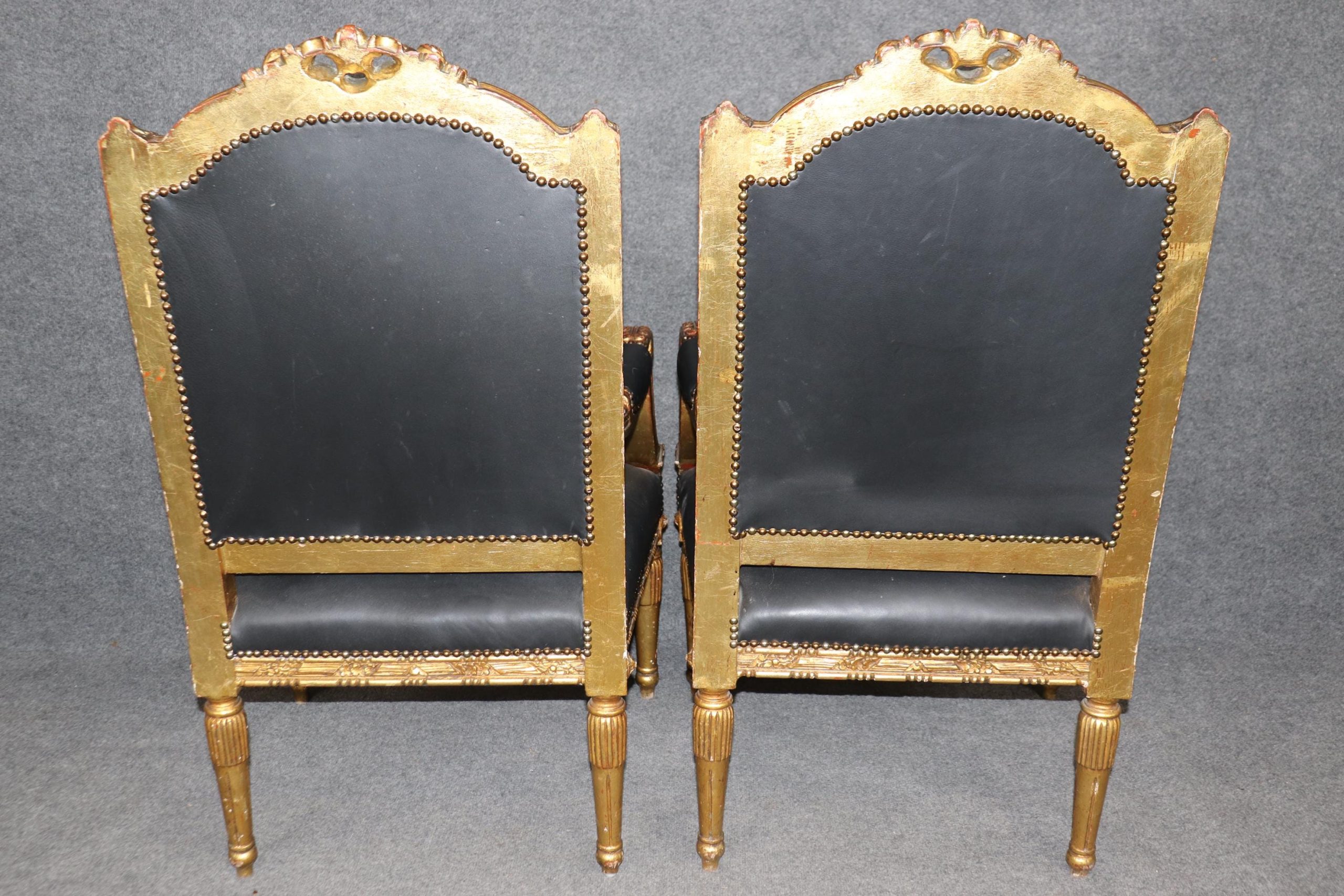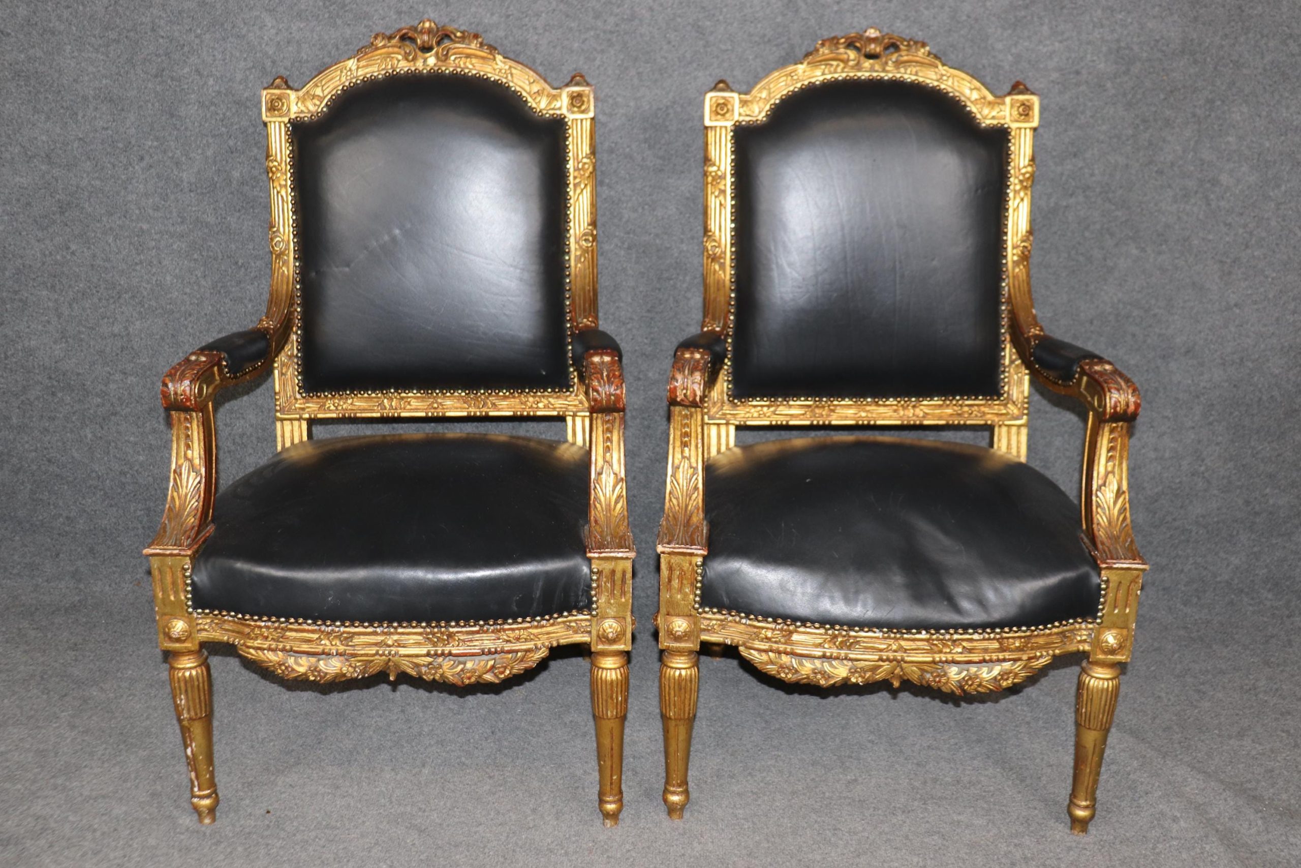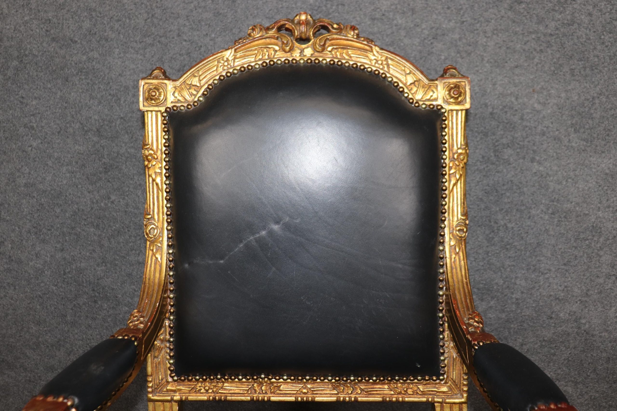 This vintage pair of Louis XVI style carved gold gilt armchairs accent chairs is perfect for you and your home and is a lovely example of high quality furniture from the 1960s! If you look at the photos provided, you will see the sophisticated black upholstery. This pair is perfect for any entryway, living room, bedroom or office and is bound to bring that little extra sense of character and class into your home! One nice thing about this pair, is the ability to be paired with a variety of other styles including Art Deco, Art Nouveau, Louis XV, Louis XVI, Mid Century Modern and Contemporary! Antique furniture and vintage pieces have stood the test of time and this pair of armchairs is no exception! With their quality materials and great craftsmanship, this pair is bound to last you and your family for many years to come. The chairs are in good vintage condition with light surface scratches and minor finish loss to the frames, but otherwise good condition. Upholstery appears to be in good condition and shows minor signs of wear.