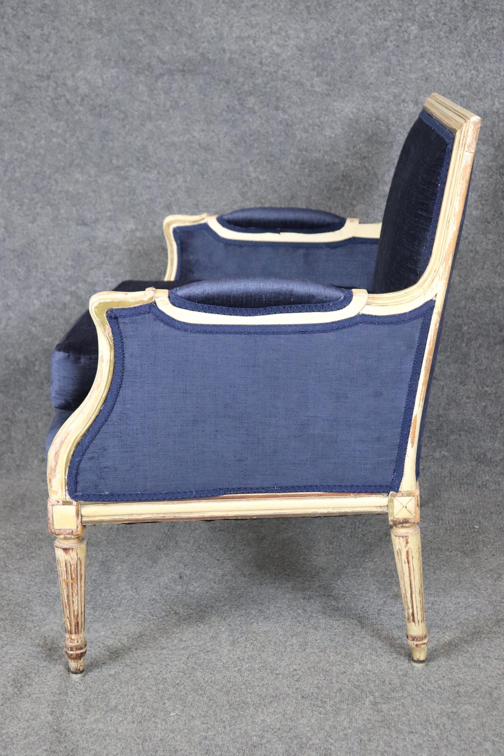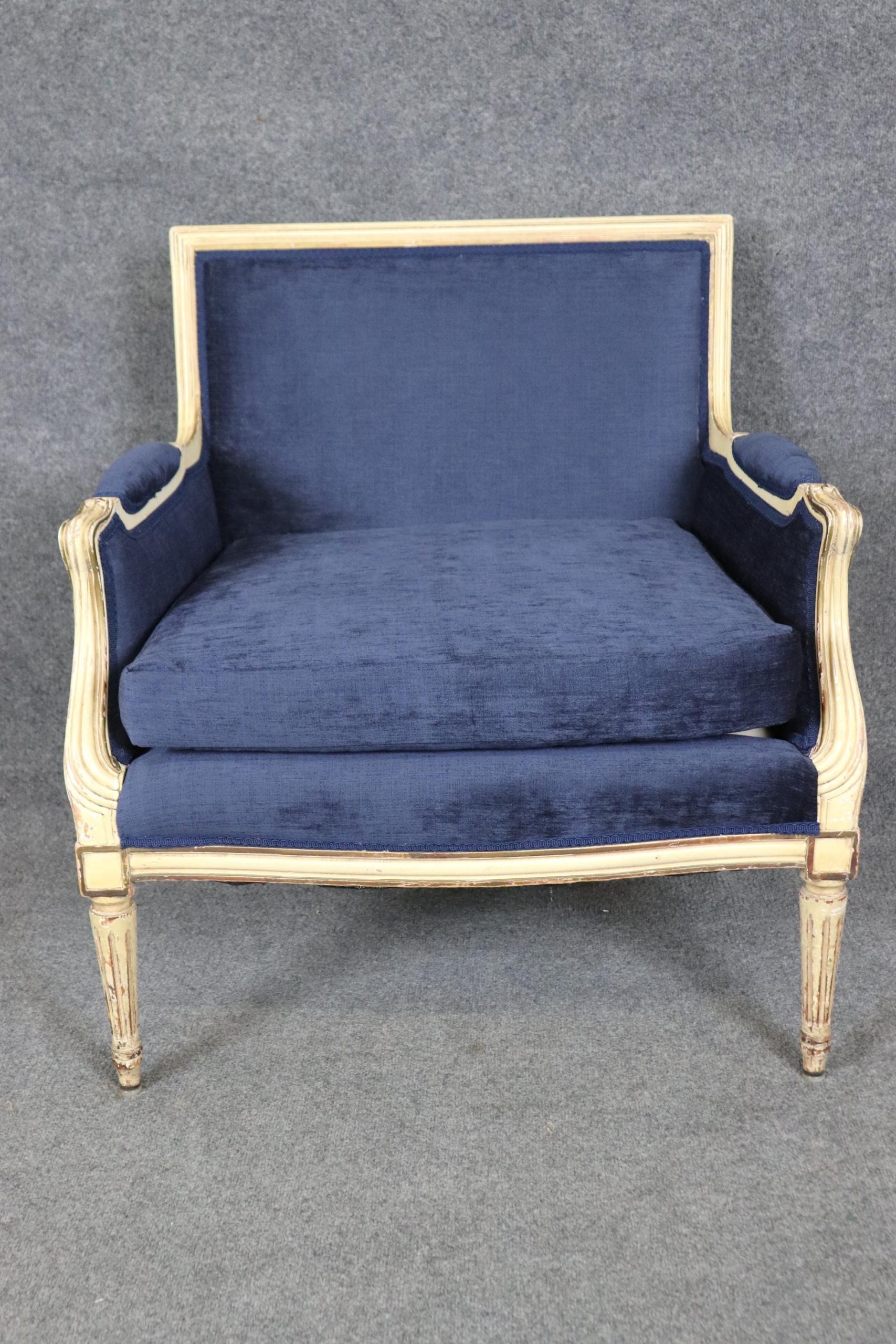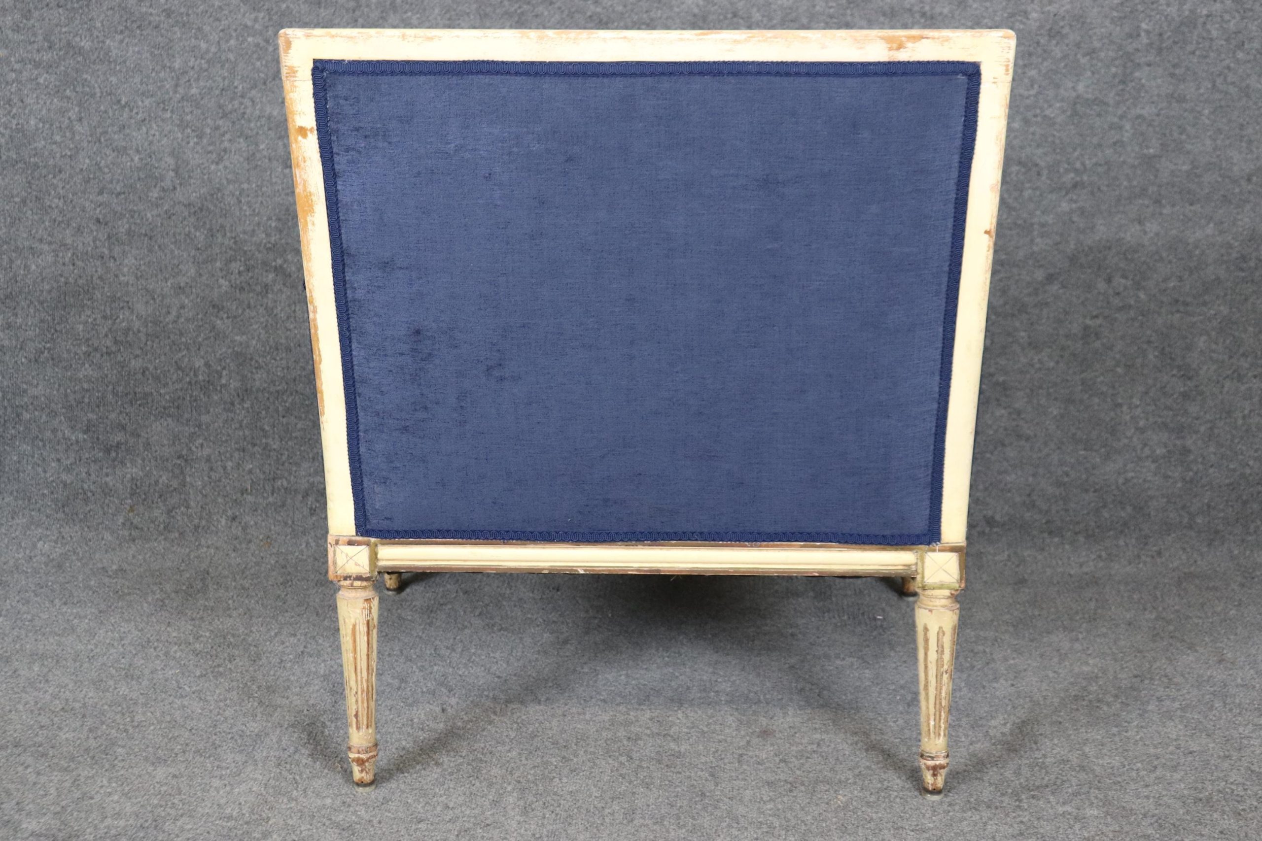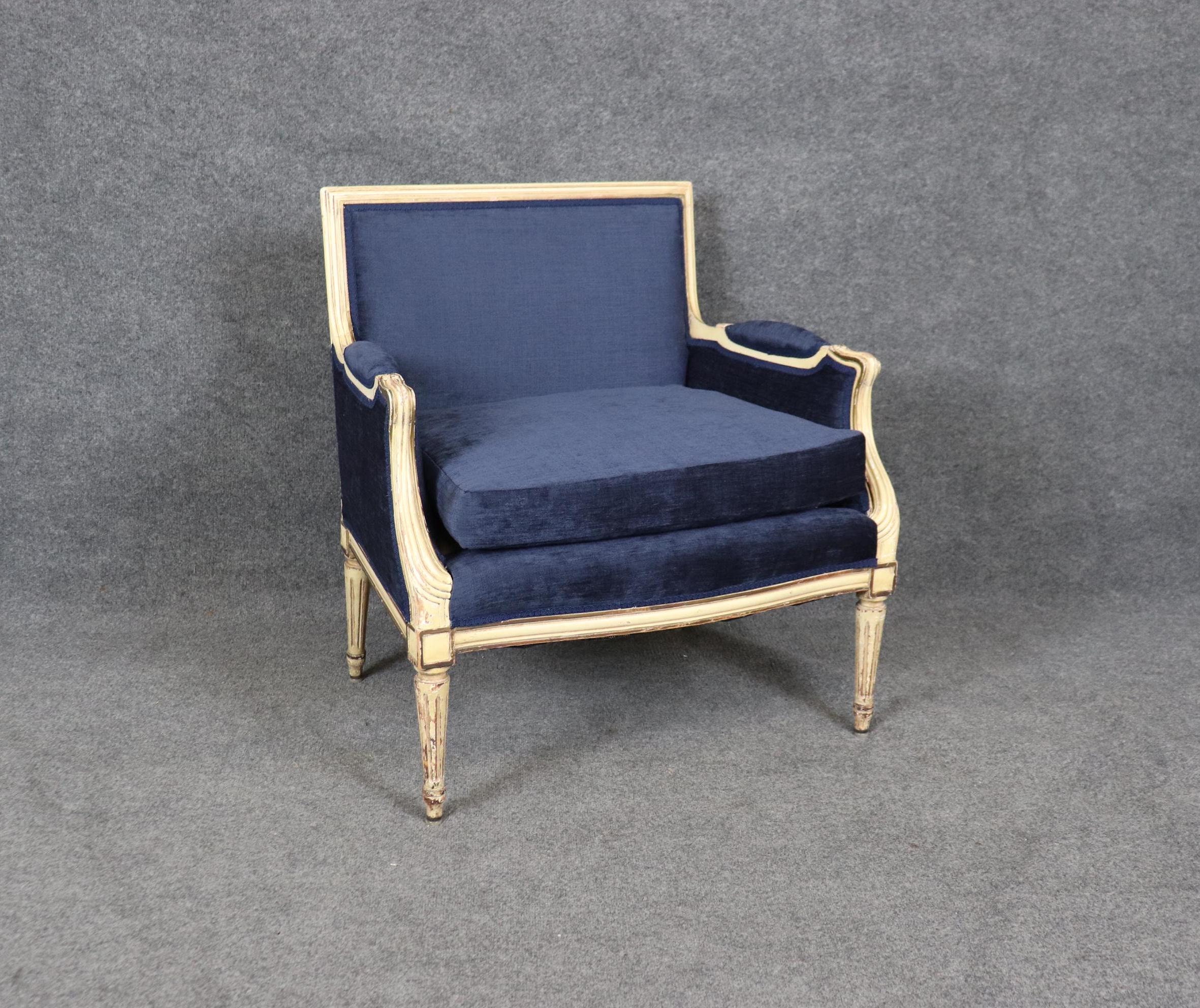 This vintage Louis XVI style upholstered distressed paint decorated bergere chair is made of the highest quality and is perfect for you and your home! If you look at the photos provided, you will see the luxurious blue upholstery. This is perfect for any living room, bedroom, entryway or office and is bound to bring a sense of luxury and class into your place of choosing! Antique furniture and vintage pieces have stood the test of time and this chair is no exception! With its quality materials and great craftsmanship, this piece is bound to last you and your family for many years to come! This is in good antique/vintage condition with some light surface scratches and finish loss to frames. The upholstery appears to be in good condition.