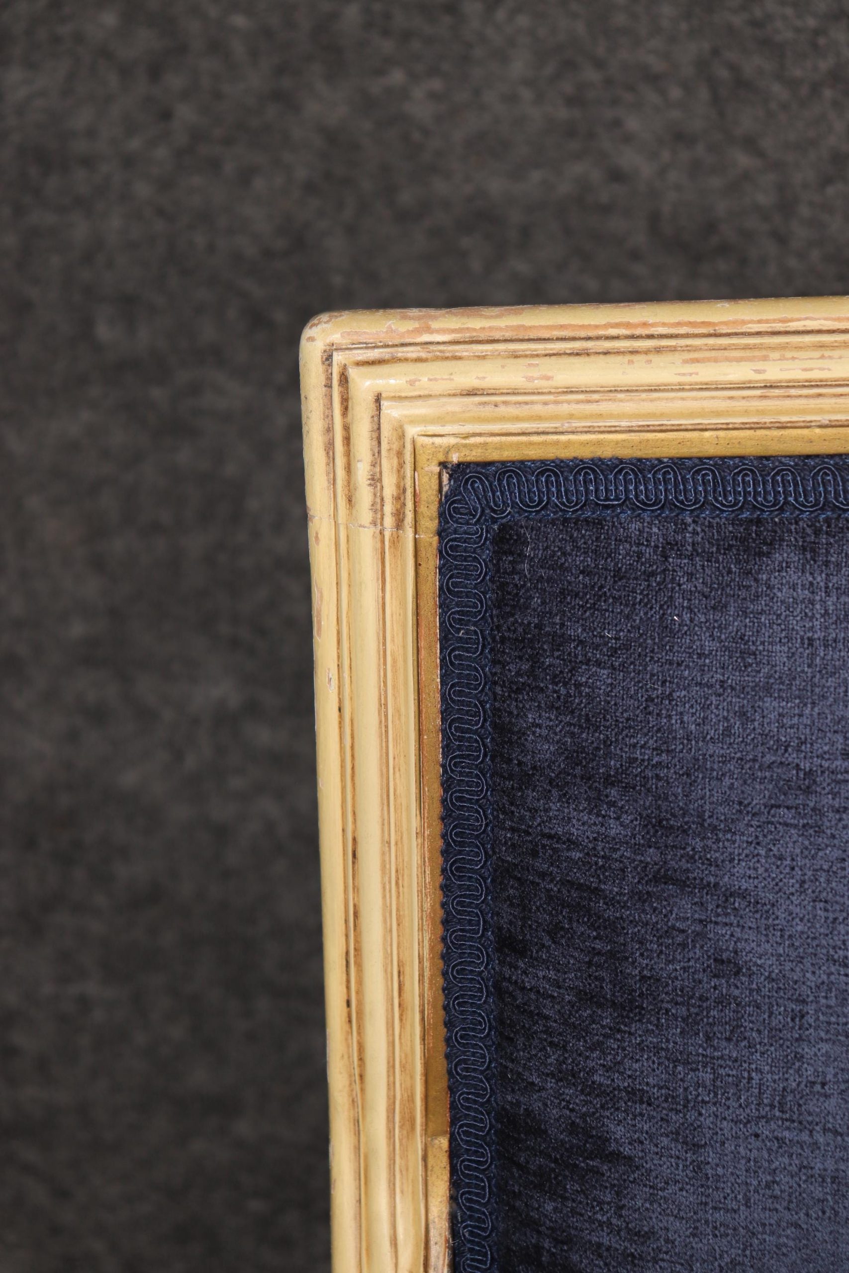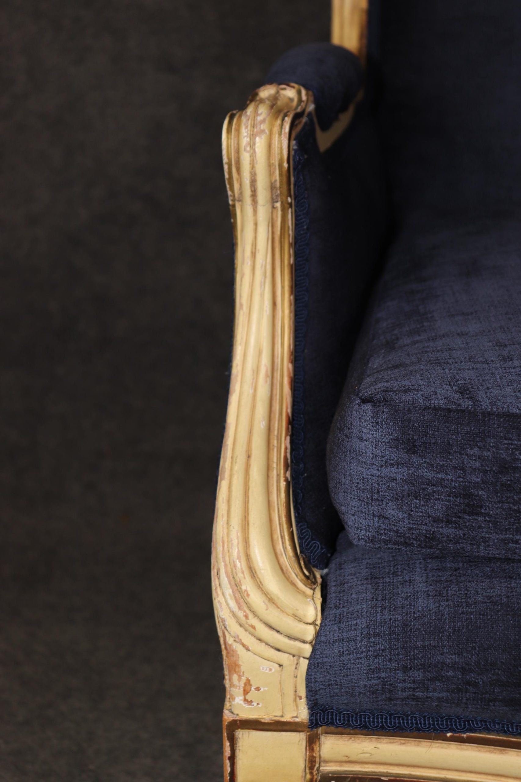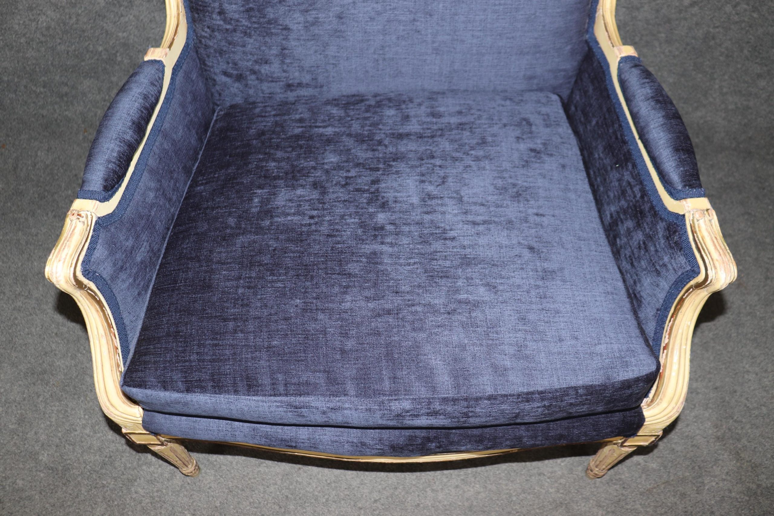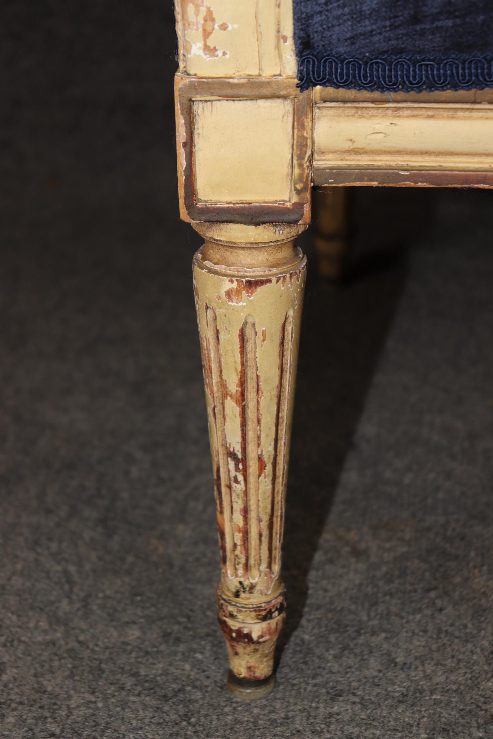 This vintage Louis XVI style upholstered distressed paint decorated bergere chair is made of the highest quality and is perfect for you and your home! If you look at the photos provided, you will see the luxurious blue upholstery. This is perfect for any living room, bedroom, entryway or office and is bound to bring a sense of luxury and class into your place of choosing! Antique furniture and vintage pieces have stood the test of time and this chair is no exception! With its quality materials and great craftsmanship, this piece is bound to last you and your family for many years to come! This is in good antique/vintage condition with some light surface scratches and finish loss to frames. The upholstery appears to be in good condition.