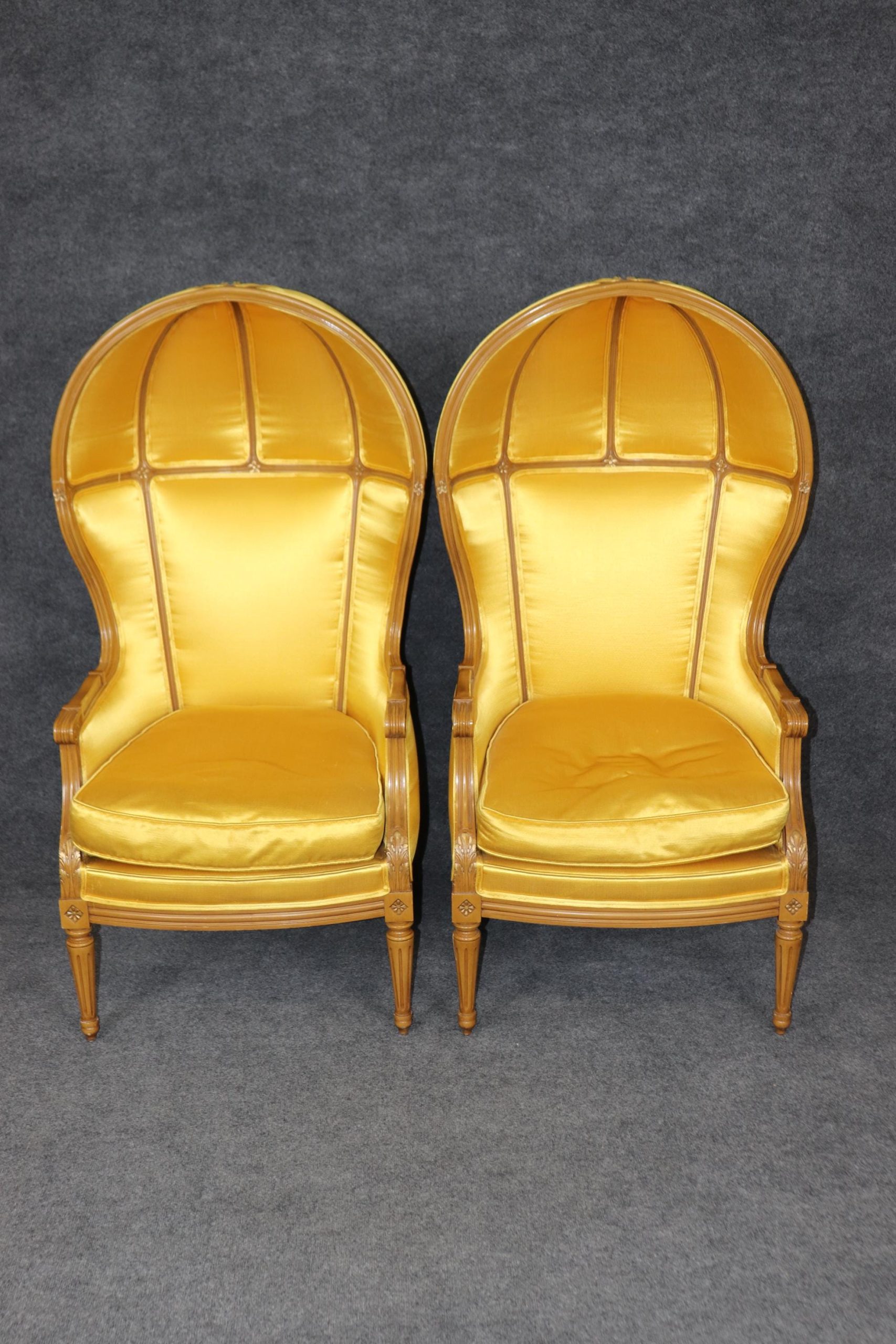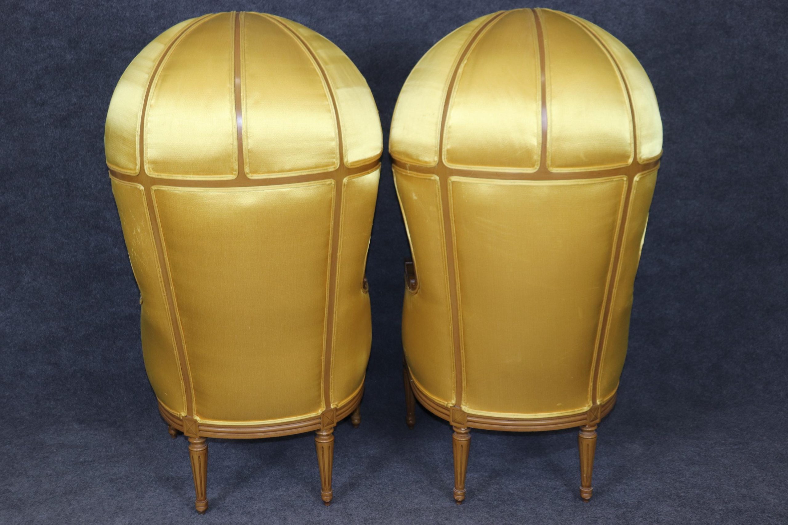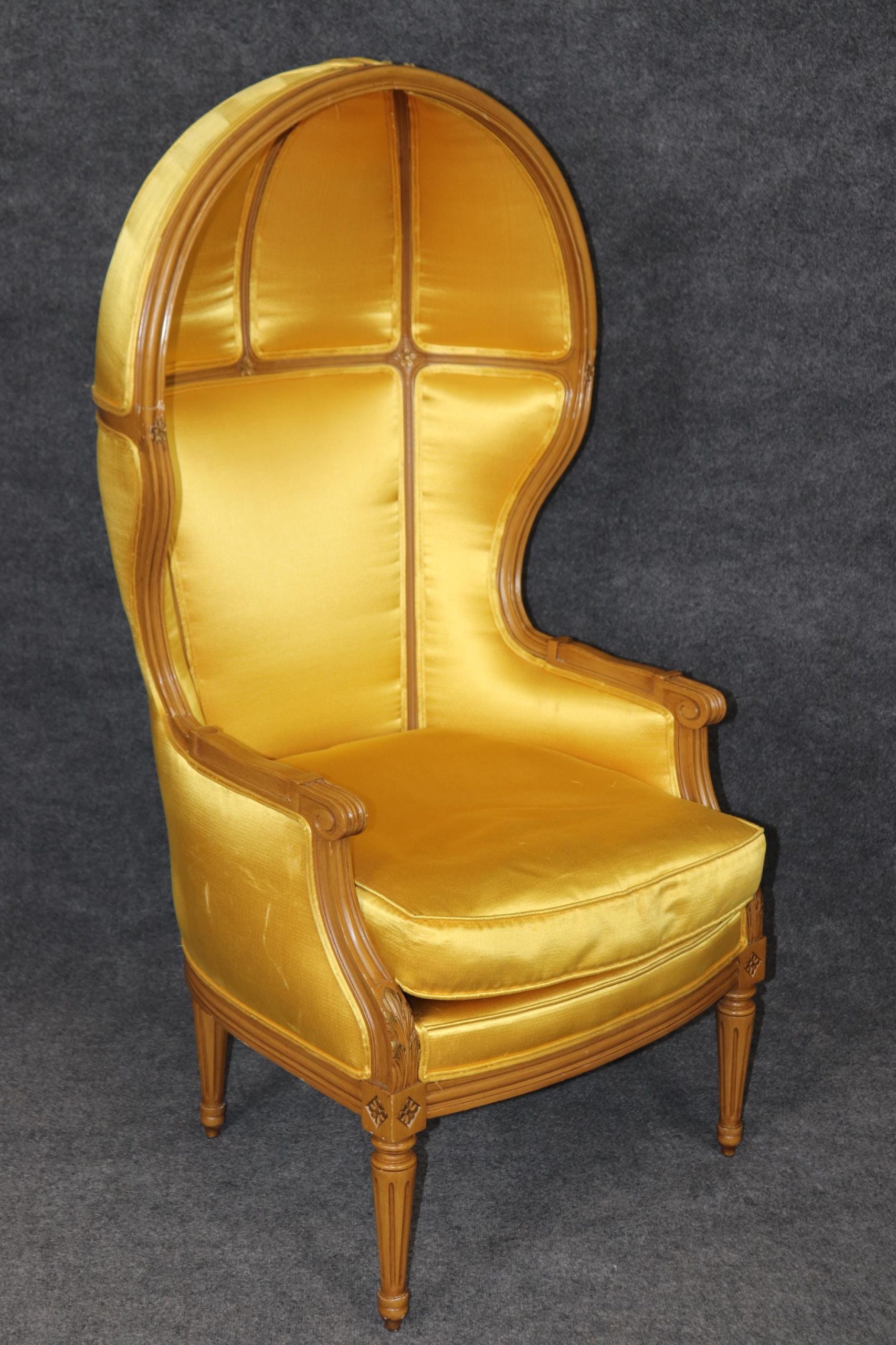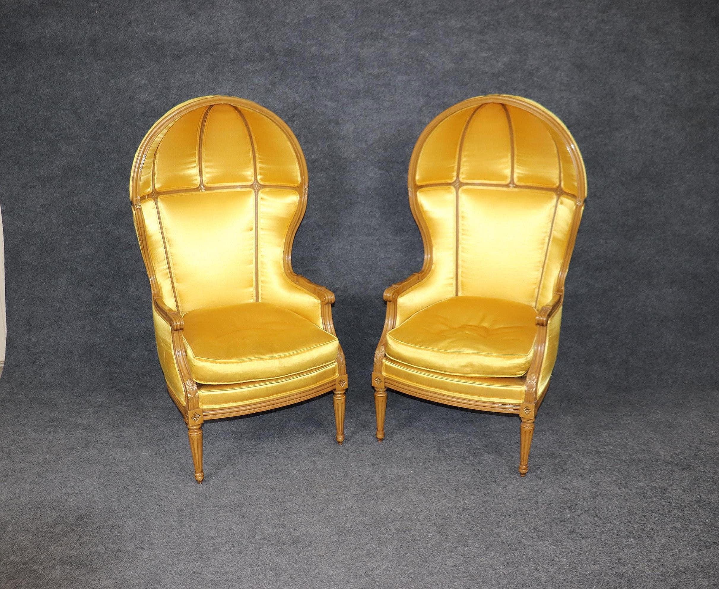 This vintage mid century pair of Louis XVI style porter or canopy chairs is perfect for you and your home and is a lovely example of high quality furniture from the 20th century! If you look at the photos provided, you will see the luxurious gold upholstery. The chairs are equipped with down cushions. This pair is perfect for any entryway, living room, bedroom or office and is bound to bring that little extra sense of character and class into your home! One nice thing about this pair is the ability to be paired with a variety of other styles including Art Deco, Art Nouveau, Louis XV, Louis XVI, Mid Century Modern and Contemporary! Antique furniture and vintage pieces have stood the test of time and this pair of chairs is no exception! With their quality materials and great craftsmanship this pair is bound to last you and your family for many years to come. The chairs are in good vintage condition with light surface scratches and minor finish loss to the frames, but otherwise good condition. The upholstery appears to be in good condition, but may show minor signs of wear.