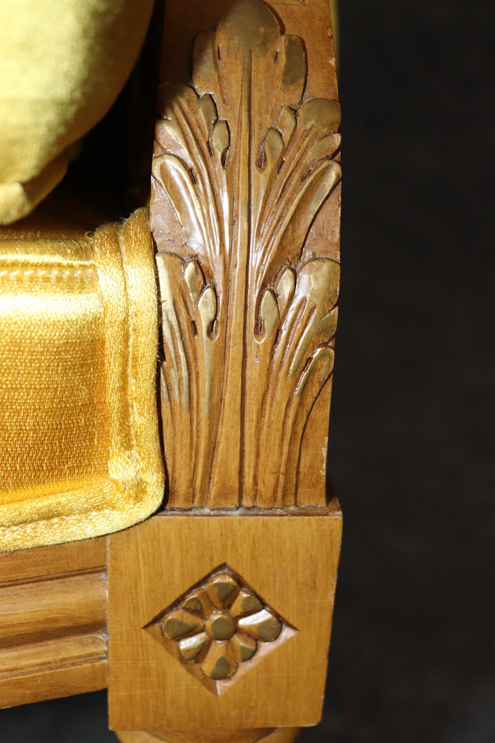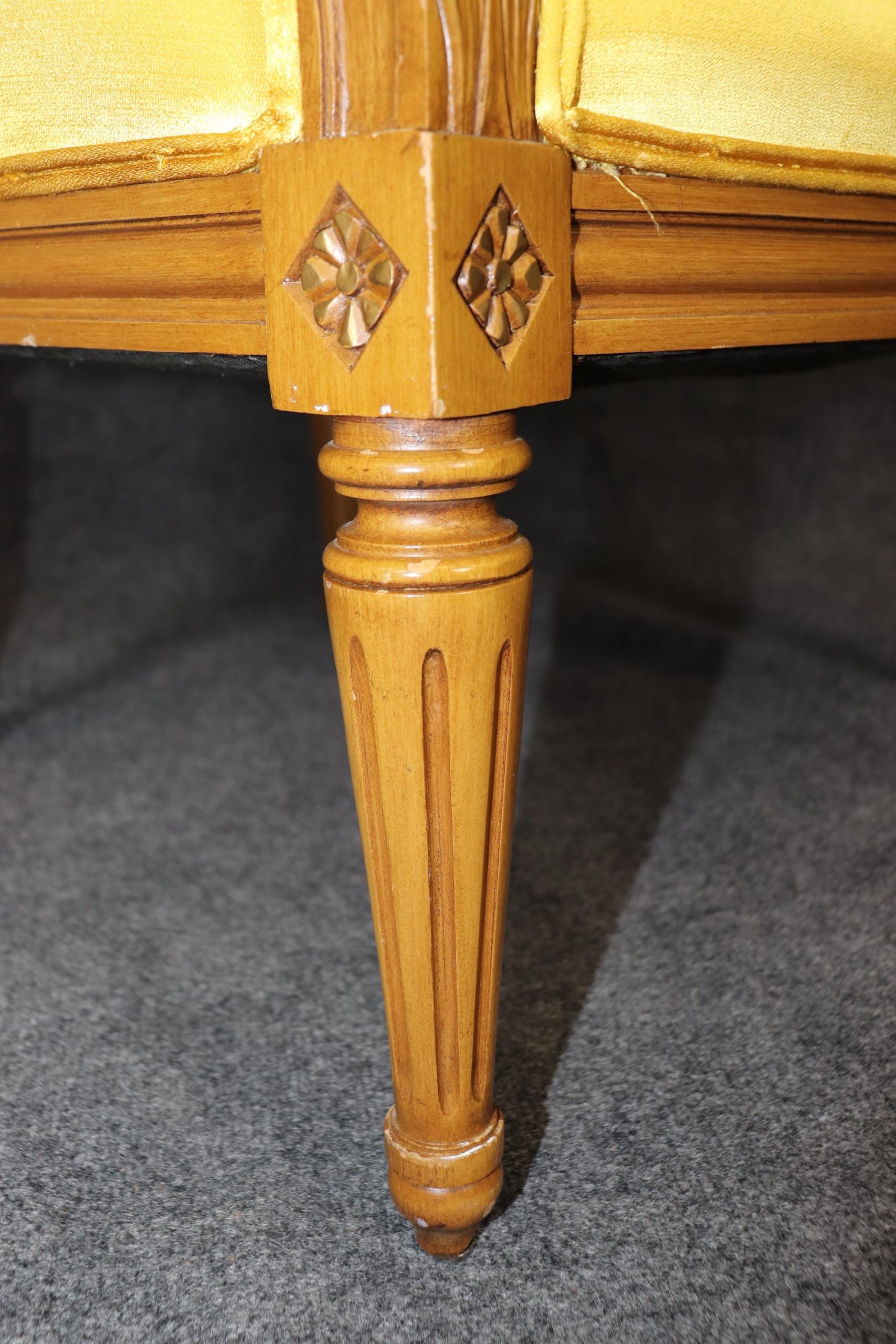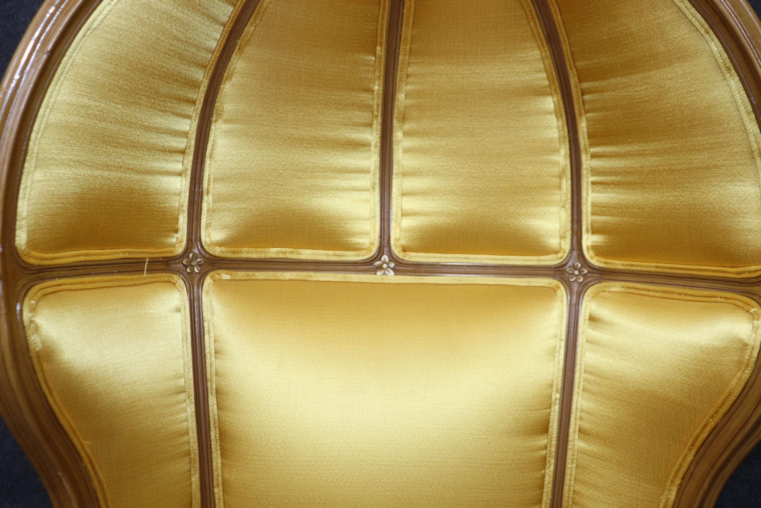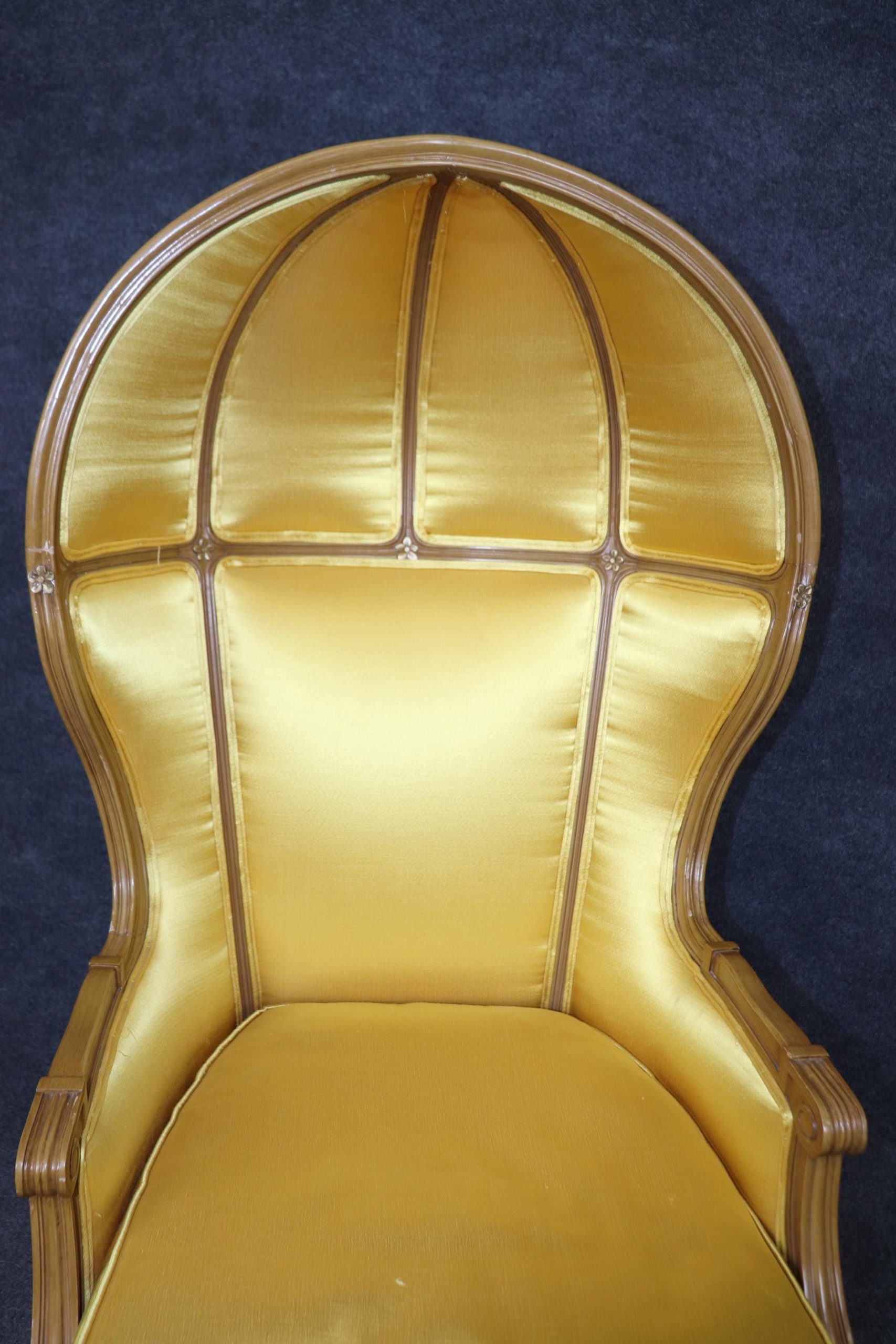 This vintage mid century pair of Louis XVI style porter or canopy chairs is perfect for you and your home and is a lovely example of high quality furniture from the 20th century! If you look at the photos provided, you will see the luxurious gold upholstery. The chairs are equipped with down cushions. This pair is perfect for any entryway, living room, bedroom or office and is bound to bring that little extra sense of character and class into your home! One nice thing about this pair is the ability to be paired with a variety of other styles including Art Deco, Art Nouveau, Louis XV, Louis XVI, Mid Century Modern and Contemporary! Antique furniture and vintage pieces have stood the test of time and this pair of chairs is no exception! With their quality materials and great craftsmanship this pair is bound to last you and your family for many years to come. The chairs are in good vintage condition with light surface scratches and minor finish loss to the frames, but otherwise good condition. The upholstery appears to be in good condition, but may show minor signs of wear.