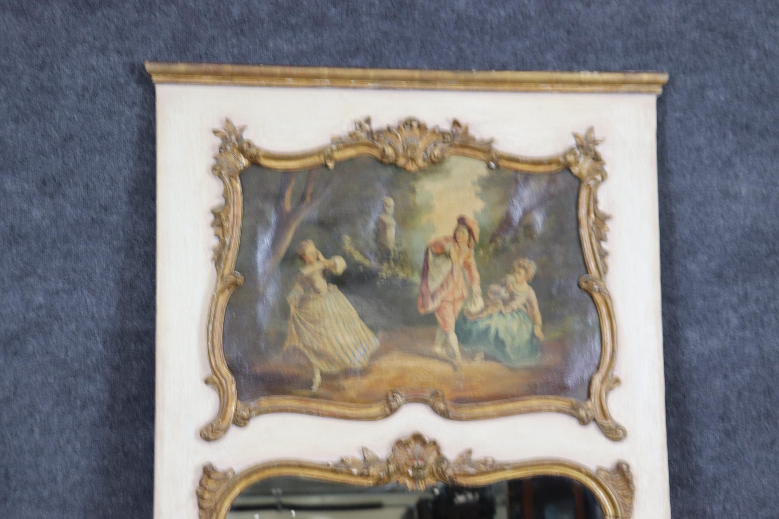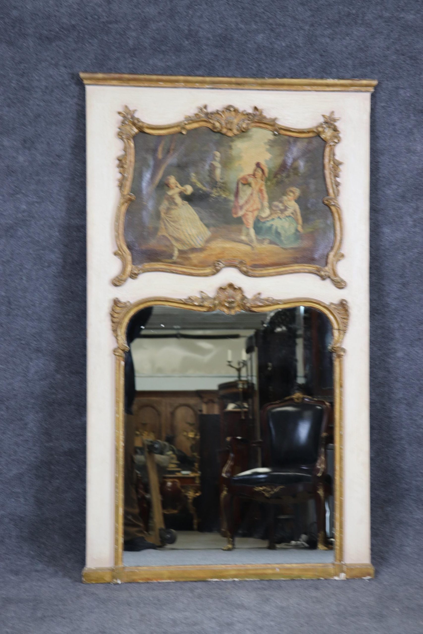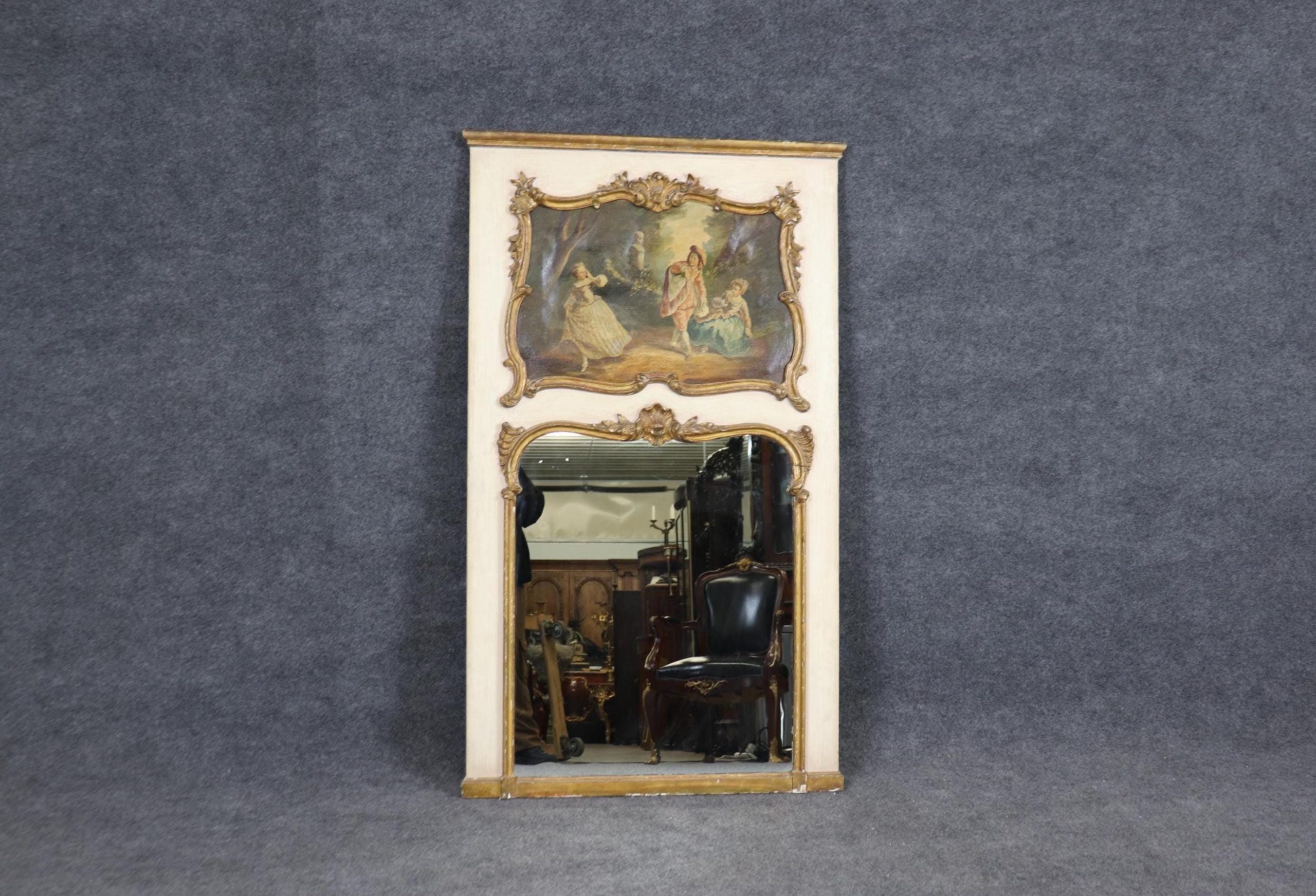 Enhance your space with this exquisite vintage Louis XVI style paint-decorated trumeau wall mirror, featuring a charming hand-painted courtship scene oil painting above the mirror glass and elegant French Rococo gilt accents. This beautifully crafted piece showcases the romantic elegance and timeless sophistication associated with 18th-century French design.