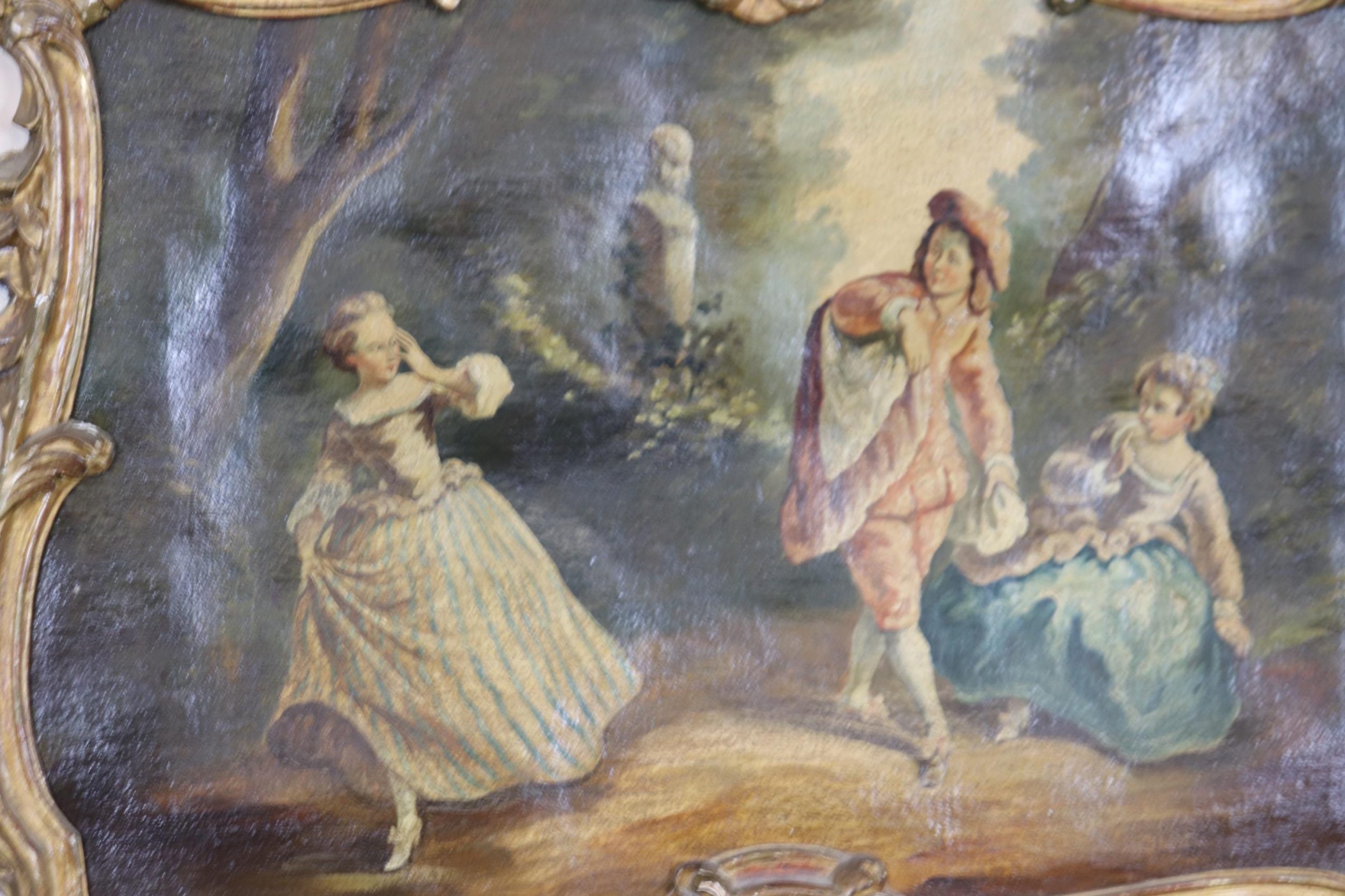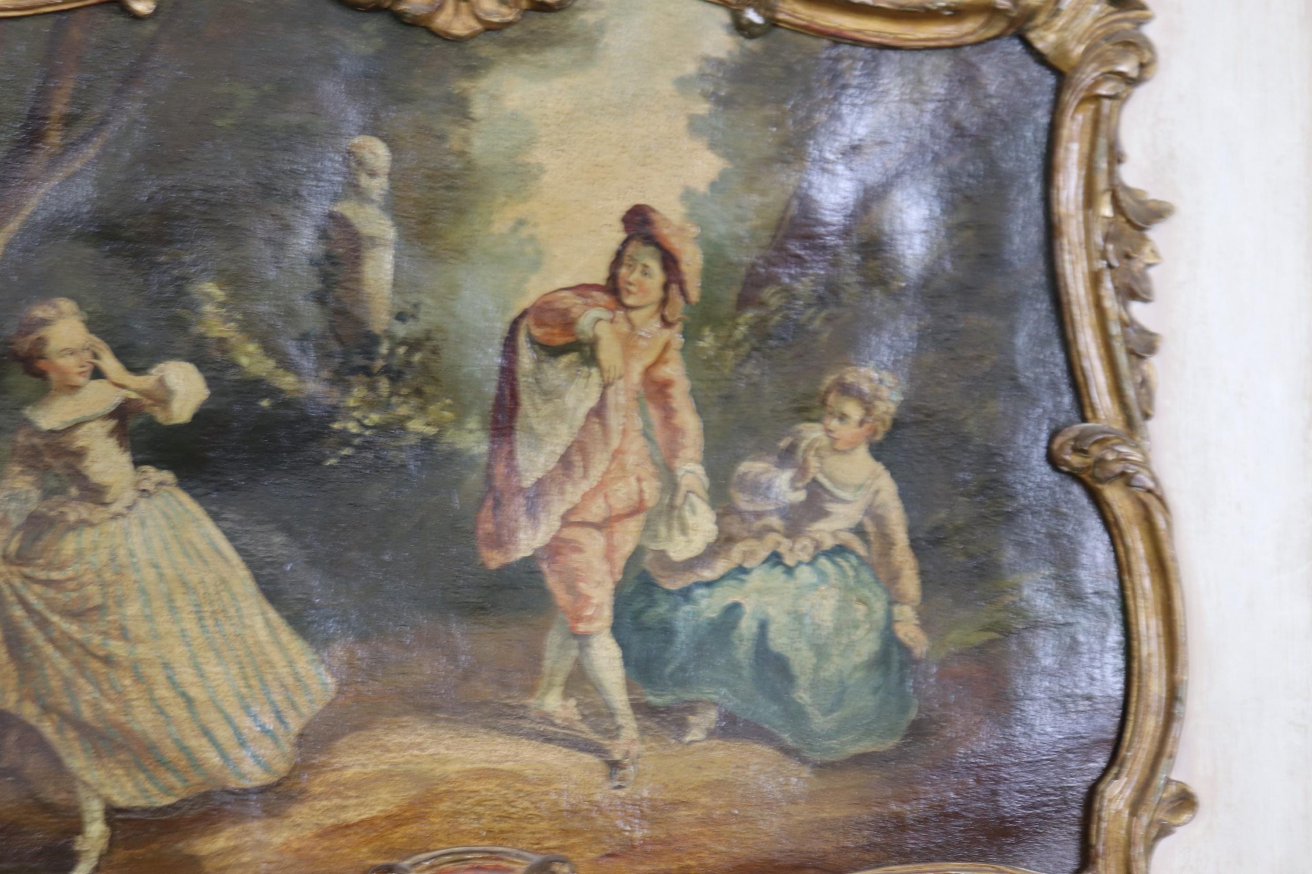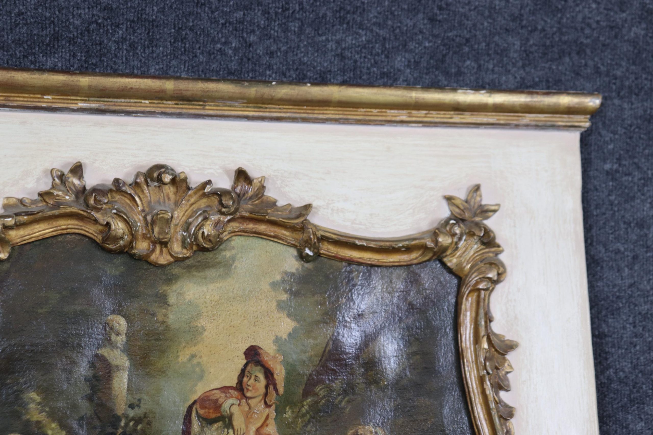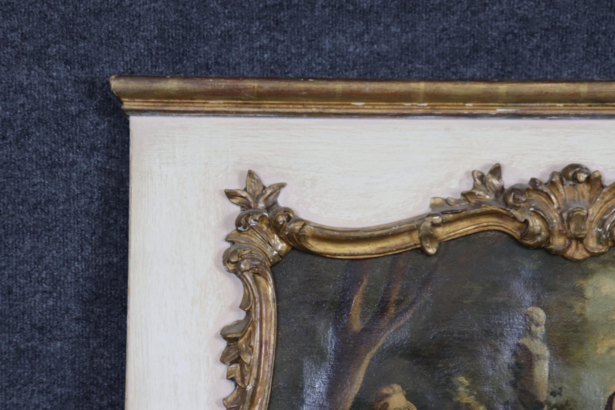 Enhance your space with this exquisite vintage Louis XVI style paint-decorated trumeau wall mirror, featuring a charming hand-painted courtship scene oil painting above the mirror glass and elegant French Rococo gilt accents. This beautifully crafted piece showcases the romantic elegance and timeless sophistication associated with 18th-century French design.