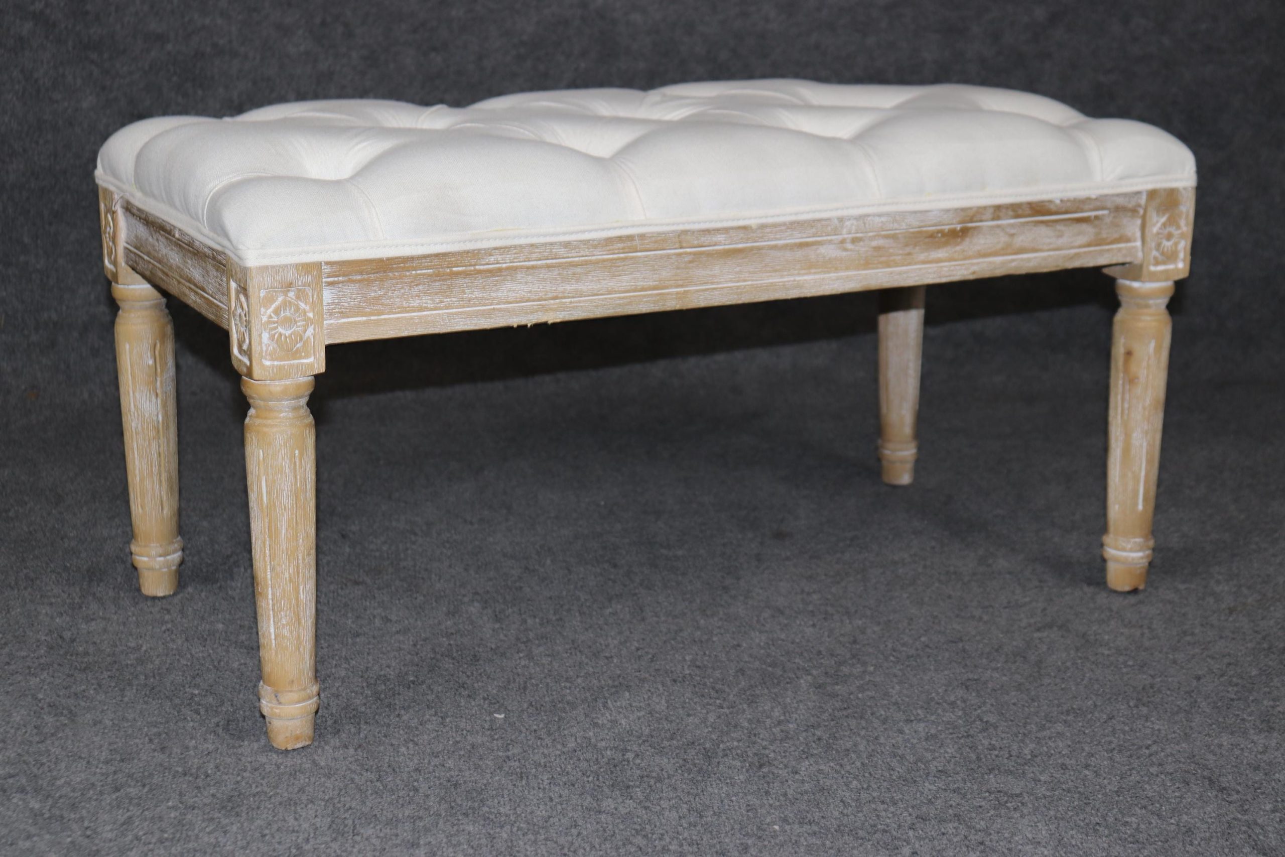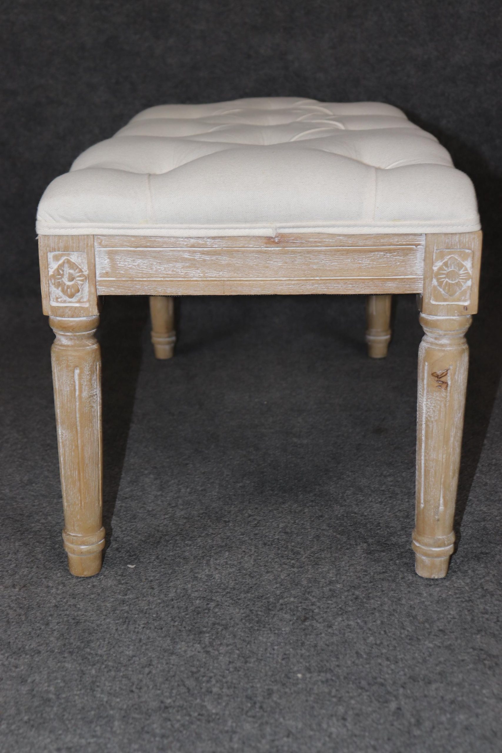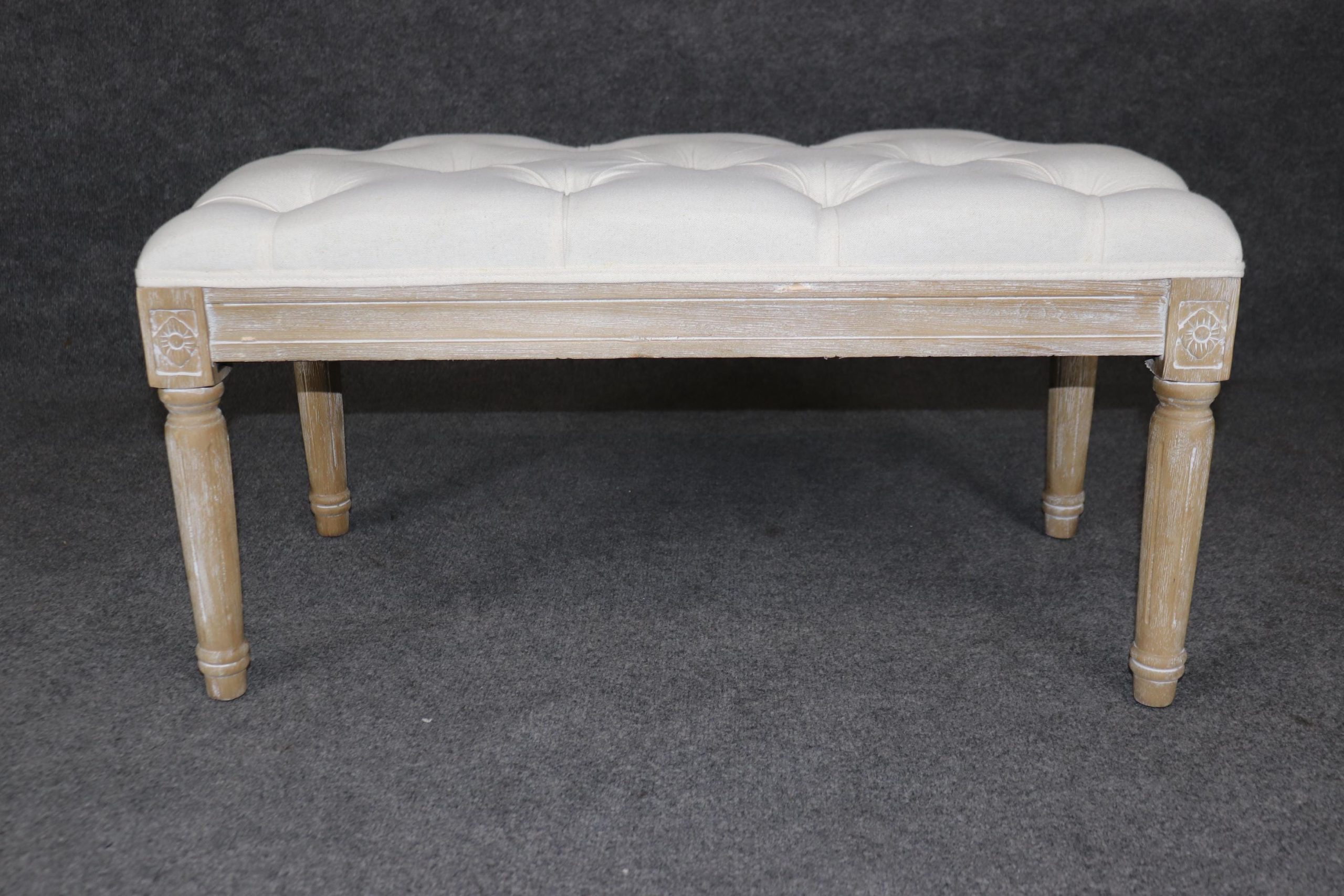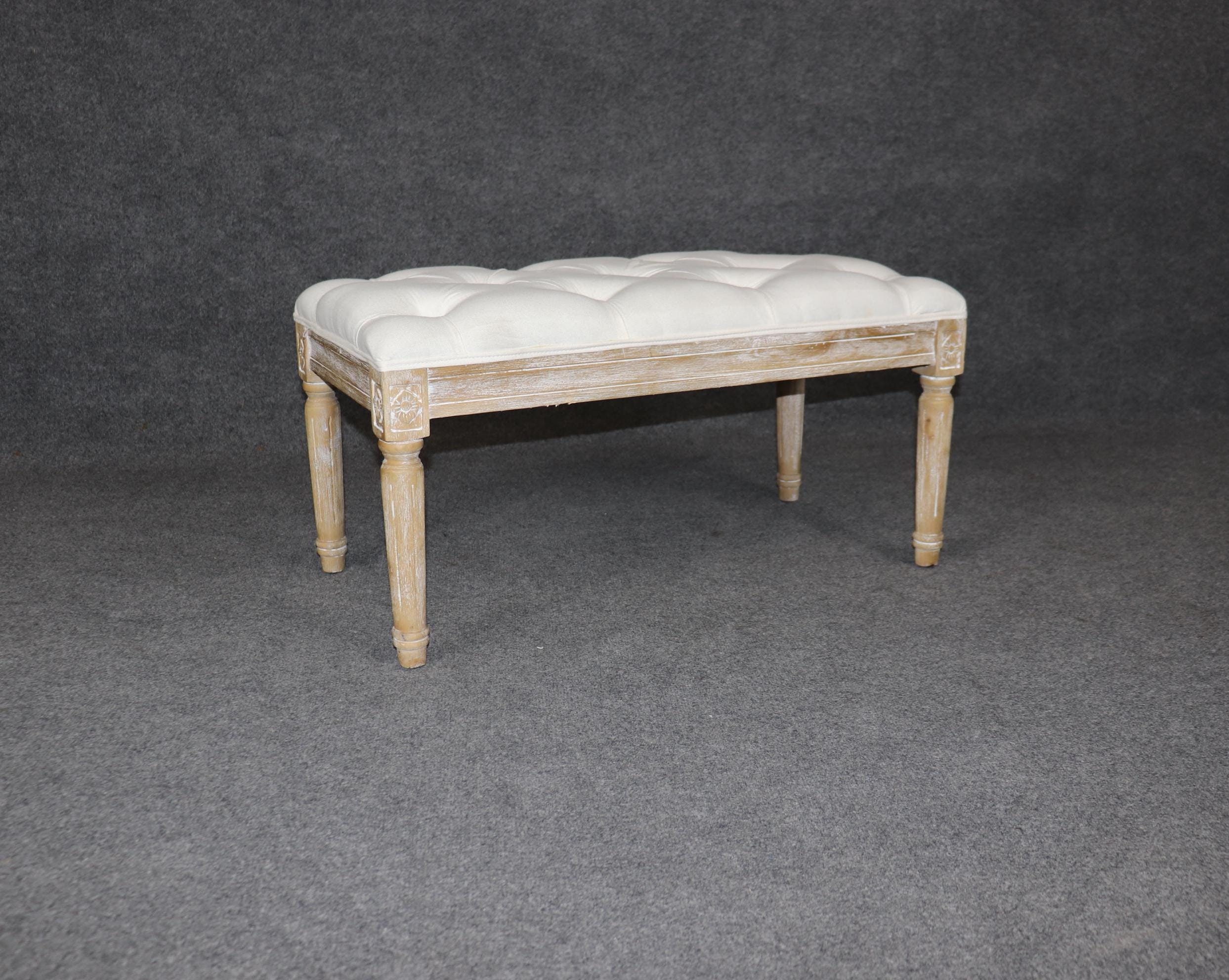 This Louis XVI style upholstered bench is made of the highest quality! If you look at the photos provided, you will see the luxurious tufted upholstery. This piece is perfect for any living room, bedroom, hallway, entryway or office and is bound to bring a refreshing sense of minimalistic luxury and character into your home! Antique furniture and vintage pieces have stood the test of time and this bench is no exception! With its quality materials and great craftsmanship this piece is bound to last you and your family for many years to come. This piece is in good vintage condition with the exception of light surface scratches and some finish loss as to be expected with items of age and use. The upholstery appears to be in good condition but may have some minor wear.
