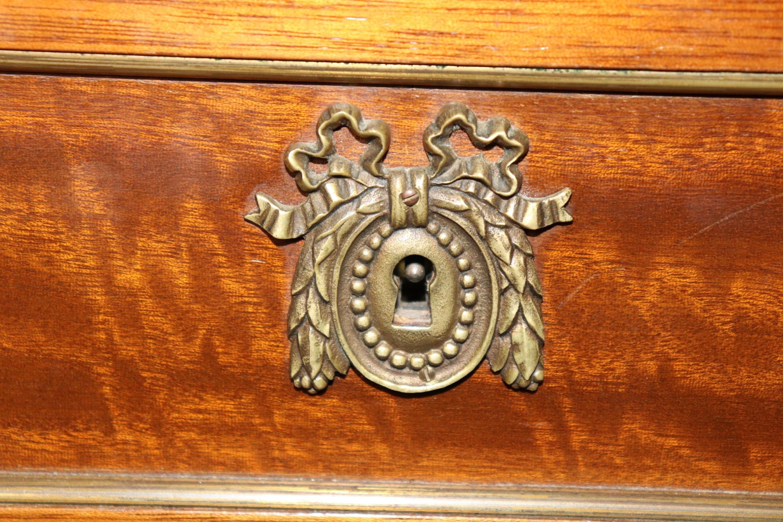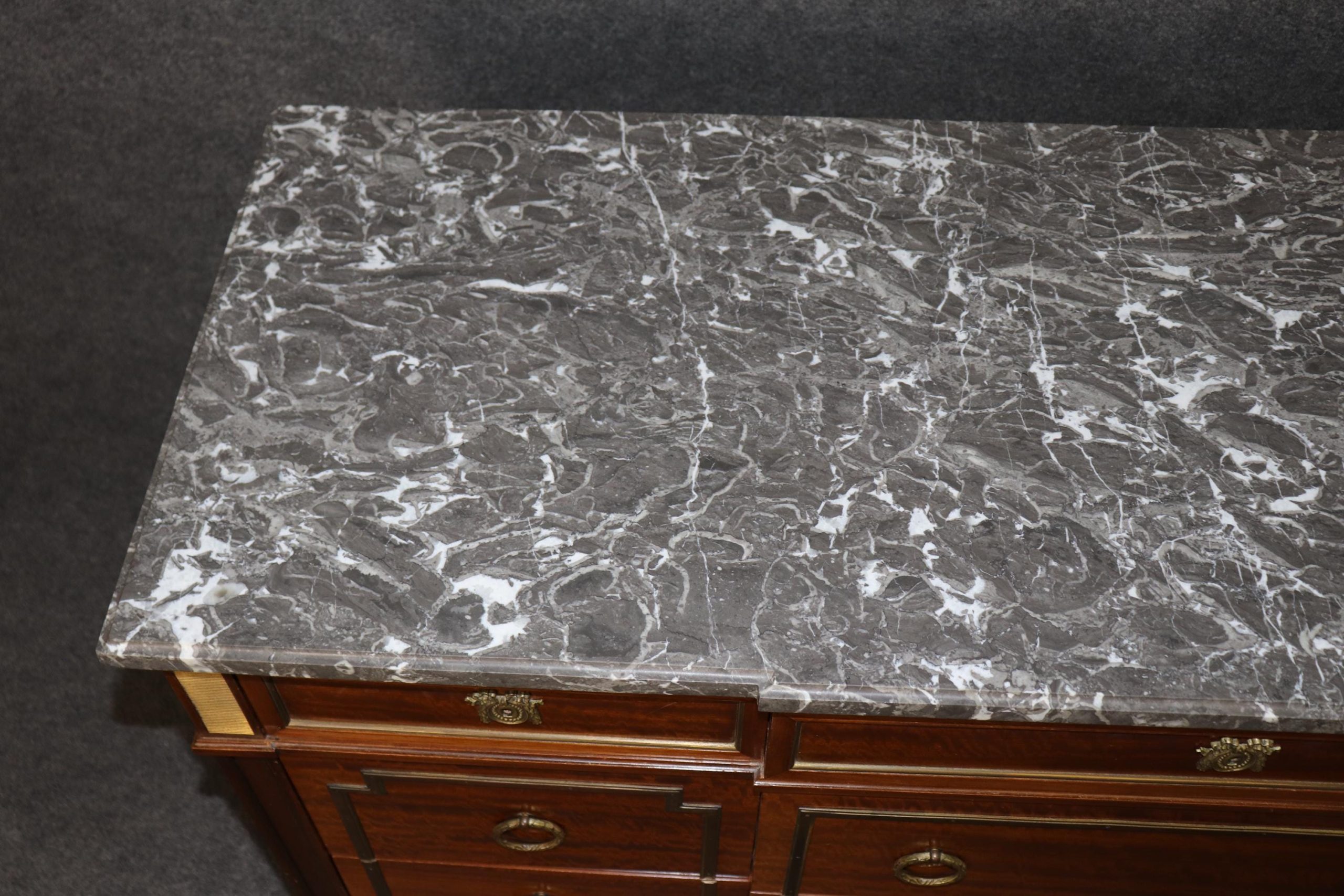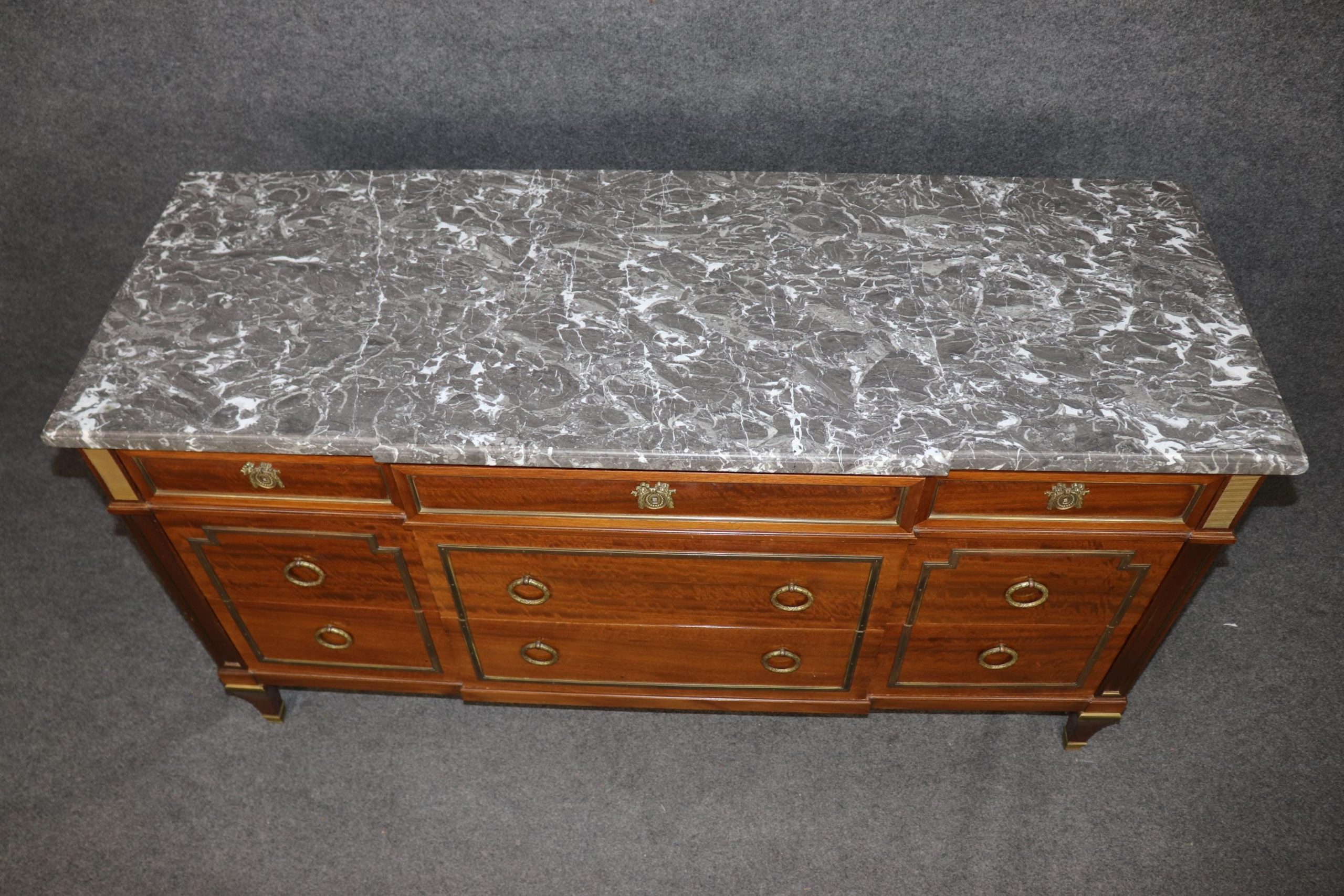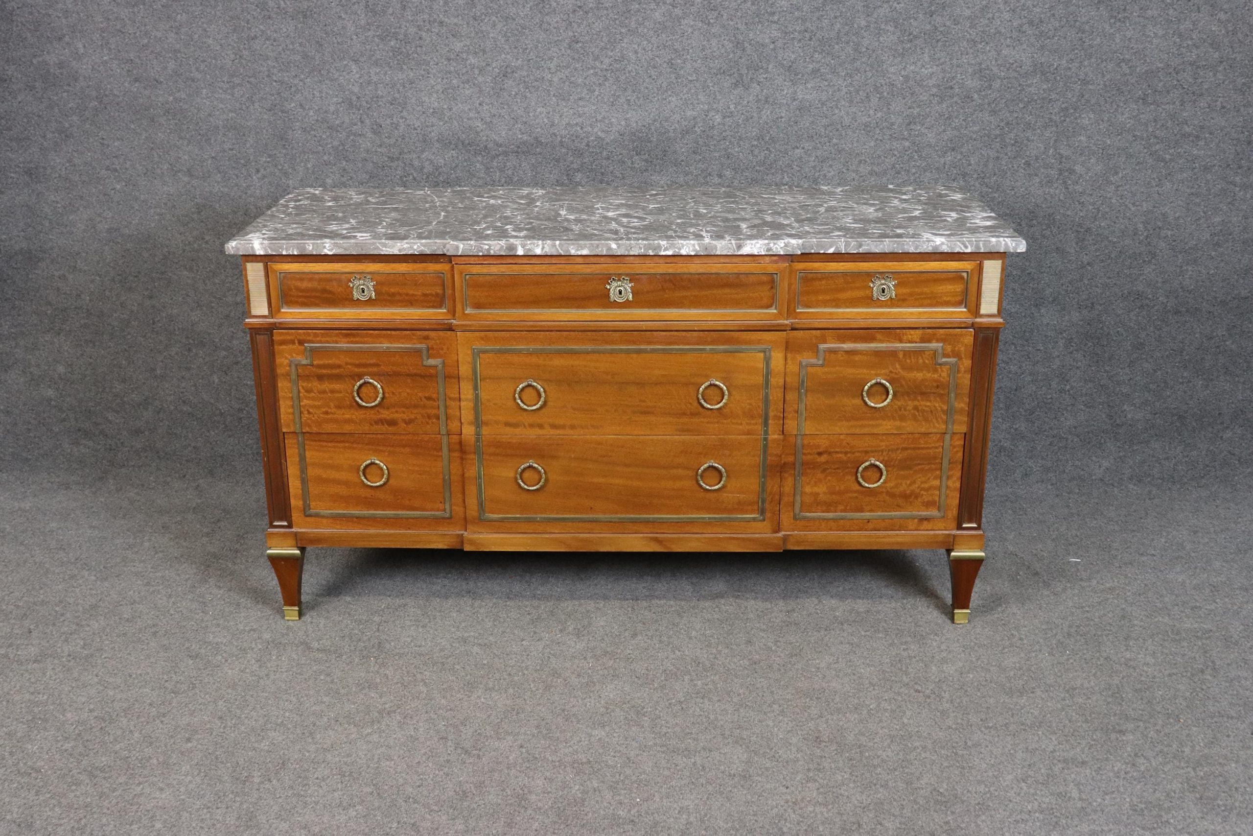This vintage Maison Jansen Louis XVI style marble top commode is made of the highest quality! This piece is perfect for your living room, bedroom, dining room, entryway or office and will certainly bring a sense of sophistication and luxury into your home or place of choosing! This piece will without a doubt be a pinnacle point to wherever you may place it, and will have your guests mesmerized. The dresser has 9 drawers – perfect for storing your personal belongings all while keeping them safe and out of reach! This is not a piece you want…. Its a piece you need… Antique furniture and vintage pieces have stood the test of time and this marble top dresser is no exception! With its quality materials and great craftsmanship this piece is bound to last you and your family for many years to come. The dresser is in good vintage condition with some surface scratches and finish loss, as to be expected.