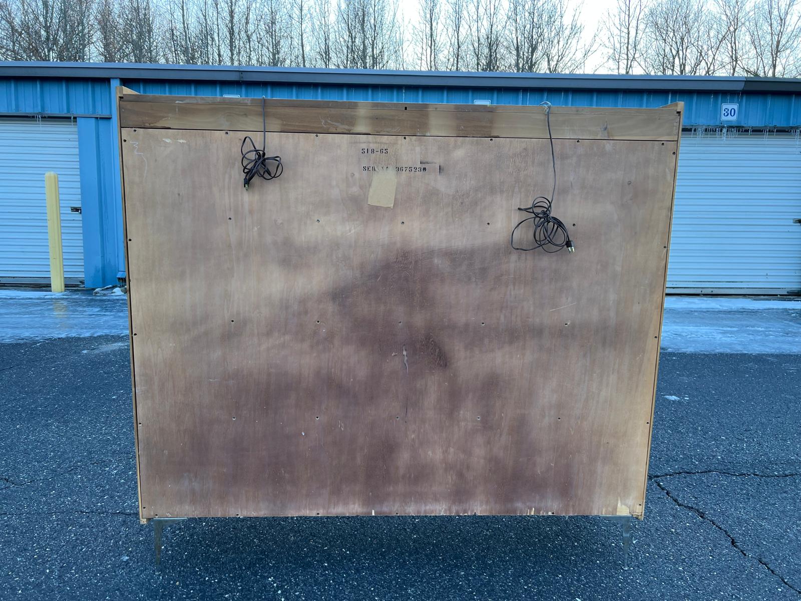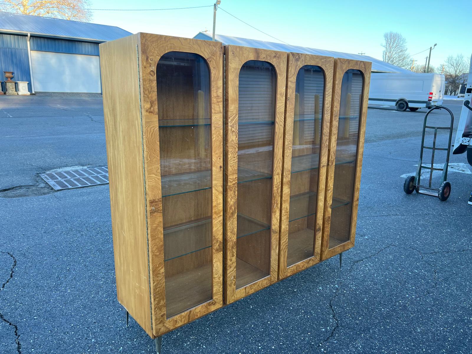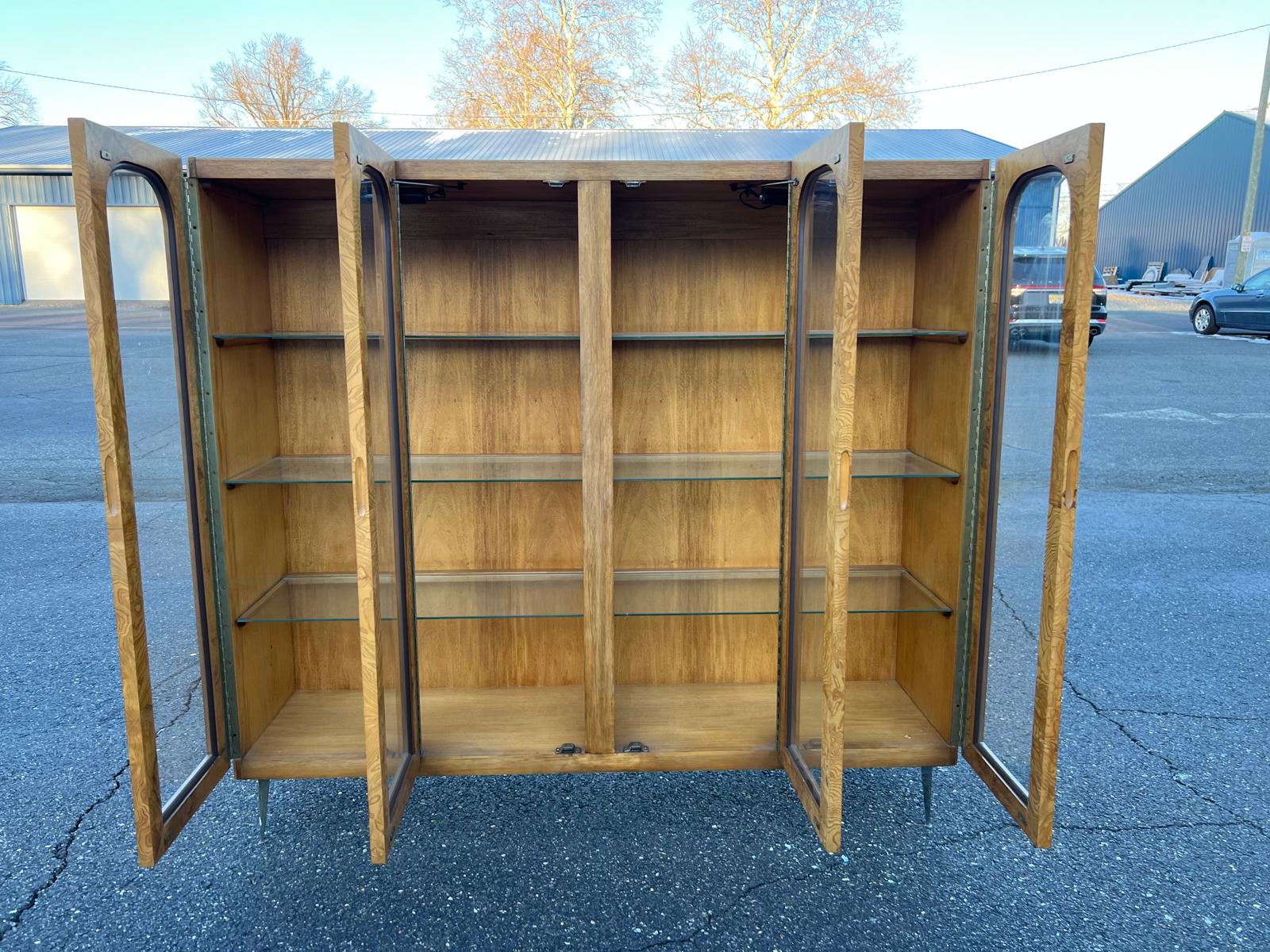 This exceptional vintage display cabinet is a true one-of-a-kind statement piece, crafted in the mid-century modern style circa 1960. The cabinet features a beautifully figured burlwood veneer with rich, organic grain patterns that give it warmth and visual depth. Its most distinctive design element is the series of four tall arched glass doors, creating an architectural, almost gallery-like presence that elevates the piece beyond standard storage. Inside there are eight glass removable shelves that offer ample space for displaying art objects, books, ceramics, or curated collections and two lights that light up each side. Raised on slender metal legs, the cabinet maintains a clean, modern profile despite its substantial scale. Both sculptural and highly functional. It is in very good vintage condition. The size is 64” W X 17”D X 59”H. 14.5” Shelf Depth X 30.5” Shelf Length X 12” Shelf Height.