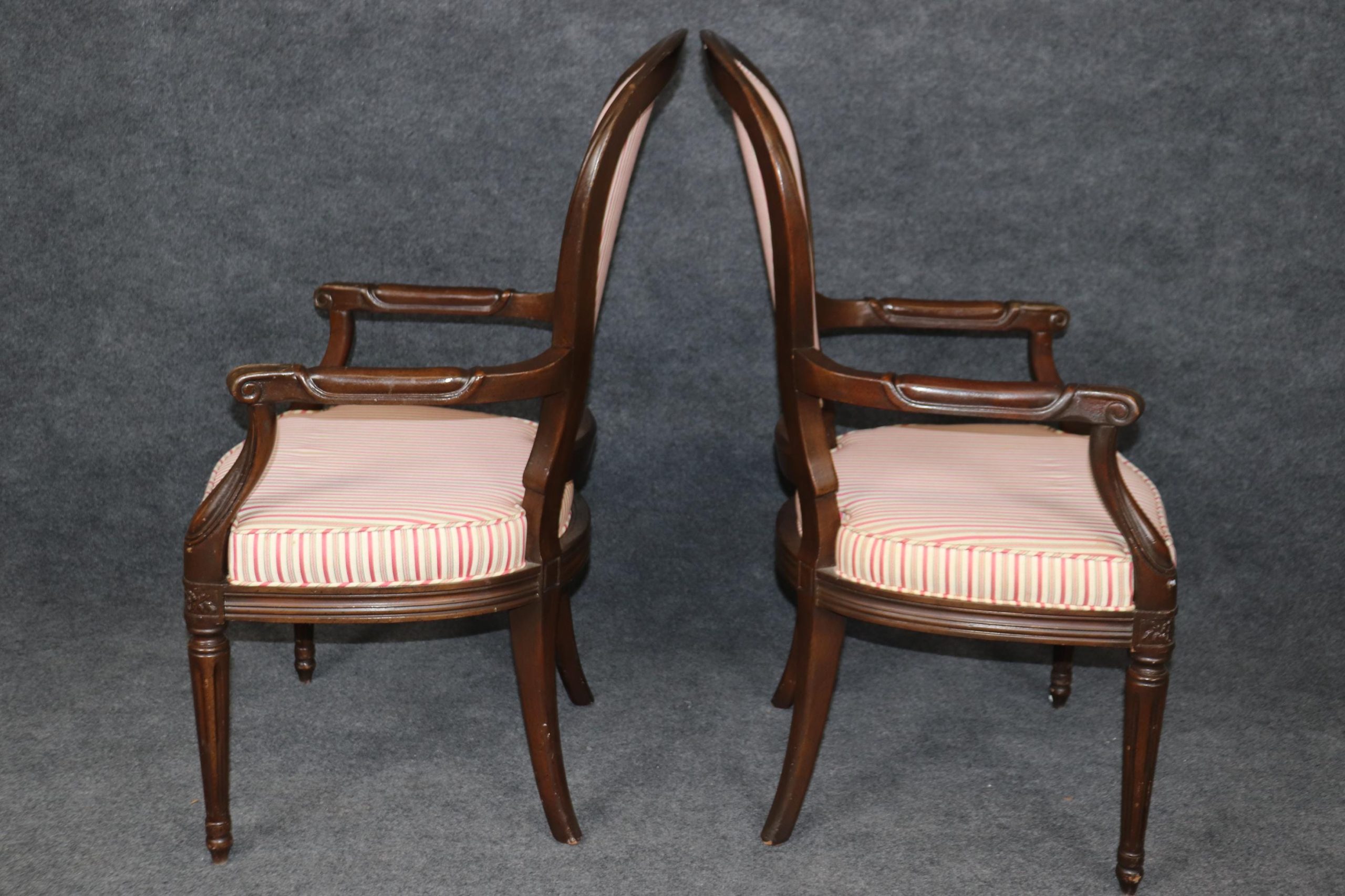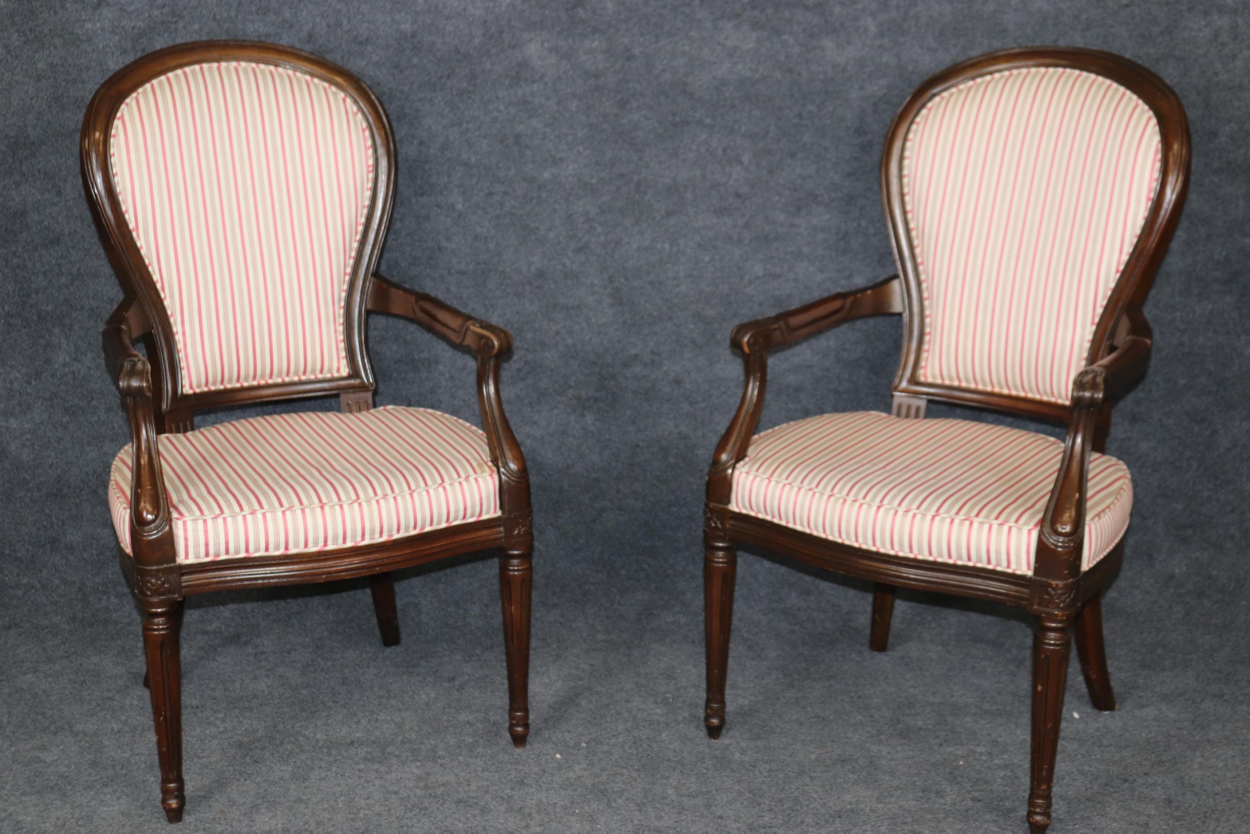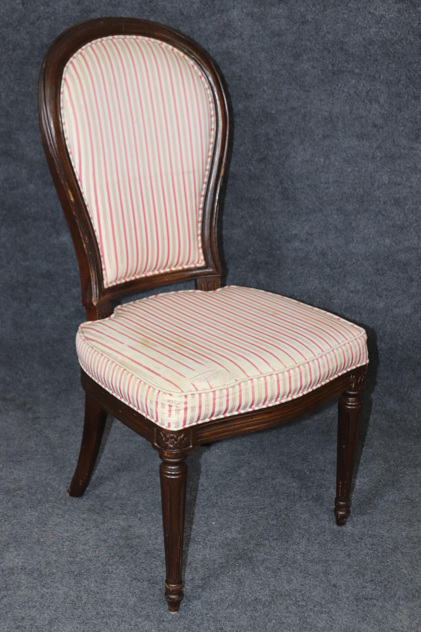 This vintage Mid Century set of 8 Louis XVI style dining room chairs is of the highest quality! These chairs are perfect for you and your home and will bring a sense of luxury and sophistication into your dining room, office or place of choosing! These chairs can be used as dining room chairs, as kitchen chairs or conference room chairs as there are 2 armchairs and 6 side chairs. If you look closely at the photos provided you will see the attention to detail within the hand carved frames. Antique furniture and vintage pieces have stood the test of time and this set of chairs is no exception! With their quality materials and great craftsmanship this set is bound to last you and your family for many years to come. The chairs are in good vintage condition with light surface scratches and minor finish loss as to be expected of a set from the 1960’s. There is some staining and wear to the upholstery, and the chairs may need to be reupholstered.