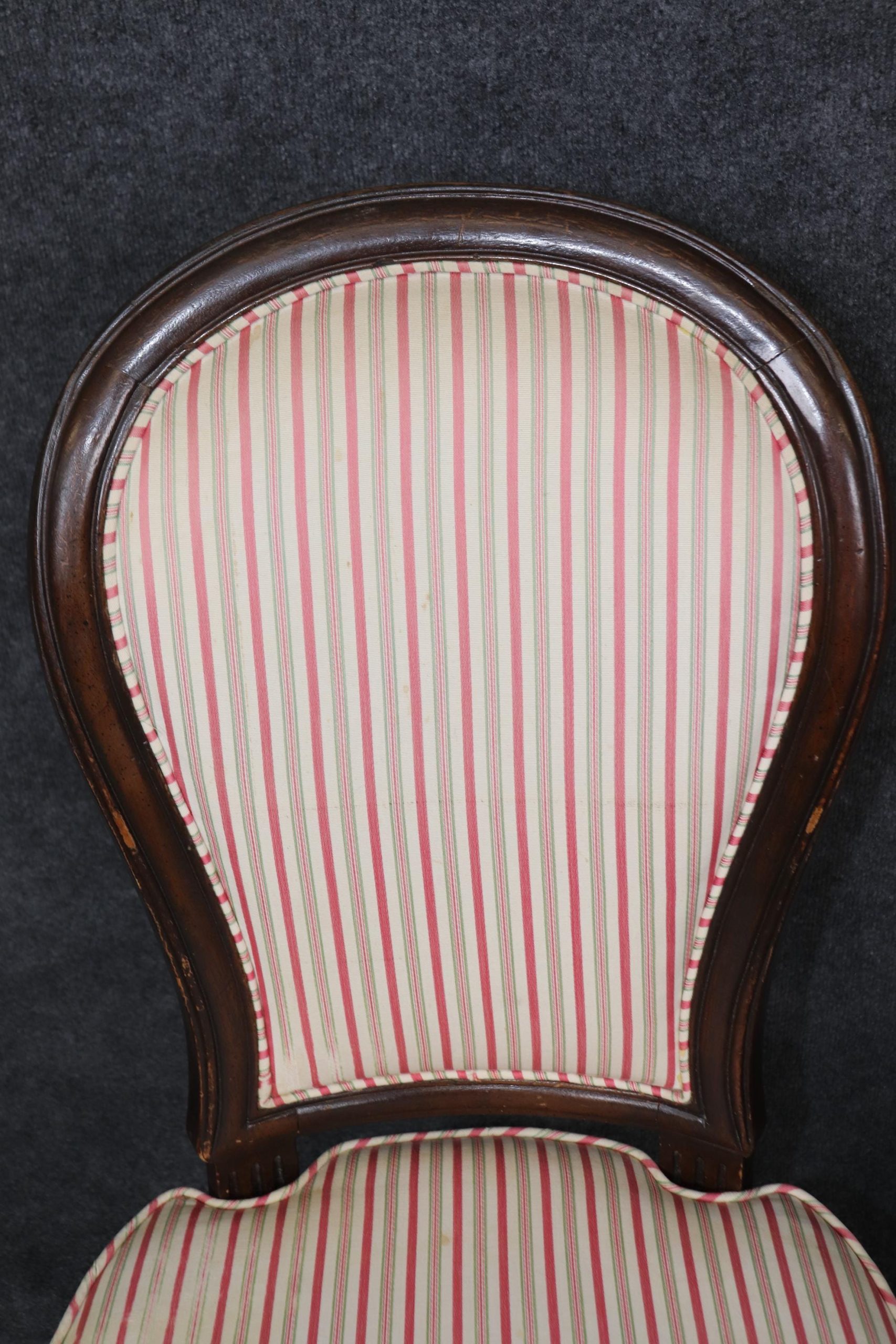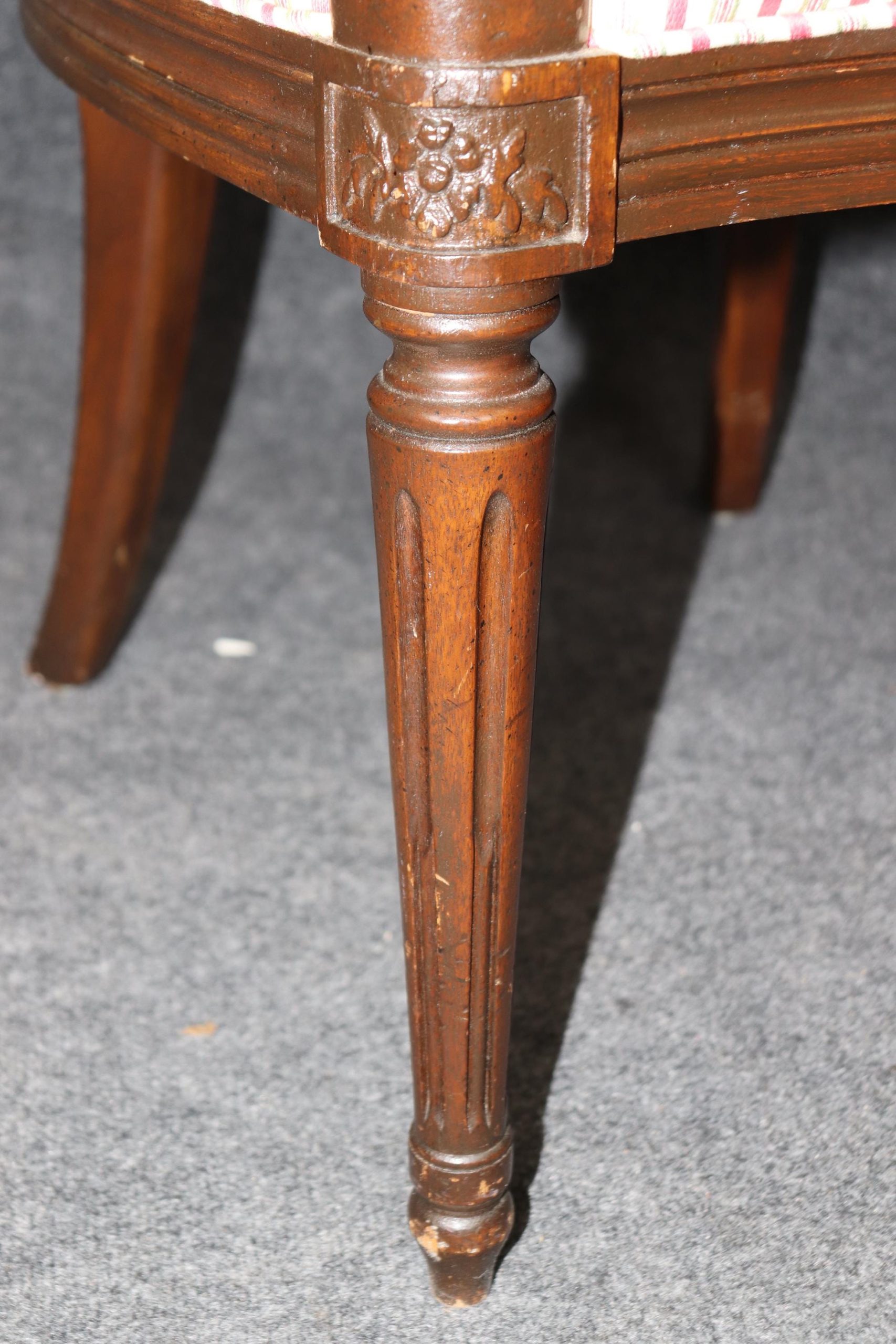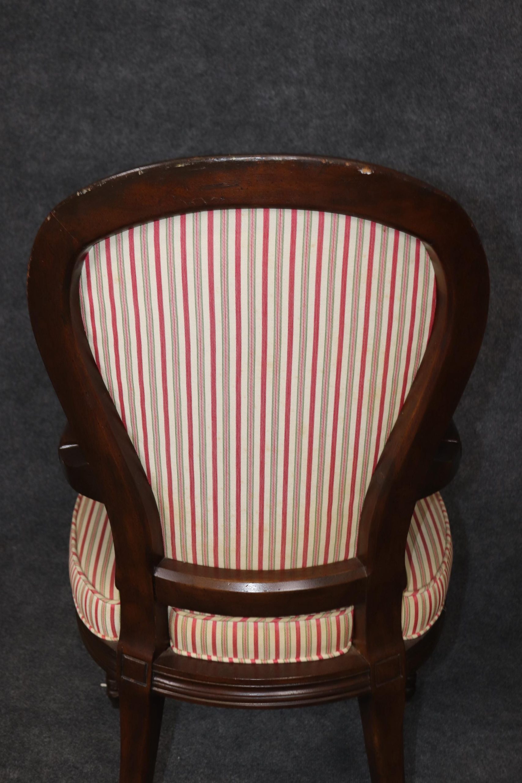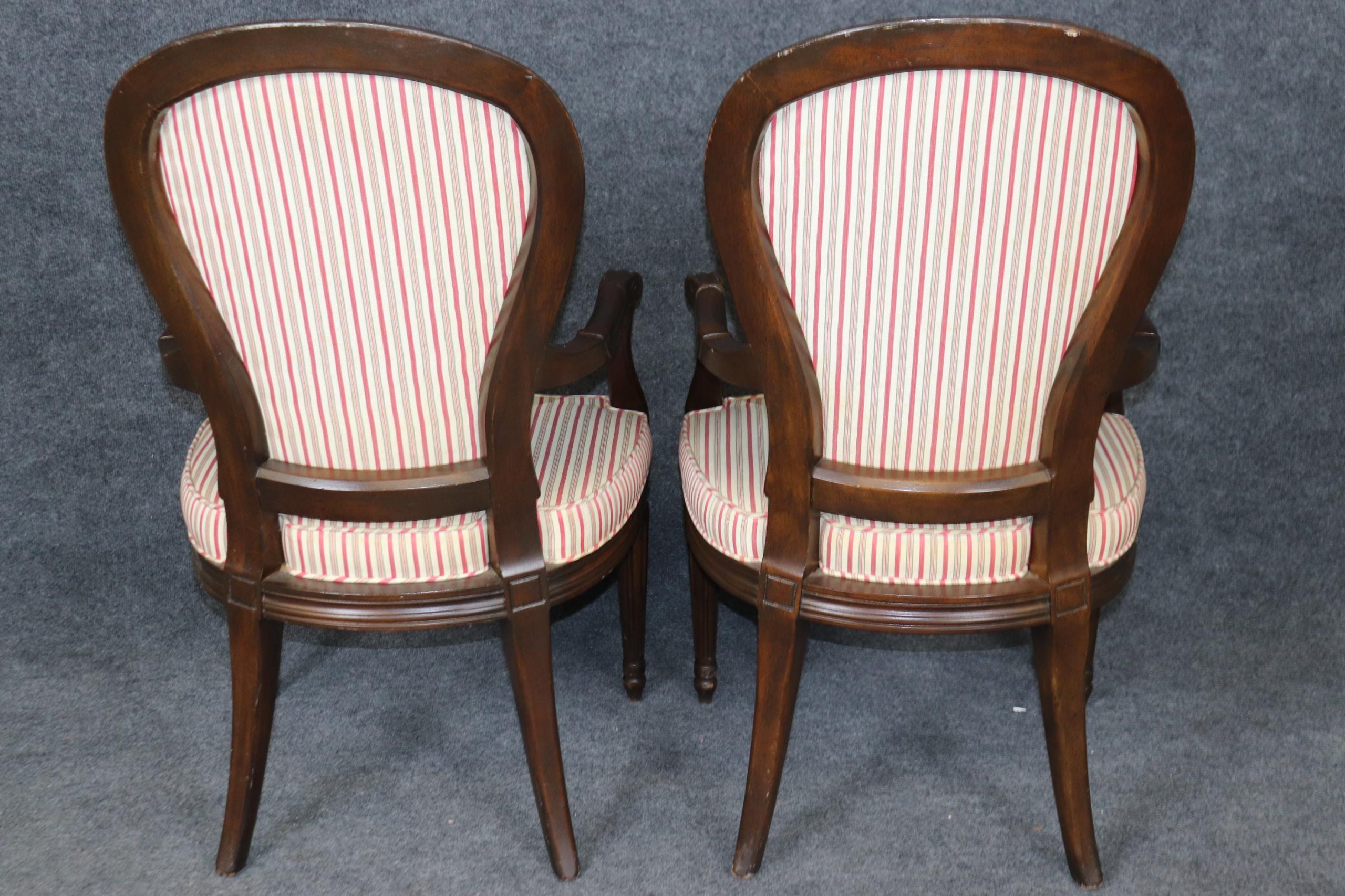 This vintage Mid Century set of 8 Louis XVI style dining room chairs is of the highest quality! These chairs are perfect for you and your home and will bring a sense of luxury and sophistication into your dining room, office or place of choosing! These chairs can be used as dining room chairs, as kitchen chairs or conference room chairs as there are 2 armchairs and 6 side chairs. If you look closely at the photos provided you will see the attention to detail within the hand carved frames. Antique furniture and vintage pieces have stood the test of time and this set of chairs is no exception! With their quality materials and great craftsmanship this set is bound to last you and your family for many years to come. The chairs are in good vintage condition with light surface scratches and minor finish loss as to be expected of a set from the 1960’s. There is some staining and wear to the upholstery, and the chairs may need to be reupholstered.