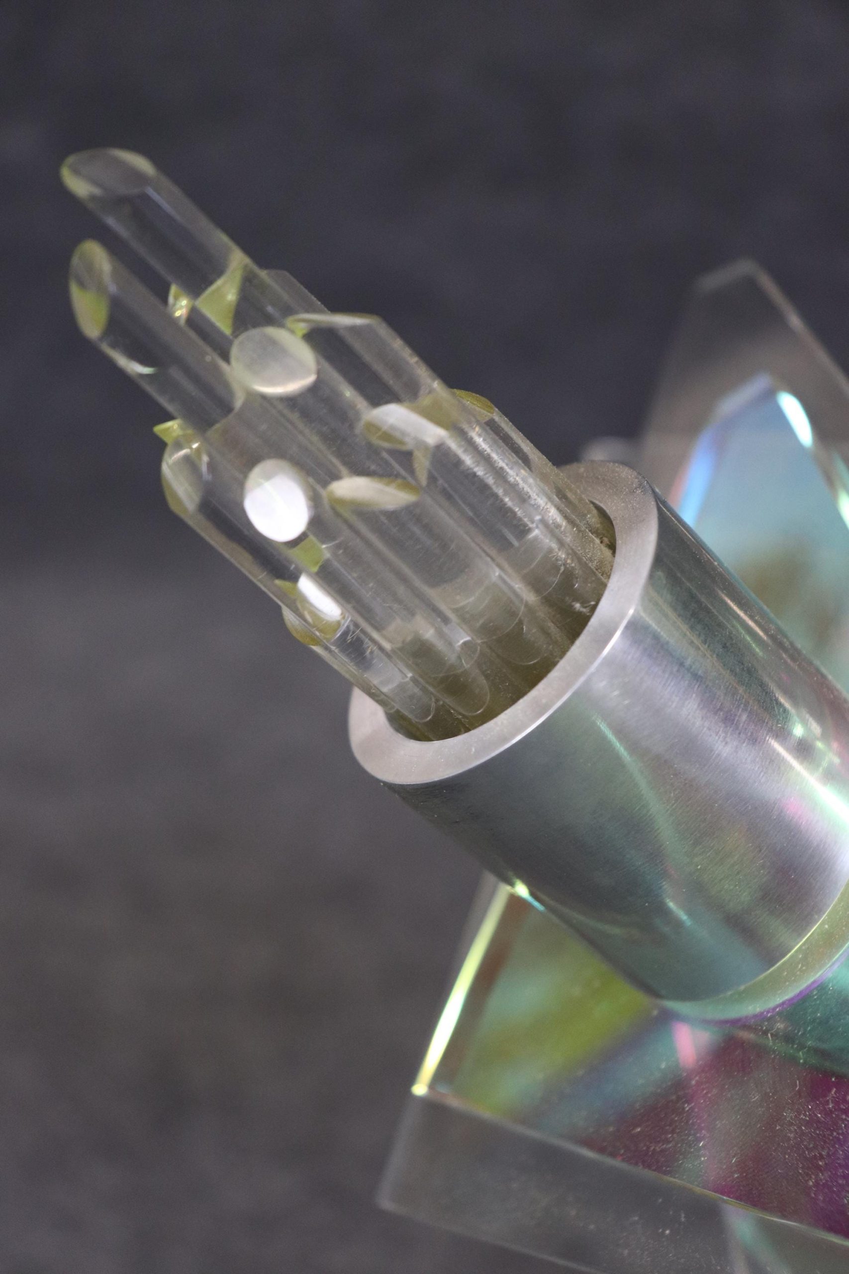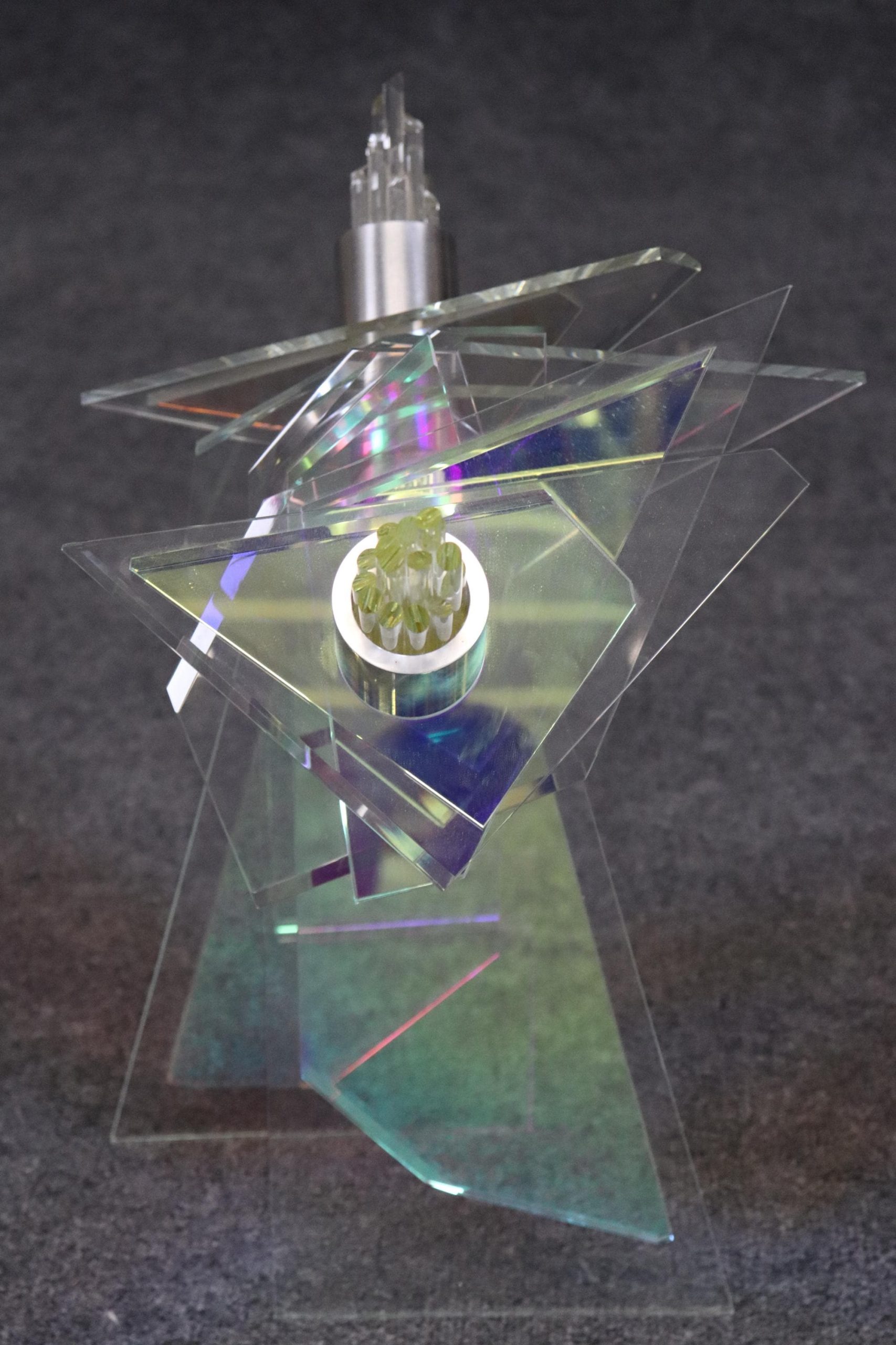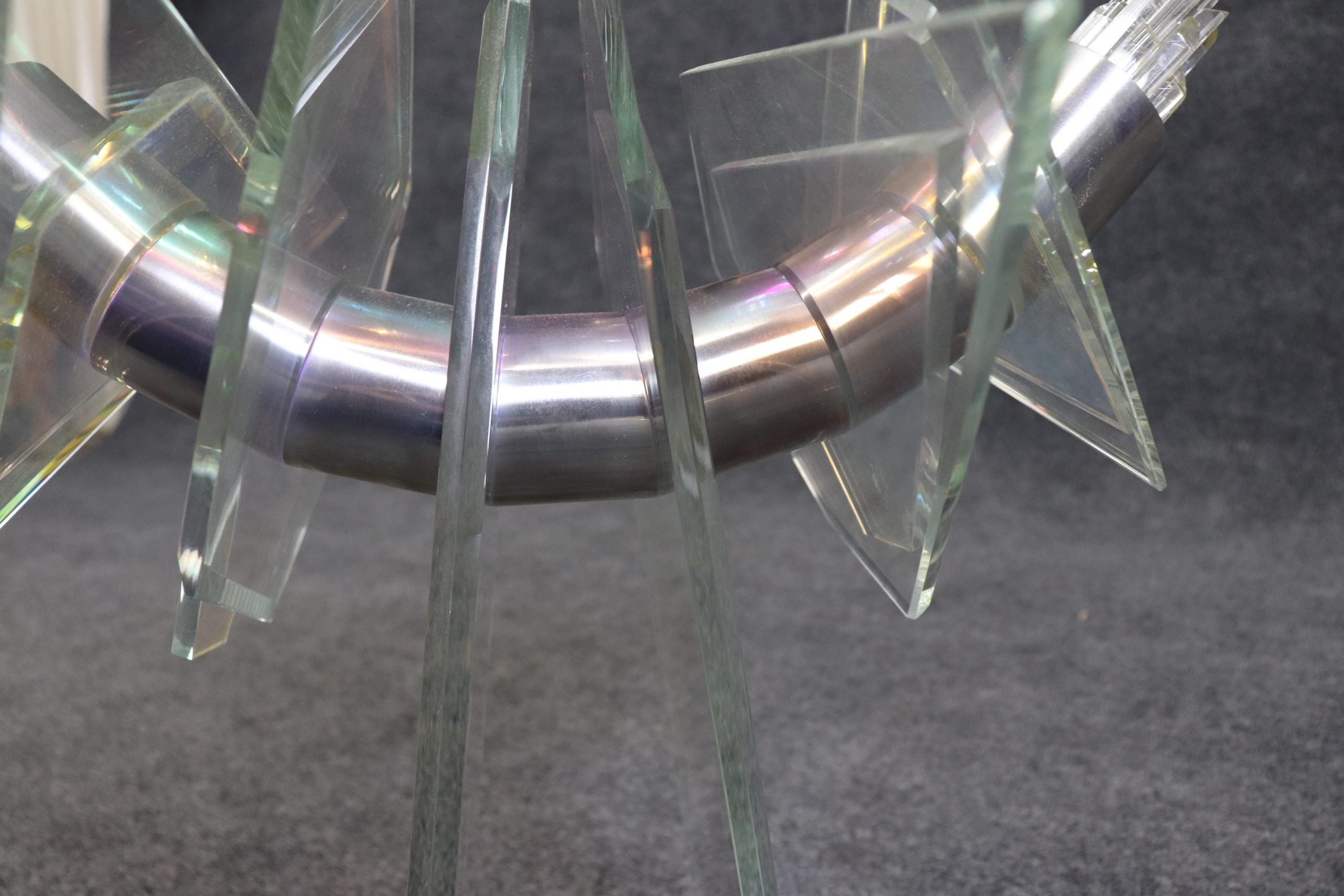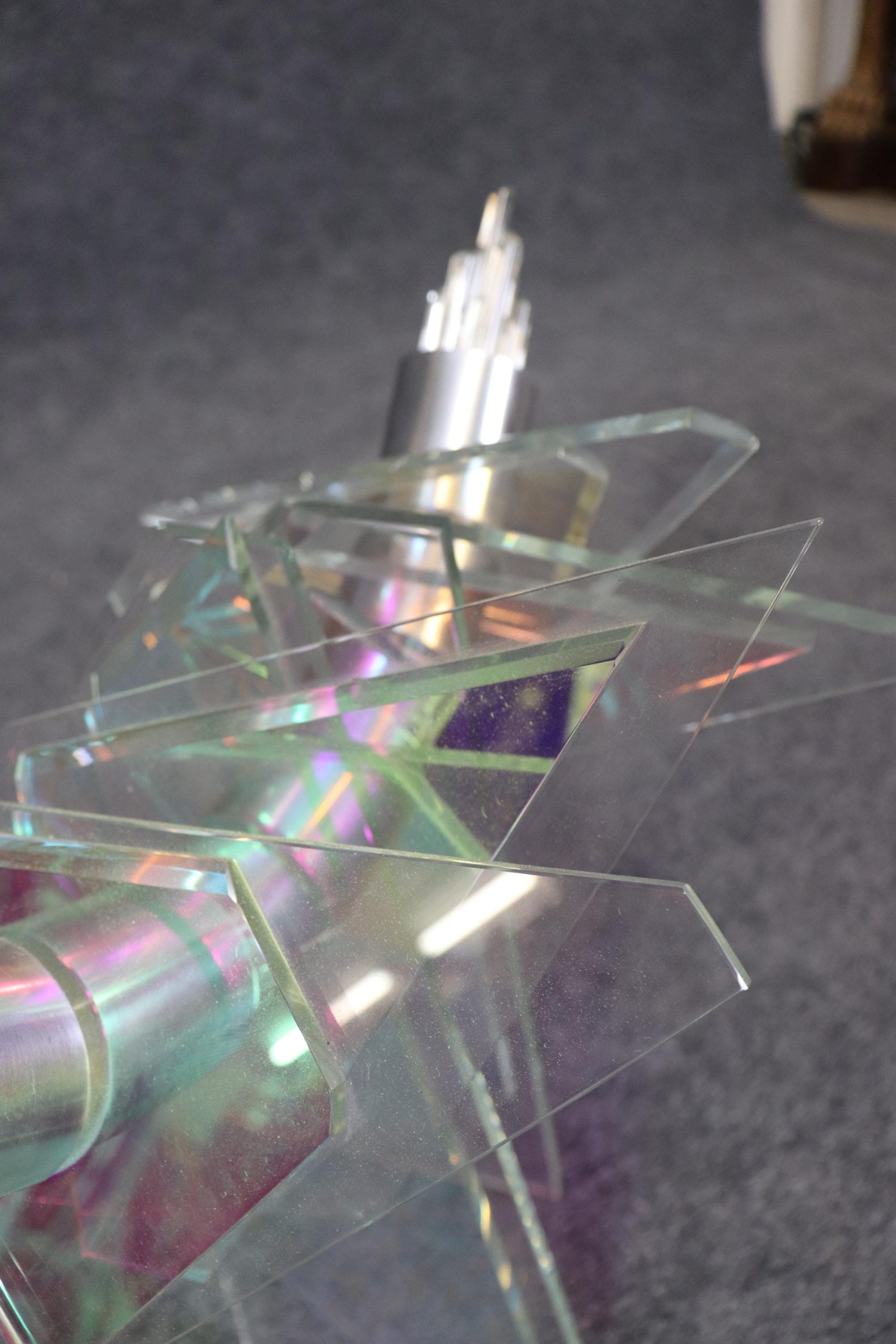This vintage unique Mid Century Modern free form sculpture made of art glass, lucite and metal is perfect for you and your home! If you look at the photos provided, you can see the piece puts out a pearlescent effect. This will be a conversation starter in any MCM home or office and is bound to bring a sense of character and luxury into your place of choosing! This piece is perfect for your living room, office, entryway or any place of your choosing! The sculpture is in good condition with minor scuffs as to be expected with a vintage item.