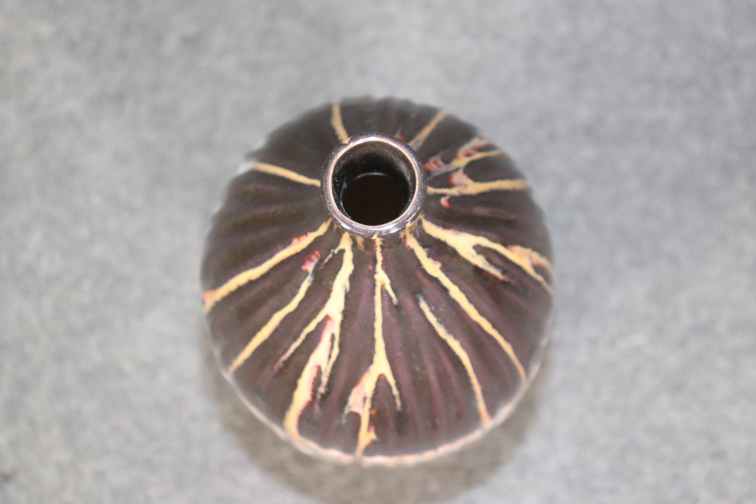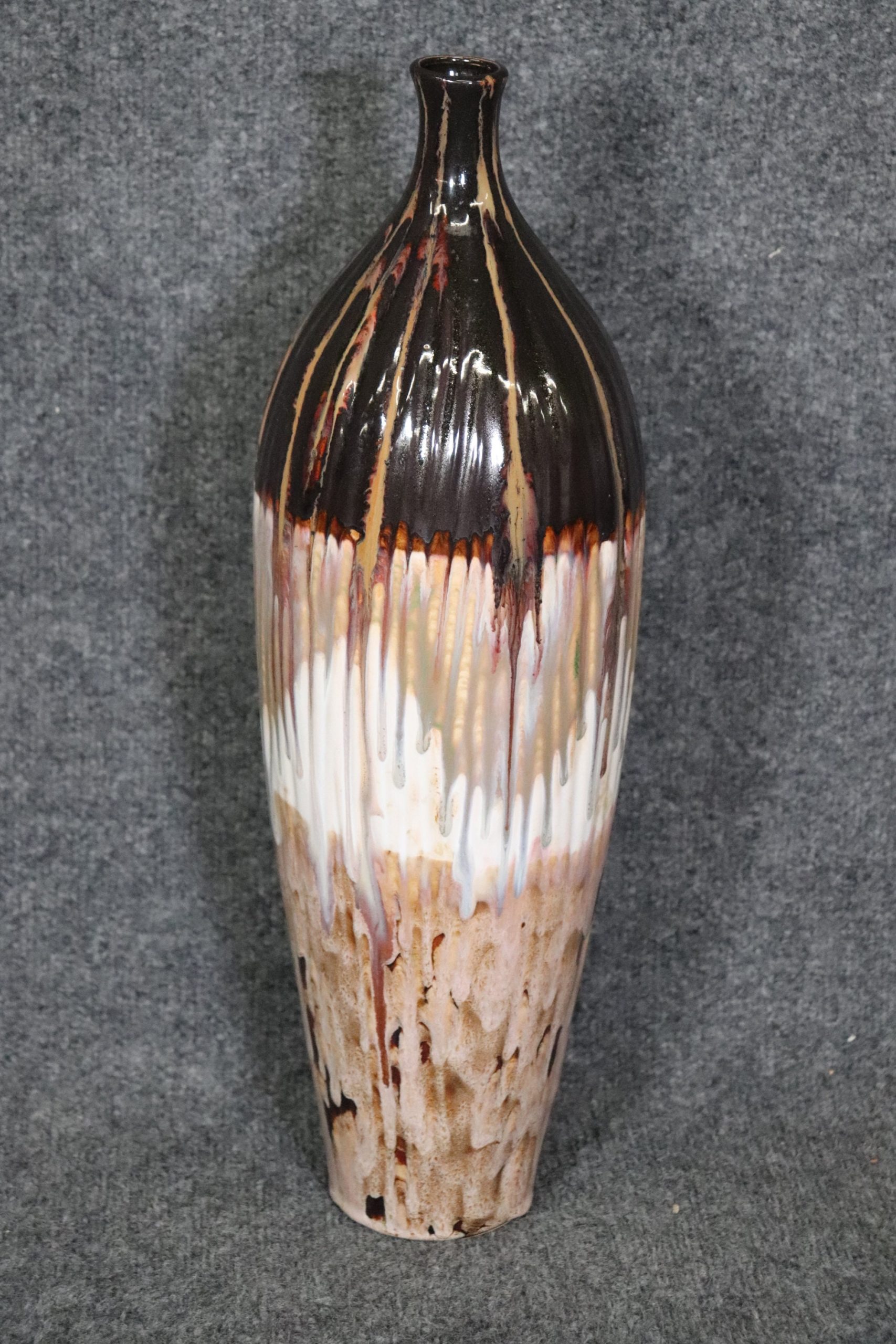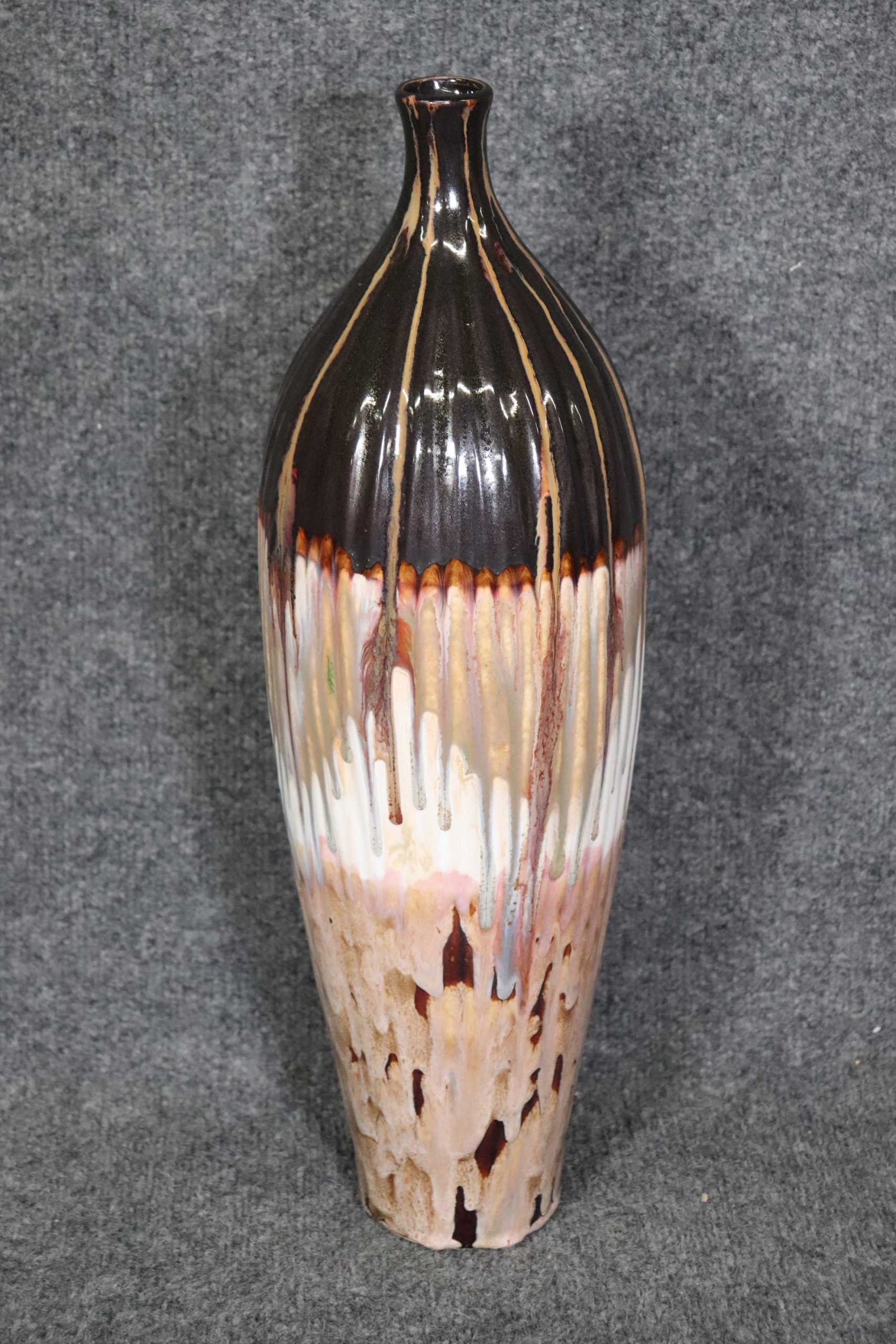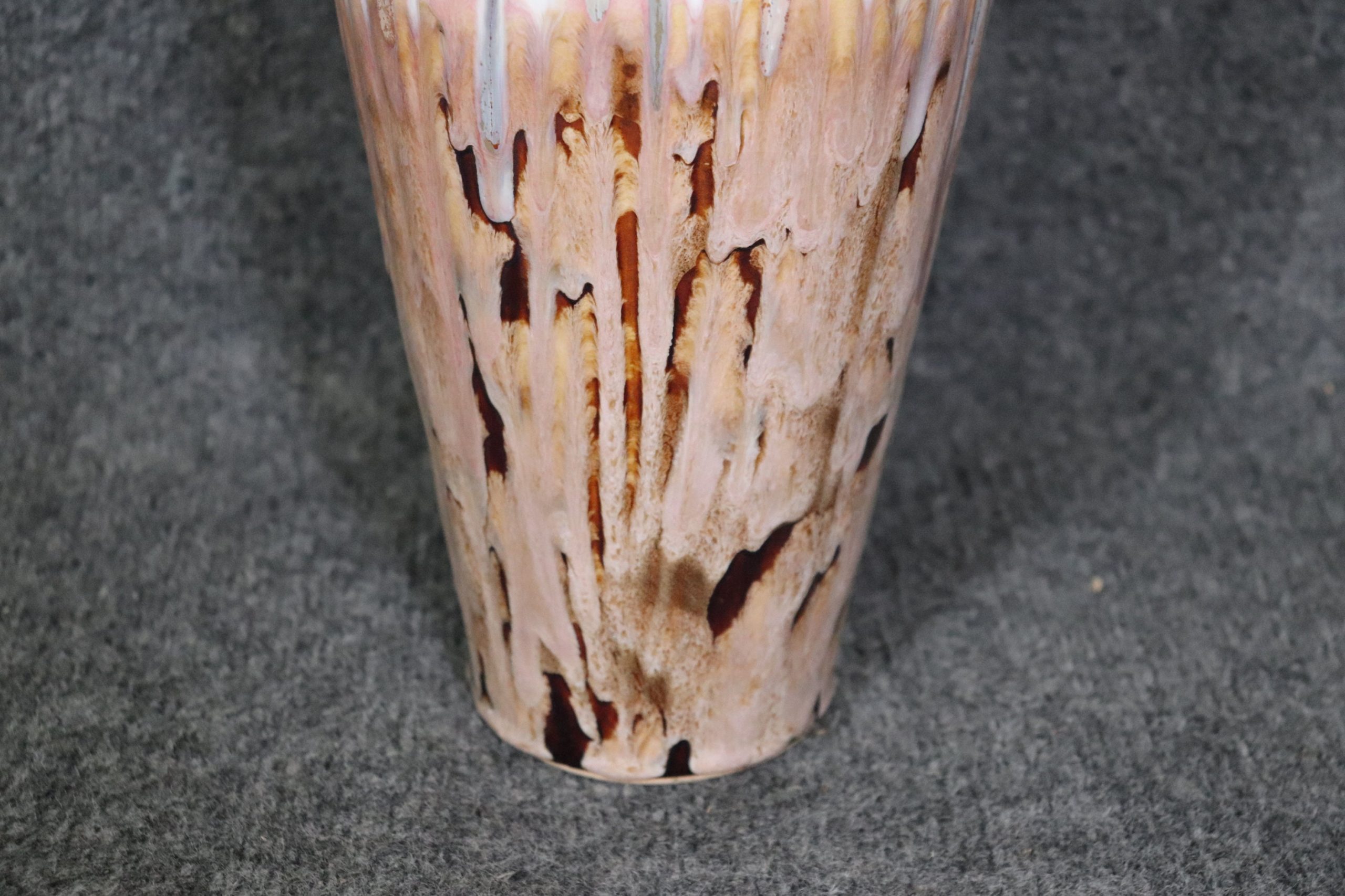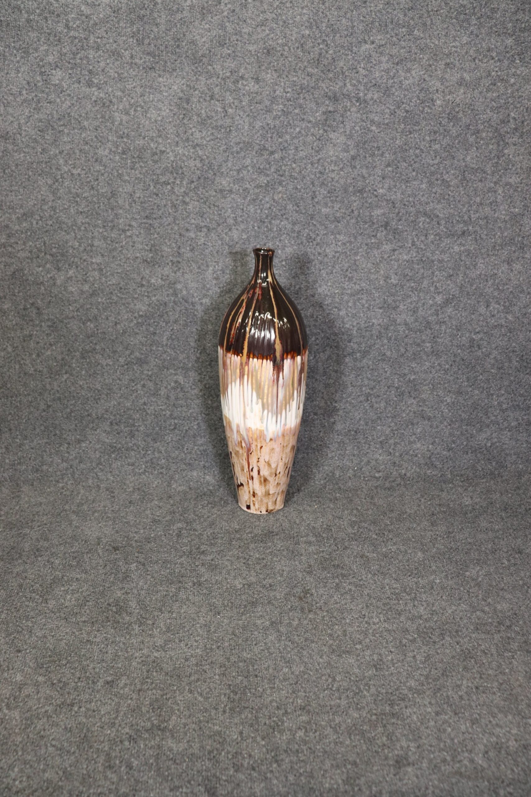 This Vintage Mid Century Modern pottery art vase is made of the highest quality. If you look at the photos provided, you will see the flowing design in mid century colors. This vase will certainly bring a sense of class to any entryway, living room, office or place of your choosing and is bound to have your guests mesmerized by its attention to detail and quality. This vase can be used with a variety of other styles you may already have in your home due to its neutral colors and simplistic design. The vase is in good vintage condition with minor light surface scratches as well as some minor air bubbles in the vase but otherwise good condition.