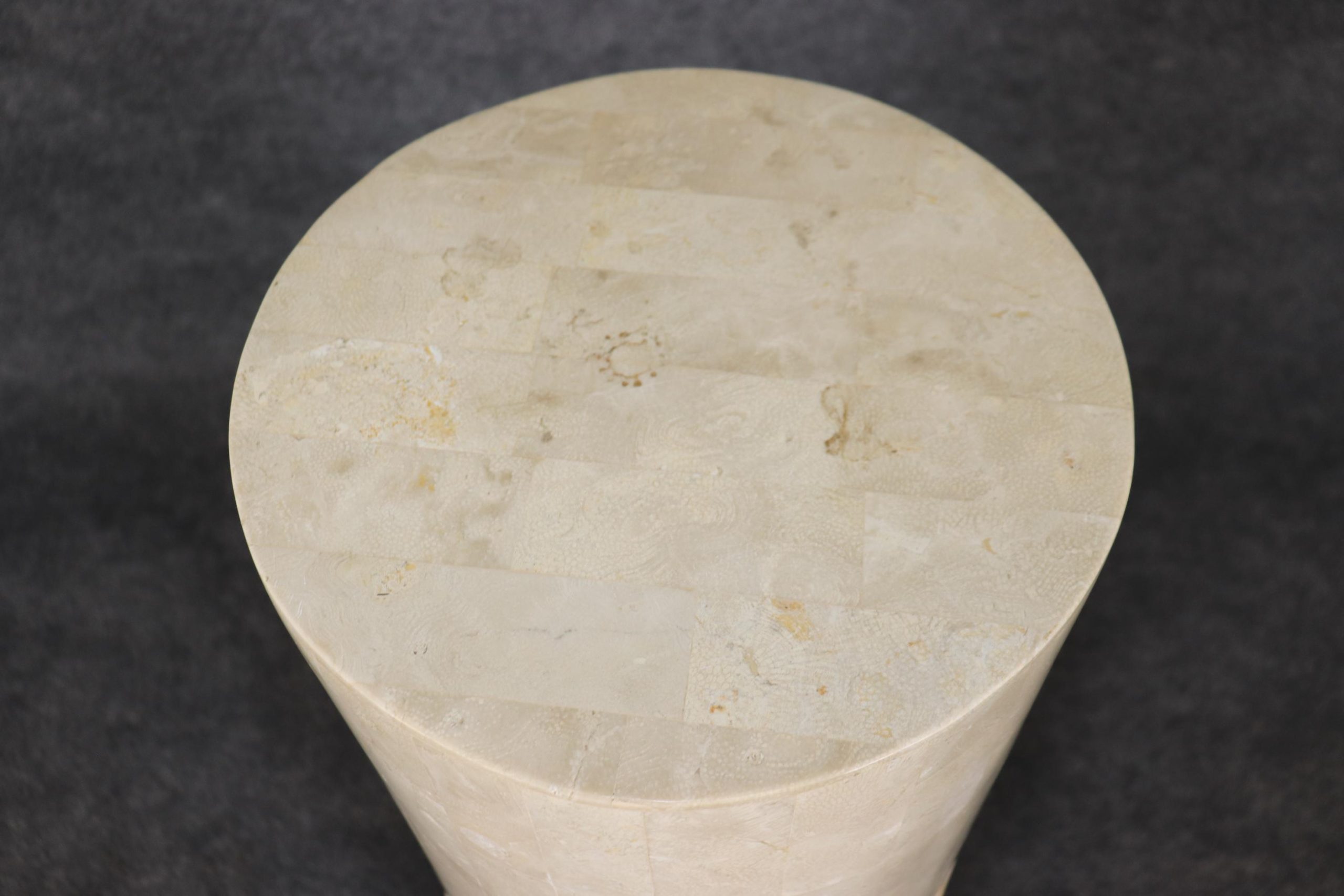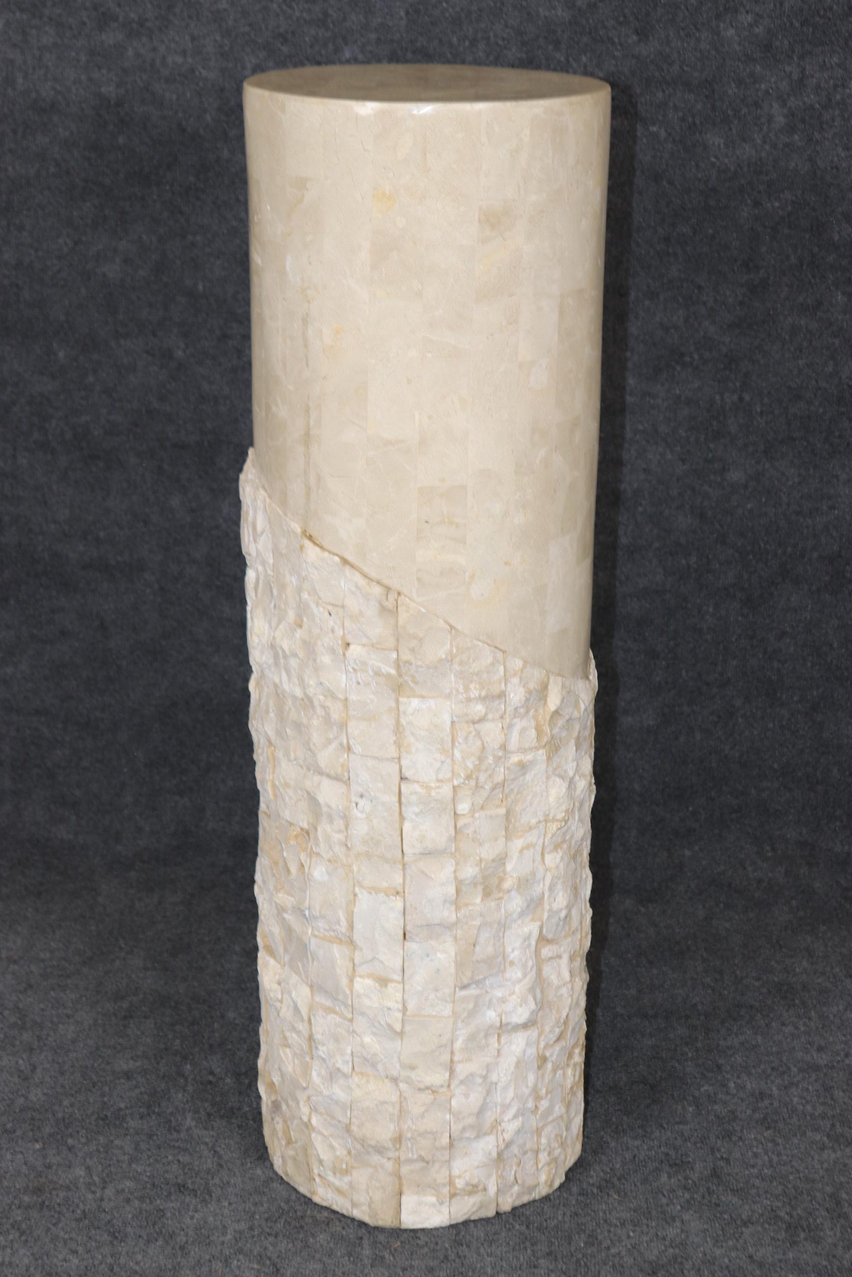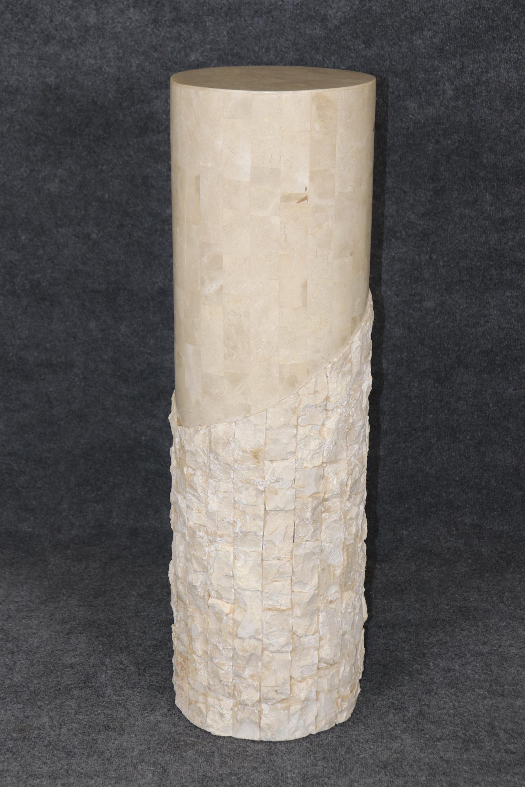 This Mid Century Modern tesselated travertine pedestal is a great example of MCM decor! This piece is bound to bring a sense of minimalistic luxury and modernism into your home or place of choosing and is perfect for any living room, bedroom, bathroom or office! This piece will have your guests mesmerized by its design and will have them asking if it is made by a famed artist/sculptor! Antique furniture and vintage pieces have stood the test of time and this pedestal is no exception! With its quality materials and great craftsmanship this piece is bound to last you and your family for many years to come. This piece is in good vintage condition with the exception of some light surface scratches, as to be expected but otherwise good condition.