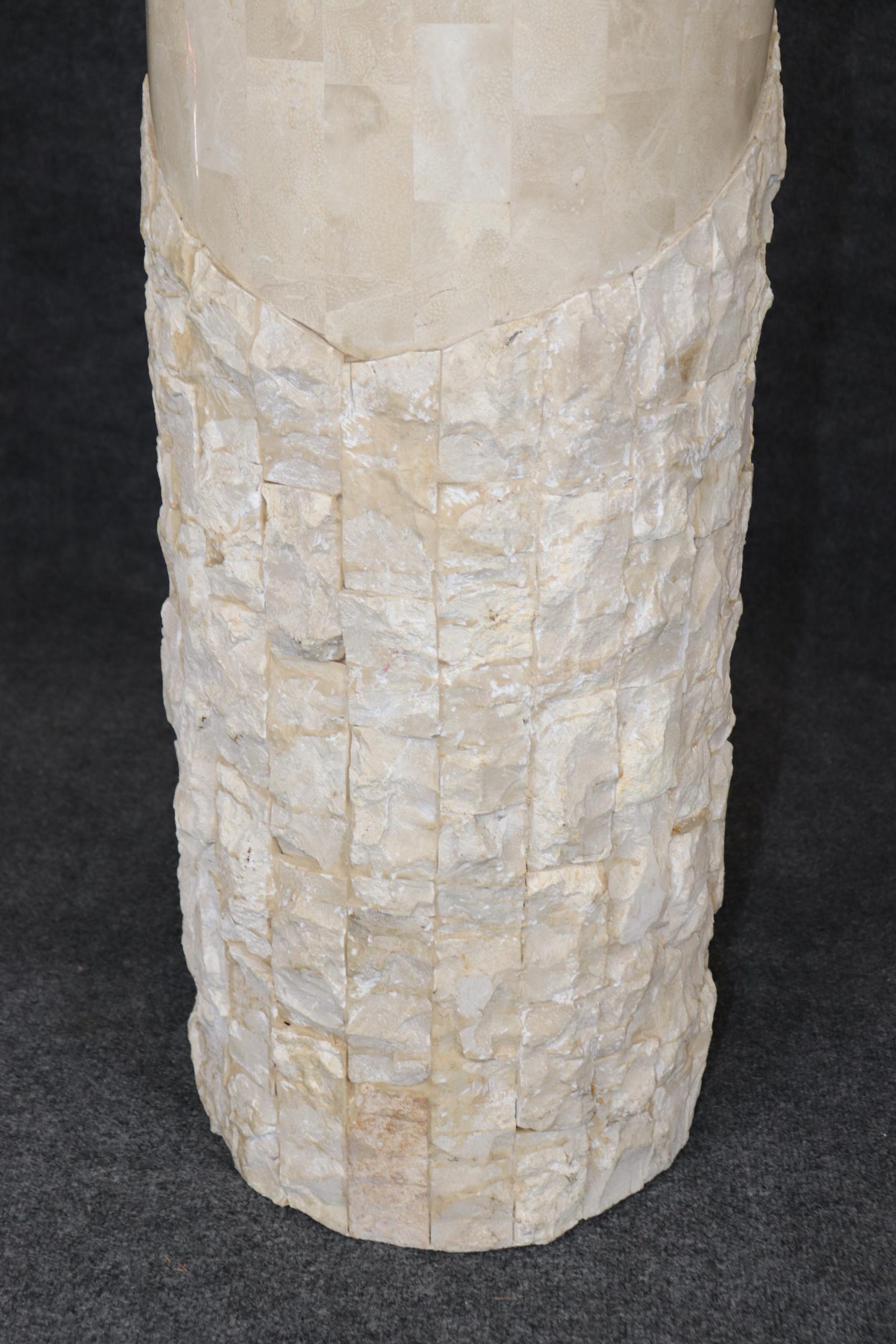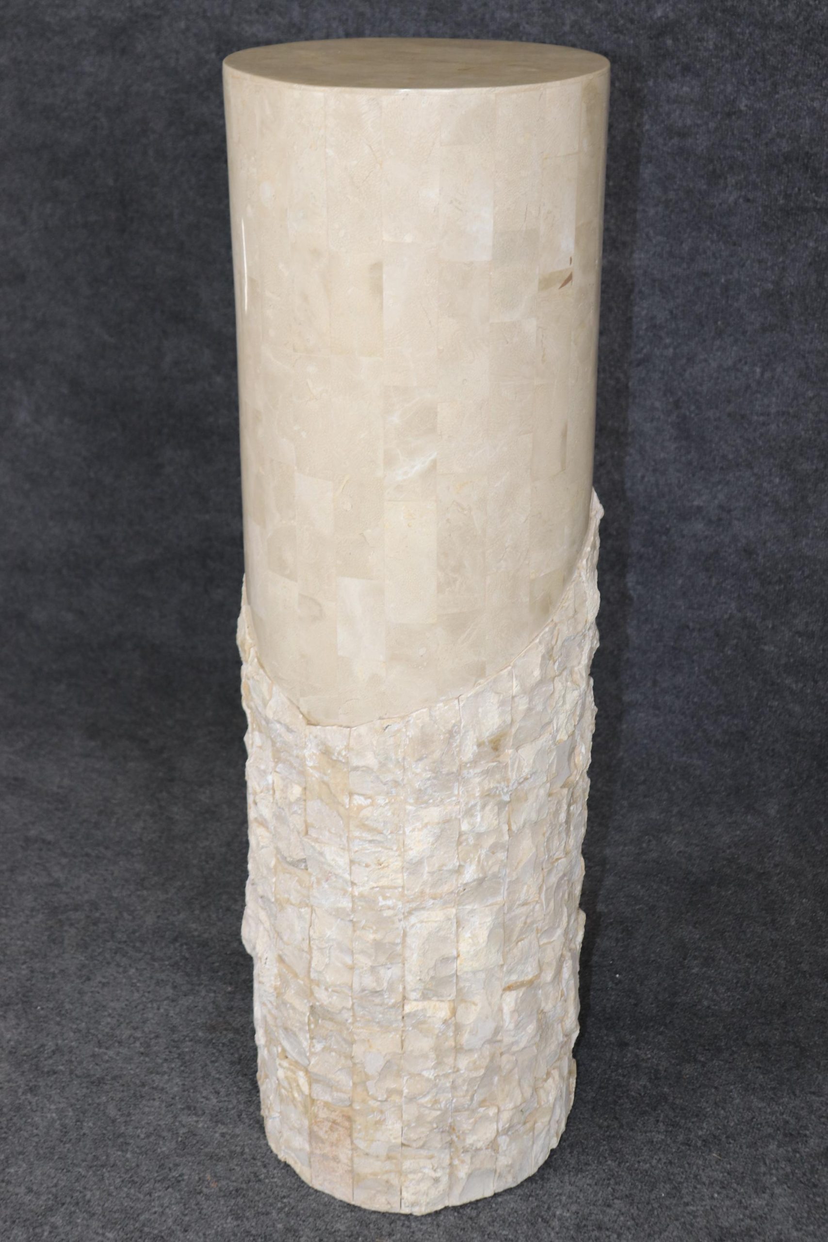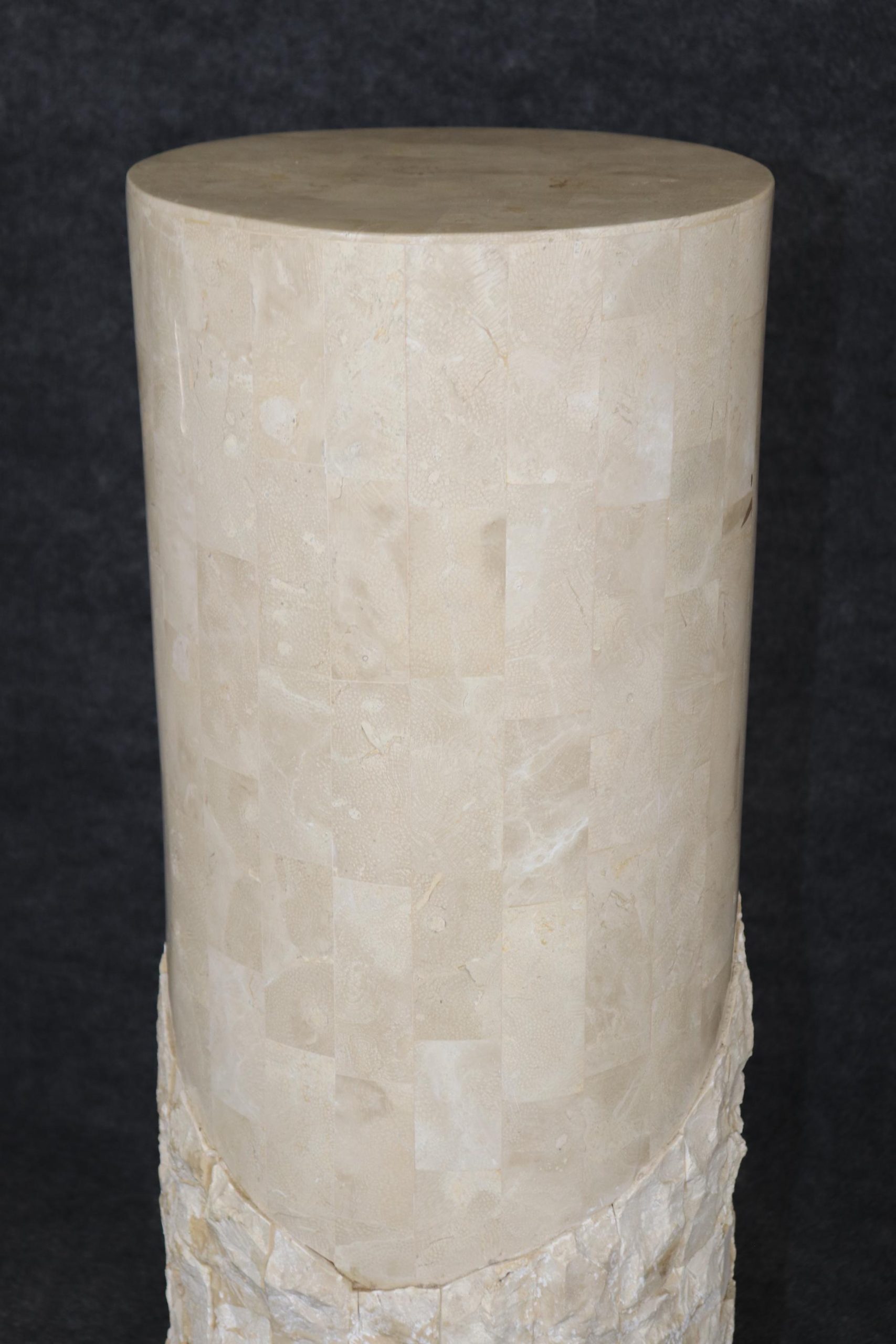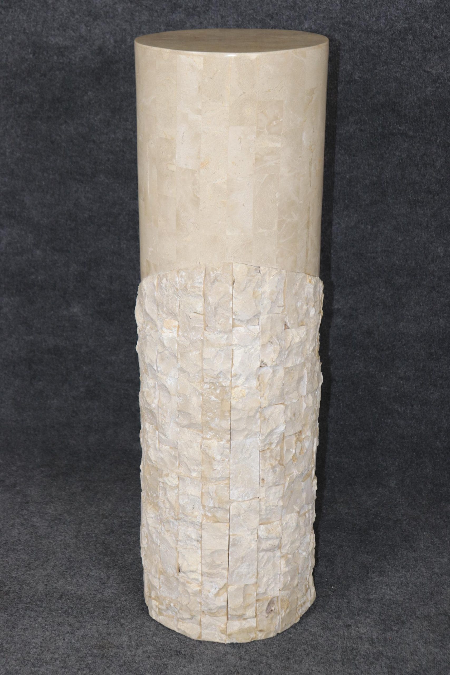 This Mid Century Modern tesselated travertine pedestal is a great example of MCM decor! This piece is bound to bring a sense of minimalistic luxury and modernism into your home or place of choosing and is perfect for any living room, bedroom, bathroom or office! This piece will have your guests mesmerized by its design and will have them asking if it is made by a famed artist/sculptor! Antique furniture and vintage pieces have stood the test of time and this pedestal is no exception! With its quality materials and great craftsmanship this piece is bound to last you and your family for many years to come. This piece is in good vintage condition with the exception of some light surface scratches, as to be expected but otherwise good condition.