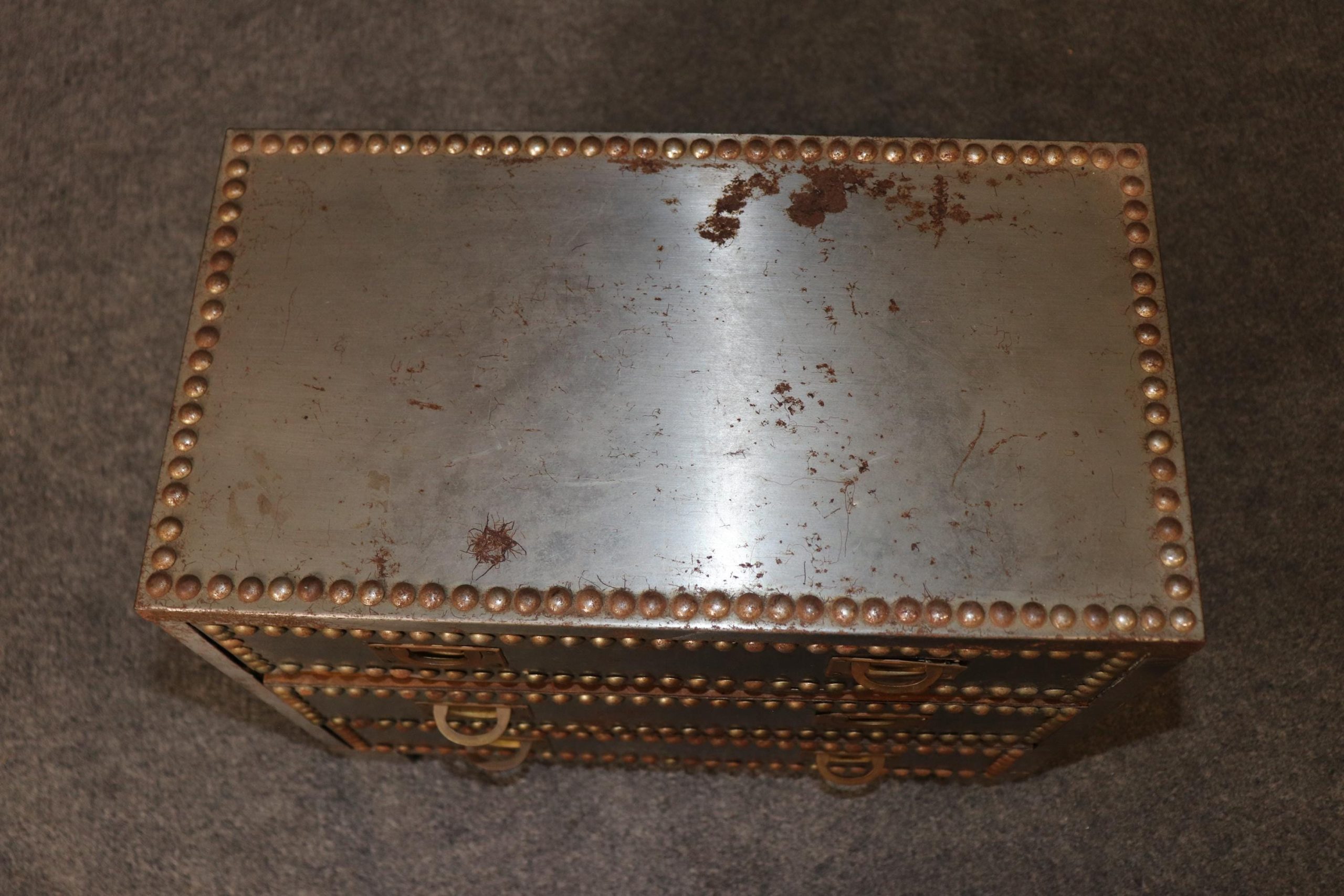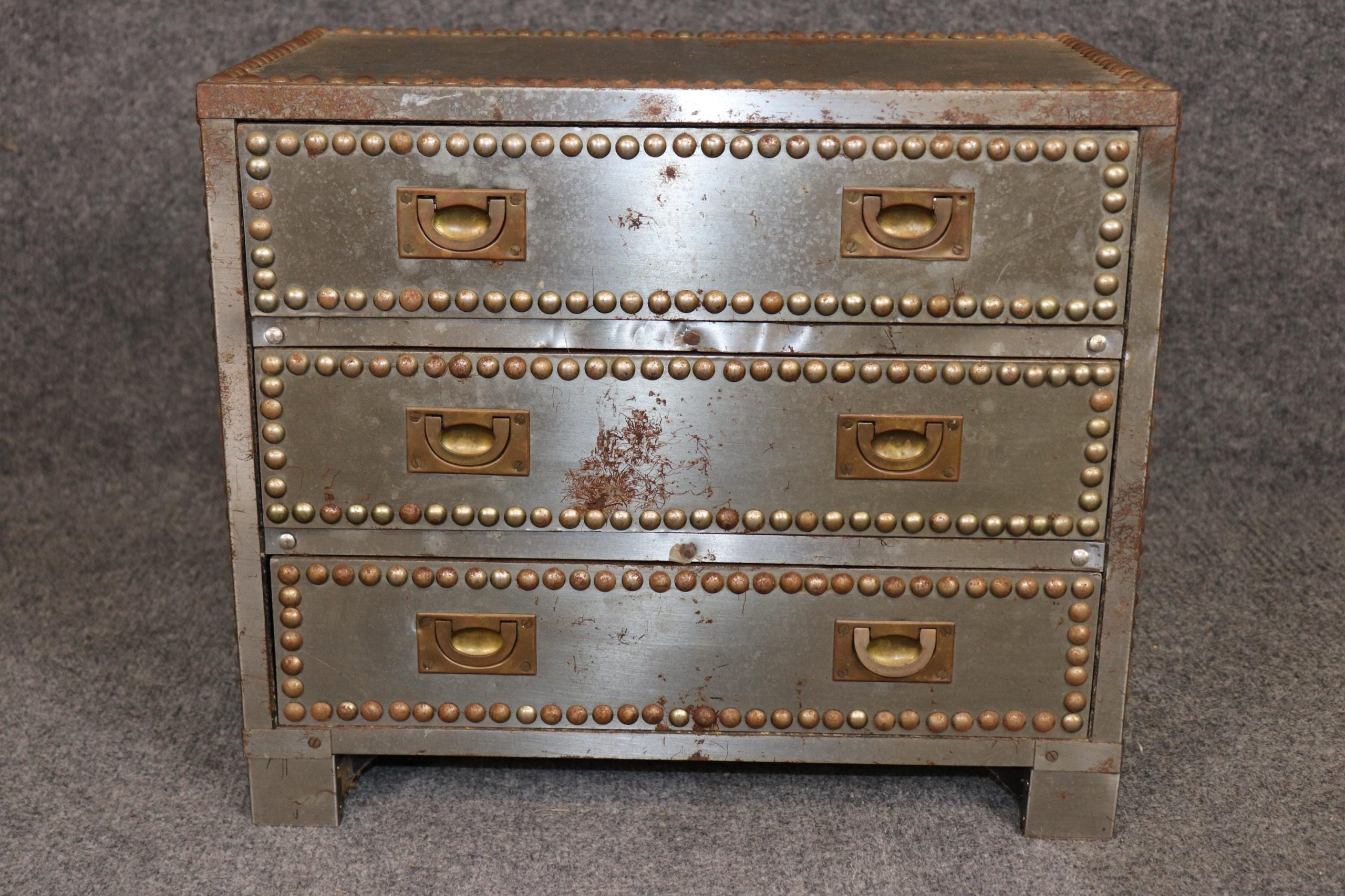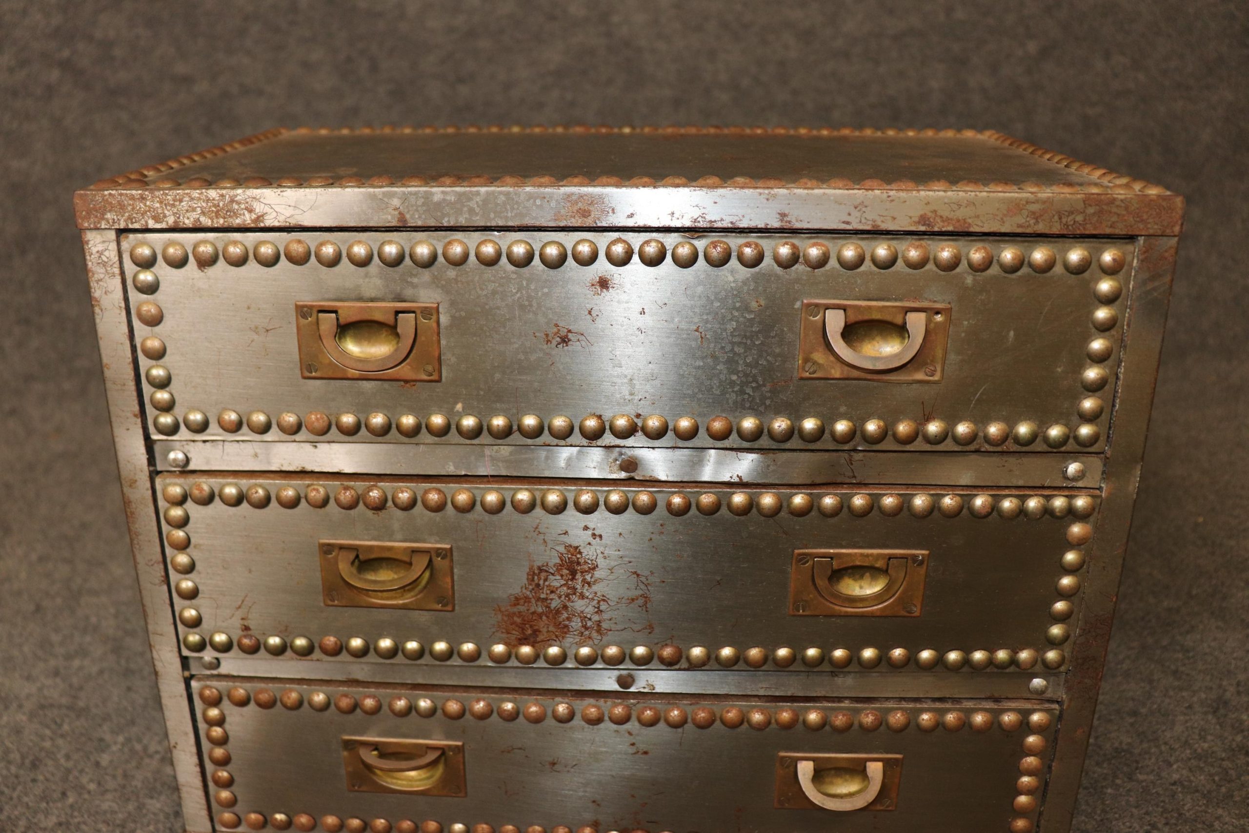 This vintage miniature salesman’s sample of a stainless steel and brass Campaign chest is made of the highest quality and is super rare! Made in the 1950’s, this miniature commode features 3 tiny drawers perfect for storing away any precious jewelry or small object. Antique furniture and vintage pieces have stood the test of time and this miniature chest is no exception! With its quality materials and great craftsmanship this is bound to last you and your family for many years to come. This would make a wonderful addition to your bedroom, office, or any other room of your choosing and is bound to bring a sense of character and creativity!