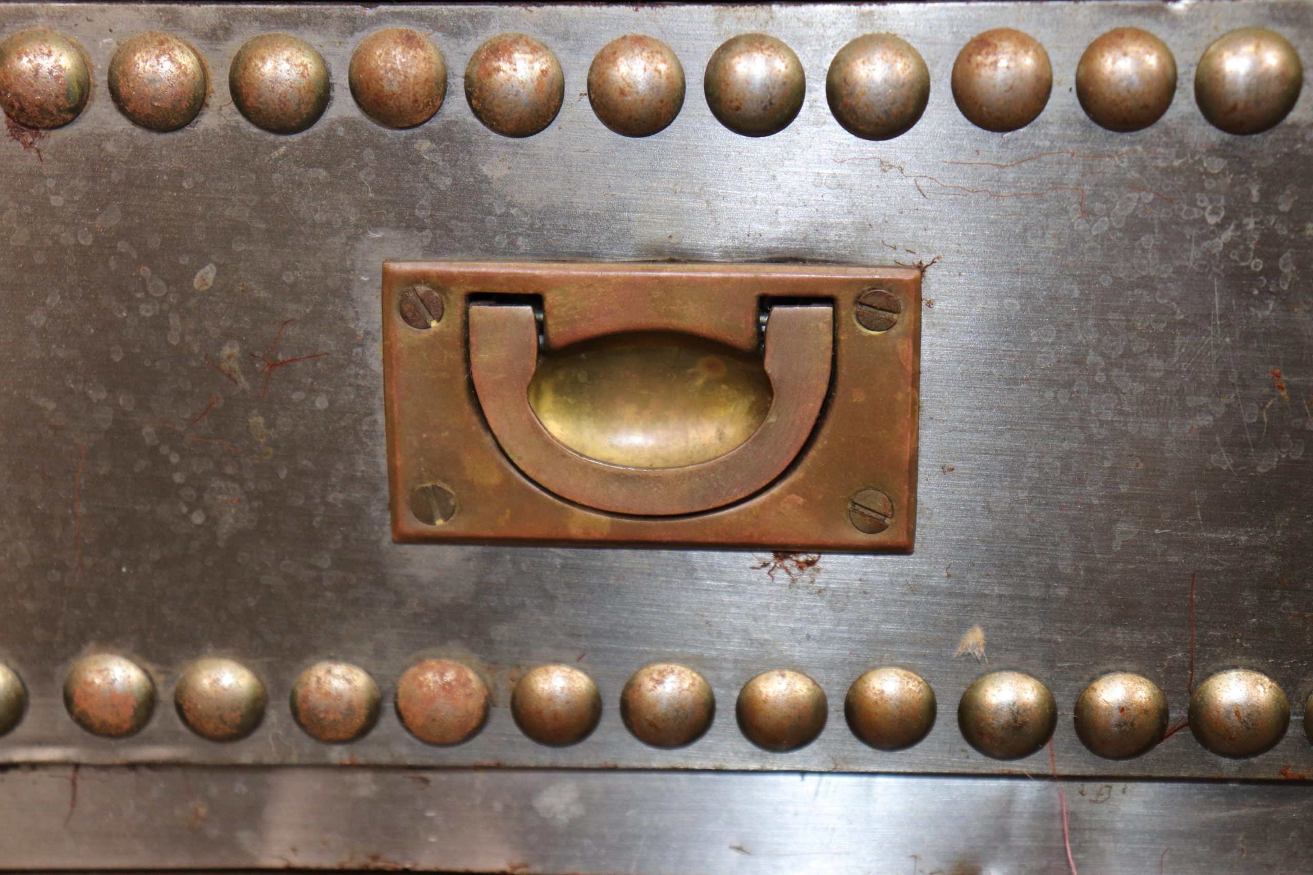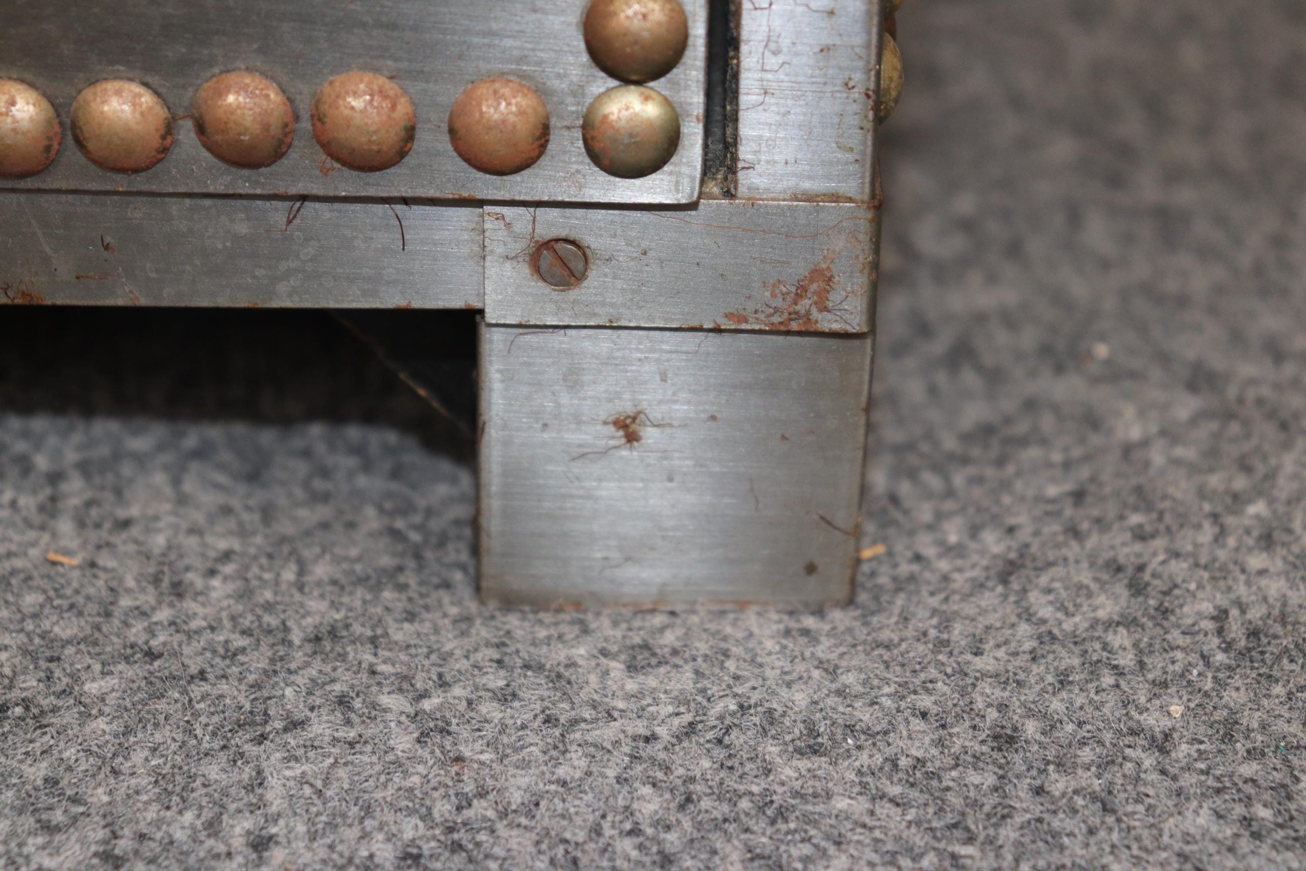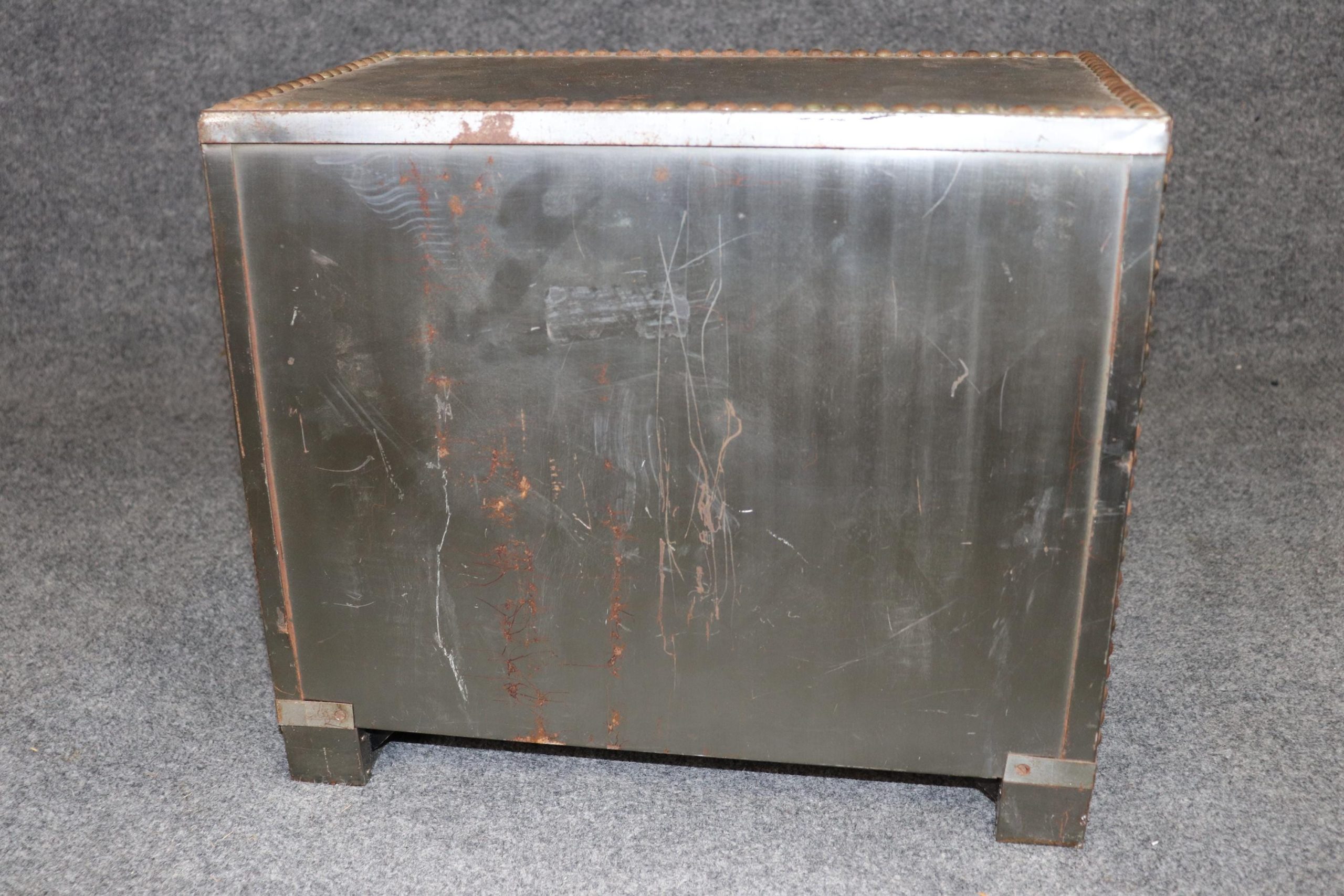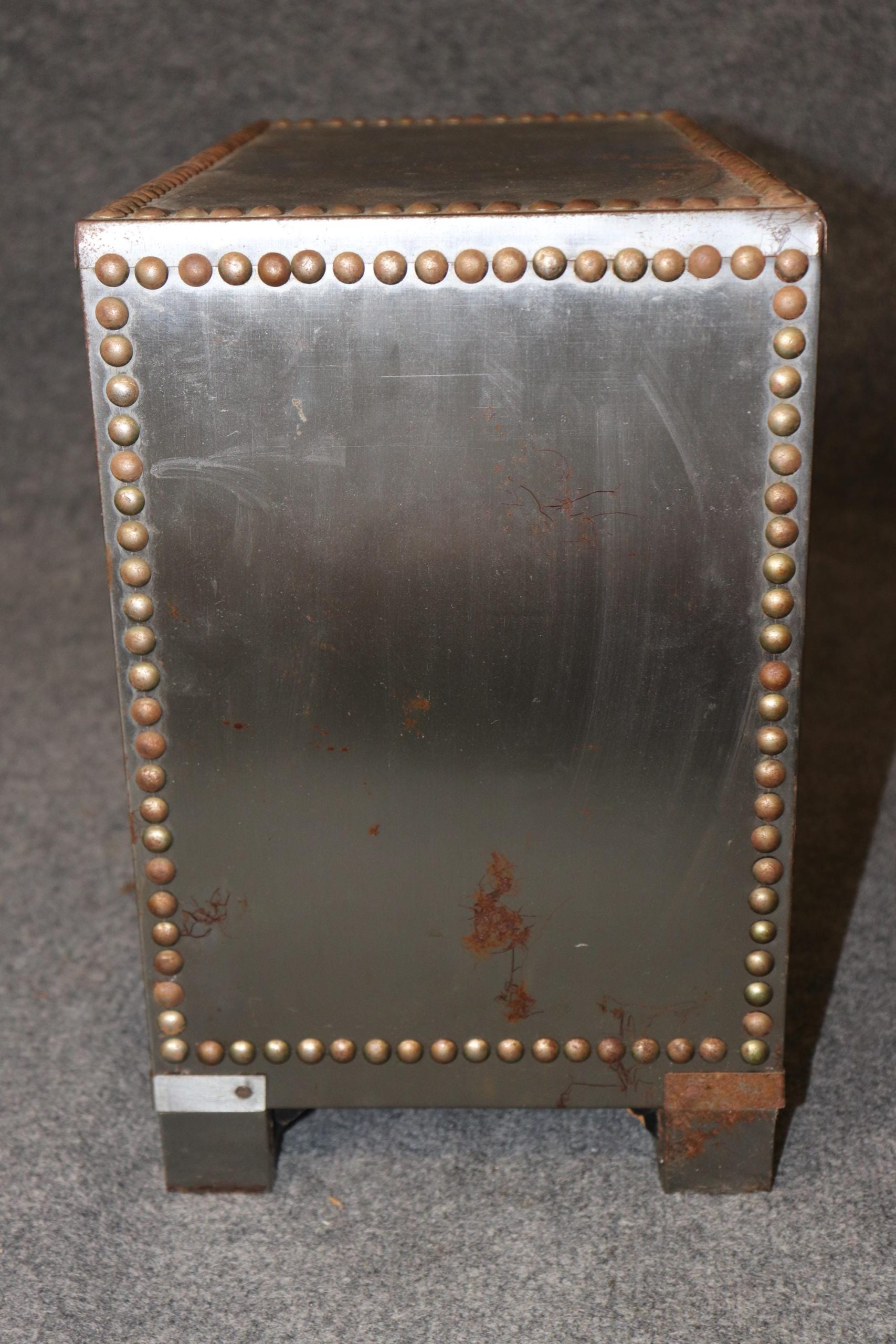 This vintage miniature salesman’s sample of a stainless steel and brass Campaign chest is made of the highest quality and is super rare! Made in the 1950’s, this miniature commode features 3 tiny drawers perfect for storing away any precious jewelry or small object. Antique furniture and vintage pieces have stood the test of time and this miniature chest is no exception! With its quality materials and great craftsmanship this is bound to last you and your family for many years to come. This would make a wonderful addition to your bedroom, office, or any other room of your choosing and is bound to bring a sense of character and creativity!