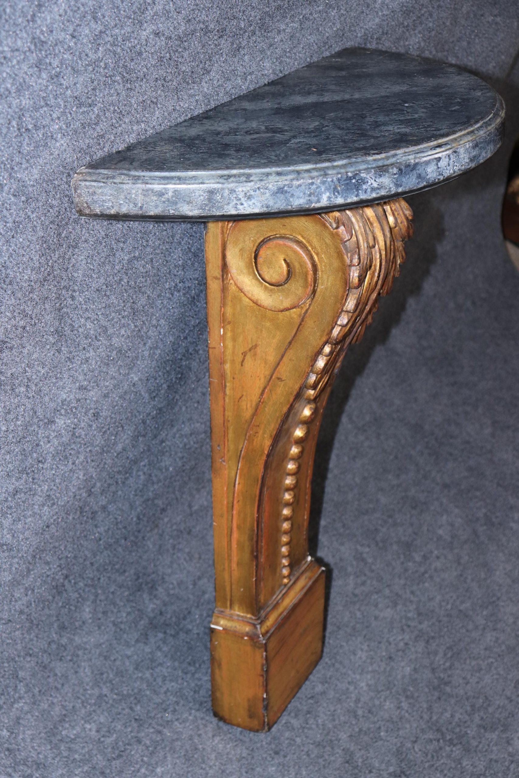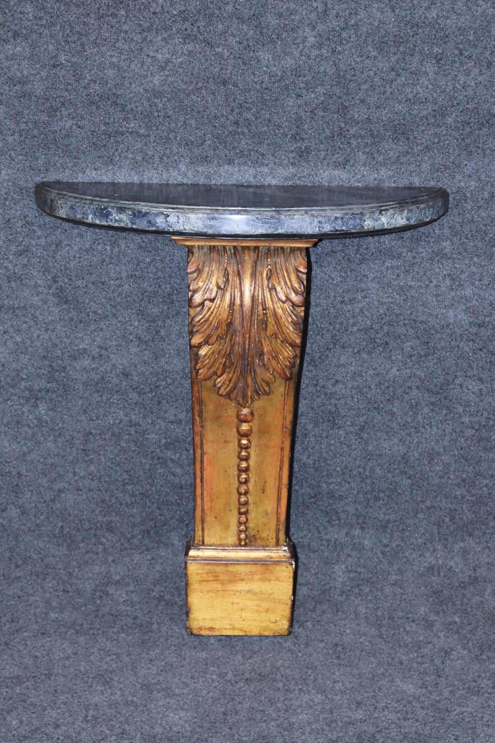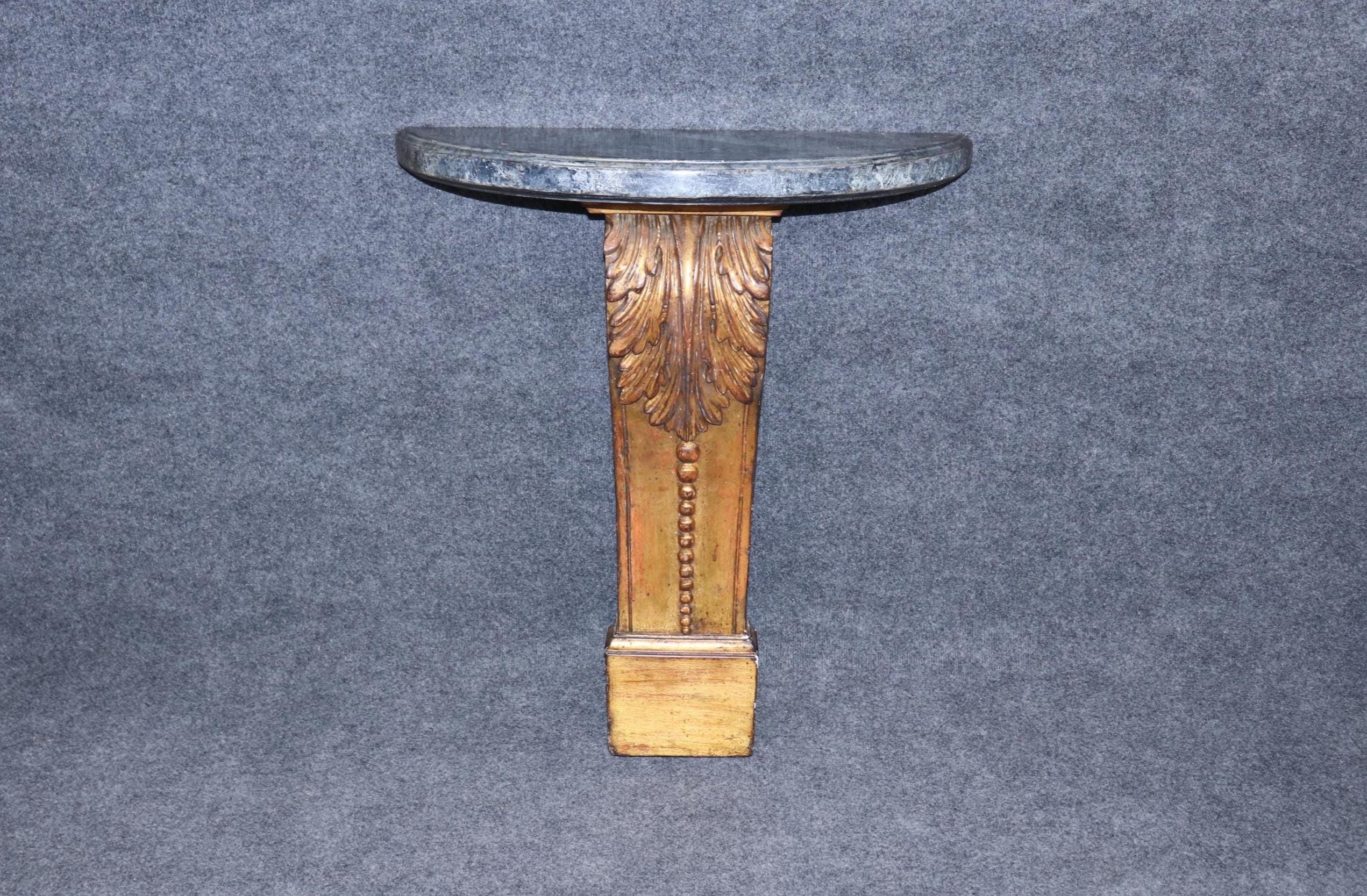 This vintage Neoclassical style carved gilt faux marble top wall console table is made of the highest quality! If you look closely at the photos provided, you’ll see that the console is made to sit flush against the wall. This console is perfect for your living room, entryway, bedroom, dining room or office! This piece can also be paired with a variety of other styles due to its simplistic yet luxurious design! This console is bound to bring a lovely sense of sophistication and luxury into your home and will certainly be a conversation starter at your next gathering. The carved gilt wood base is of exceptional quality and the faux marble top was executed perfectly! Antique furniture and vintage pieces have stood the test of time and this console is no exception! With its quality materials and great craftsmanship this is bound to last you and your family for many years to come. The piece is in good vintage condition with the exception of light surface scratches and some minor finish loss as to be expected from an item of age and use.