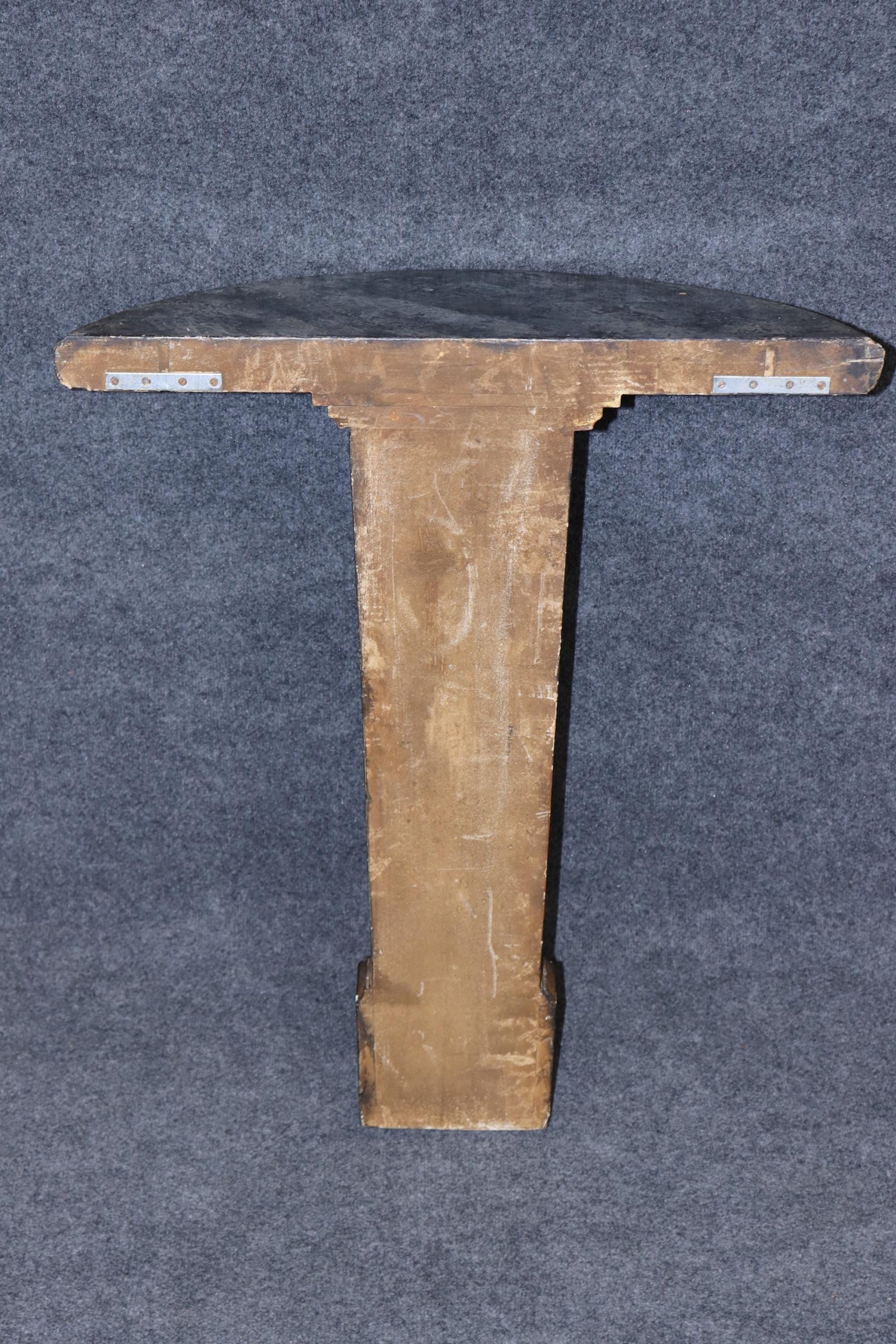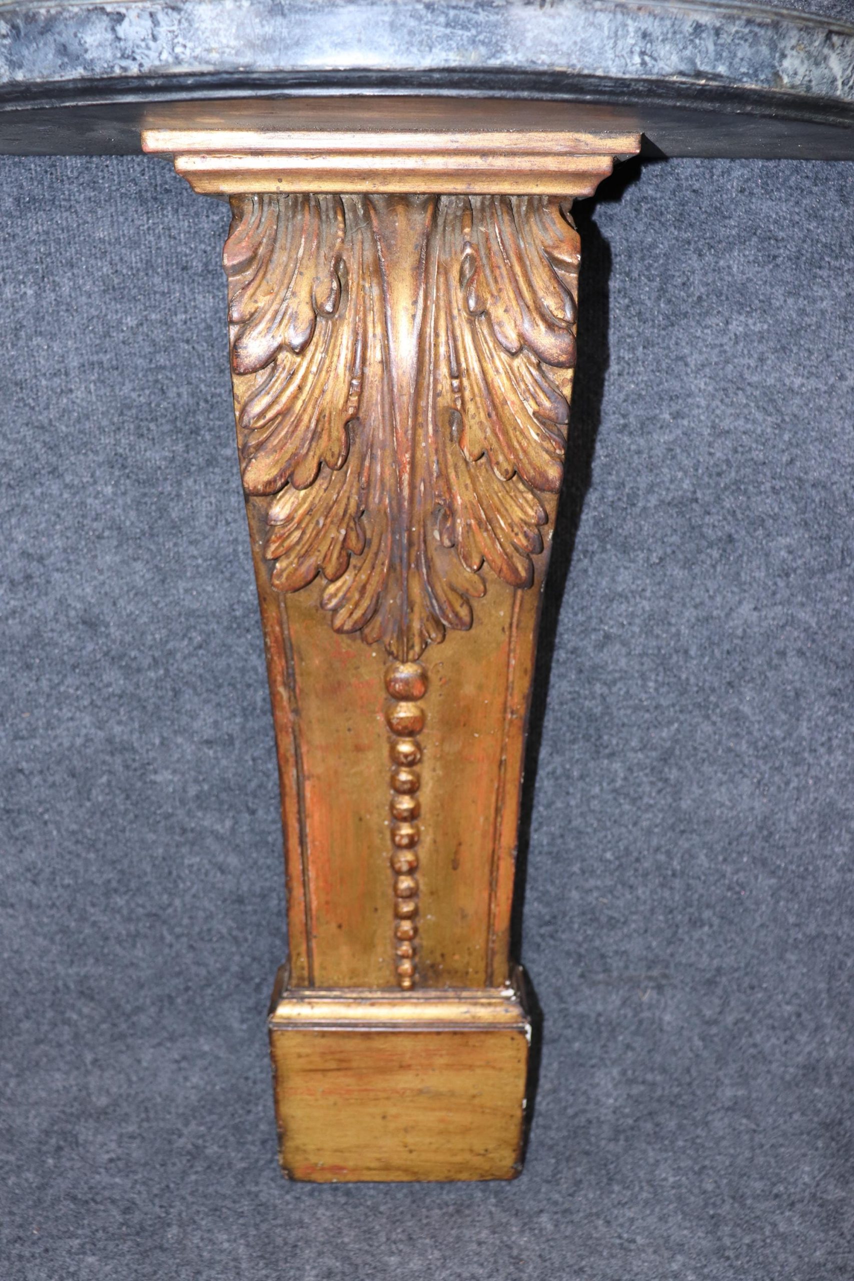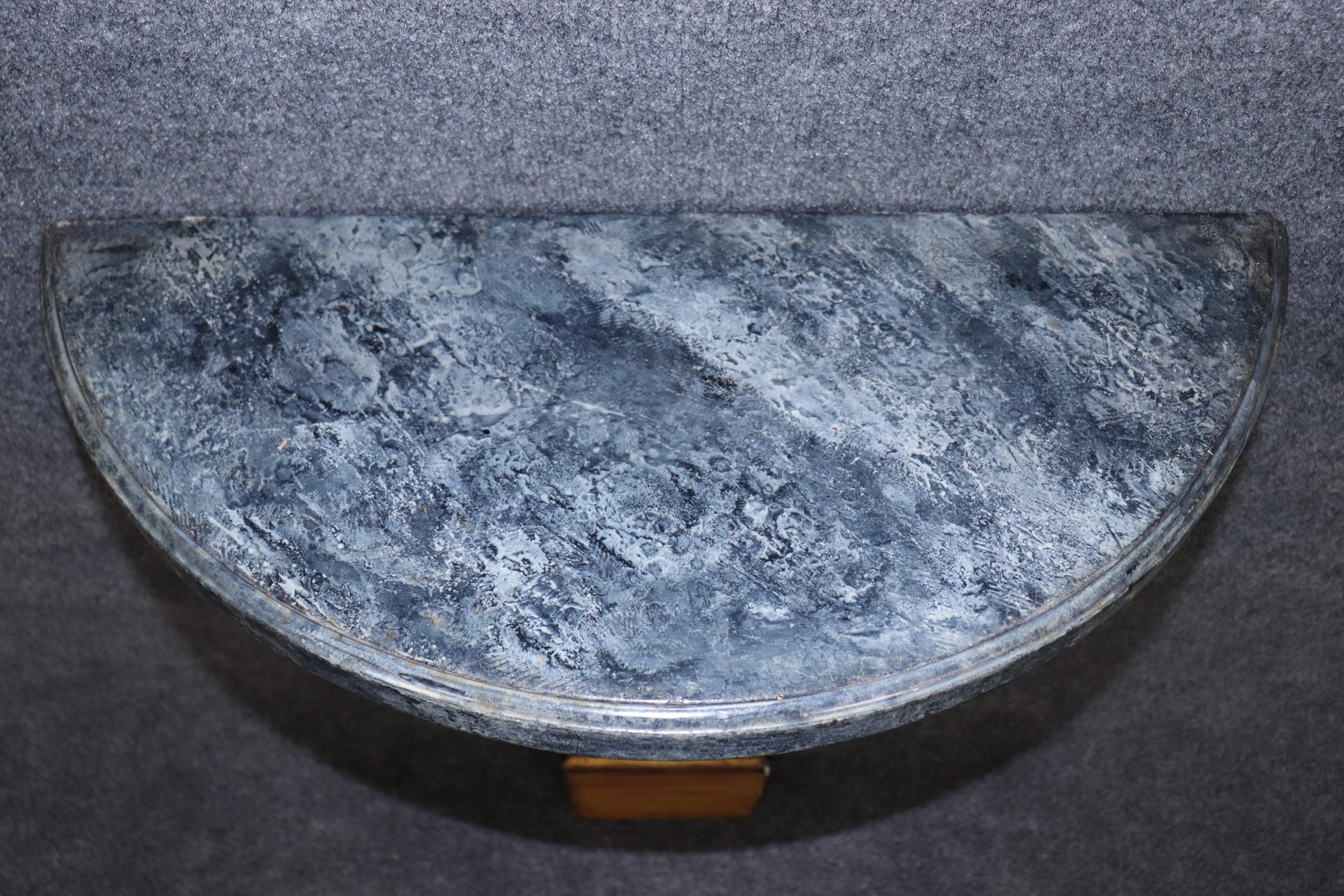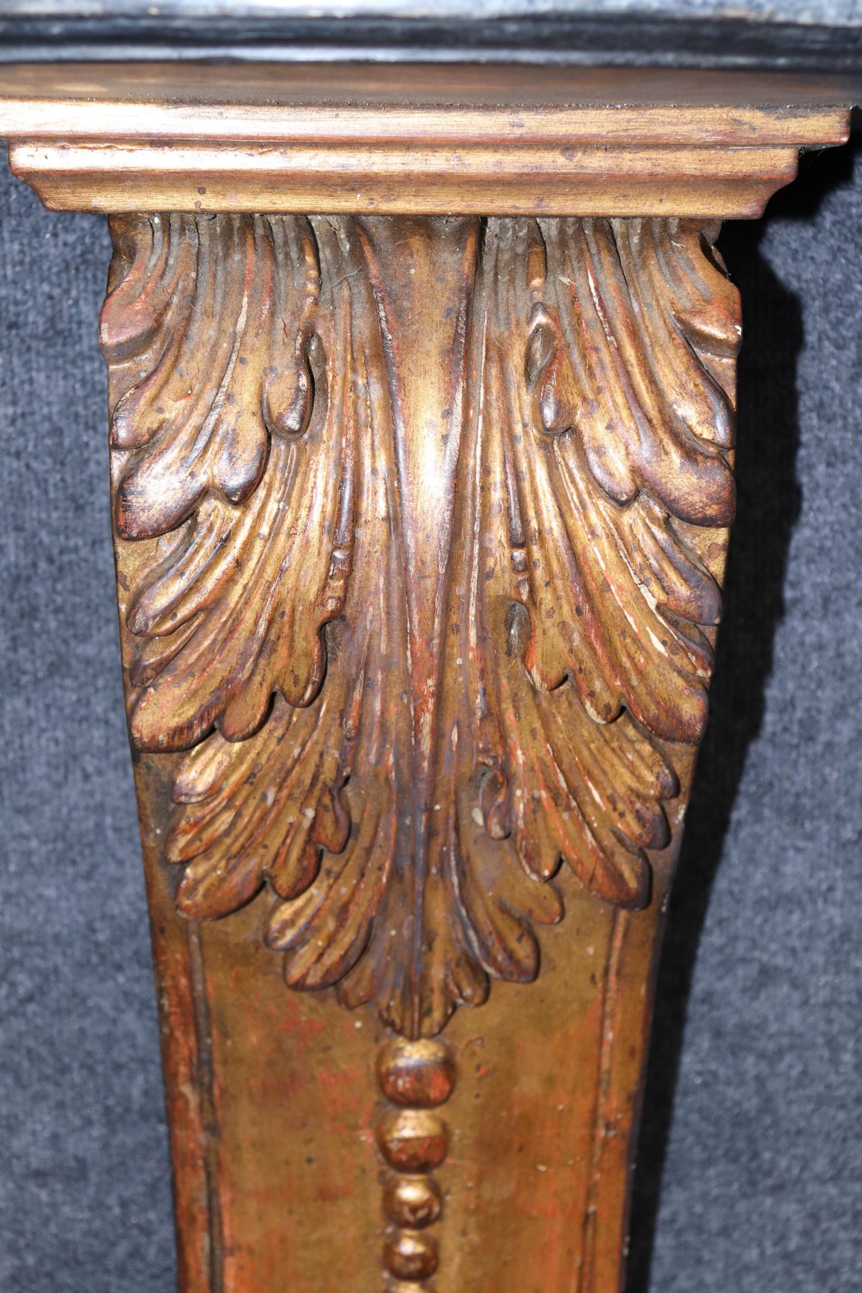 This vintage Neoclassical style carved gilt faux marble top wall console table is made of the highest quality! If you look closely at the photos provided, you’ll see that the console is made to sit flush against the wall. This console is perfect for your living room, entryway, bedroom, dining room or office! This piece can also be paired with a variety of other styles due to its simplistic yet luxurious design! This console is bound to bring a lovely sense of sophistication and luxury into your home and will certainly be a conversation starter at your next gathering. The carved gilt wood base is of exceptional quality and the faux marble top was executed perfectly! Antique furniture and vintage pieces have stood the test of time and this console is no exception! With its quality materials and great craftsmanship this is bound to last you and your family for many years to come. The piece is in good vintage condition with the exception of light surface scratches and some minor finish loss as to be expected from an item of age and use.