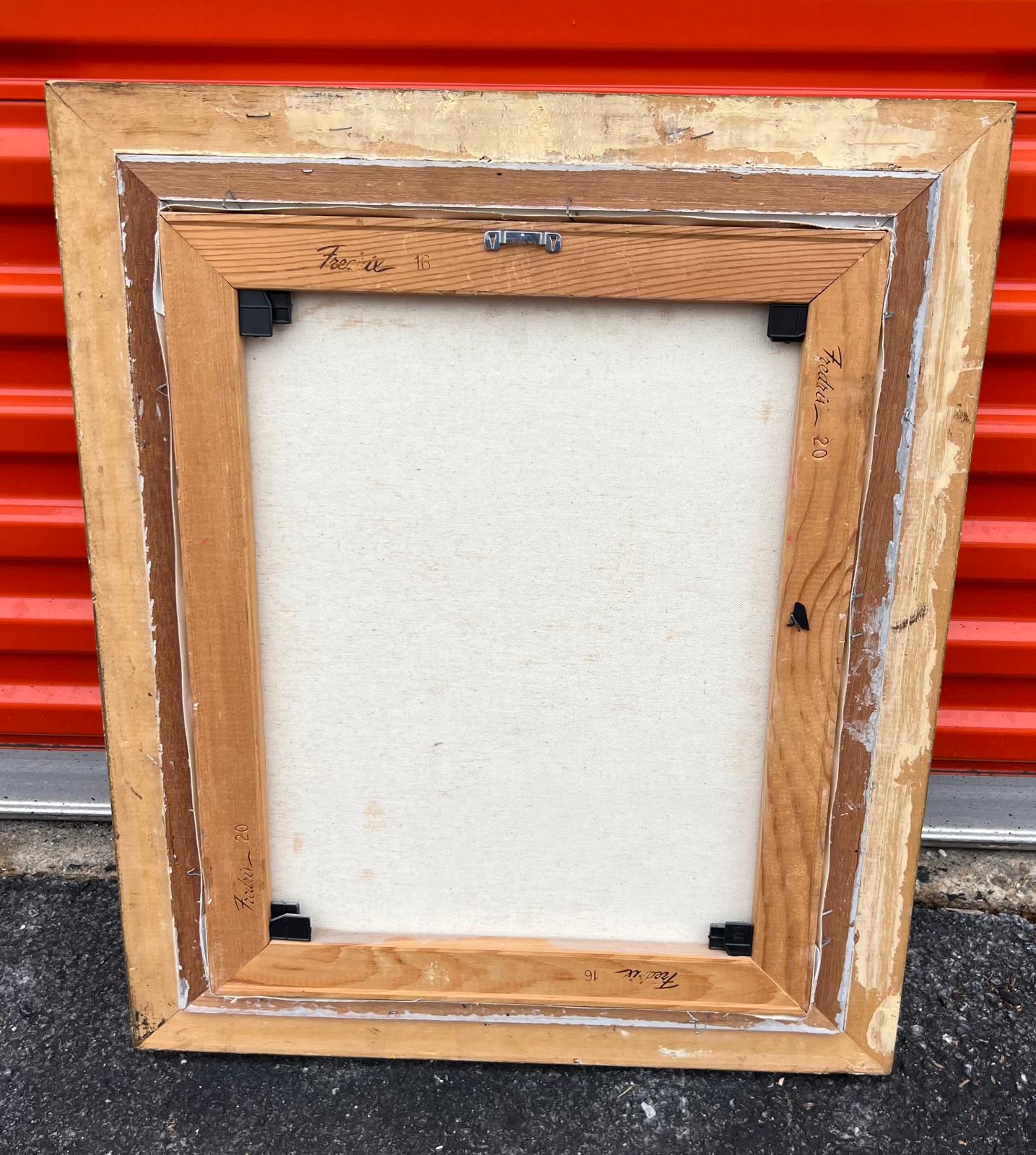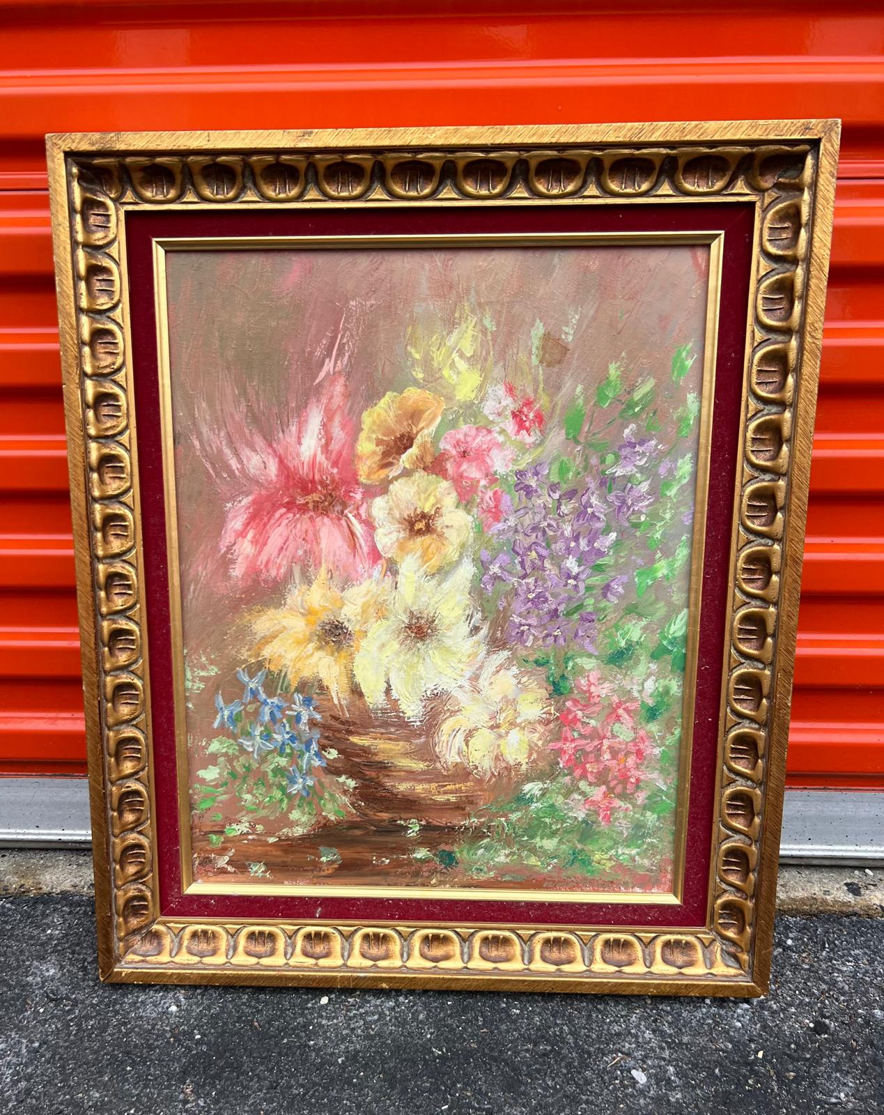 Pretty still life oil painting of flowers in a gold gilded wood and velvet frame. Signed by the artist.