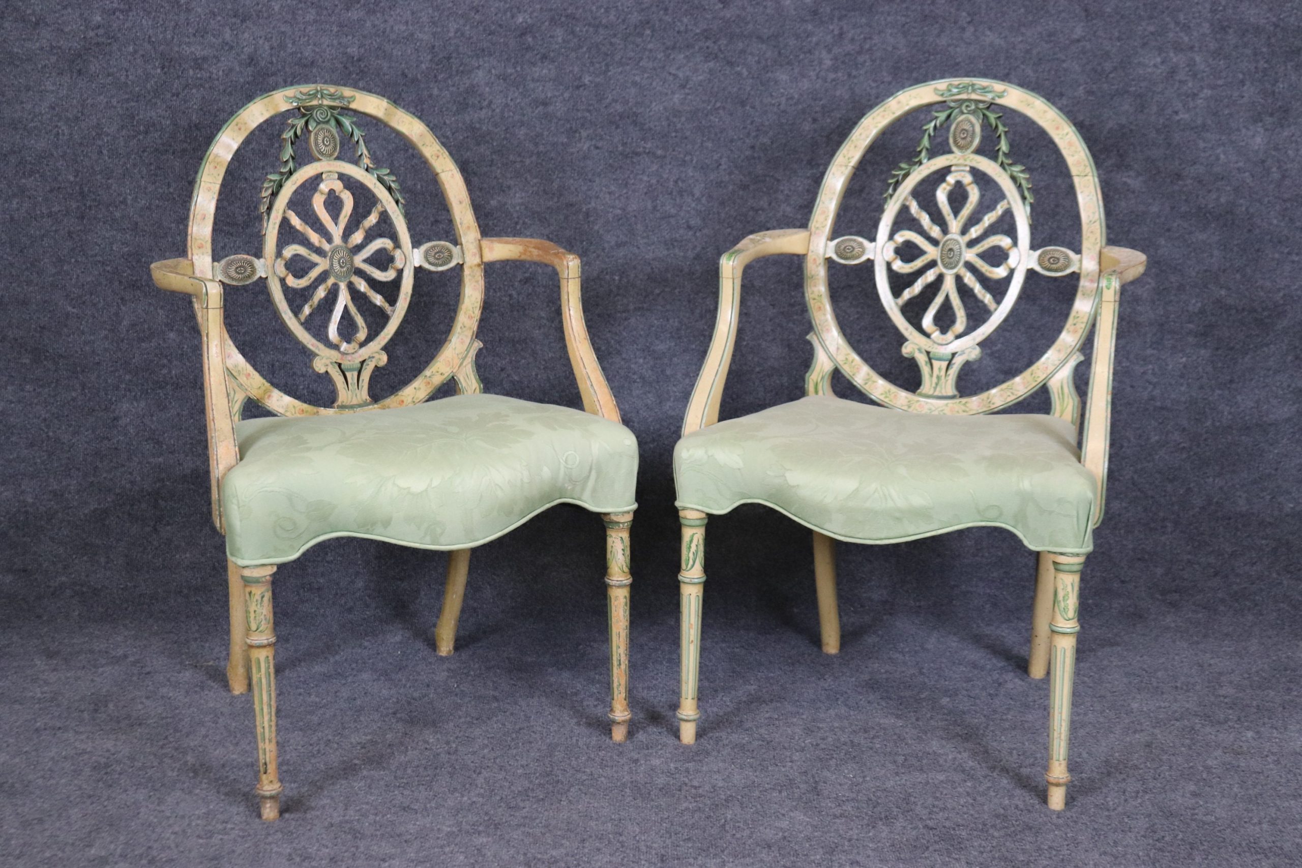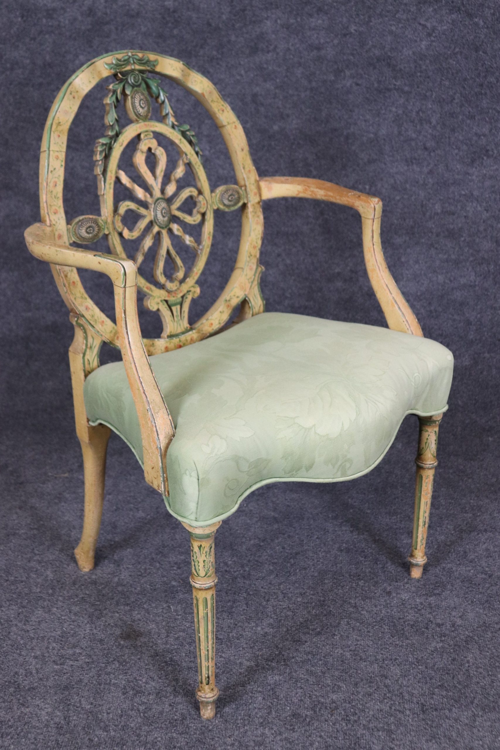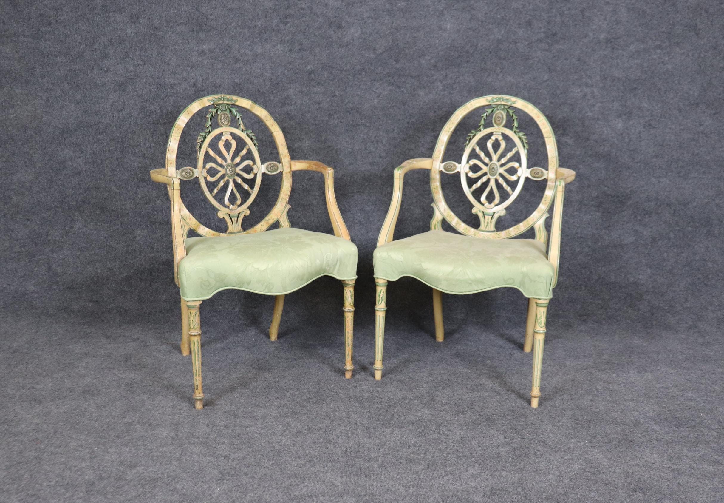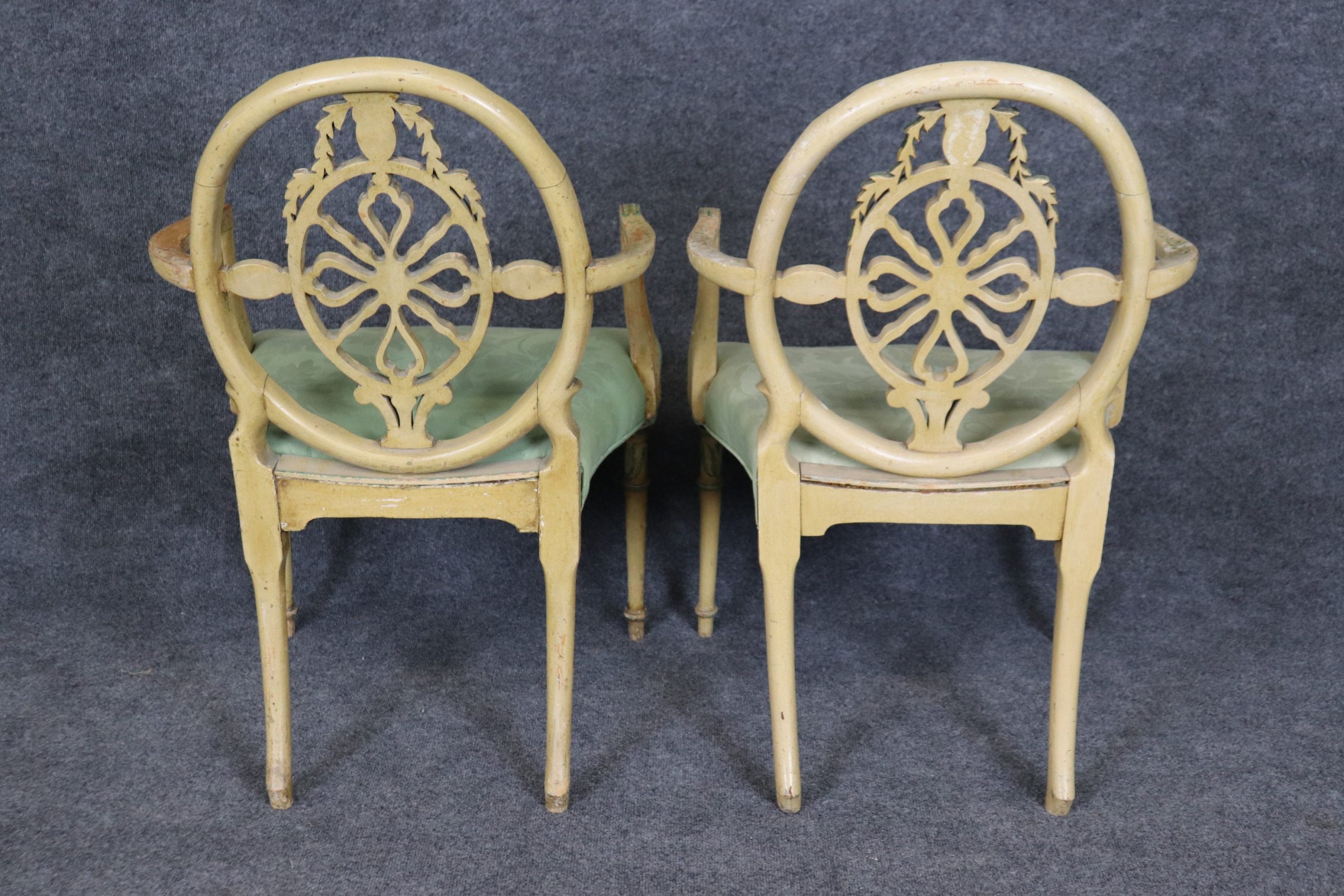 This vintage pair of Adams style armchairs, accent chairs is made of the highest quality and is perfect for you and your home! If you look at the photos provided, you will see the beautiful intentionally distressed paint decoration as well as the hand carved fluted legs. This pair is perfect for any living room, bedroom, entryway or office and is bound to bring a sense of luxury and class into your place of choosing! This is a pair that will separate your home from others and bring that classy look we all want! This pair is in good vintage condition with some light surface scratches and minor finish loss to frames. Otherwise, good condition.