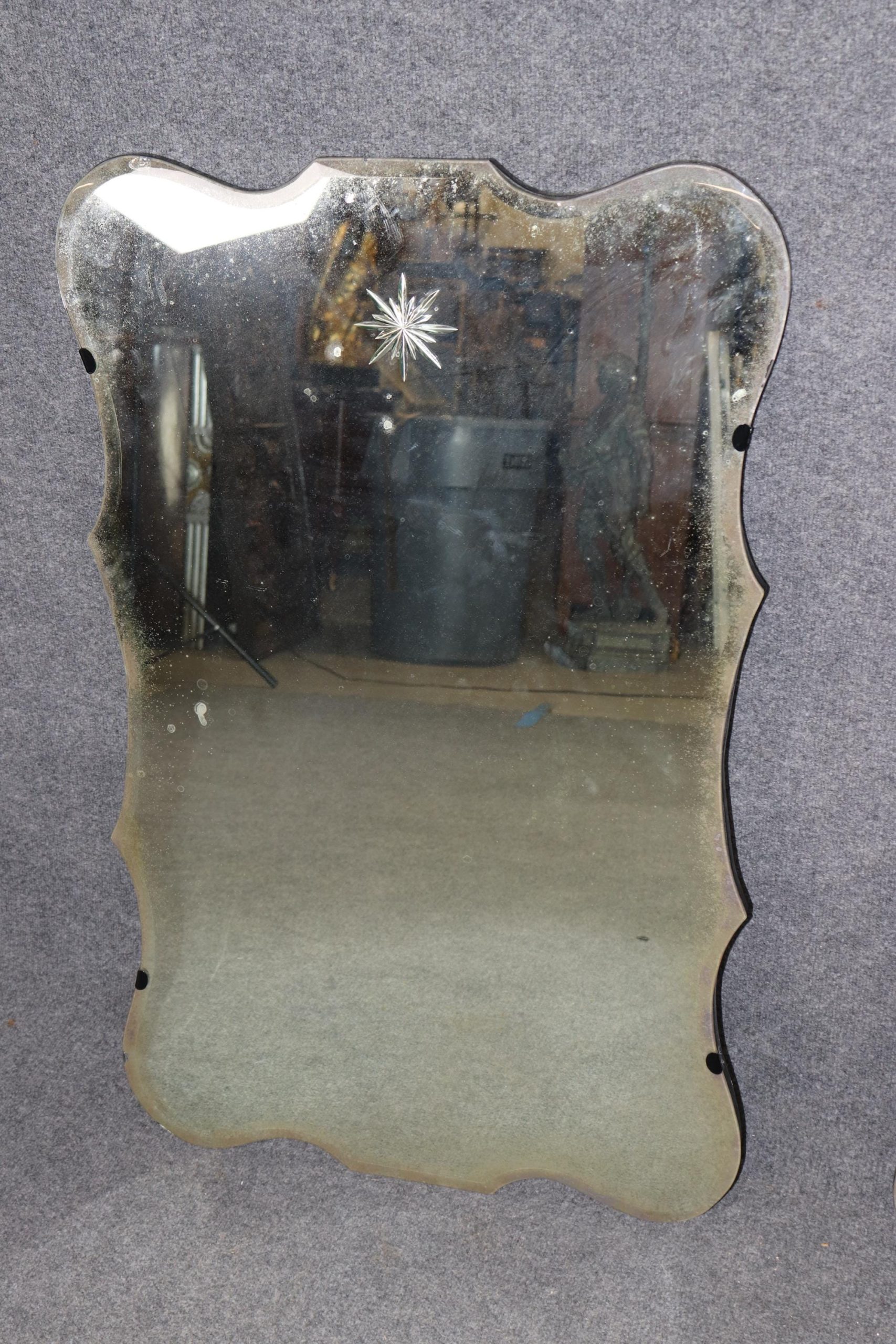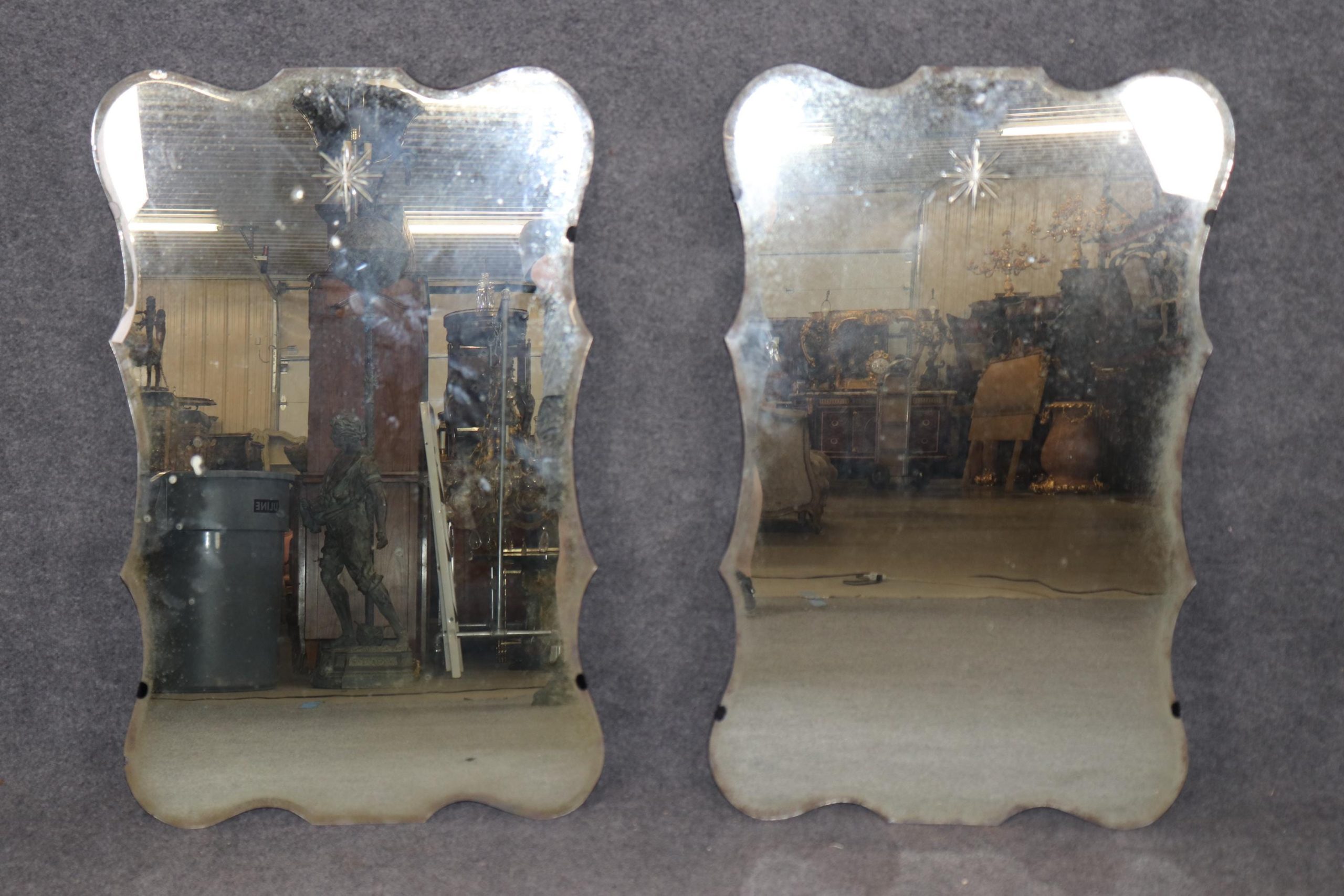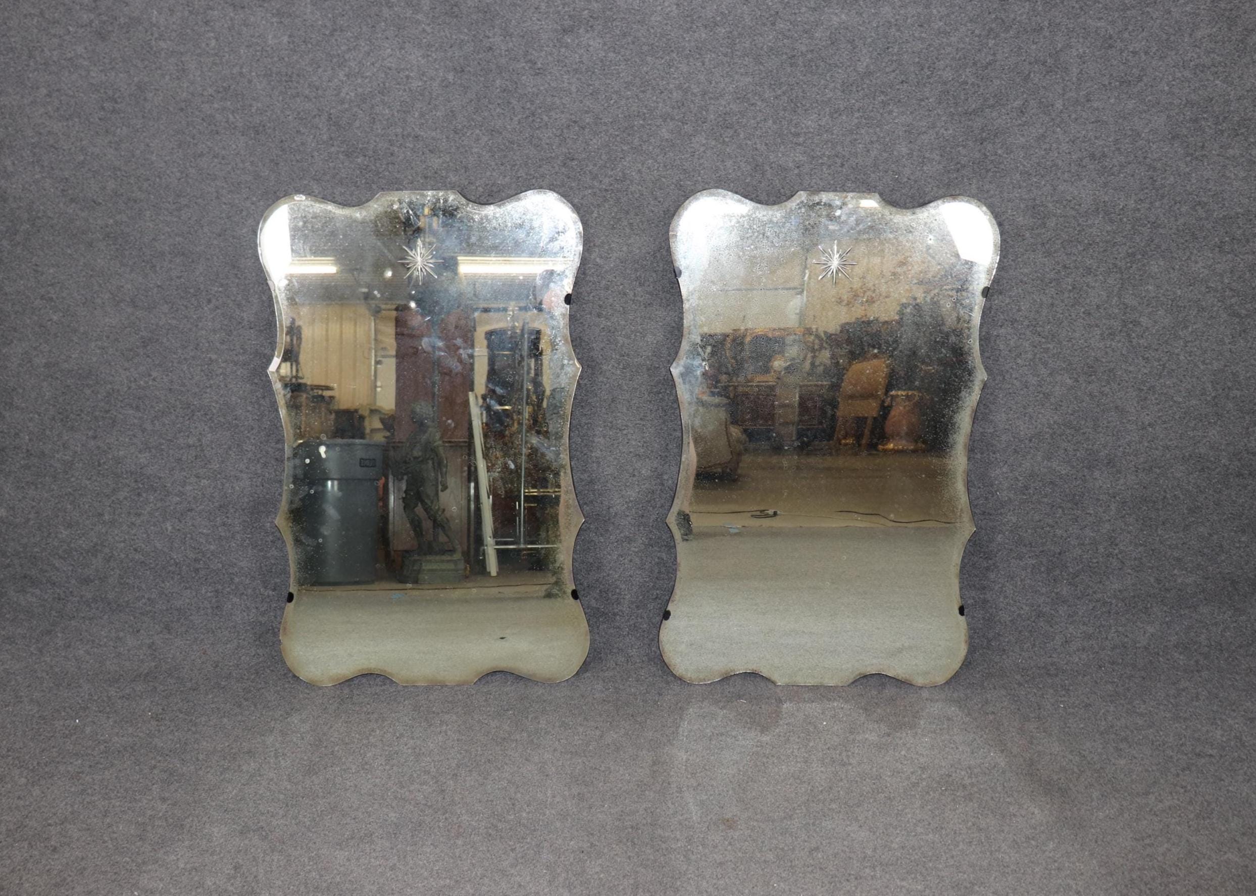 This vintage pair of Maison Jansen style acid distressed etched wall hanging mirrors is made of the highest quality and is perfect for you and your home! Maison Jansen was a Paris-based interior decoration office founded in 1880 by Dutch-born Jean-Henri Jansen. These mirrors are perfect to be used as hallway mirrors, bathroom mirrors, entryway mirrors, living room mirrors, or bedroom mirrors and due to their simplistic design can be paired with a variety of other styles you may already have in your place of choosing! Antique furniture and vintage pieces have stood the test of time and this pair of mirrors is no exception! With their quality materials and great craftsmanship this pair is bound to last you and your family for many years to come. The mirrors are in good vintage condition with light surface scratches and some minor scuffs but otherwise good condition considering age.