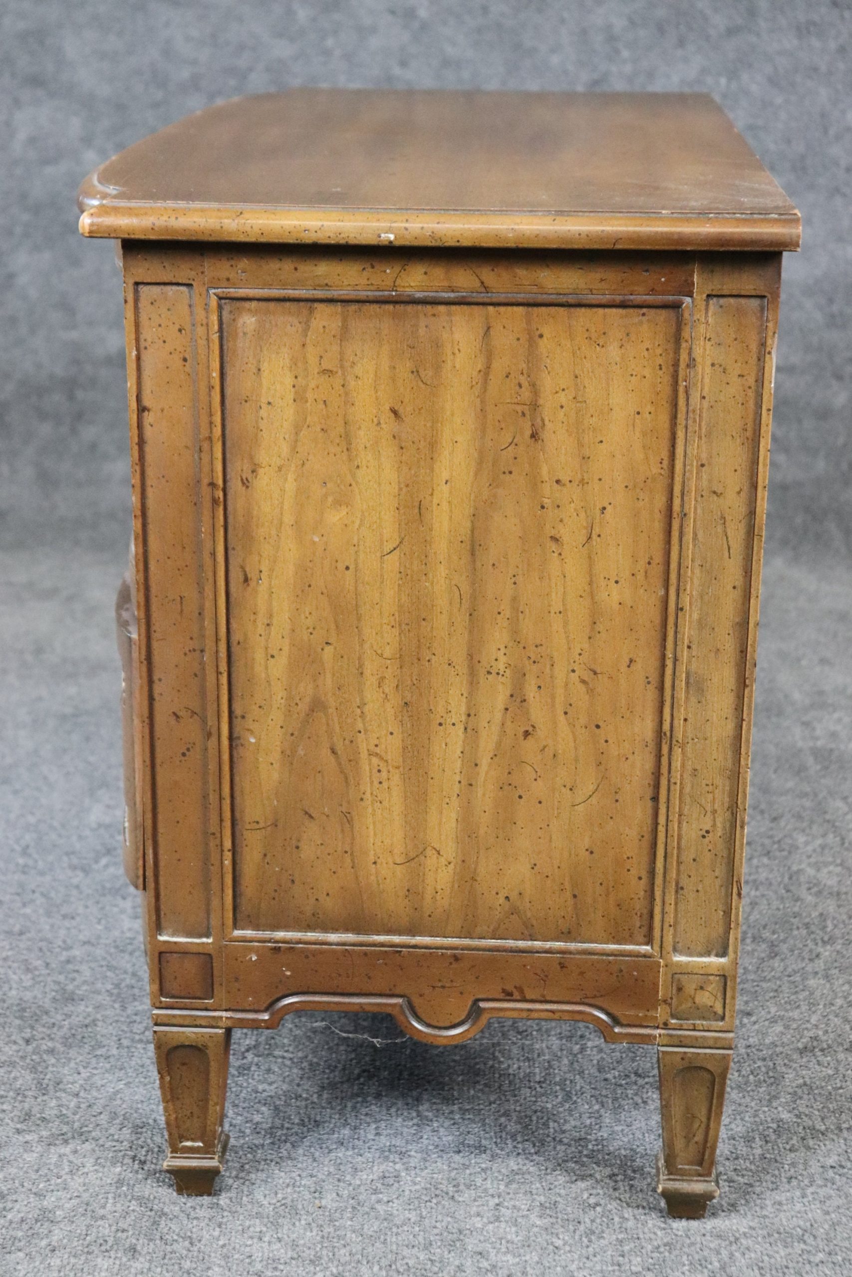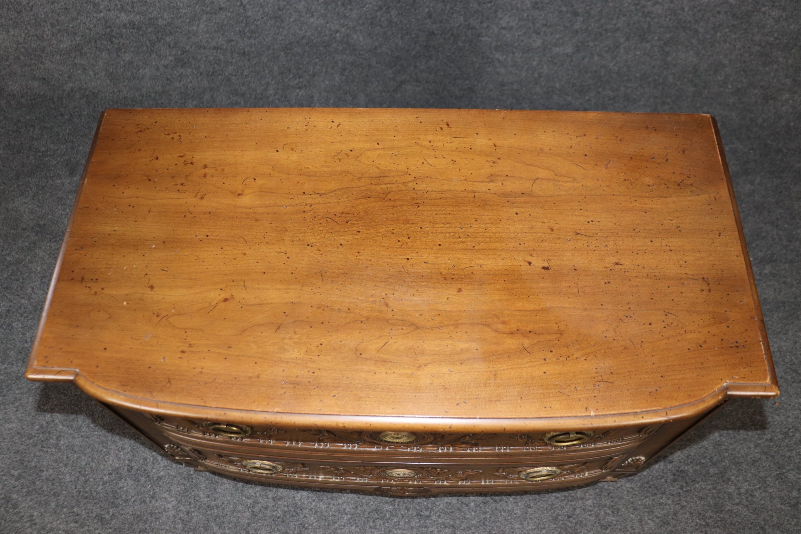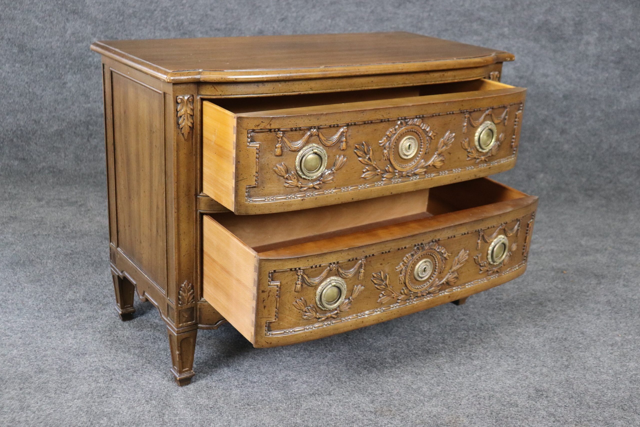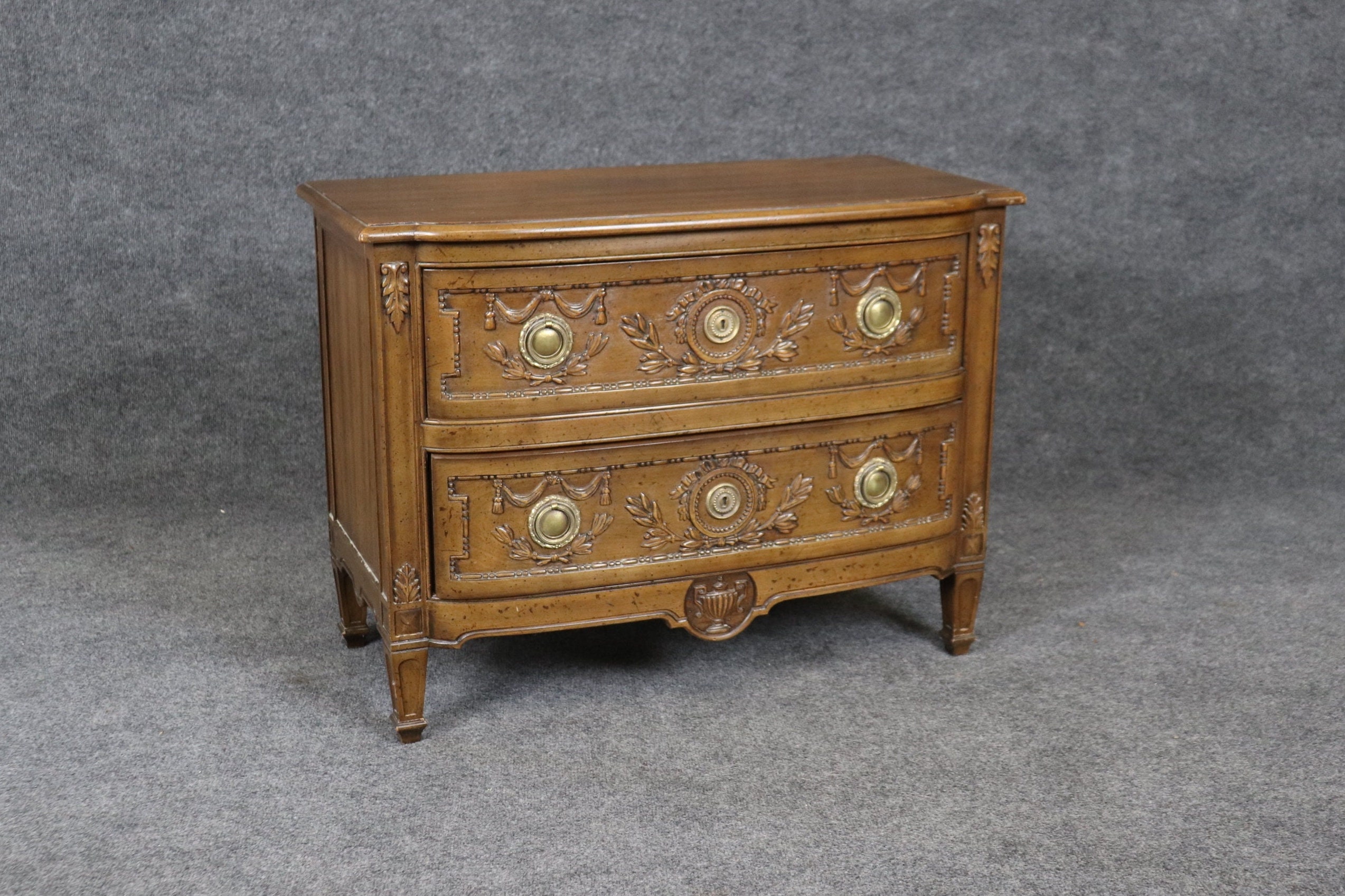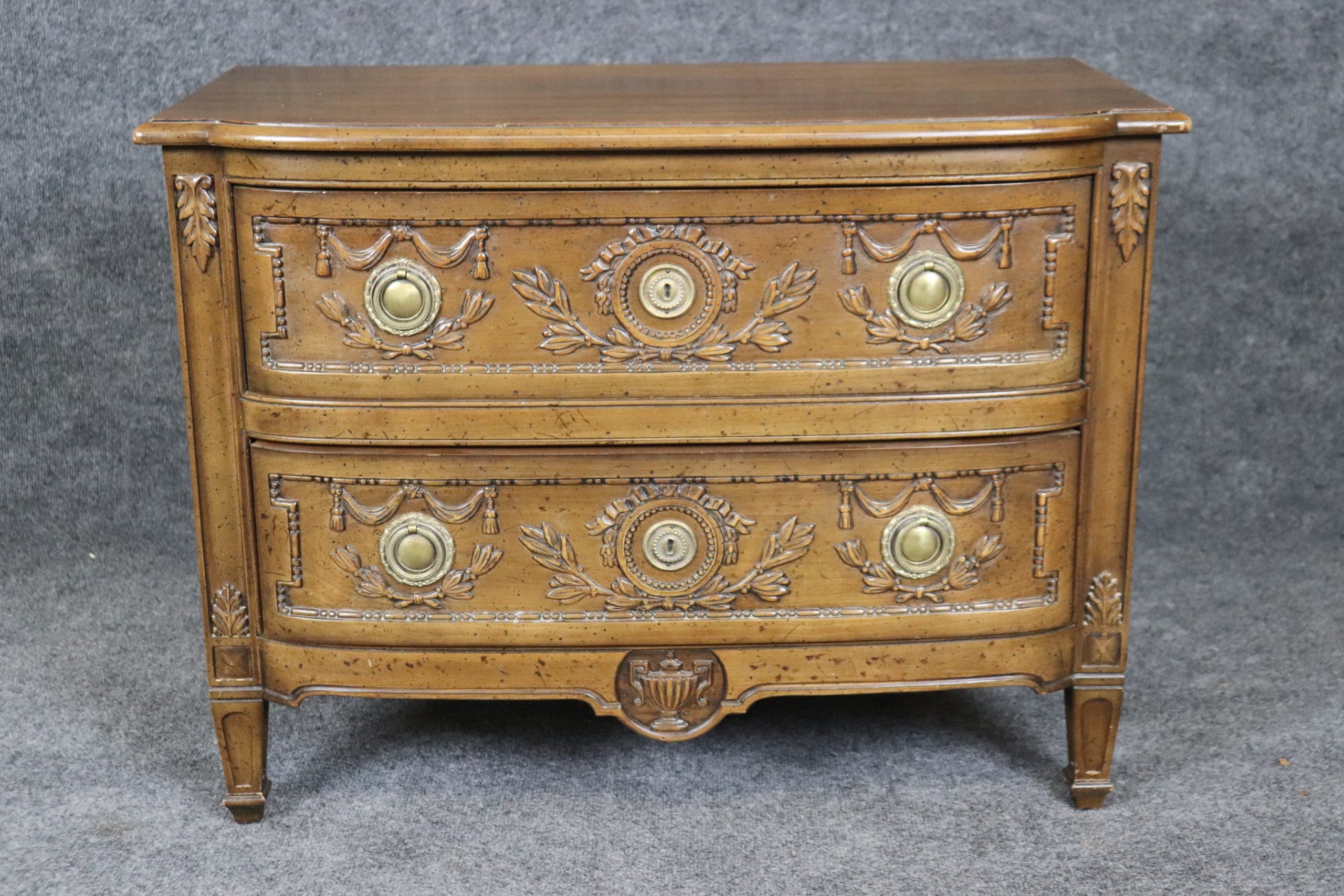 This mid 20th petite Henredon Directoire style 2 drawer nightstand, commode is a great example of quality furniture. Henredon Furniture was founded by a group of four men in 1945 in Morganton, NC. From the beginning, the company was known for its chic style and ability to modernize classic home design, while ensuring comfort and livability were top priority. The carvings are super high quality and crisp as well as the attention to detail. This is a piece that will last you for many years and will add a sense of luxury into your entryway, living room, office or place of your choosing! The commode is in good condition considering the age with some minor surface scratches and blemishes to the finish, otherwise good condition.