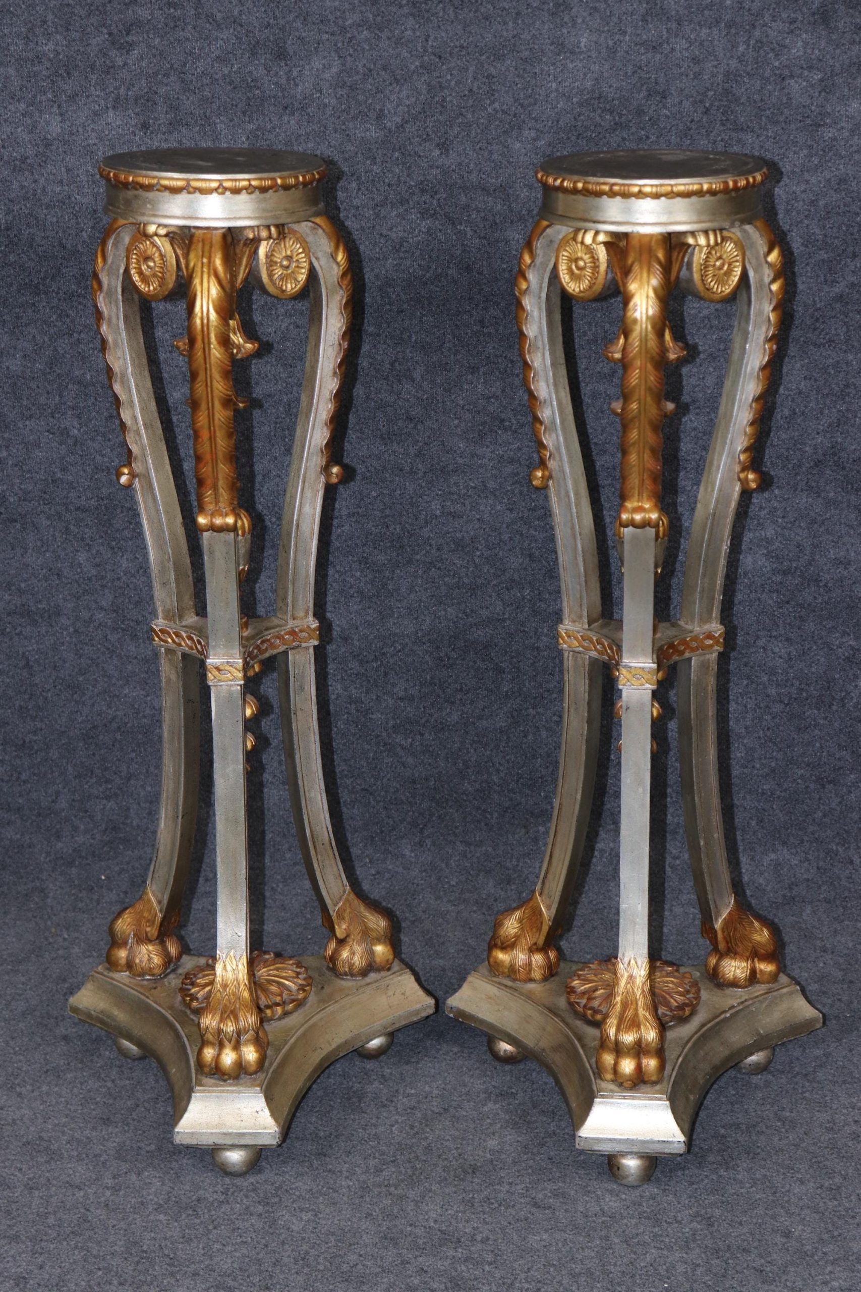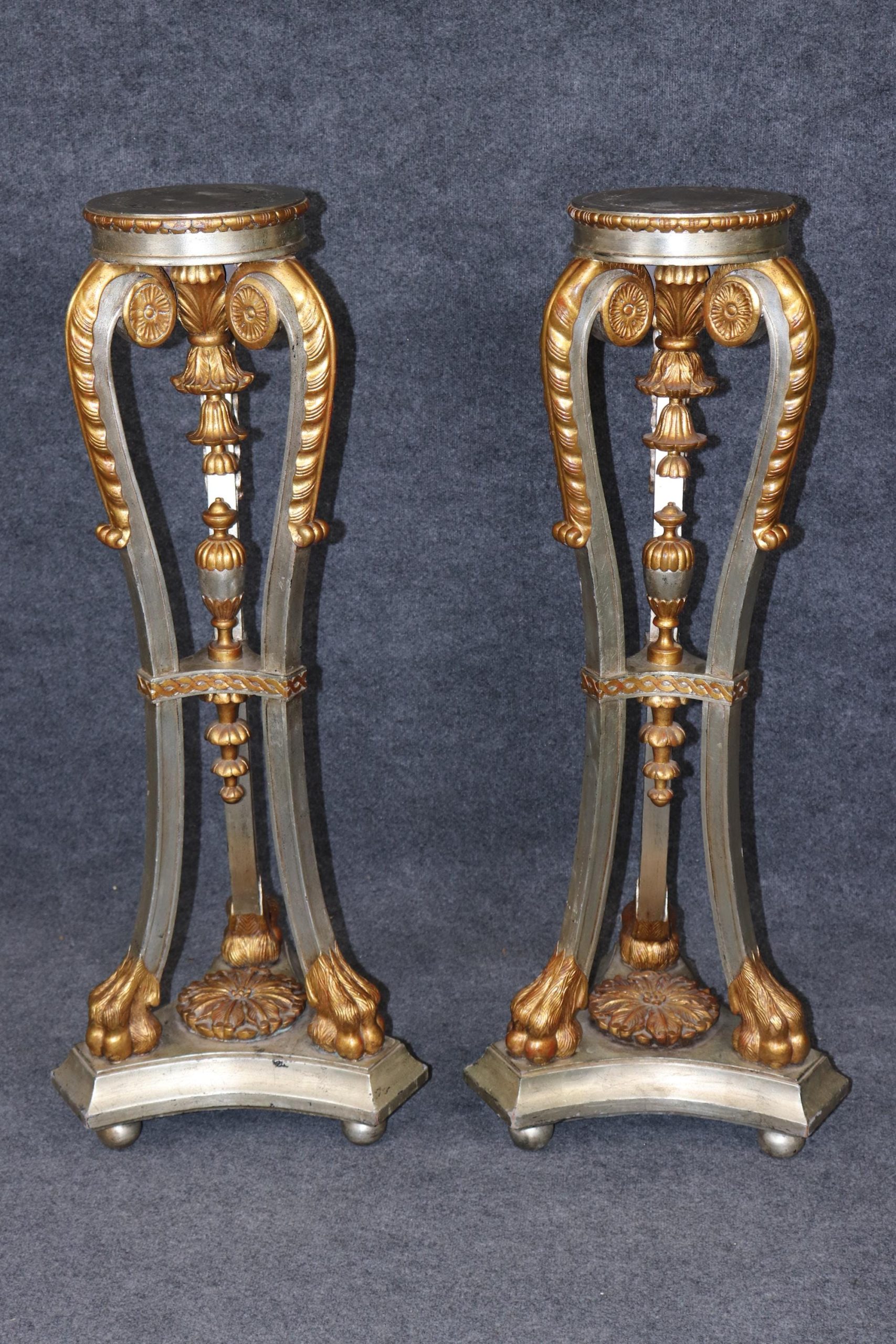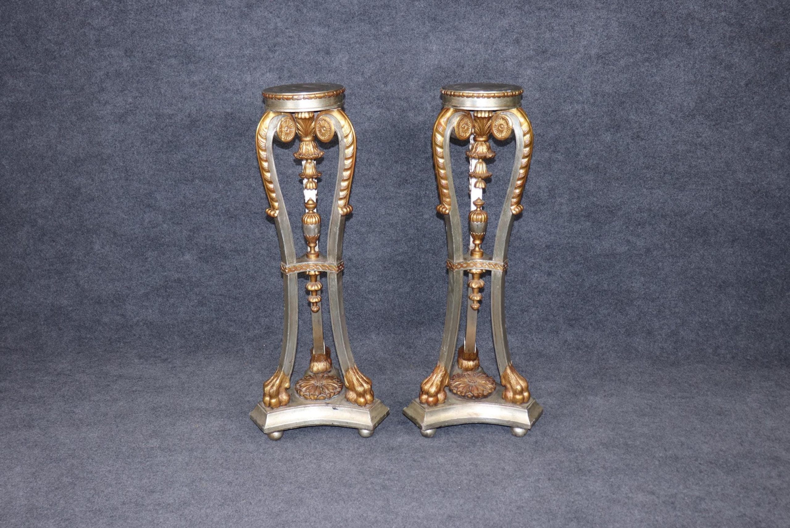 This vintage pair of Regency style silver and gold gilt pedestals plant stands is made of the highest quality! This pair is bound to bring a sense of minimalistic luxury and modernism into your home or place of choosing and is perfect for any living room, bedroom, bathroom, entryway or office! Antique furniture and vintage pieces have stood the test of time and this pair of pedestals is no exception. With their quality materials and great craftsmanship this pair is bound to last you and your family for many years to come. This pair is in good vintage condition with the exception of some minor surface scratches and finish loss to the tops as to be expected but otherwise good condition.