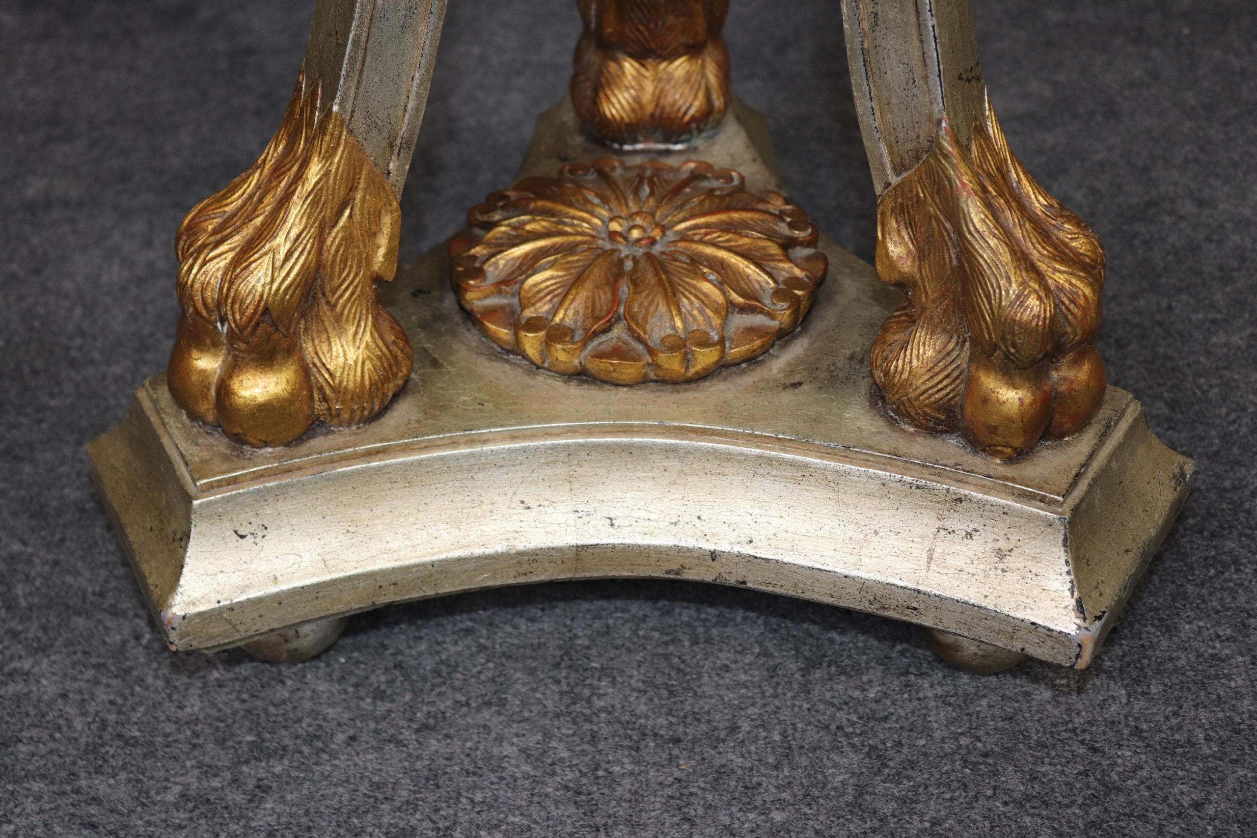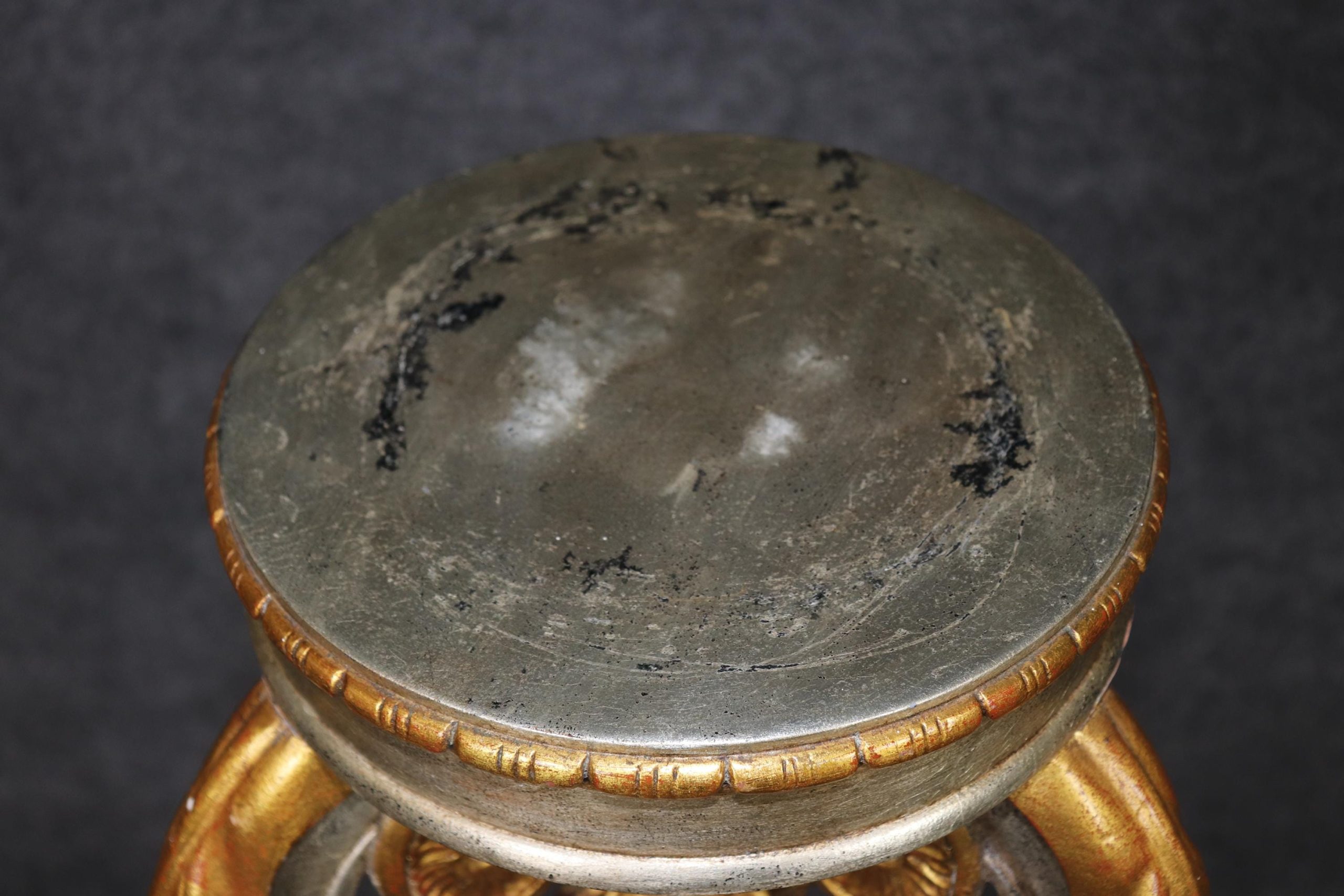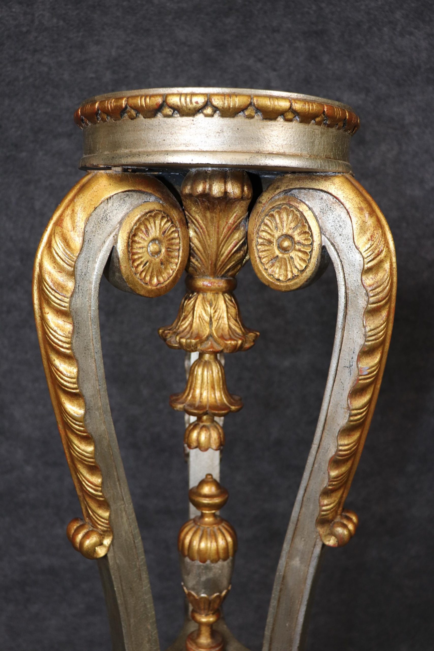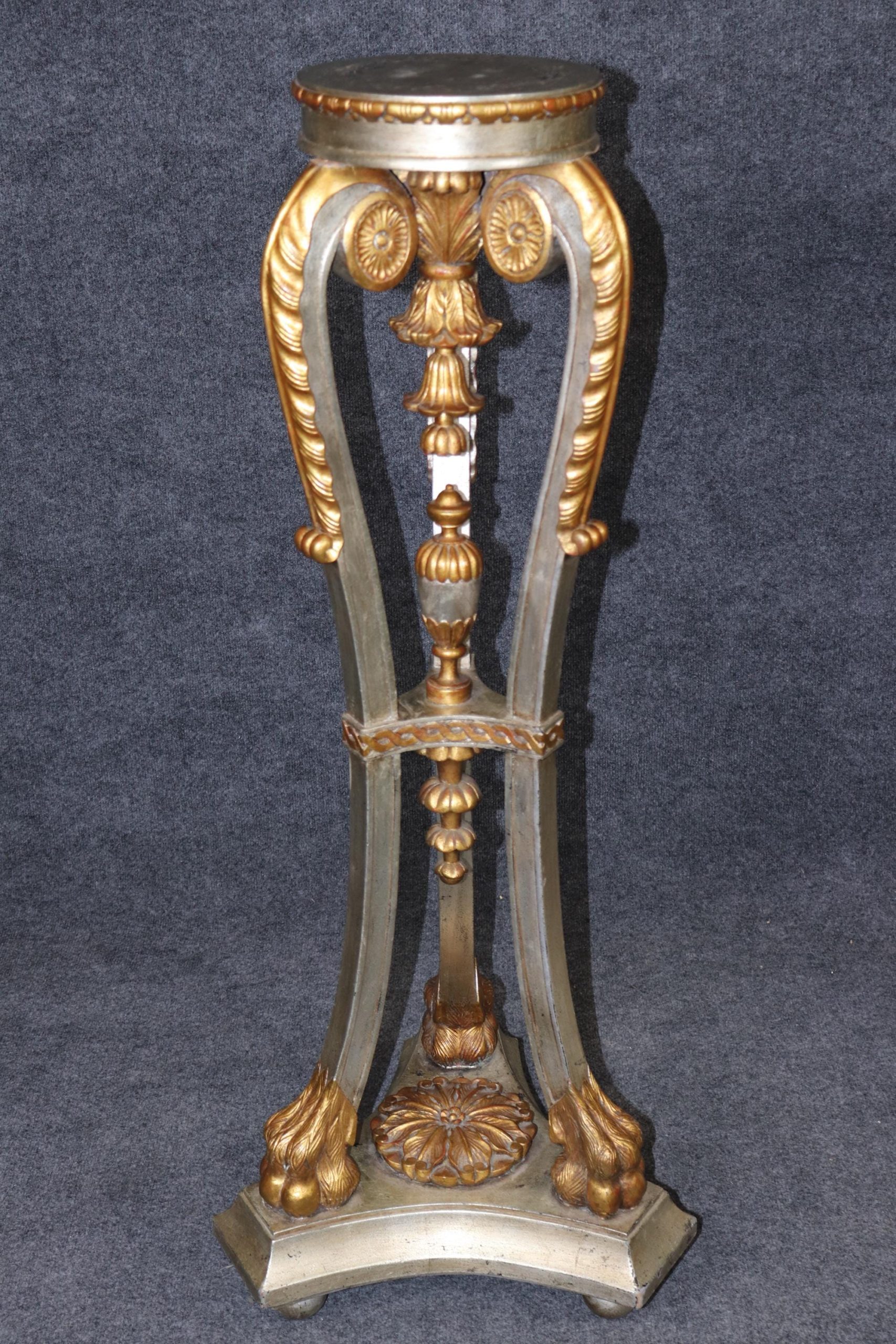 This vintage pair of Regency style silver and gold gilt pedestals plant stands is made of the highest quality! This pair is bound to bring a sense of minimalistic luxury and modernism into your home or place of choosing and is perfect for any living room, bedroom, bathroom, entryway or office! Antique furniture and vintage pieces have stood the test of time and this pair of pedestals is no exception. With their quality materials and great craftsmanship this pair is bound to last you and your family for many years to come. This pair is in good vintage condition with the exception of some minor surface scratches and finish loss to the tops as to be expected but otherwise good condition.